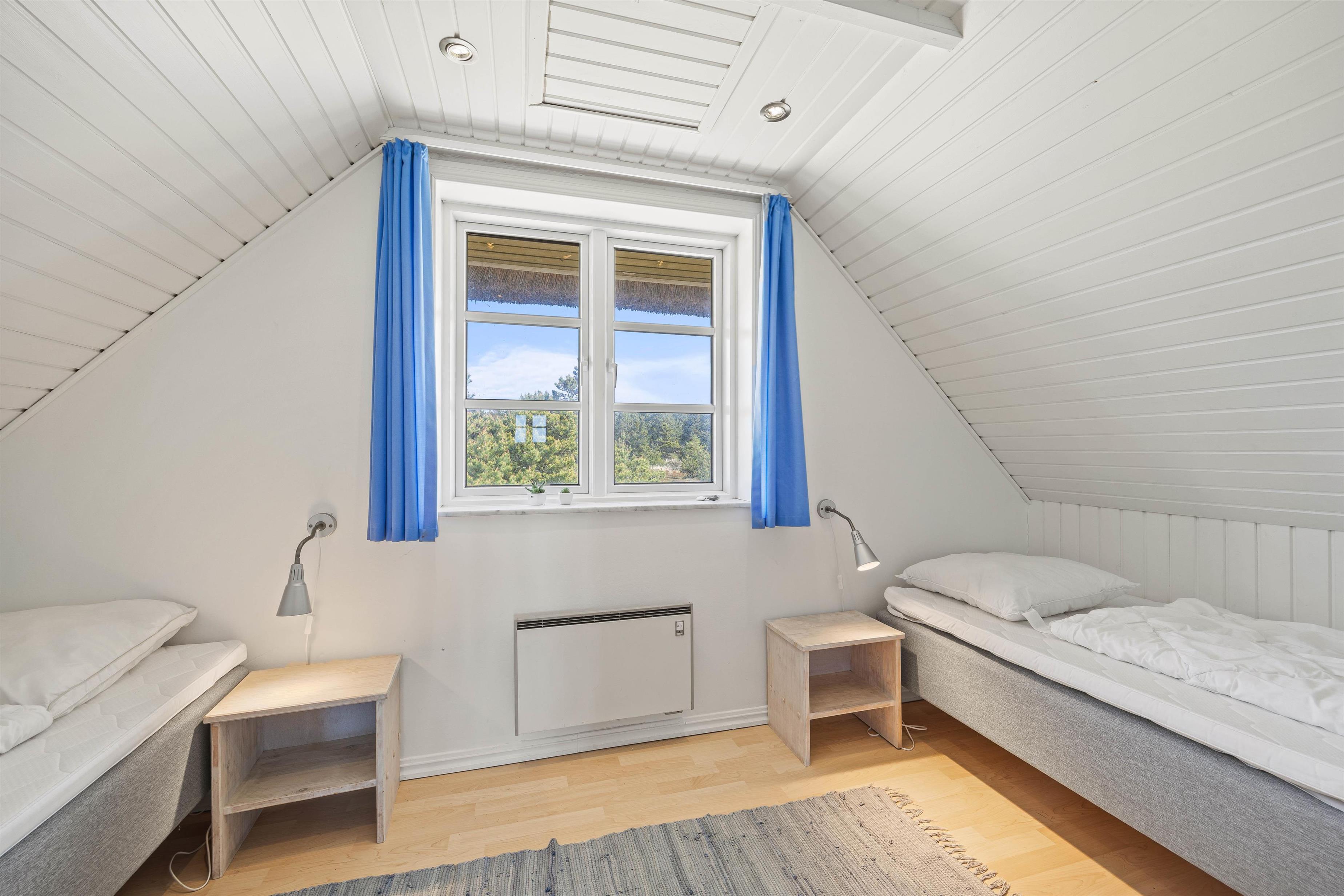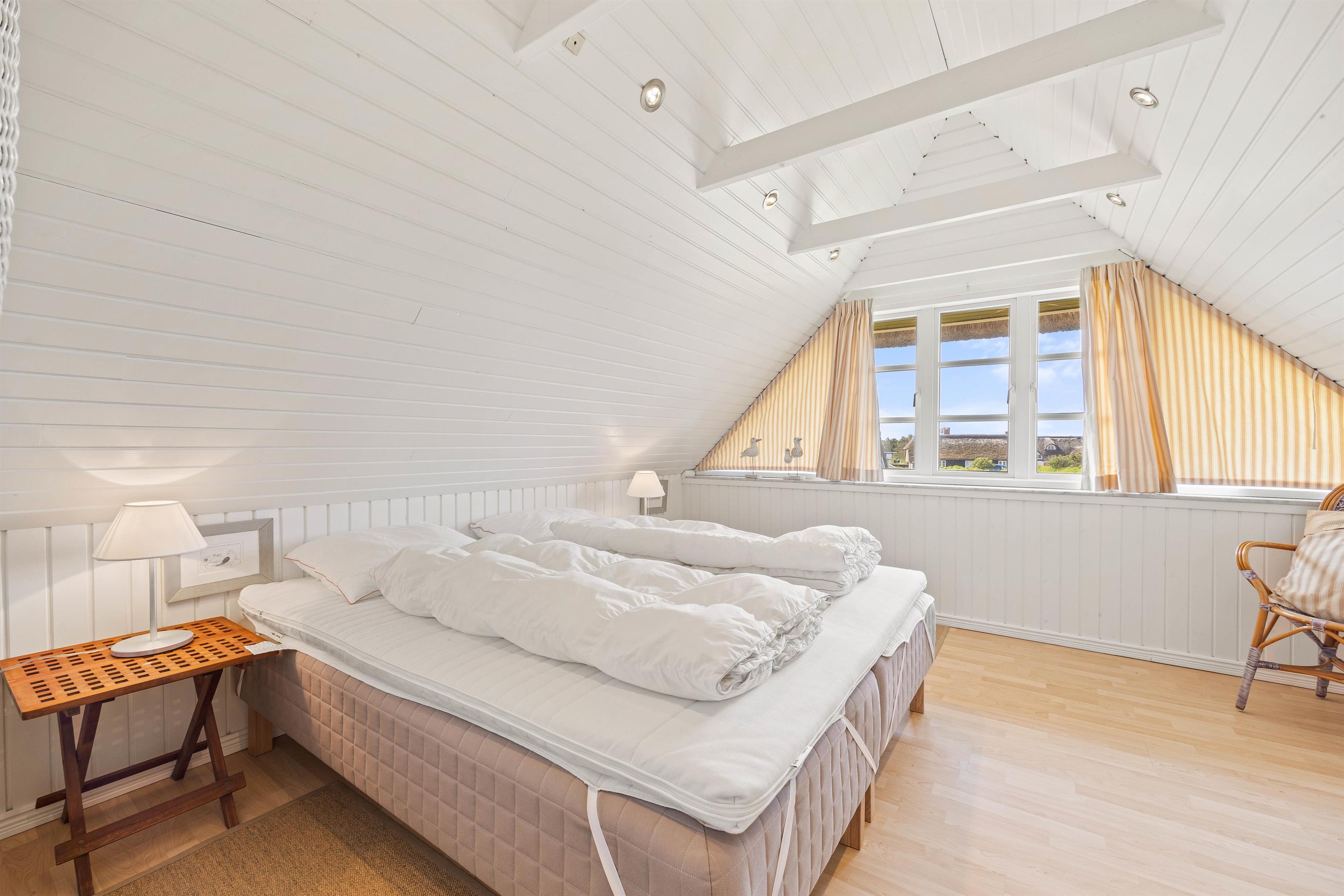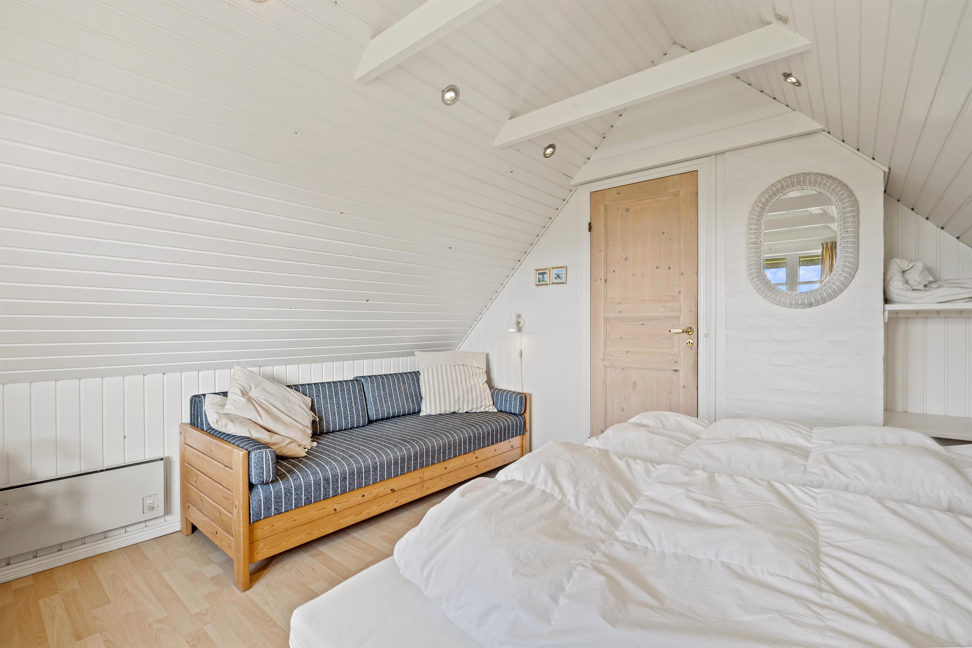 I stueplan ligger det ene af sommerhusets i alt 4 værelser. Her er der en dobbeltseng. De sidste værelser finder I på 1. salen, hvoraf der er 2 værelser med 1 dobbeltseng samt 1 enkeltseng på hver. Det 4. soveværelse er indrettet med 2 enkeltsenge.