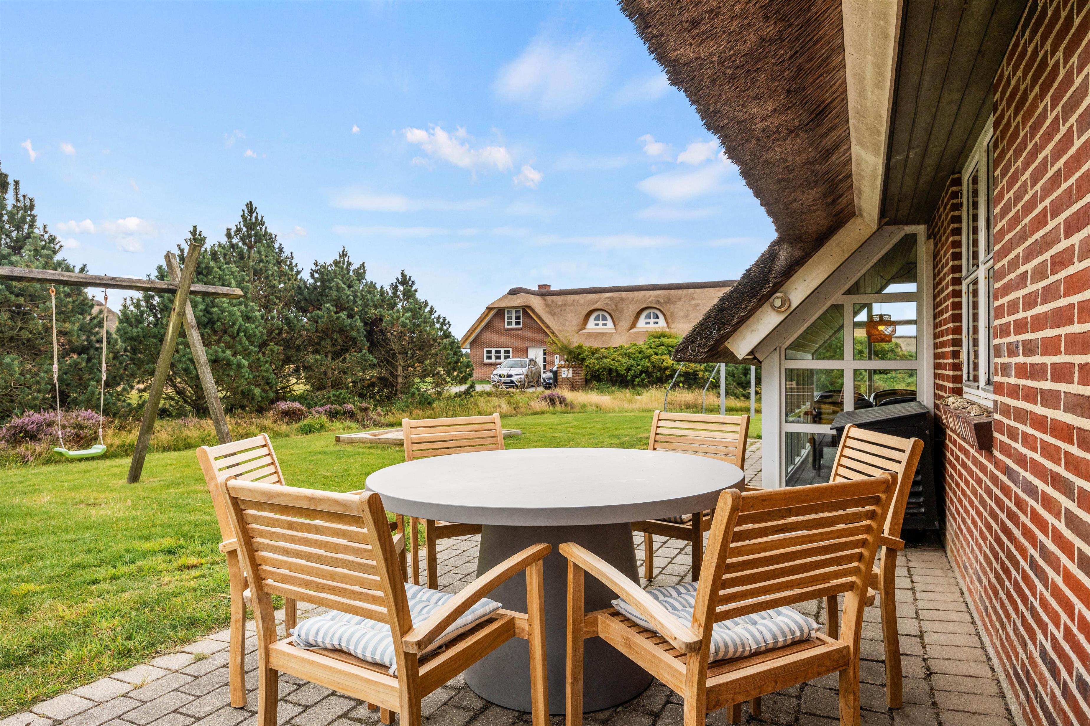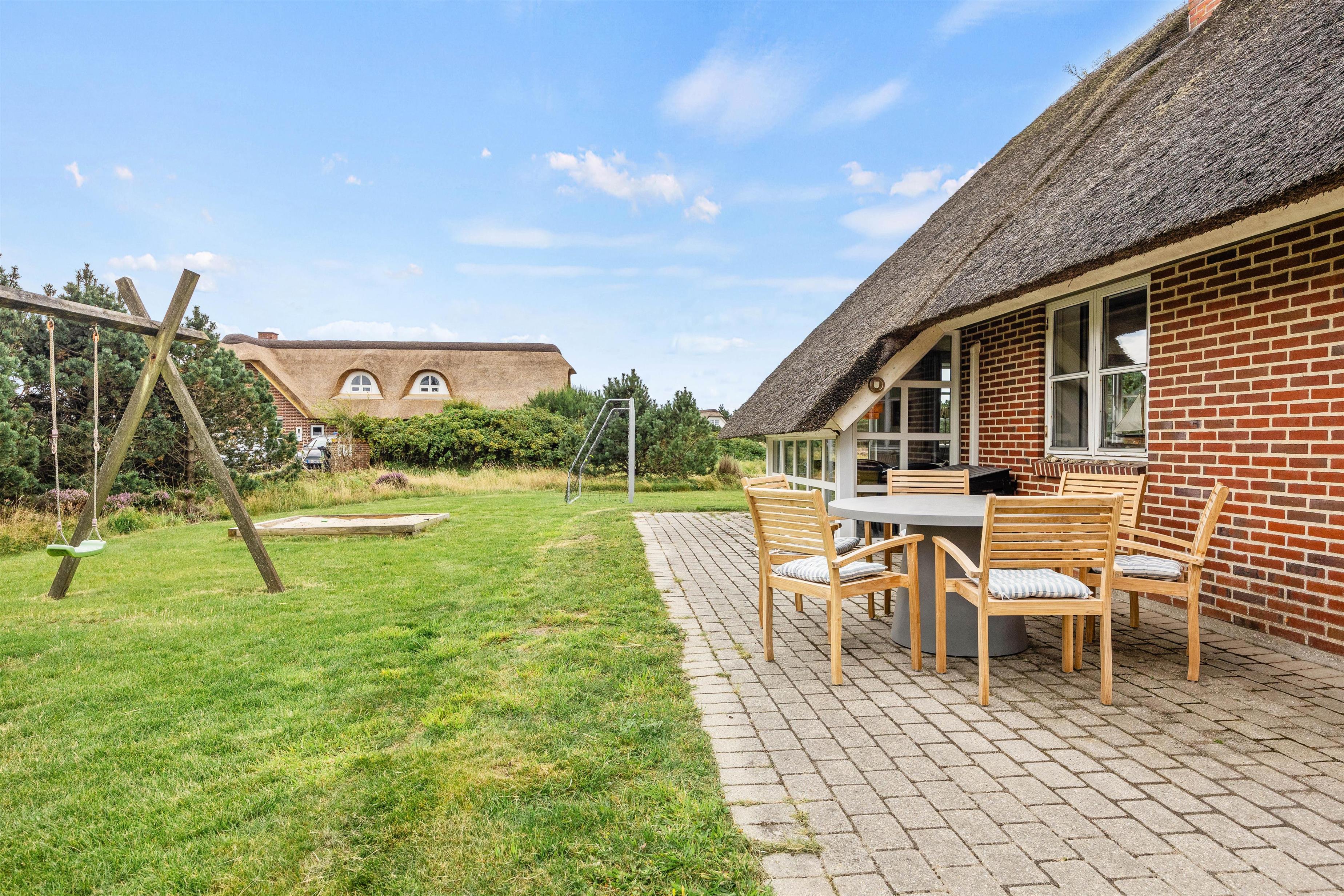 Fra sommerhusets poolområde, det ene soveværelse og stue er der direkte udgang til den sydvendte, afskærmede og lukkede terrasse, hvor I kan nyde solens varme stråler. Imens kan børnene lege på naturgrunden, som både har sandkasse og gynge samt 2 fodboldmål.