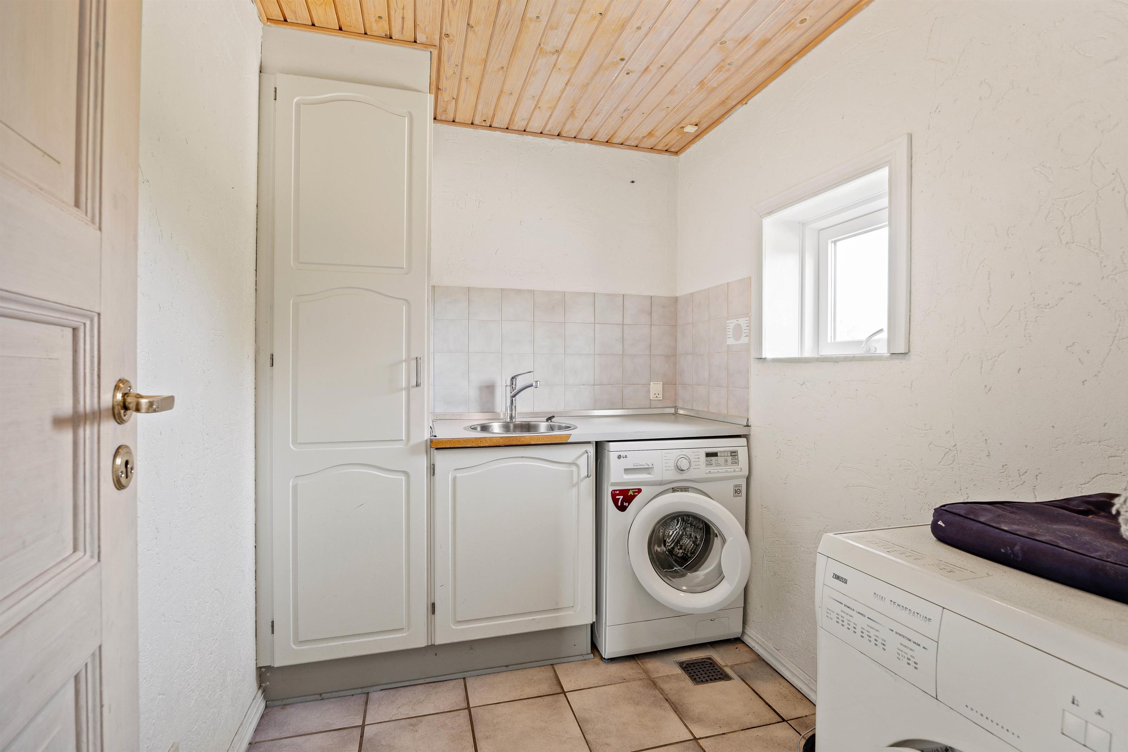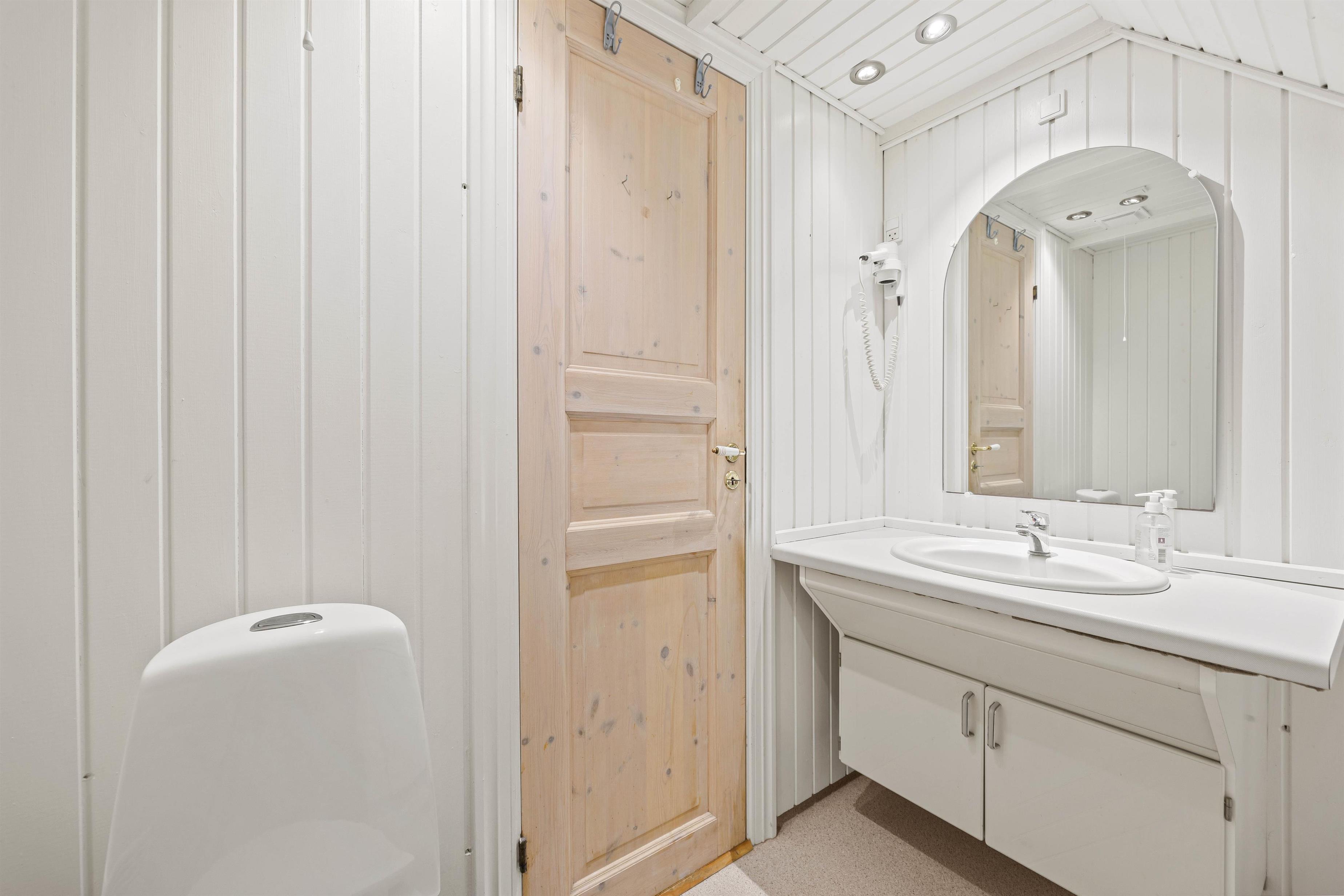 Udover badeværelset i stueplan er der også et gæstetoilet på feriehusets 1. sal. Desuden er der vaskemaskine og tørretumbler i bryggerset.