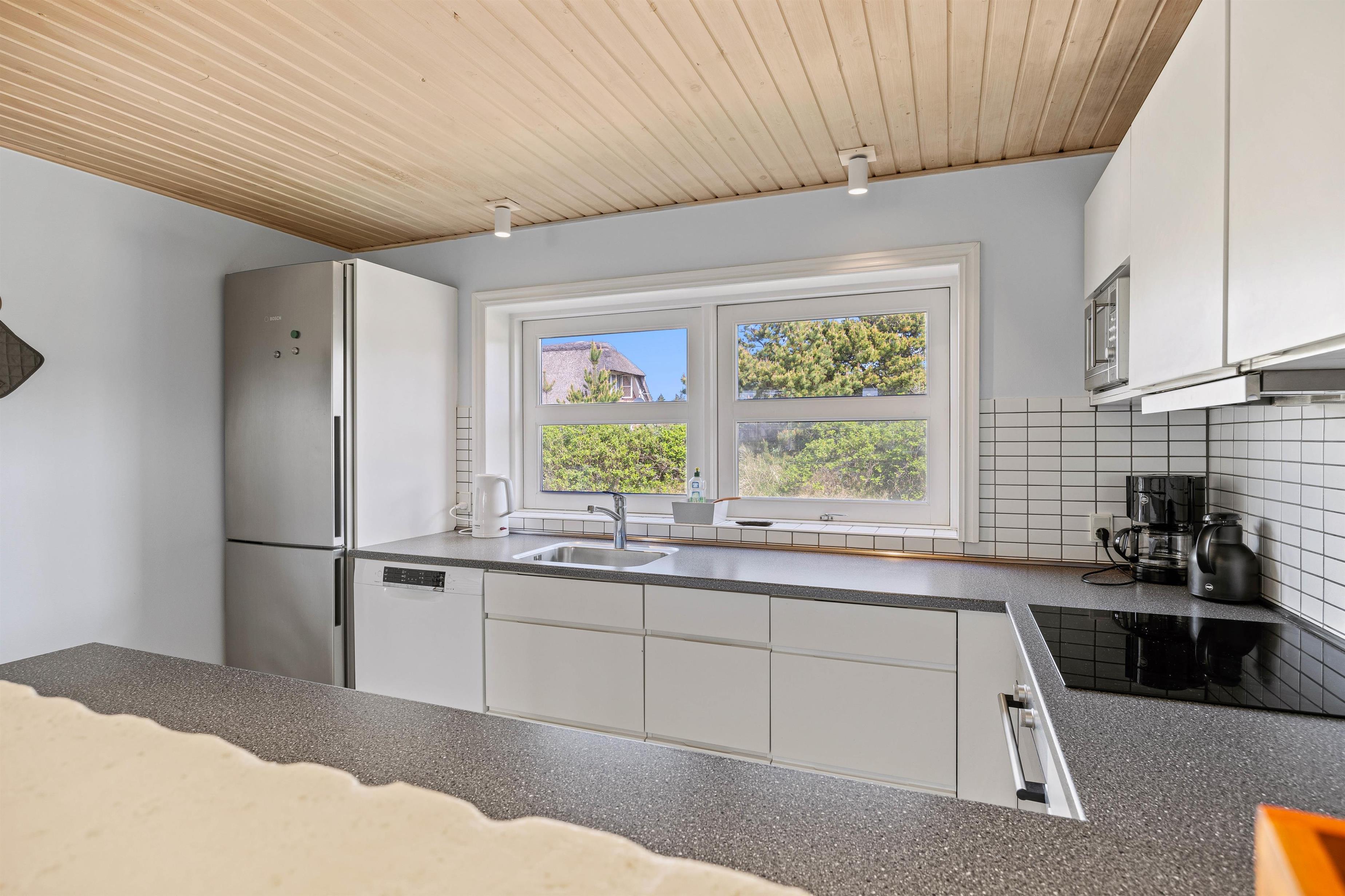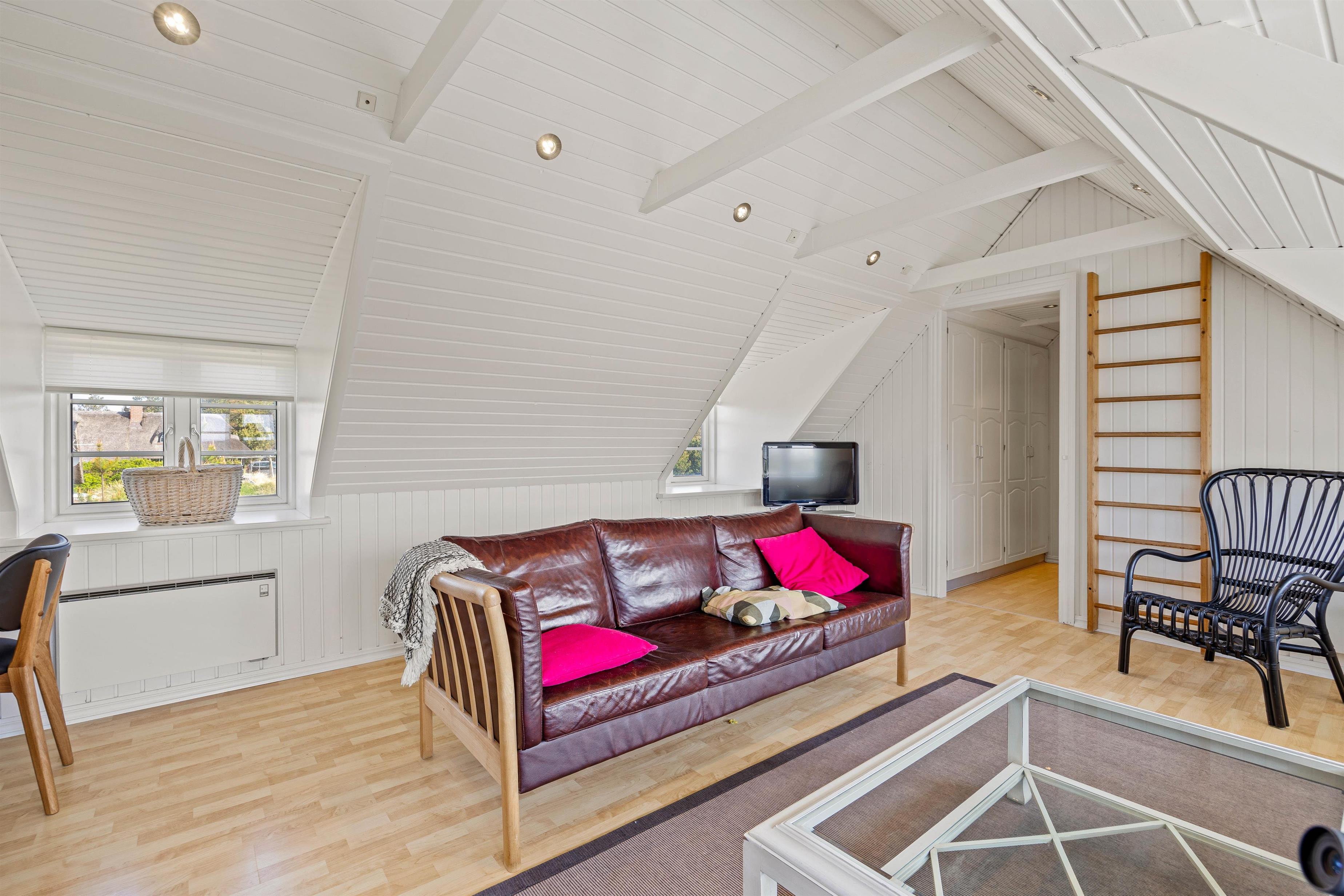 Det hyggelige sommerhus har et rummeligt køkken/alrum og en opholdsstue, hvor hele familien kan samles til gode stunder foran den knitrende brændeovn. Måske med en god film i fjernsynet? Sommerhuset har danske tv-kanaler. Udover brændeovnen kan I også benytte jer af den energibesparende varmepumpe, som sørger for et behageligt indeklima.