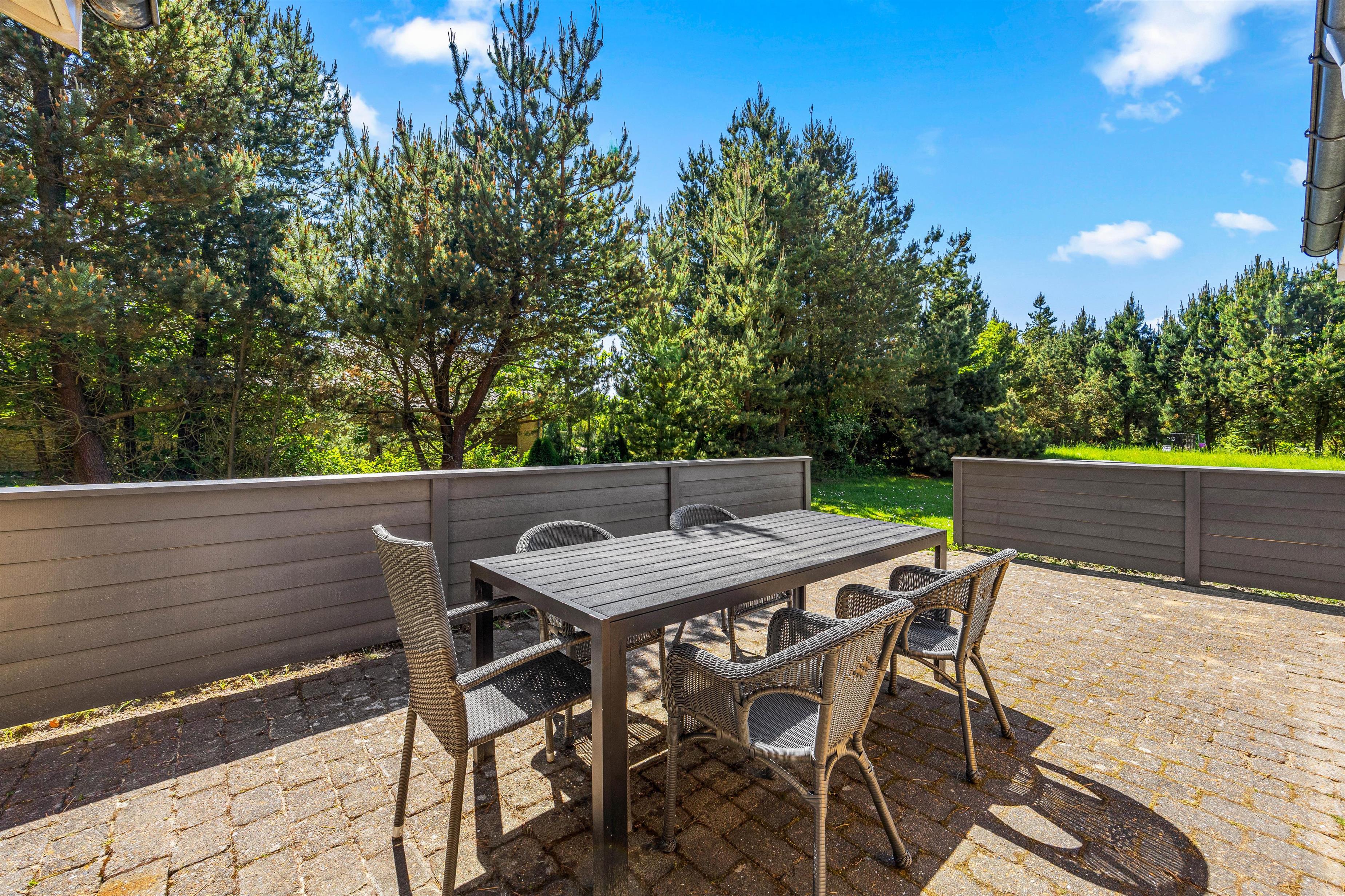 Fra stuen er der udgang til en afskærmet og delvis overdækket terrasse. Her kan du indånde den friske luft og måske nyde en lækker middag, som kan laves på grillen.