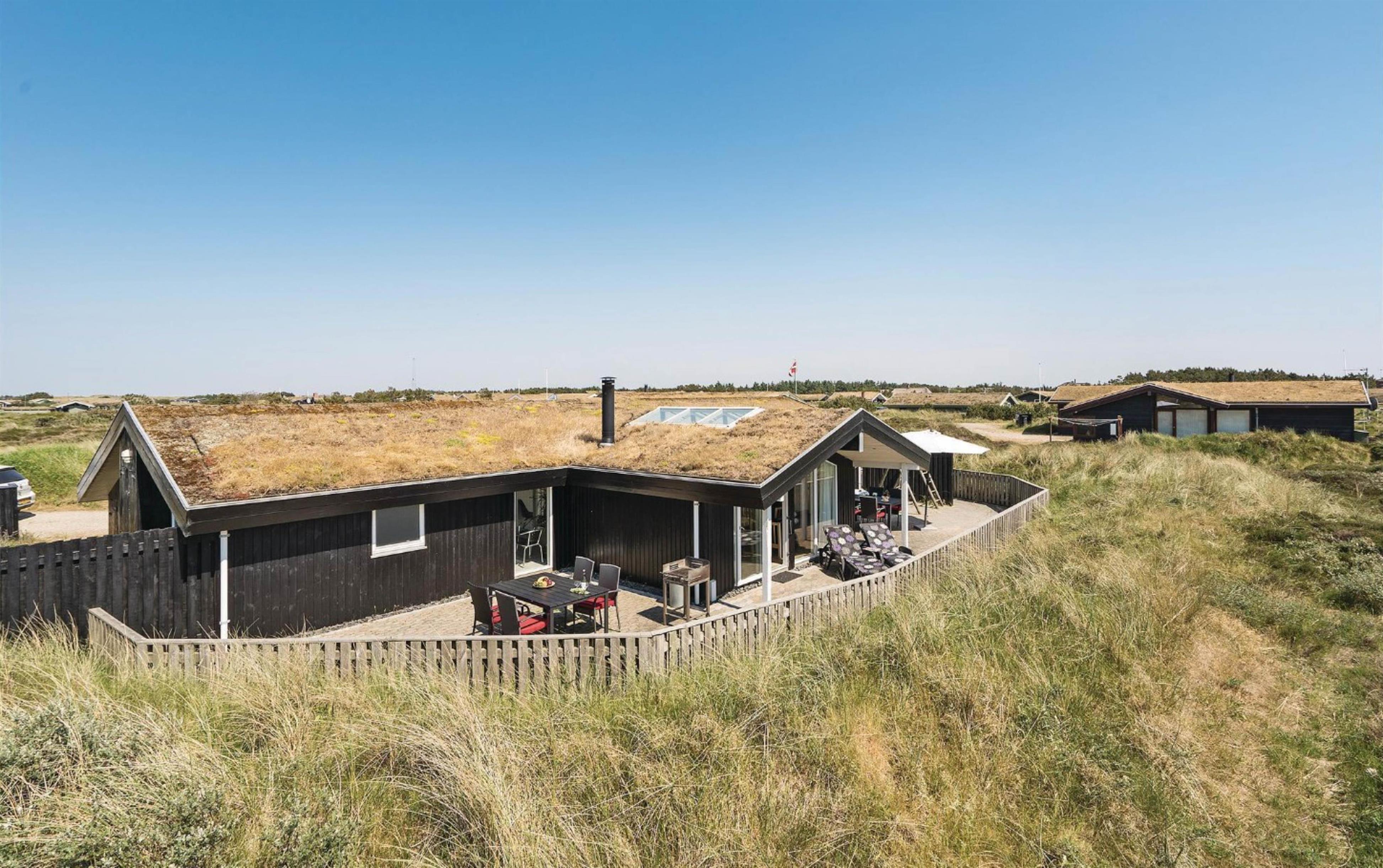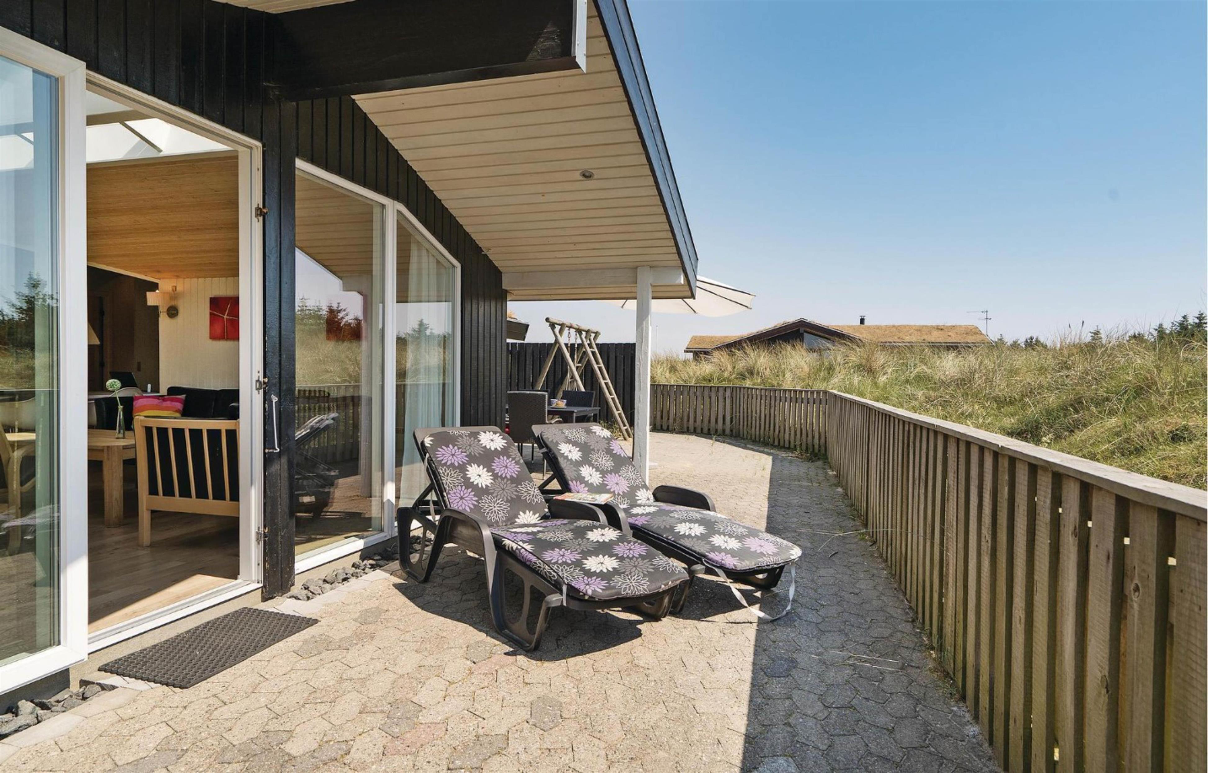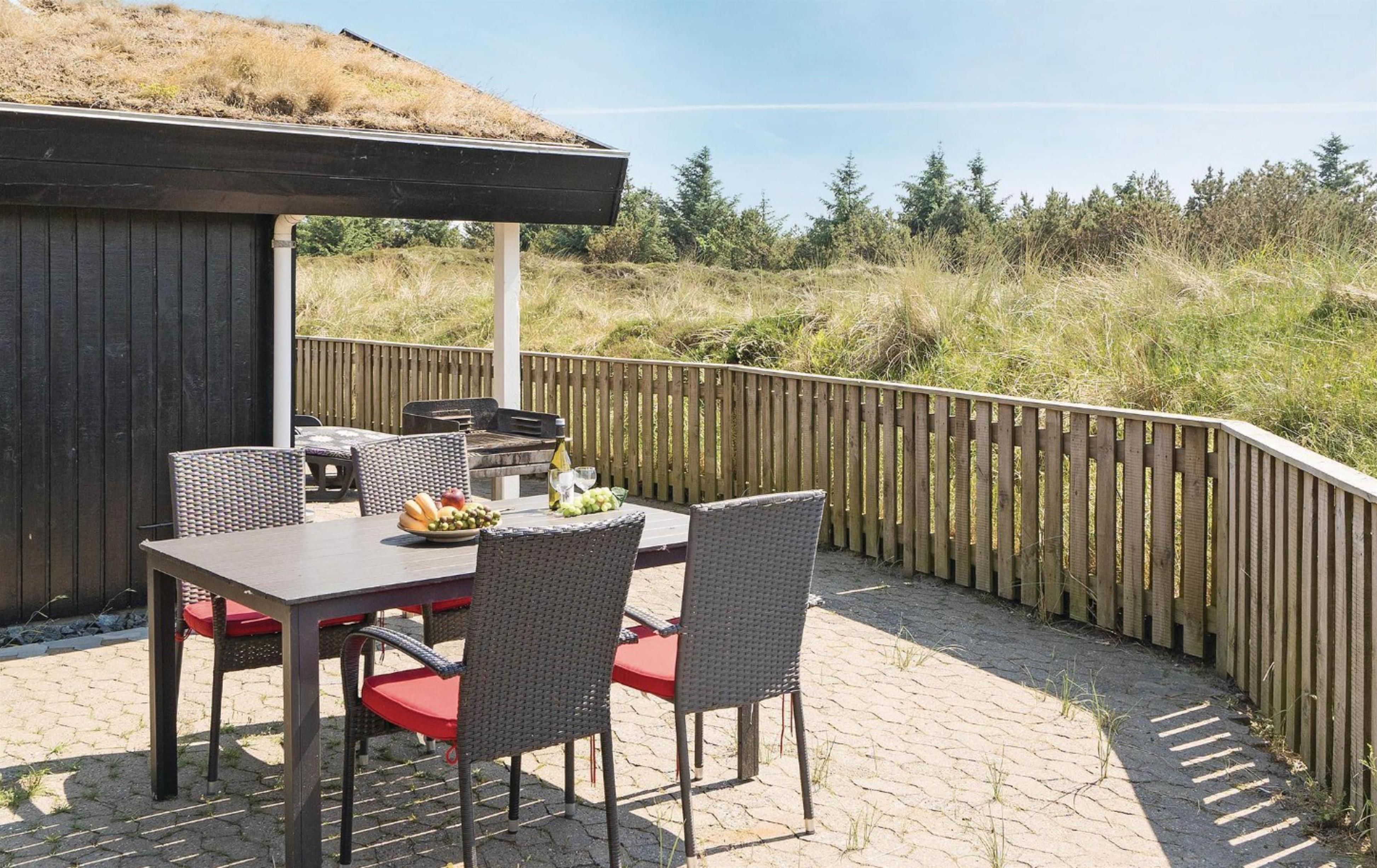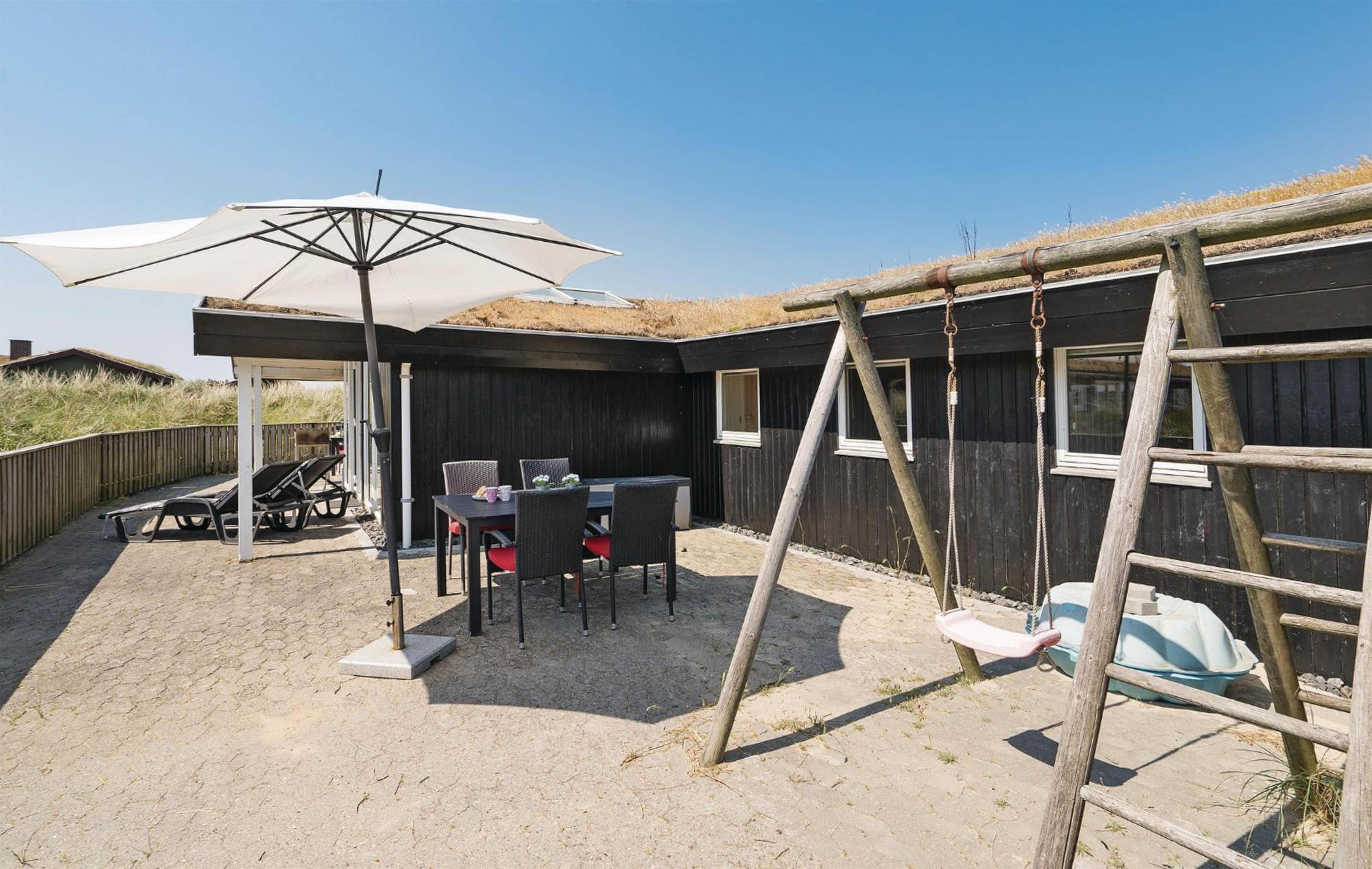 Beliggende i et roligt sommerhusområde omgivet af den smukke vestjyske natur. Mod nordvest har feriehuset en dejlig fliseterrasse, hvor I kan nyde solskinstimer og de lune sommeraftner med lækker grillmad. Her er der udsigt udover den smukke hede, hvor marehalmen vifter let i vinden. Sæt jer godt til rette i havemøblerne med en god krimi, lad børnene lege og hundene trisse rundt. For de allermindste er her opsat en lille sandkasse samt et gyngestativ, og foran huset findes et stort frit område, som er ideelt til bl.a. drageflyvning.