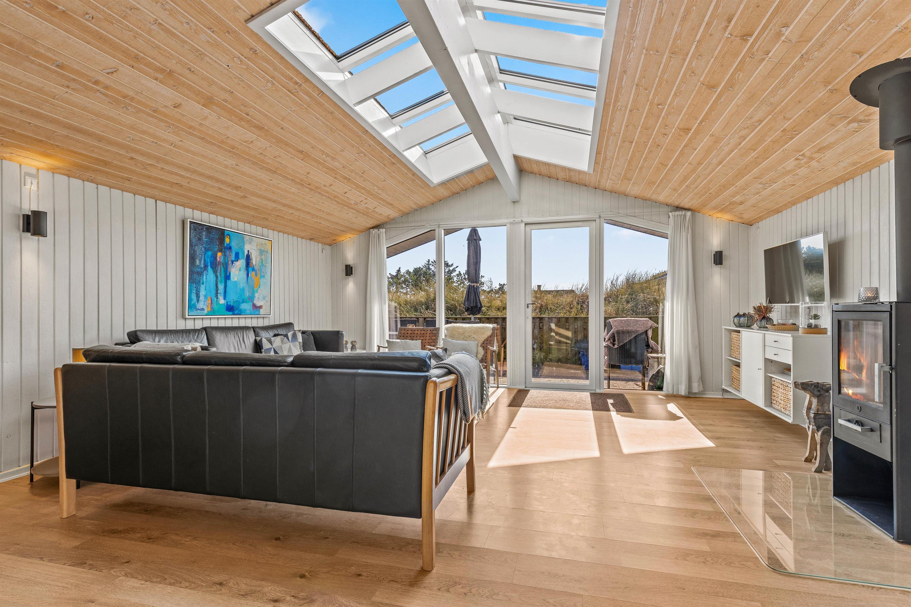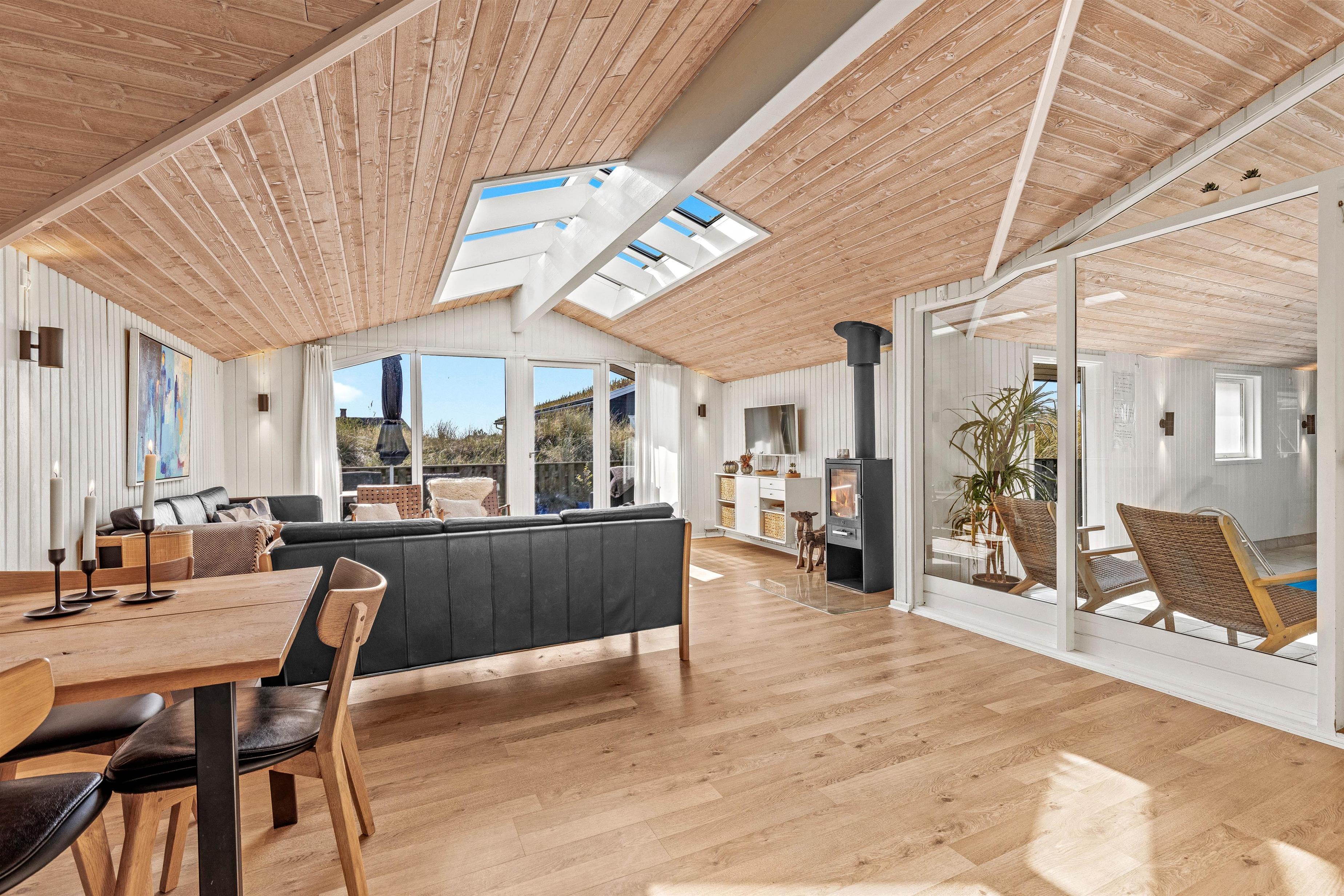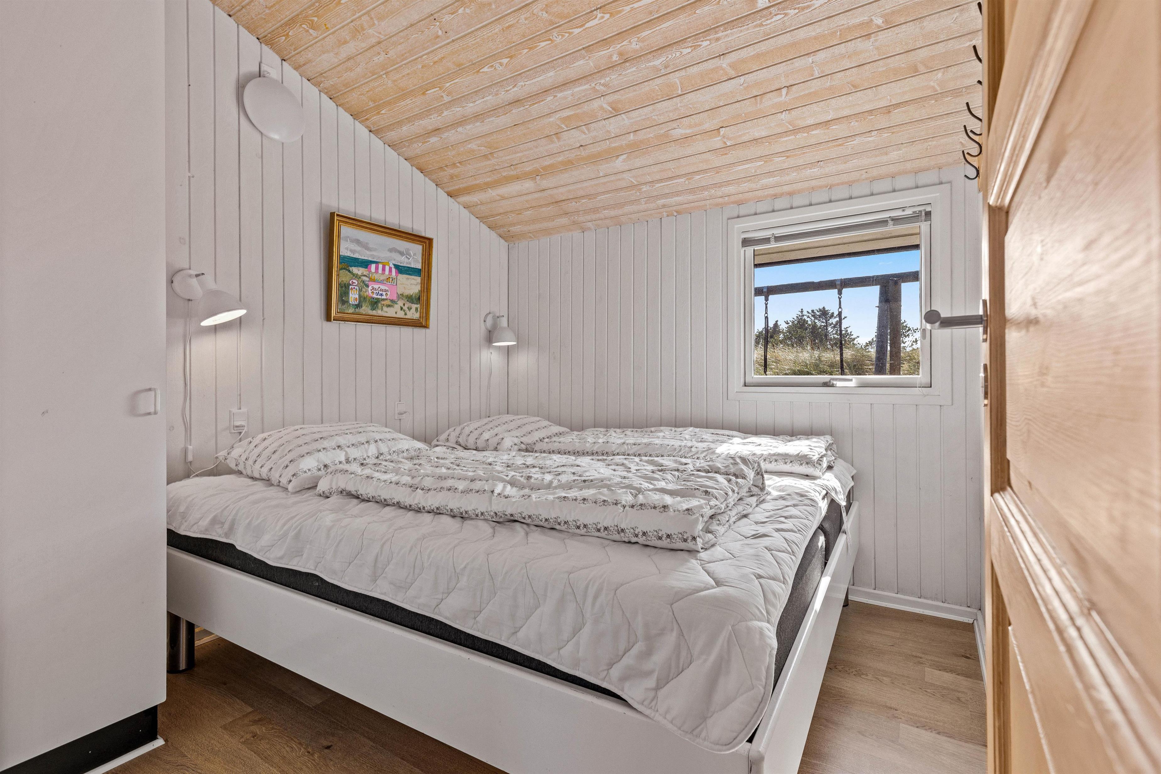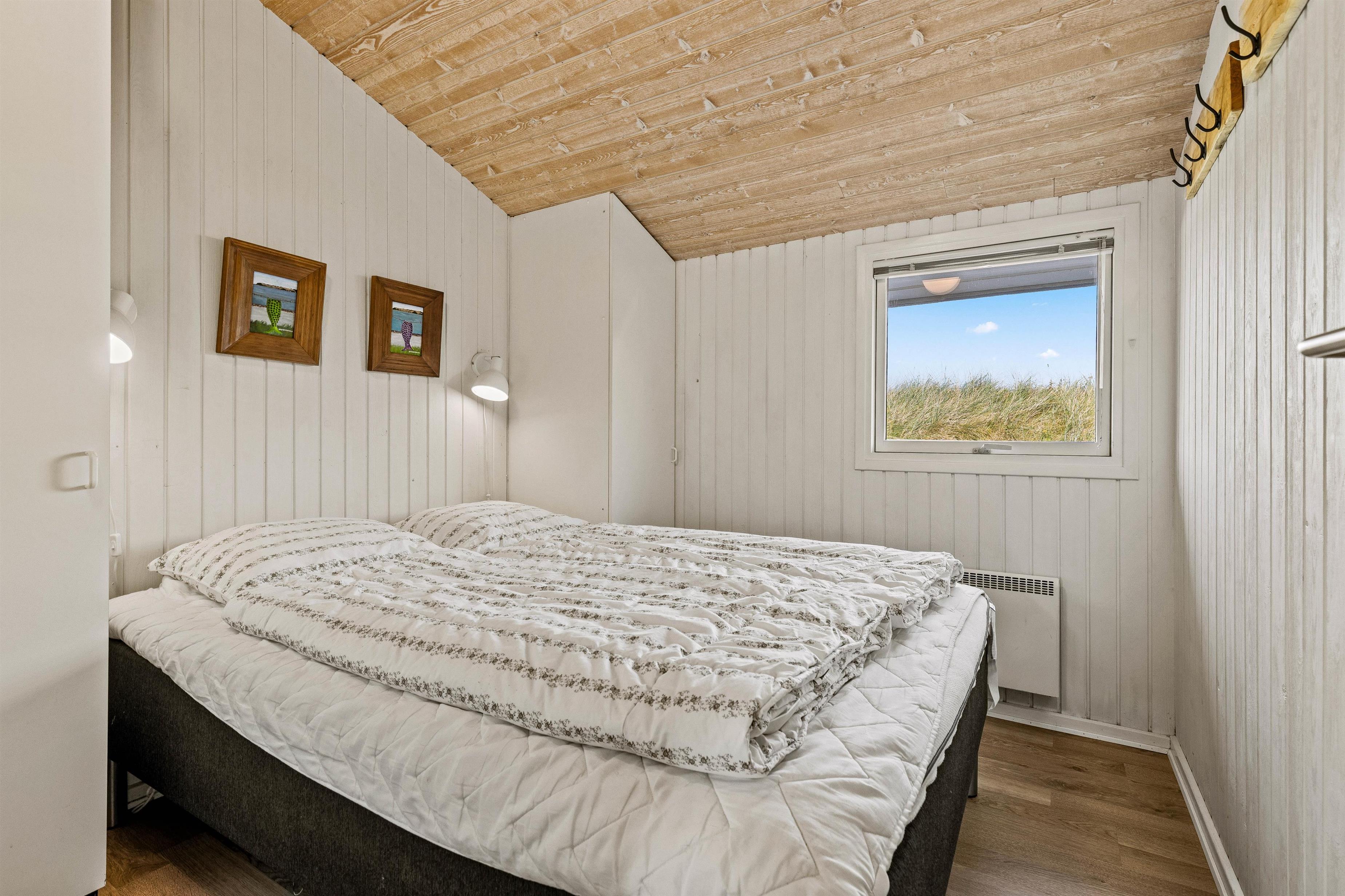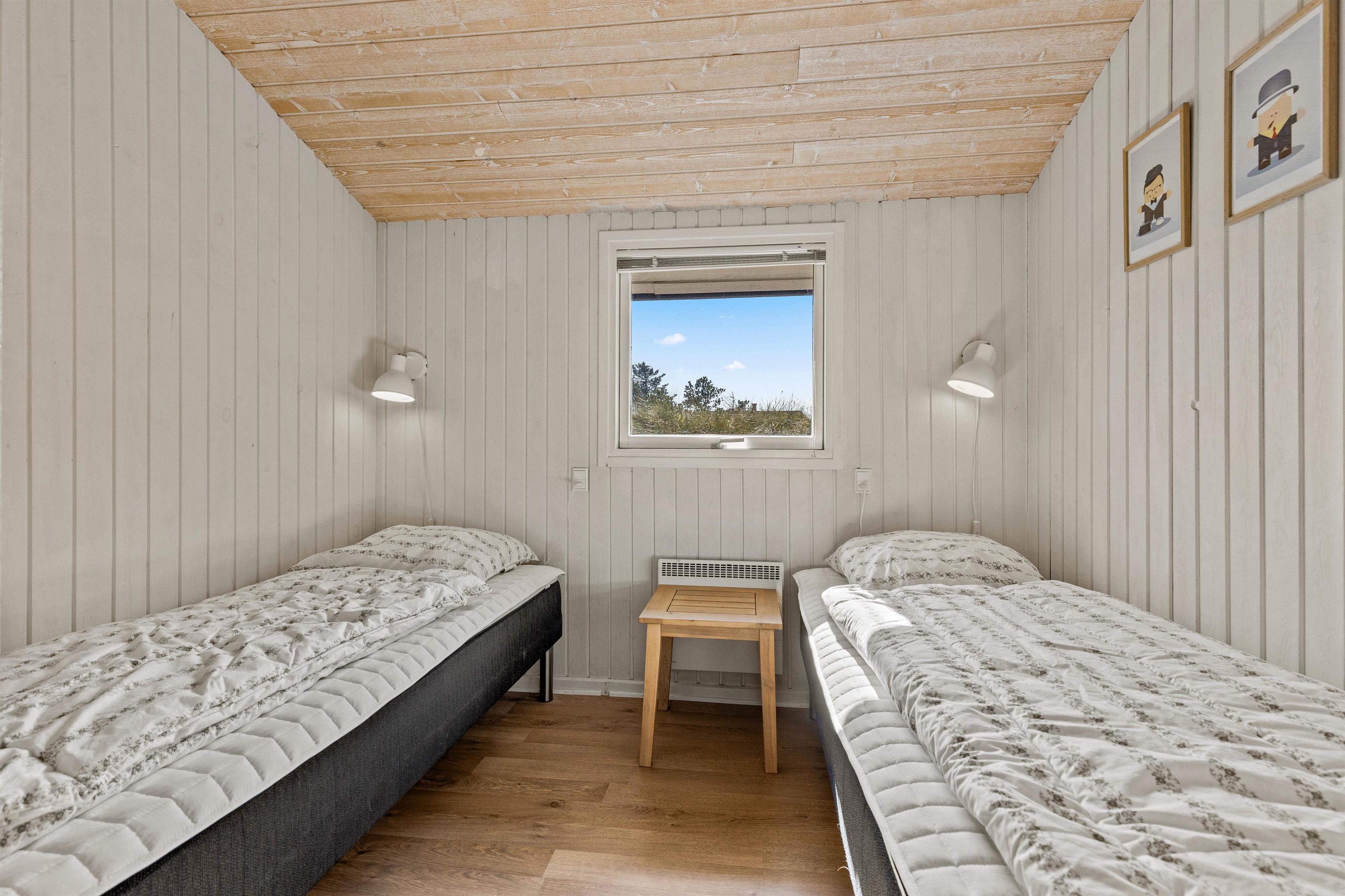 Overalt er huset velholdt og pænt indrettet. Efter en lang dag i vandet kan I finde brætspillene frem, kokkerere et dejligt måltid og slutte aftenen af på den store flydersofa med en god film. For at skabe lidt ekstra hygge kan I tænde op i brændeovnen, der spreder varme og glæde. Som en lille fin detalje er der i stuen store ovenlysvinduer, som virkelig lyser rummet op. I den anden ende af feriehuset, finder I de fire soveværelser. Et værelse er indrettet med en dobbeltseng, 180x200, to værelser med 140x200, mens det fjerde har 2 enkeltsenge, d.v.s. 2x80x200 cm. Et sommerhus hvor I, familie eller venner, helt sikkert vil føle jer godt tilpas.