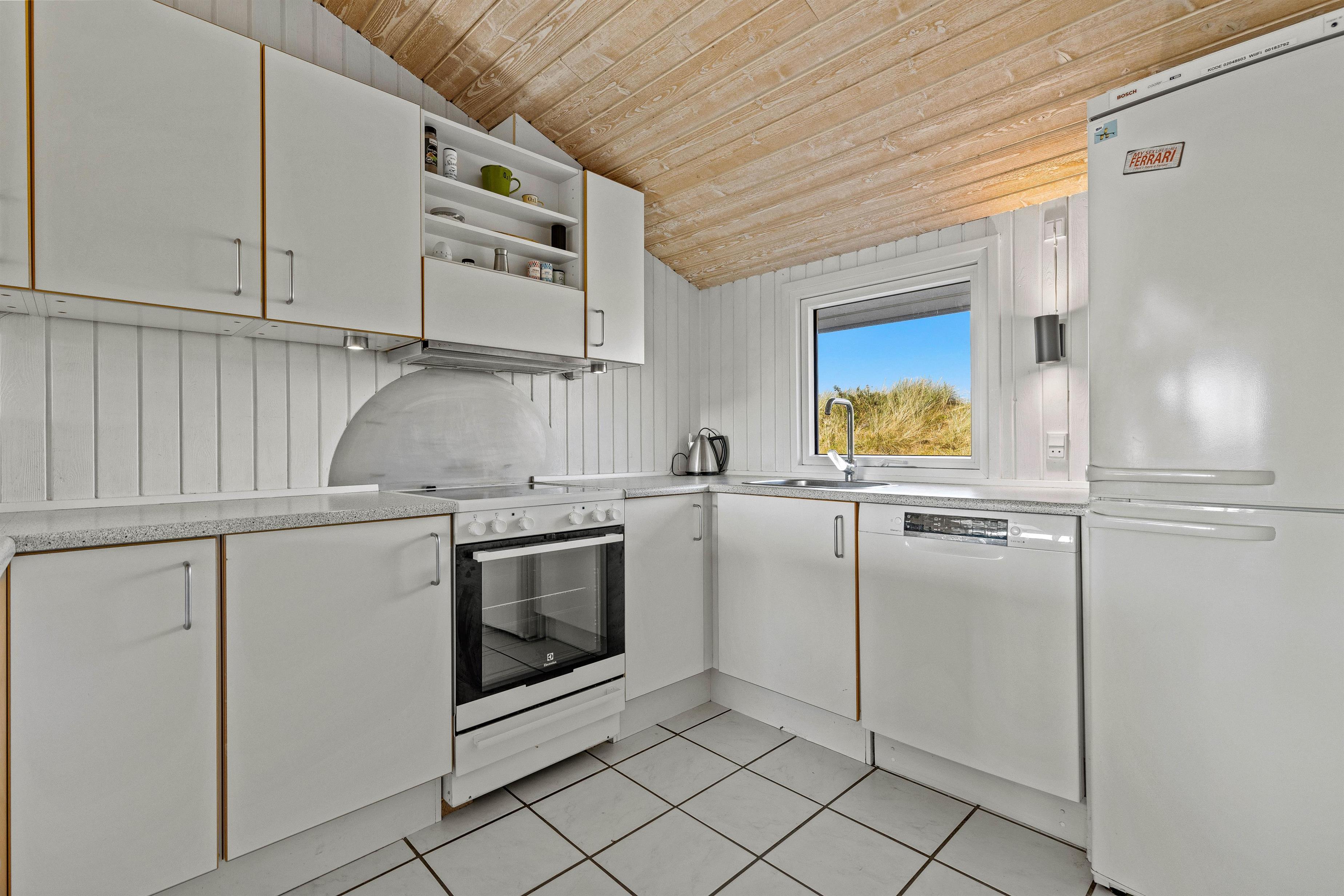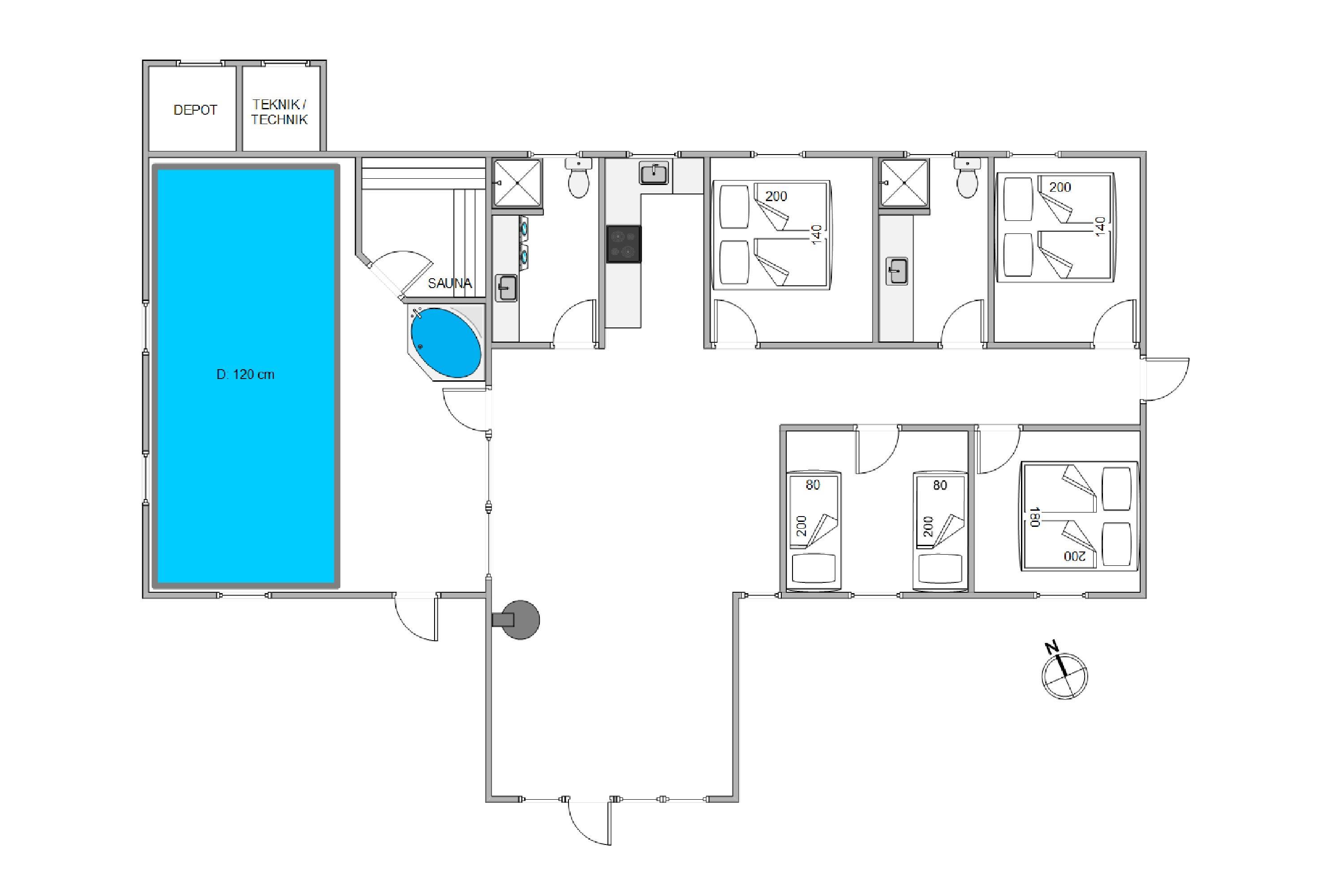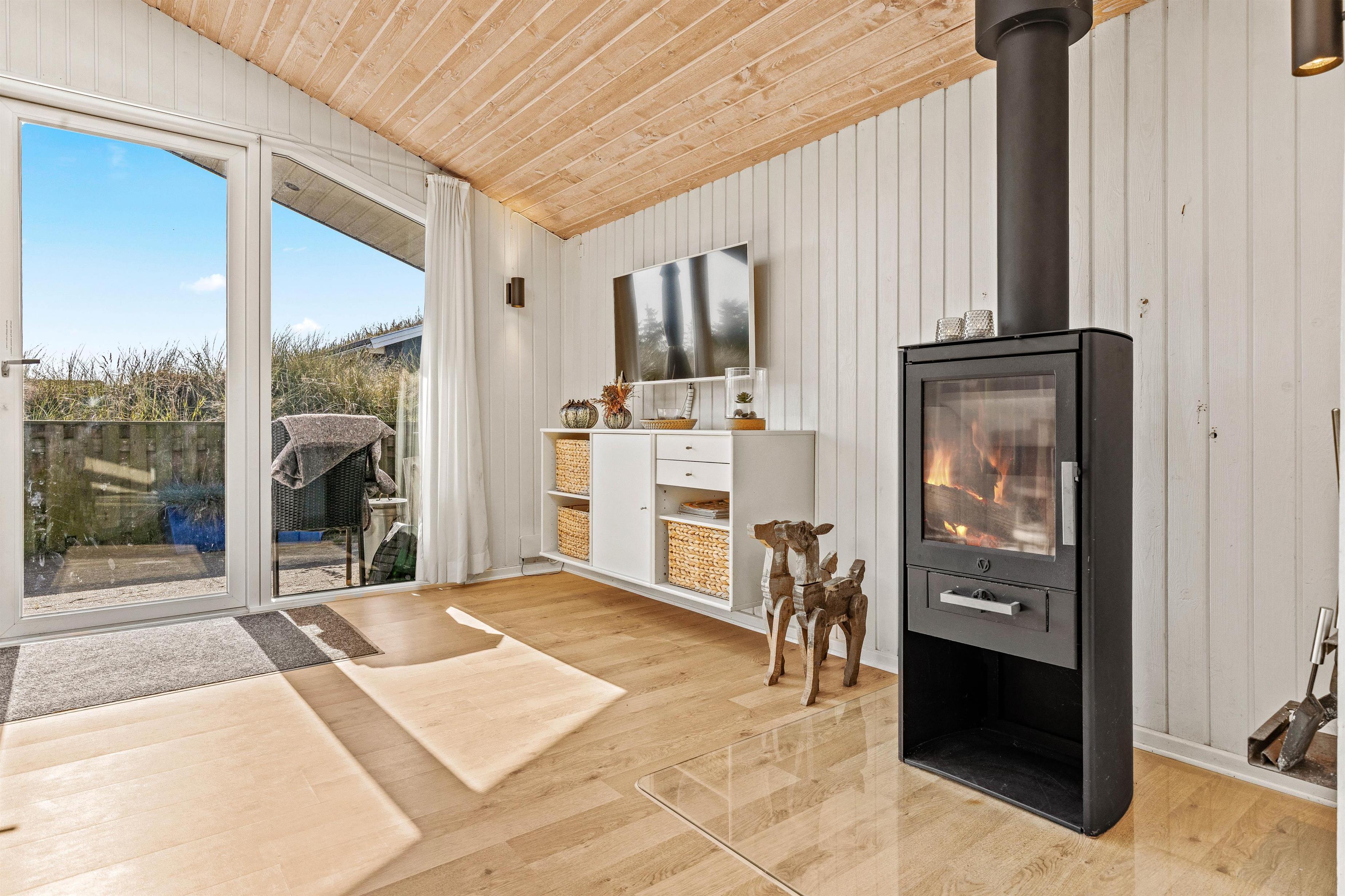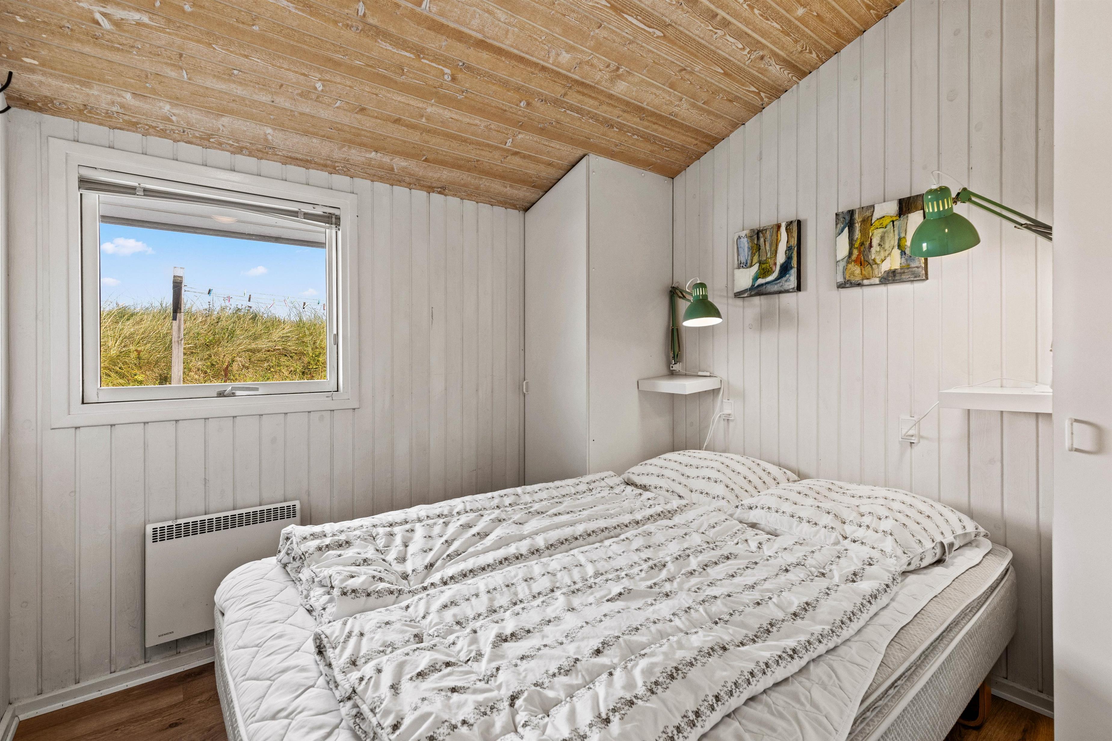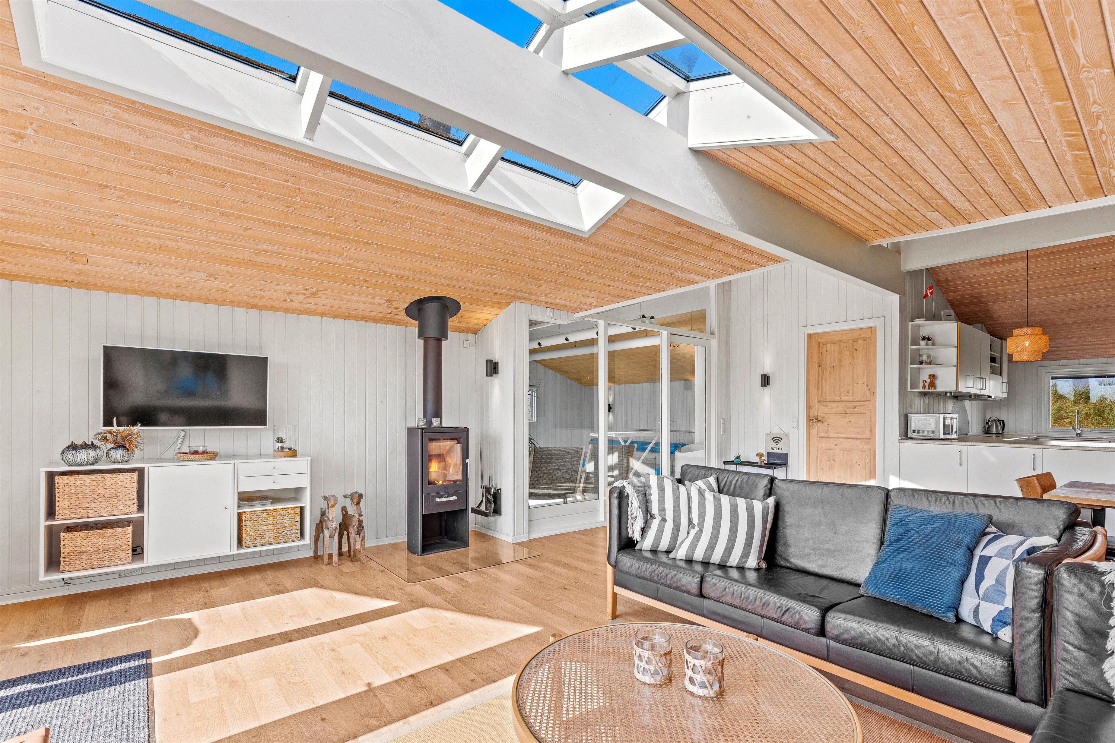 Overalt er huset velholdt og pænt indrettet. Efter en lang dag i vandet kan I finde brætspillene frem, kokkerere et dejligt måltid og slutte aftenen af på den store flydersofa med en god film. For at skabe lidt ekstra hygge kan I tænde op i brændeovnen, der spreder varme og glæde. Som en lille fin detalje er der i stuen store ovenlysvinduer, som virkelig lyser rummet op. I den anden ende af feriehuset, finder I de fire soveværelser. Et værelse er indrettet med en dobbeltseng, 180x200, to værelser med 140x200, mens det fjerde har 2 enkeltsenge, d.v.s. 2x80x200 cm. Et sommerhus hvor I, familie eller venner, helt sikkert vil føle jer godt tilpas.