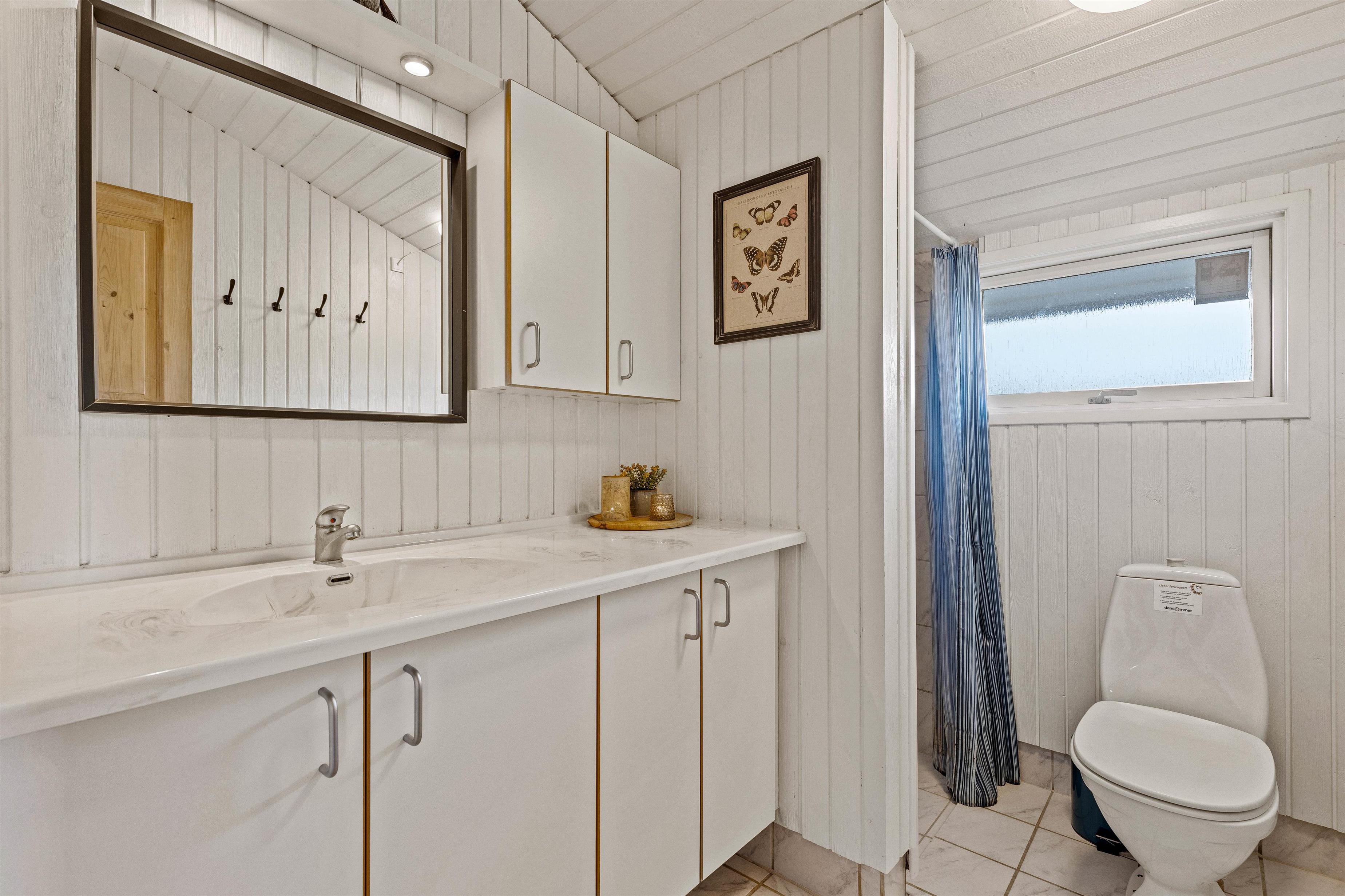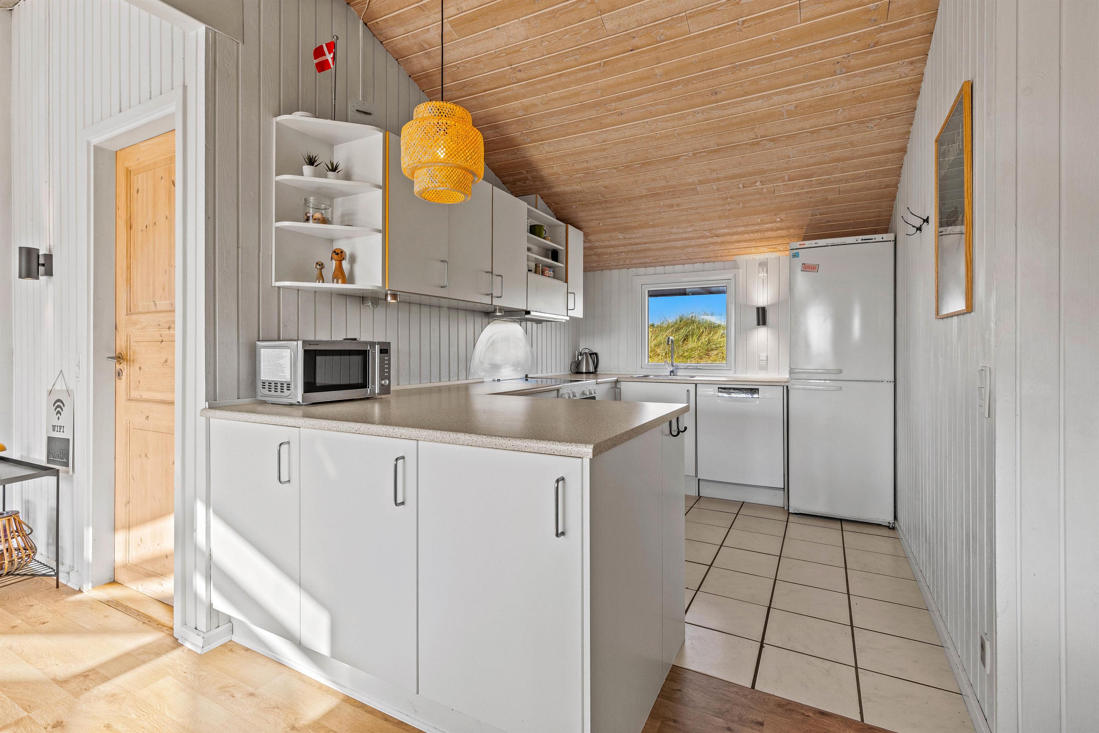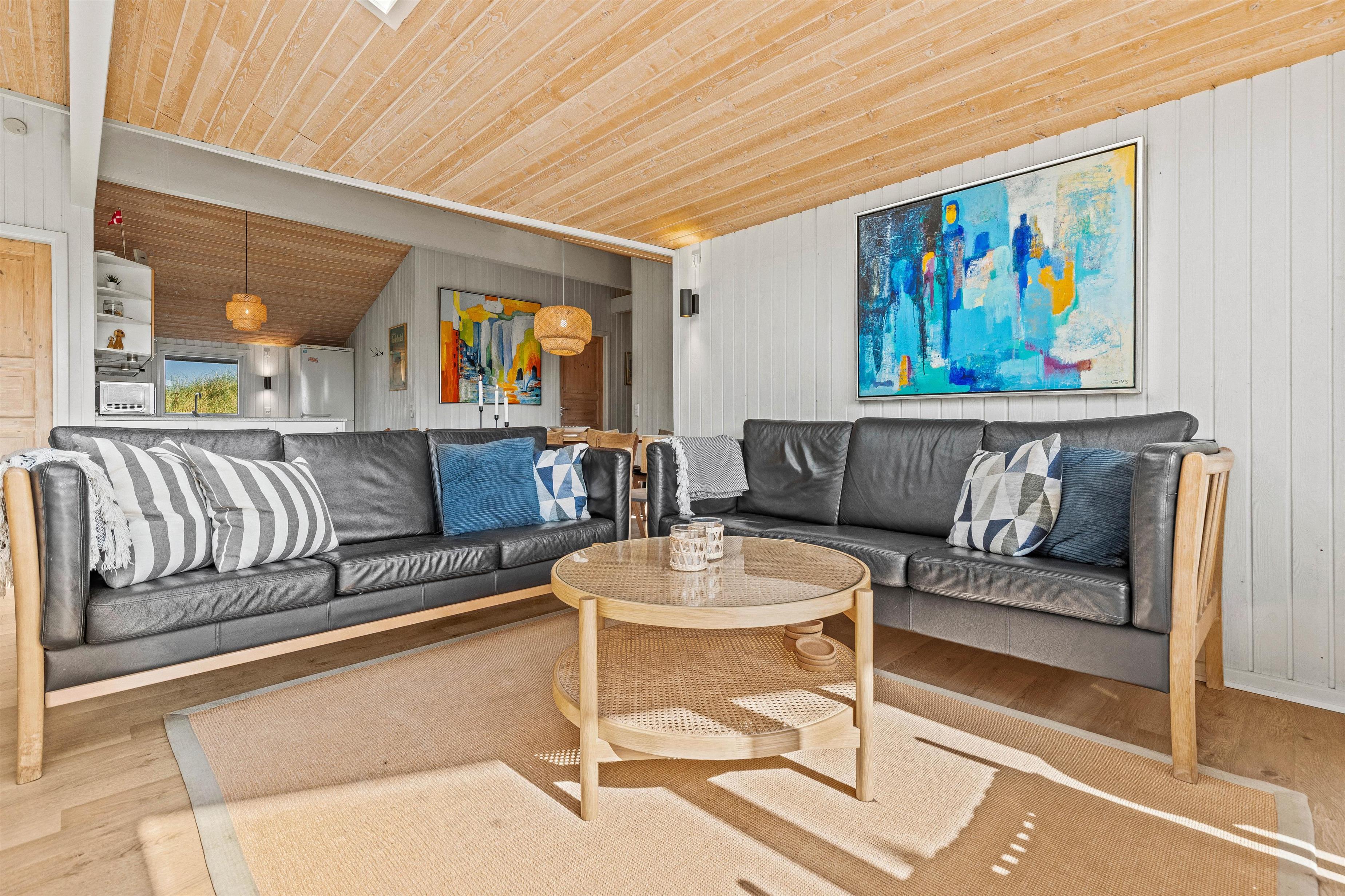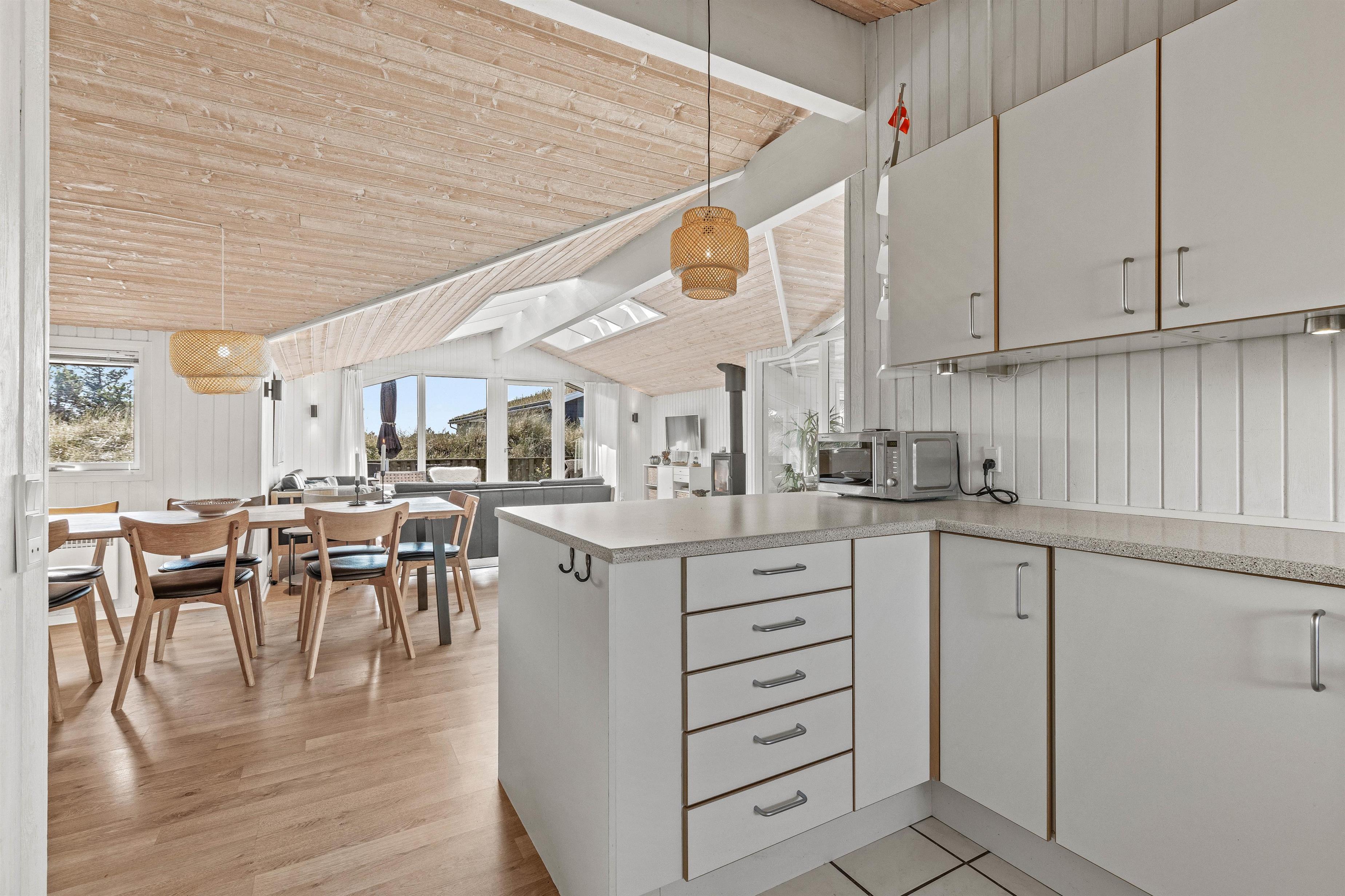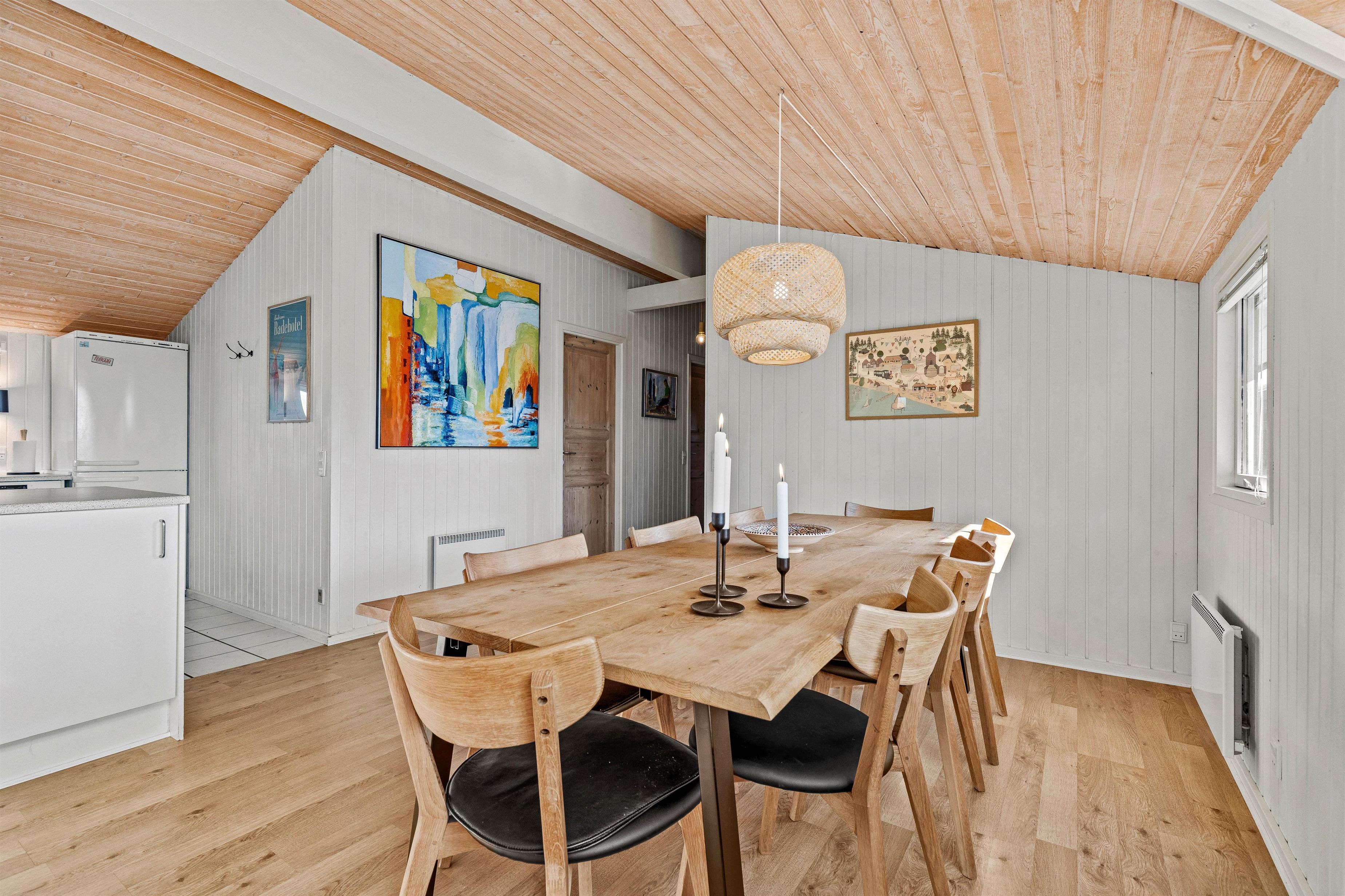 Overalt er huset velholdt og pænt indrettet. Efter en lang dag i vandet kan I finde brætspillene frem, kokkerere et dejligt måltid og slutte aftenen af på den store flydersofa med en god film. For at skabe lidt ekstra hygge kan I tænde op i brændeovnen, der spreder varme og glæde. Som en lille fin detalje er der i stuen store ovenlysvinduer, som virkelig lyser rummet op. I den anden ende af feriehuset, finder I de fire soveværelser. Et værelse er indrettet med en dobbeltseng, 180x200, to værelser med 140x200, mens det fjerde har 2 enkeltsenge, d.v.s. 2x80x200 cm. Et sommerhus hvor I, familie eller venner, helt sikkert vil føle jer godt tilpas.