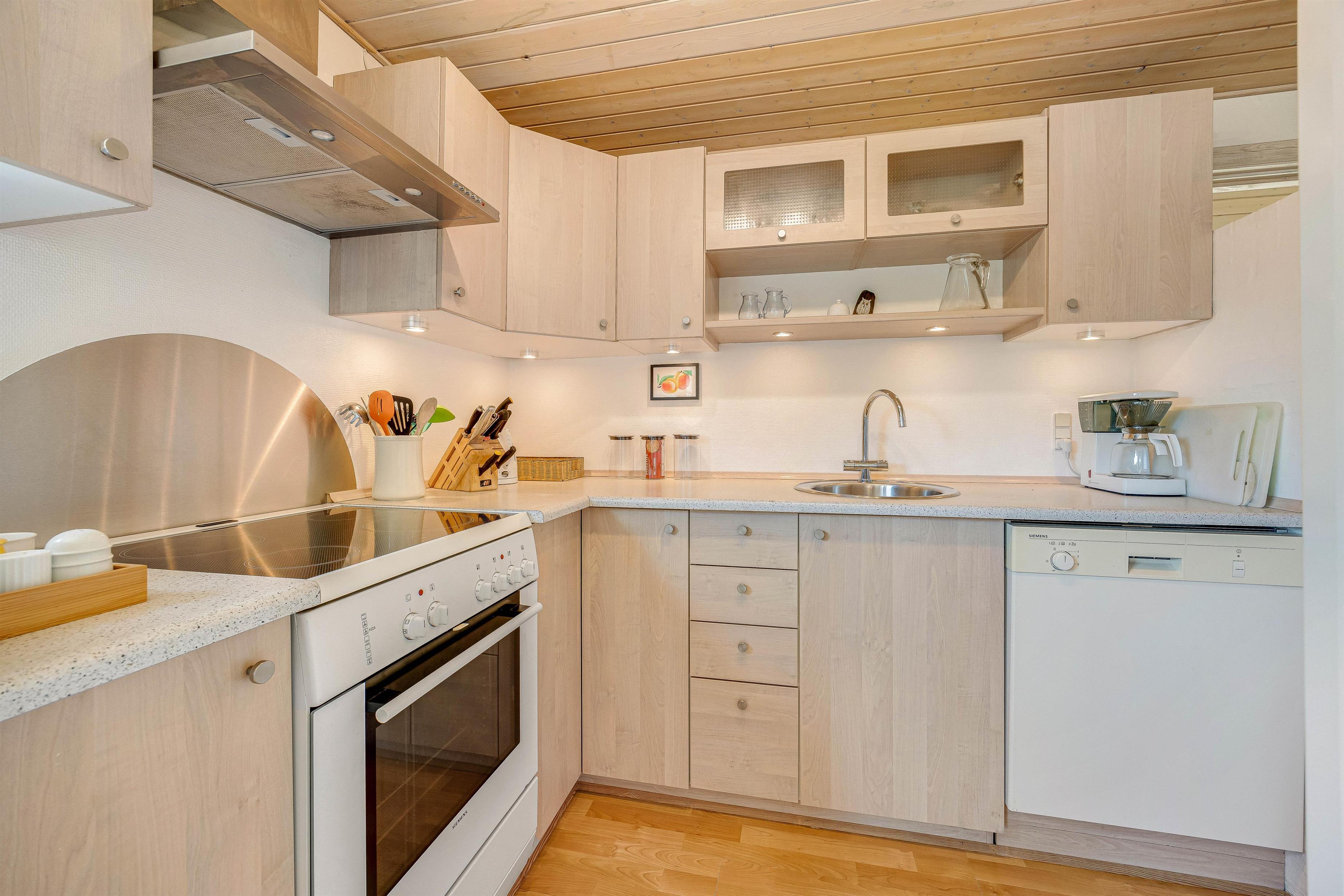 Hjertet i det 82 kvadratmeter store feriehus er alrummet, hvor køkken, stue og spiseplads ligger i åben forbindelse. Her kan I virkelig nyde hinandens selskab, uanset om I er sammen om at lave mad, spille spil og se film, eller om I laver noget hver især.