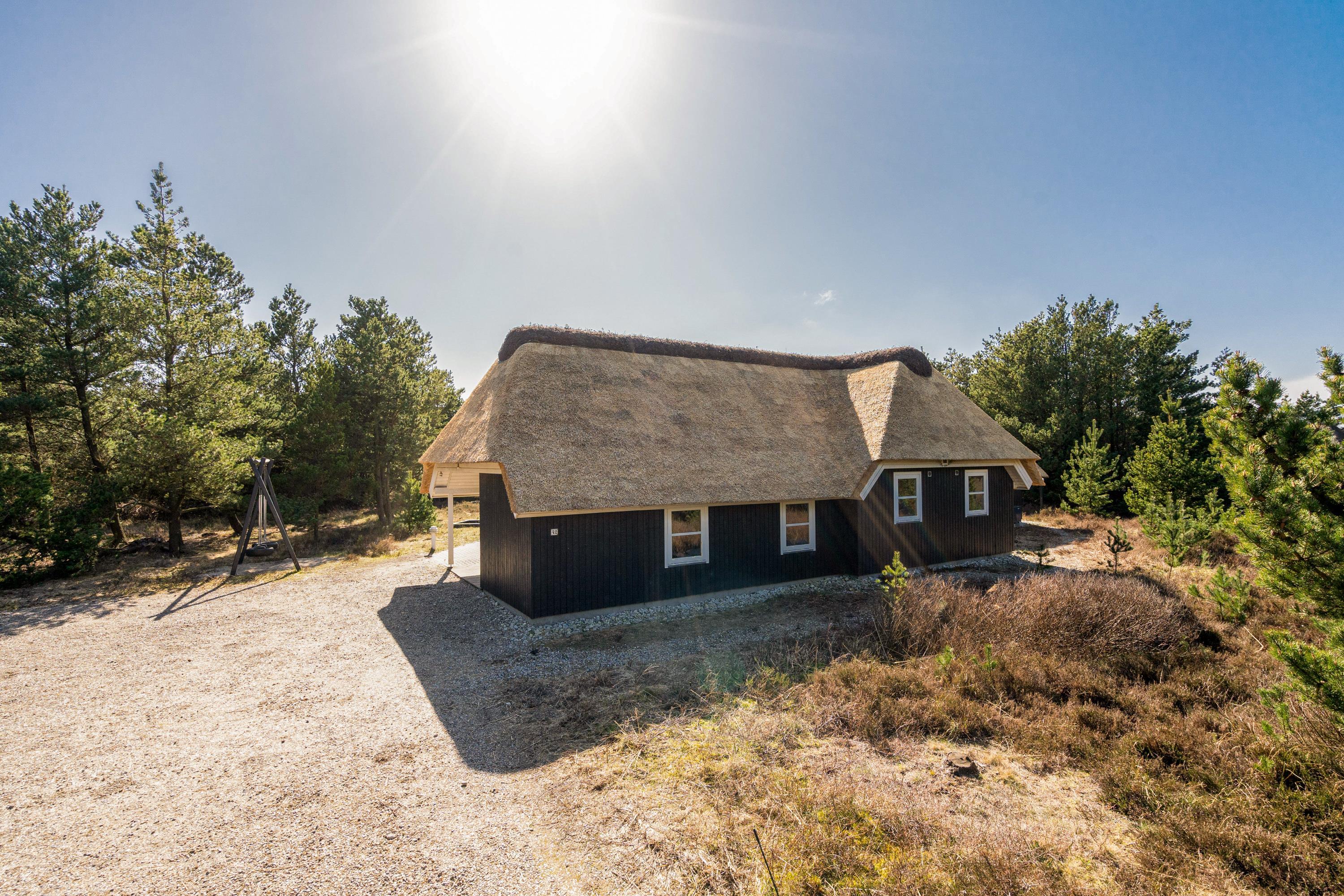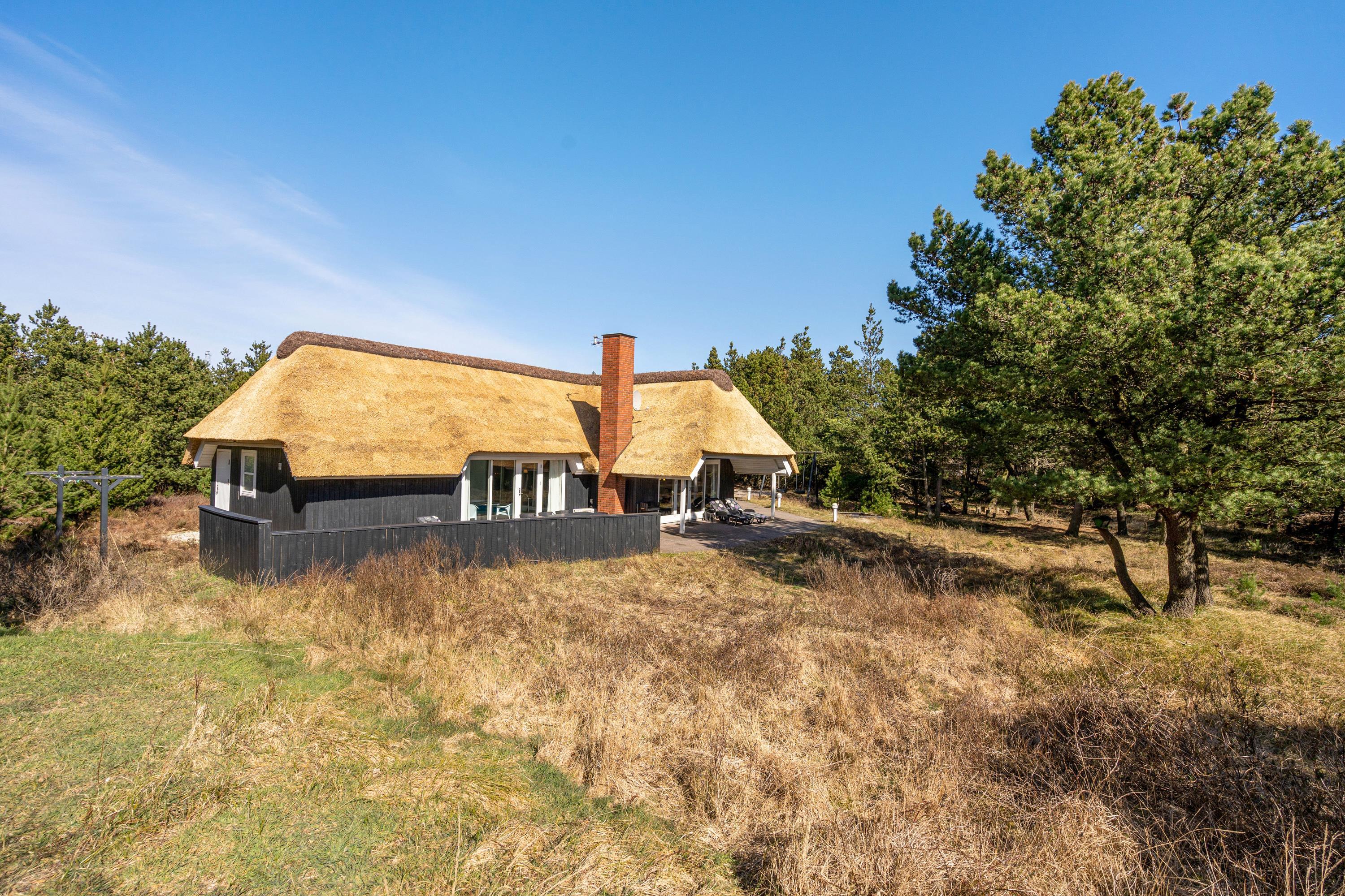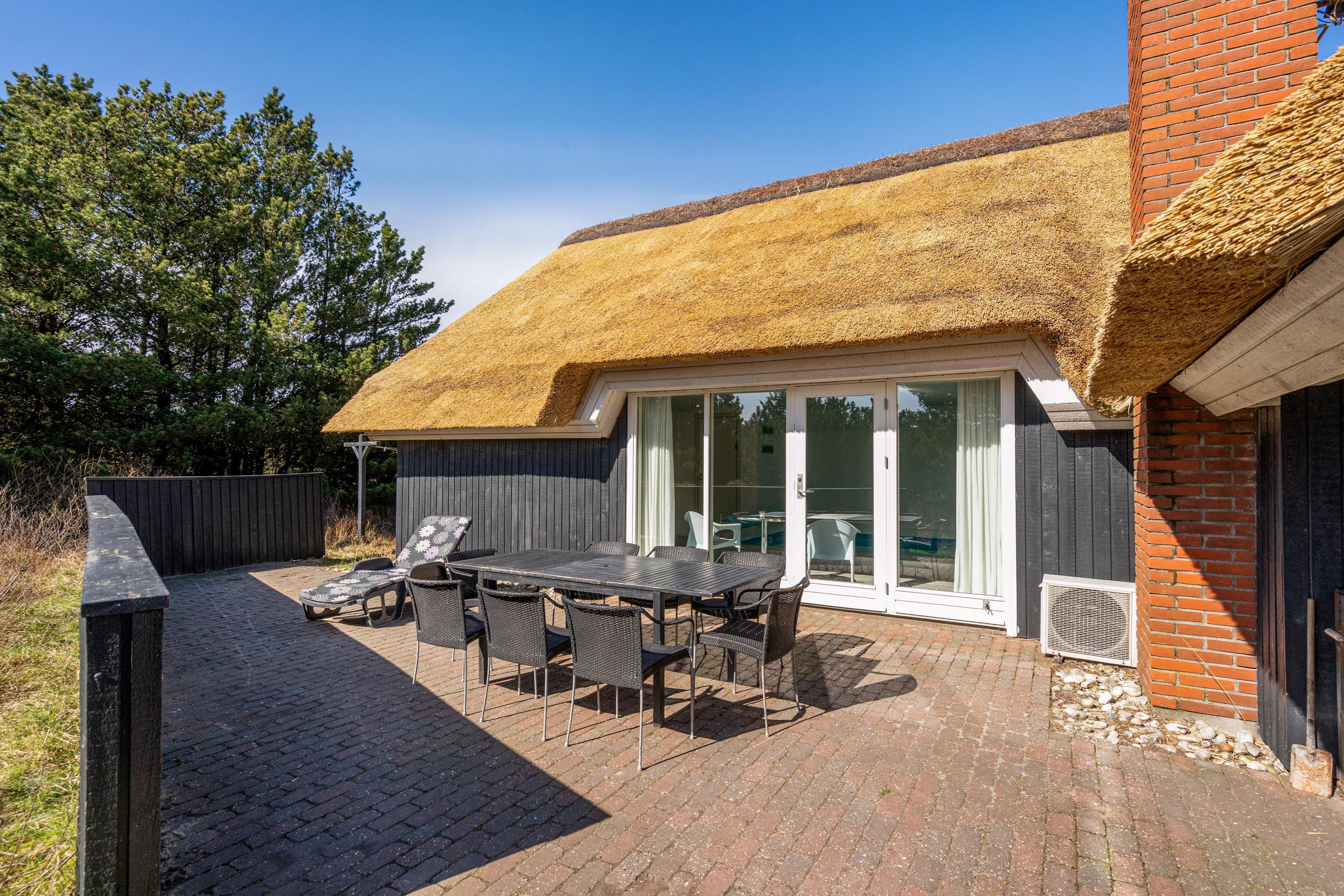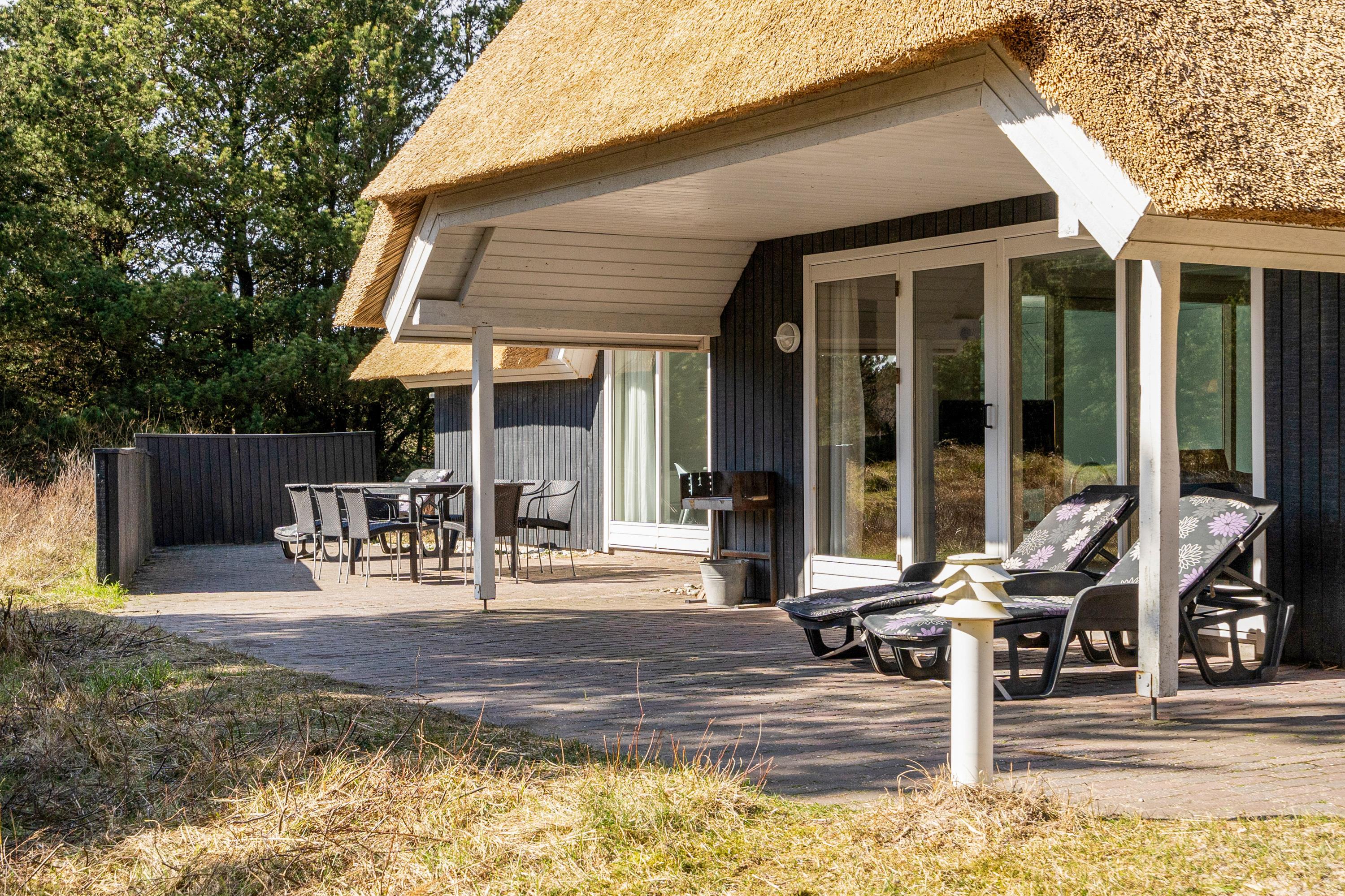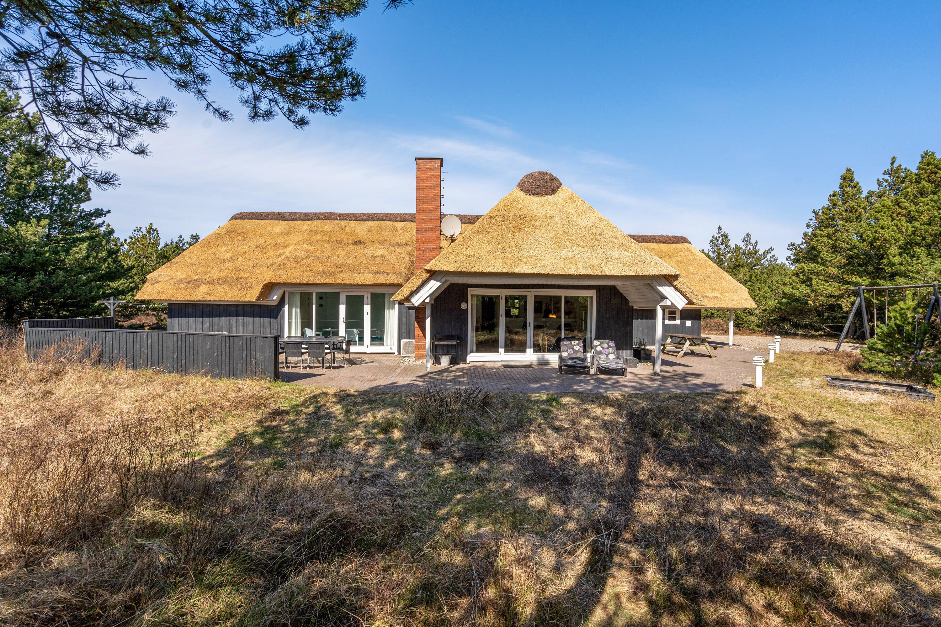 Det stråtækte sommerhus fremstår indbydende og rummeligt. Her er der god plads til 8 personer.