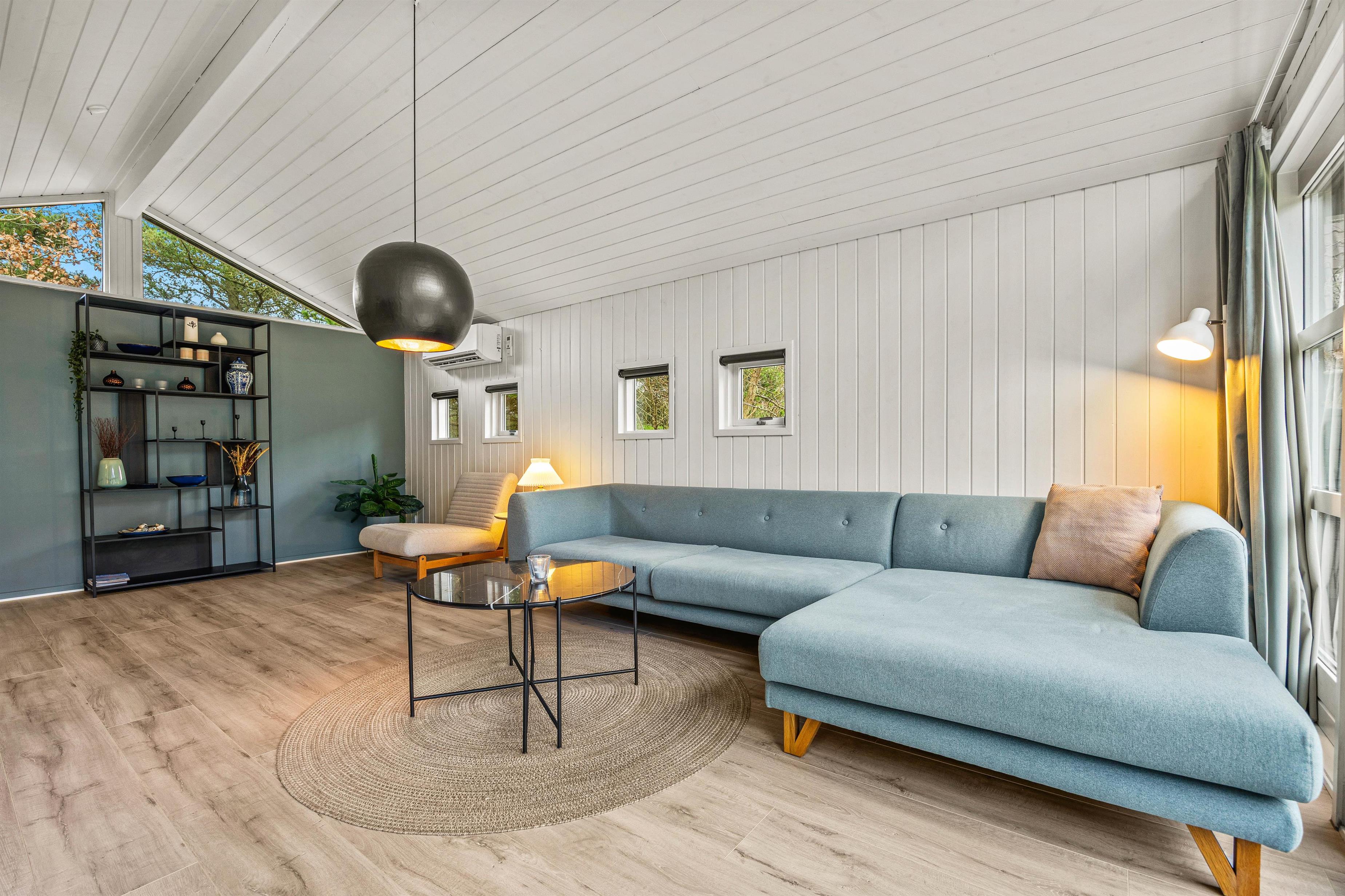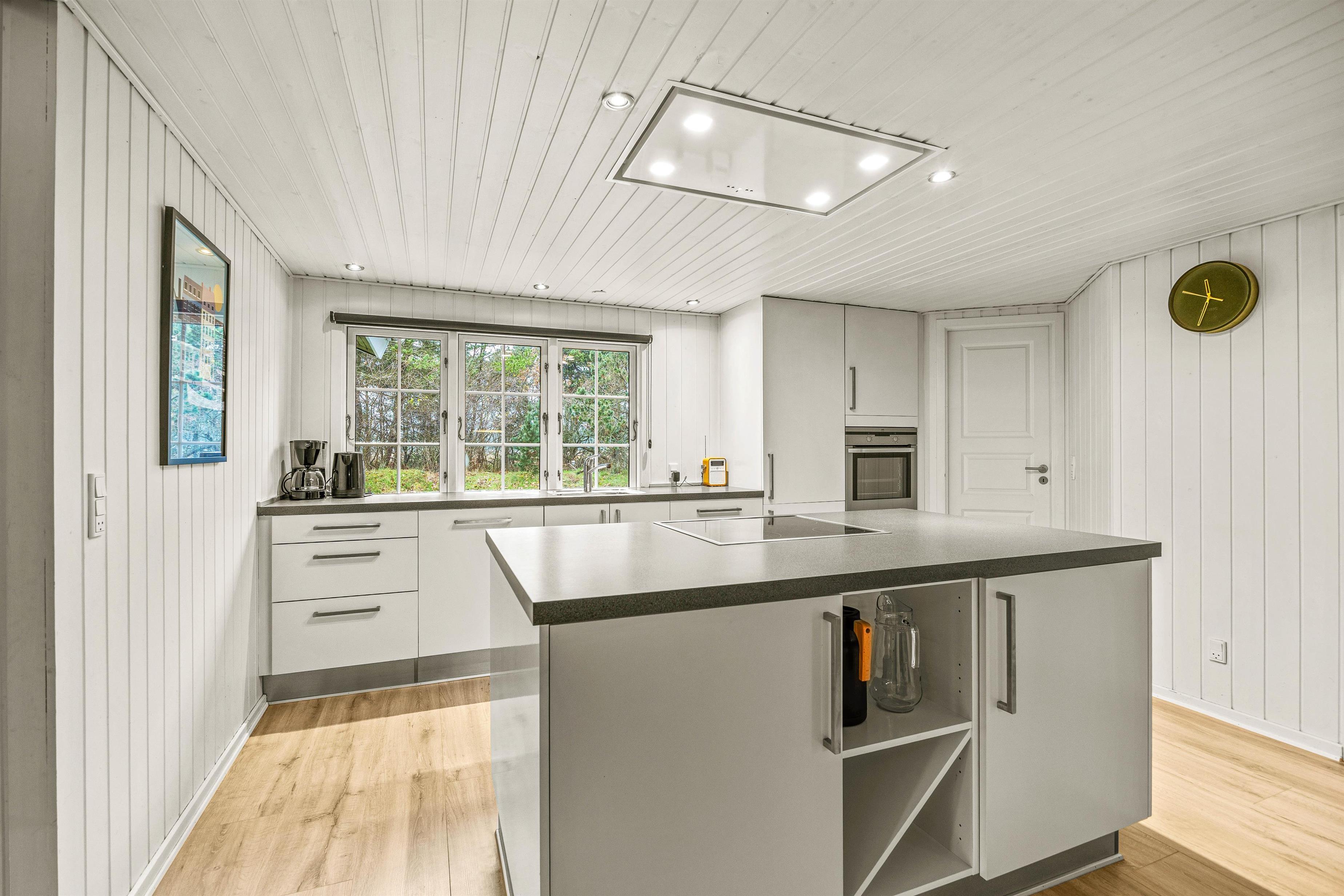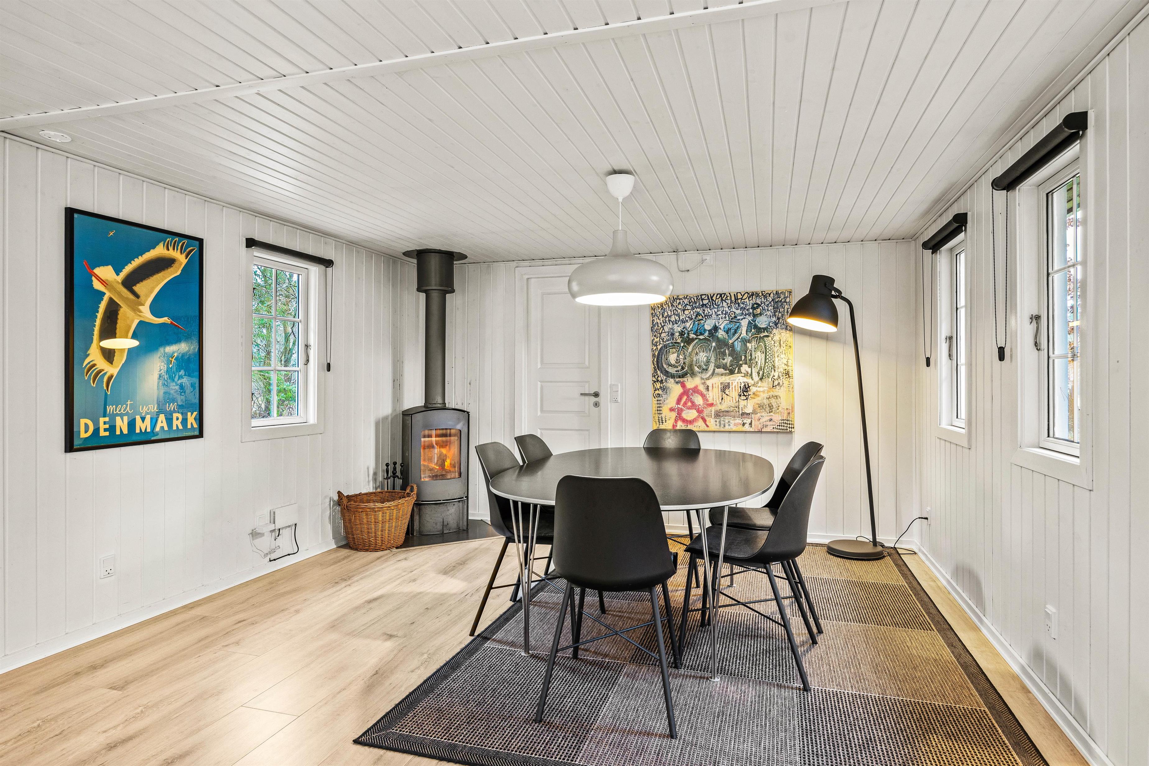 Det er nemt at se, at sommerhuset i 2020 har gennemgået en renovering. Det store opholdsrum, der forbinder stue, spiseafdeling og køkken i ét stort rum, fungerer som husets hjerte og byder på et godt miks mellem moderne og hyggelig indretningsstil. Her finder I desuden den klassiske brændeovn, som spreder varme og god stemning på hver en feriedag.