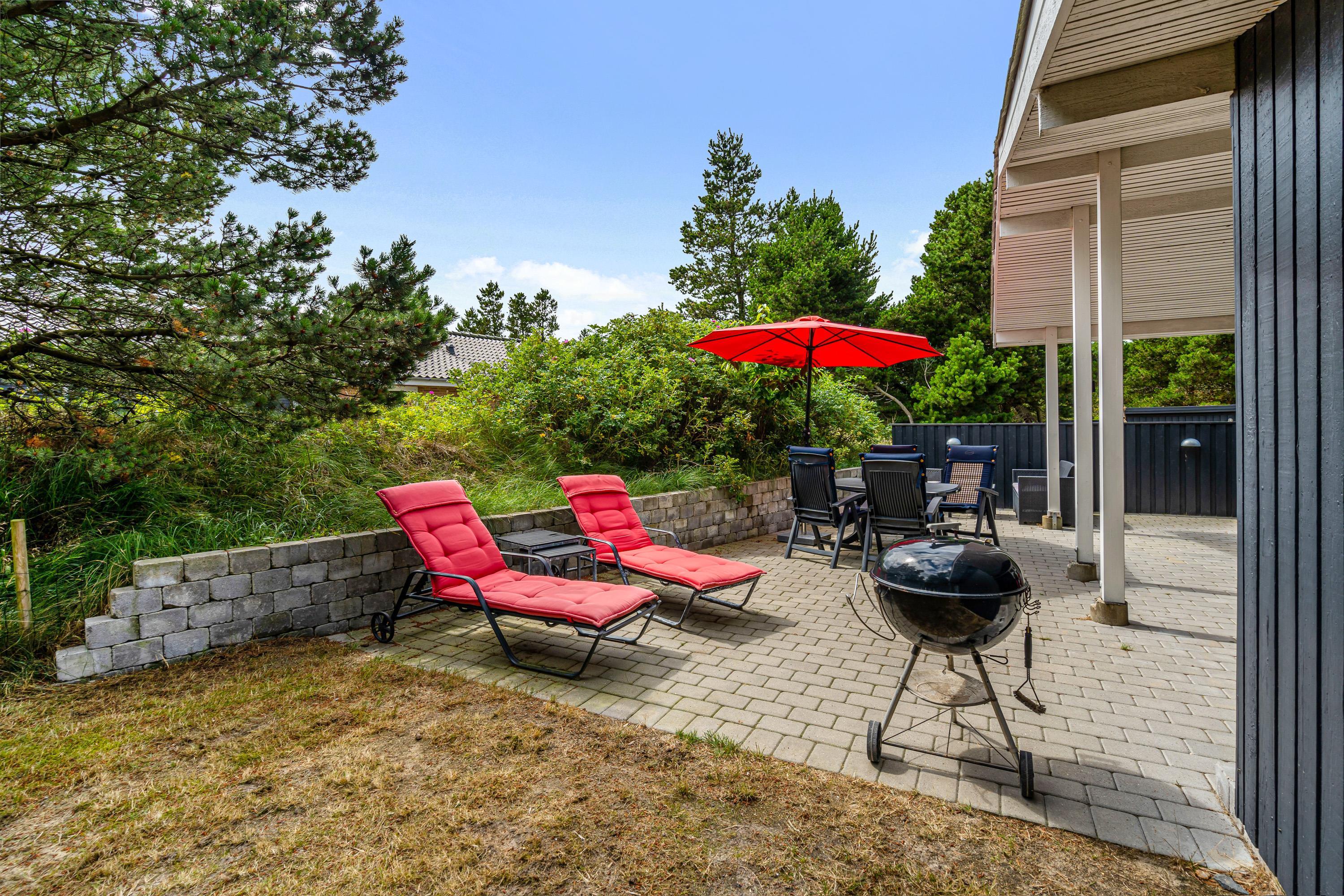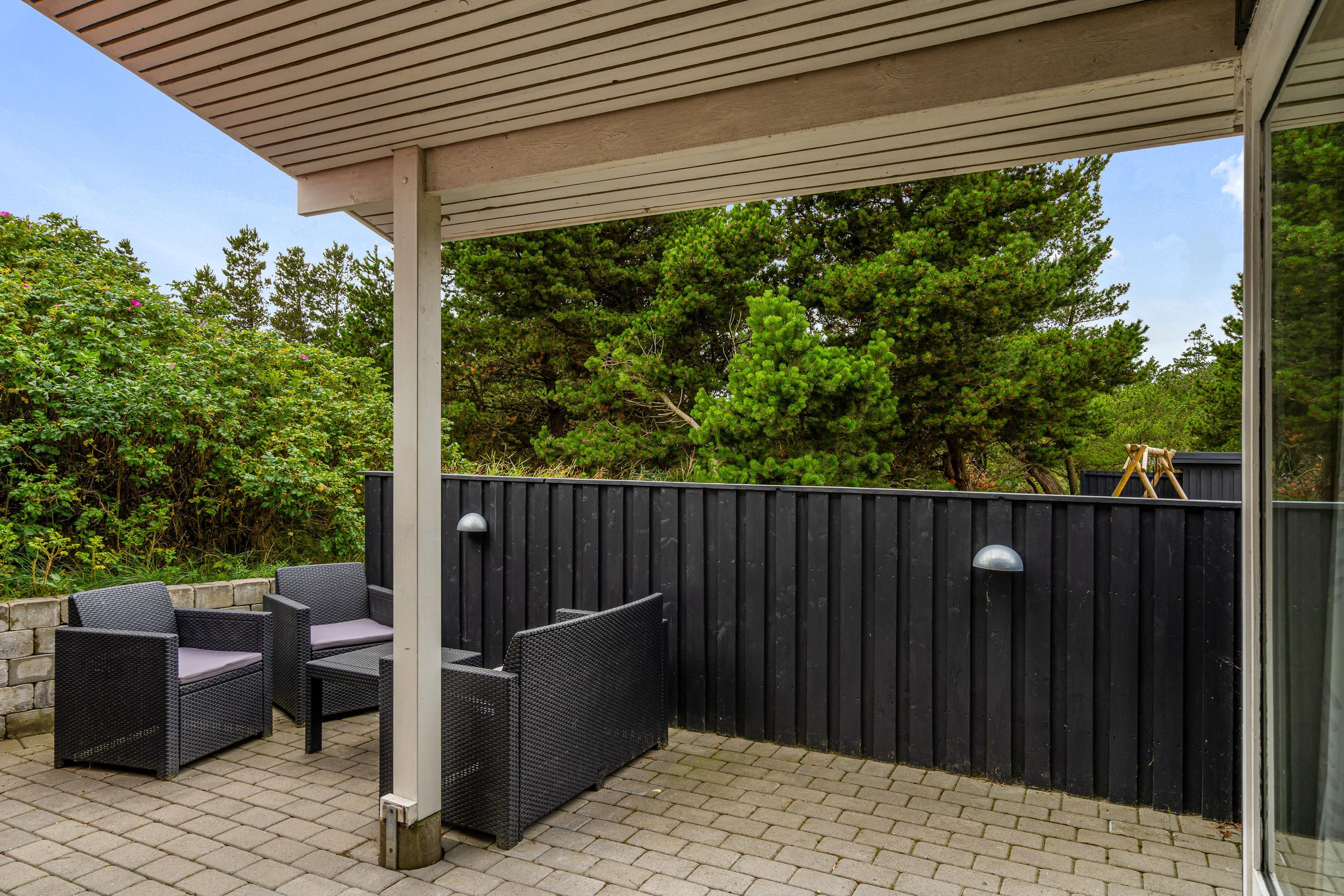 På sommerhusets udeområde har I en dejlig terrasse, der er afskærmet og delvist overdækket. Det er oplagt at søge ud på terrassen på de varme feriedage, hvor der står både havemøbler og liggestole klar til jer.