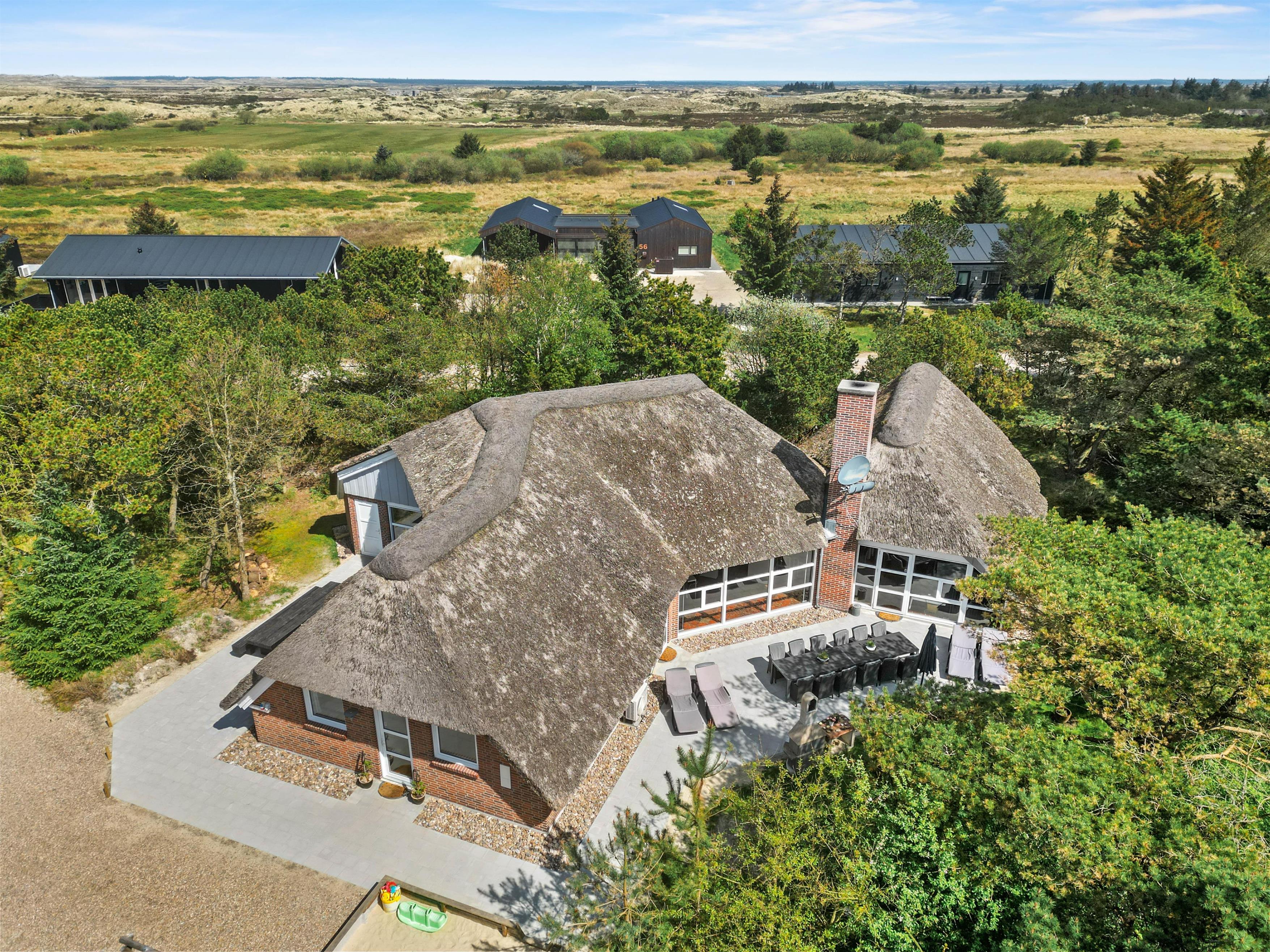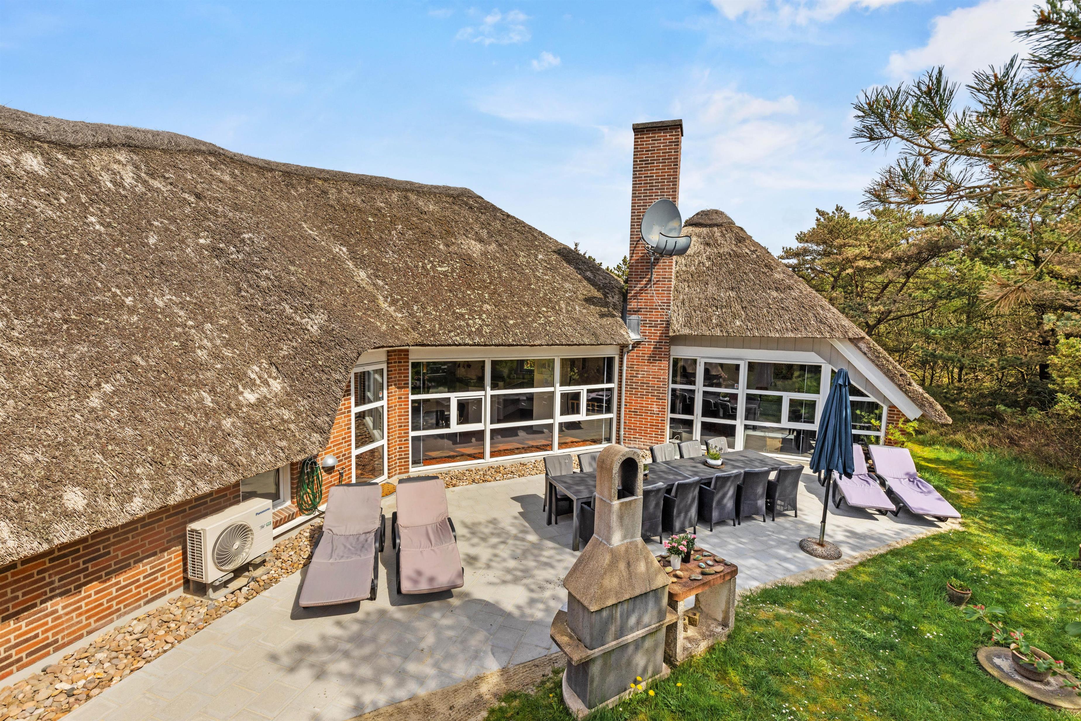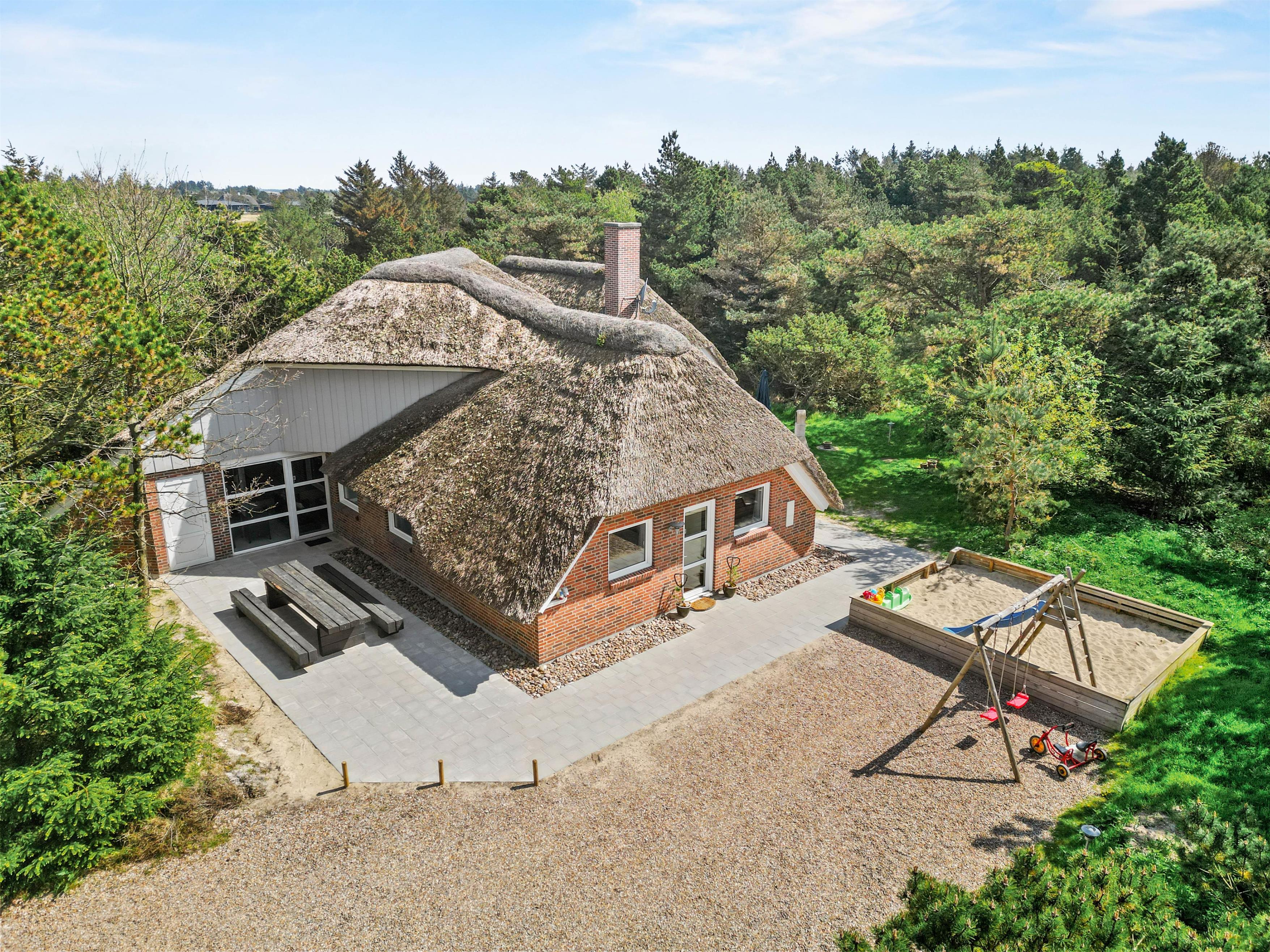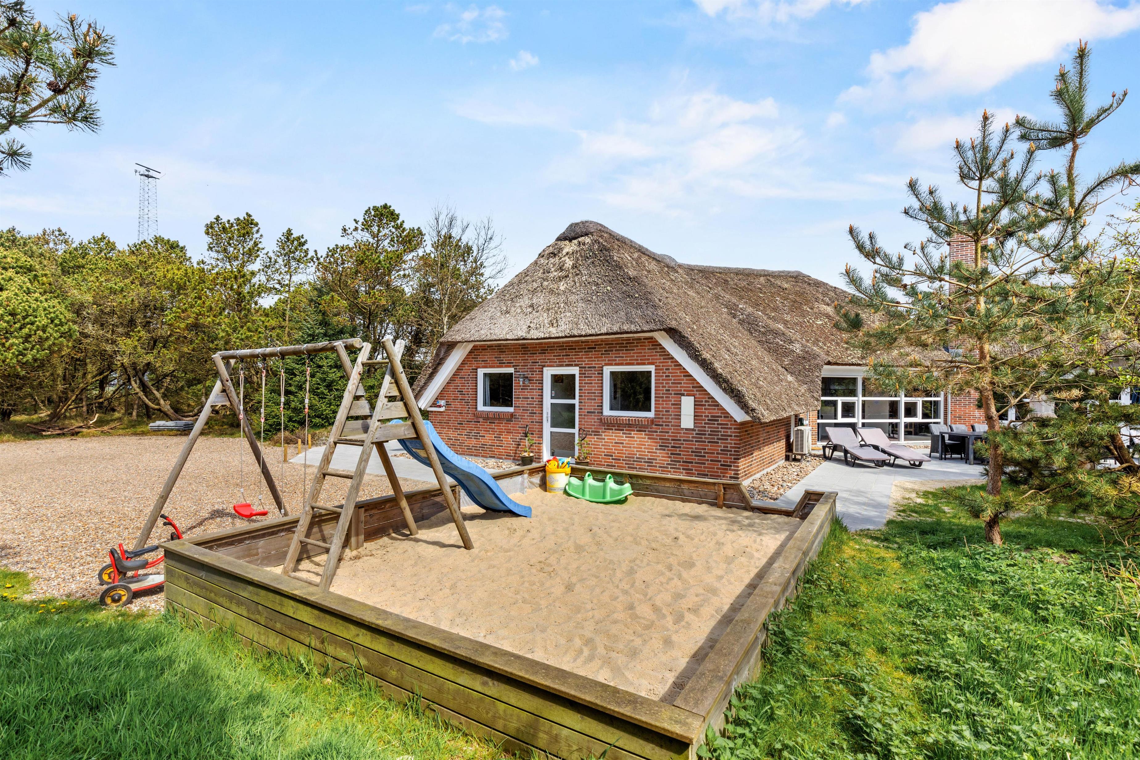 Det stråtækte feriehus i Vestermarken 5B ligger på en stor naturgrund, ugenert og omgivet af løv- og nåletræer, og I kan slappe af i de komfortable havemøbler og liggestole på den åbne terrasse, mens børnene leger på gyngen, rutsjebanen og i sandkassen.