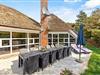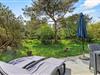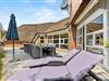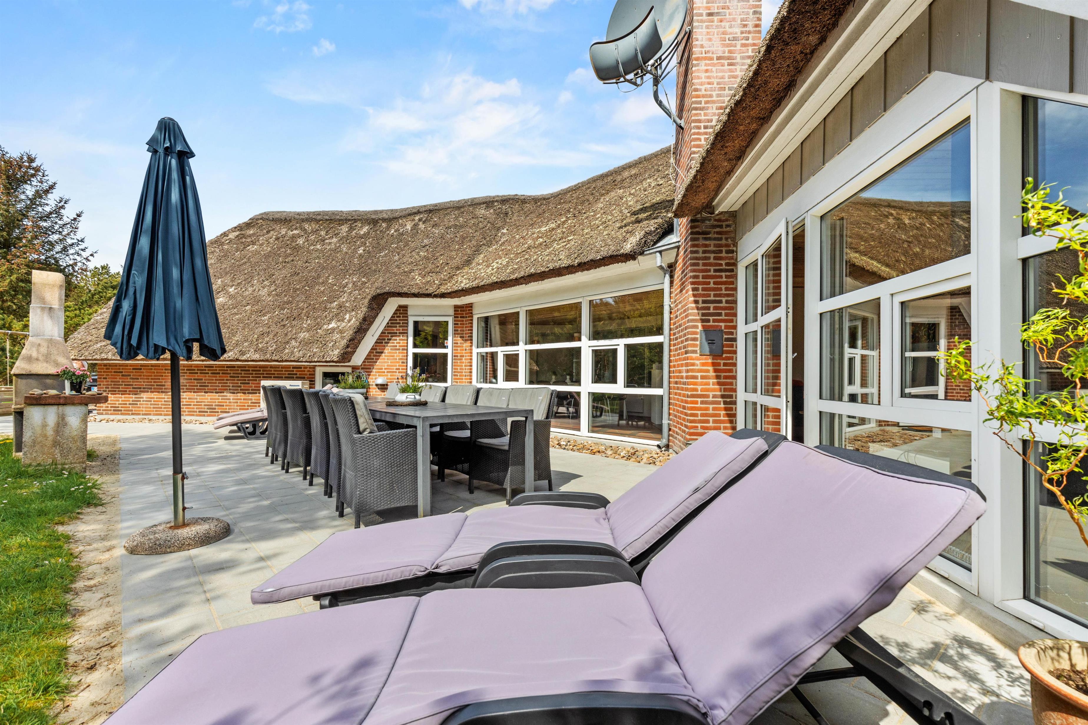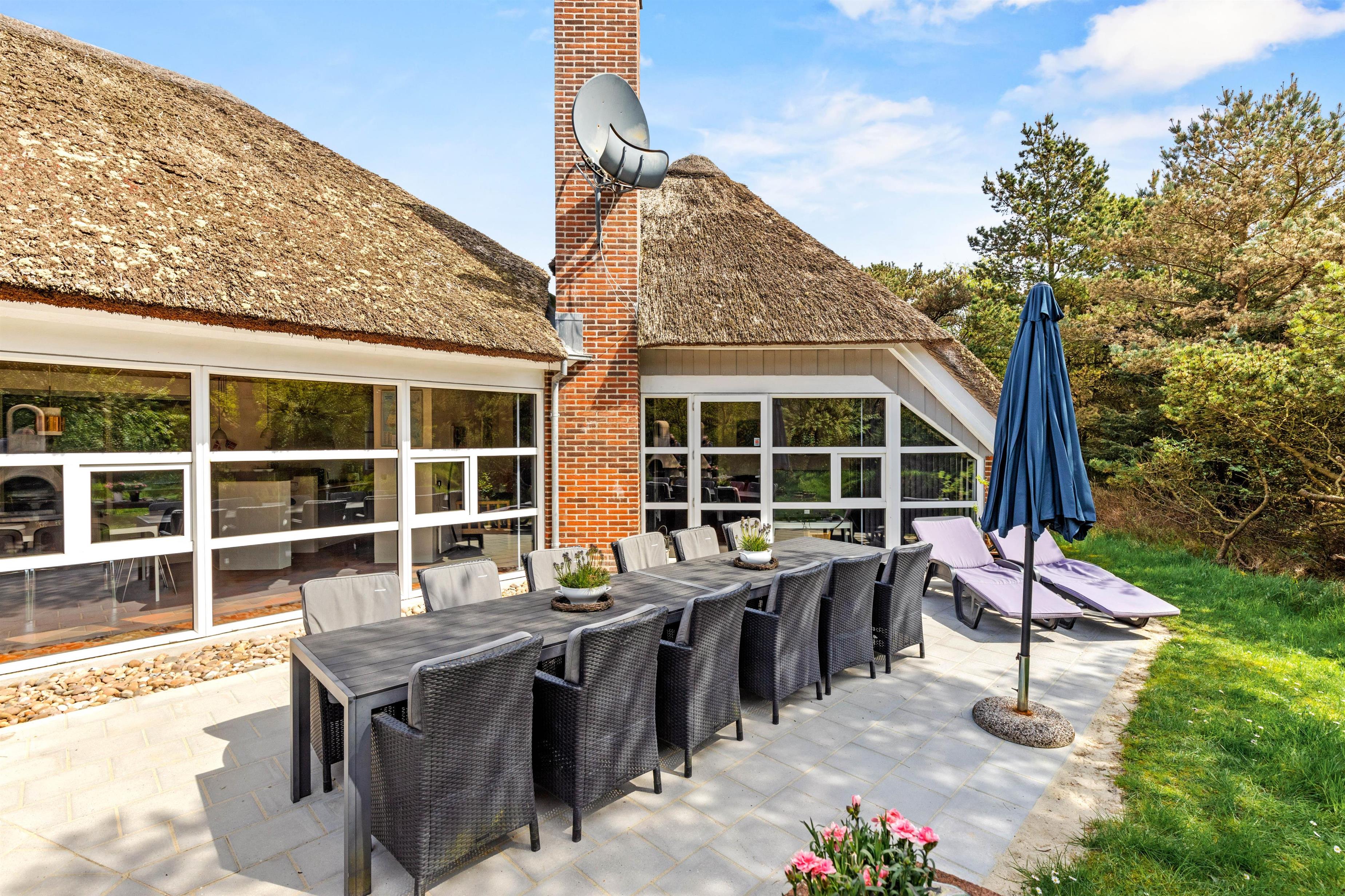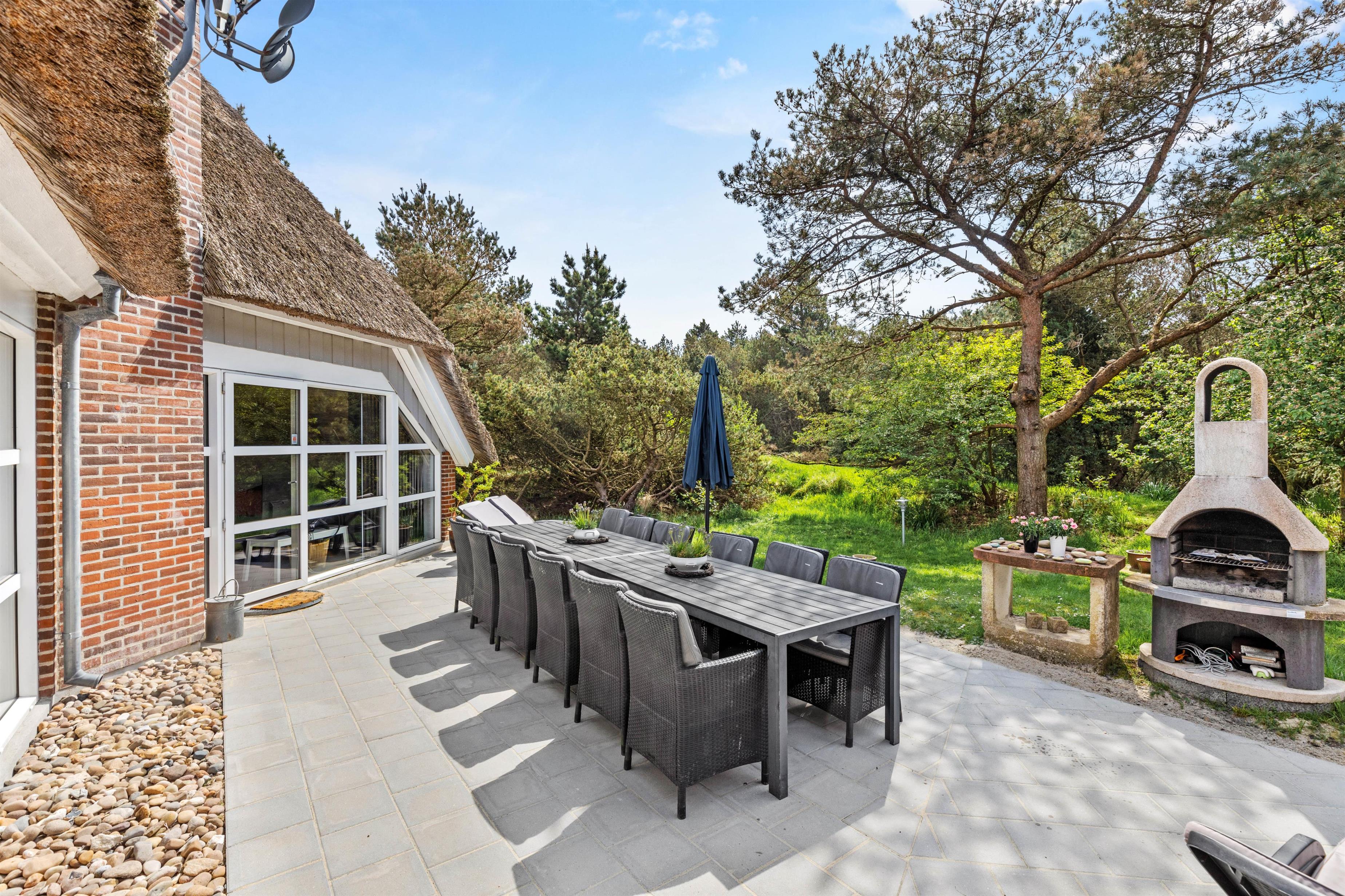 Det stråtækte feriehus i Vestermarken 5B ligger på en stor naturgrund, ugenert og omgivet af løv- og nåletræer, og I kan slappe af i de komfortable havemøbler og liggestole på den åbne terrasse, mens børnene leger på gyngen, rutsjebanen og i sandkassen.