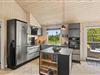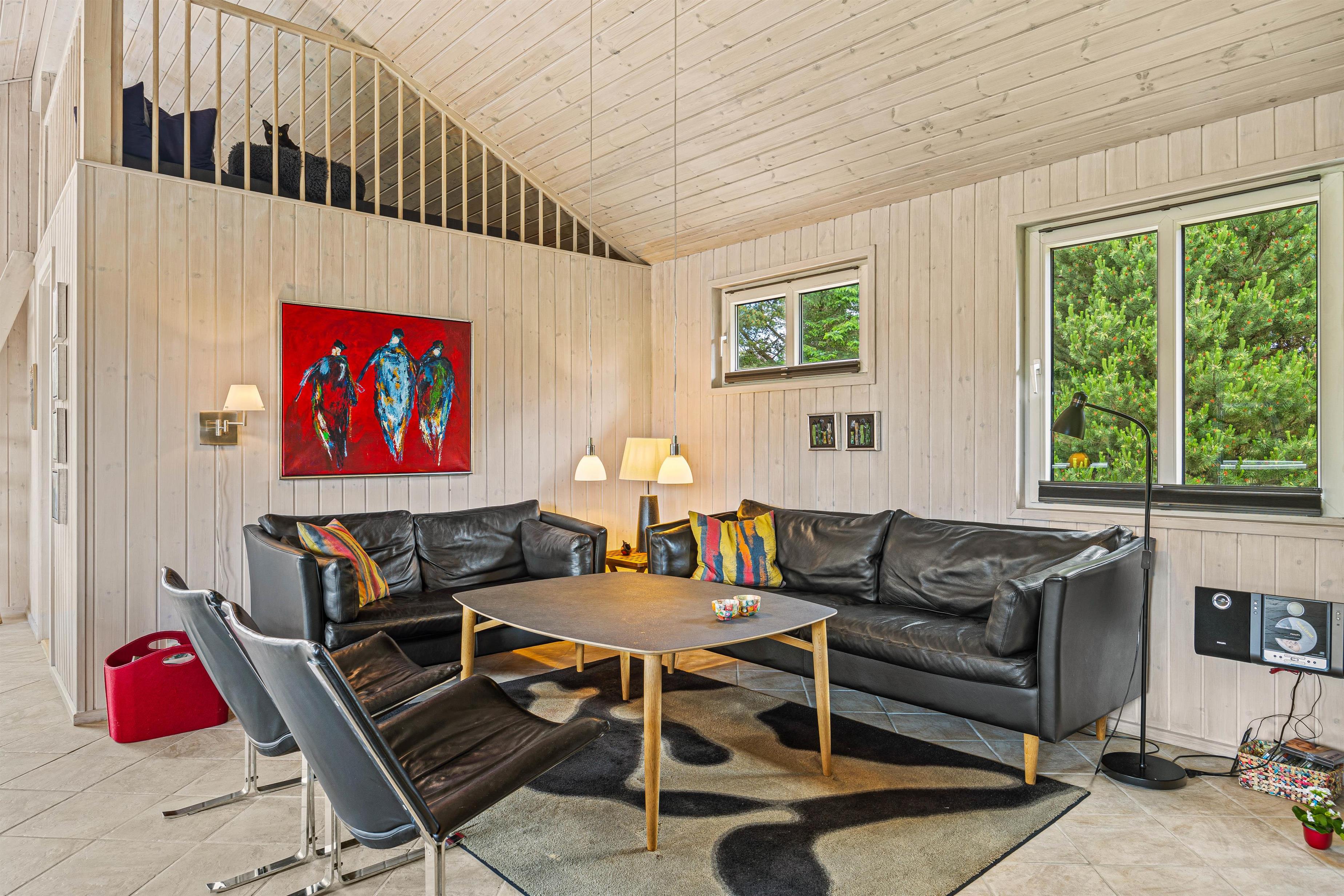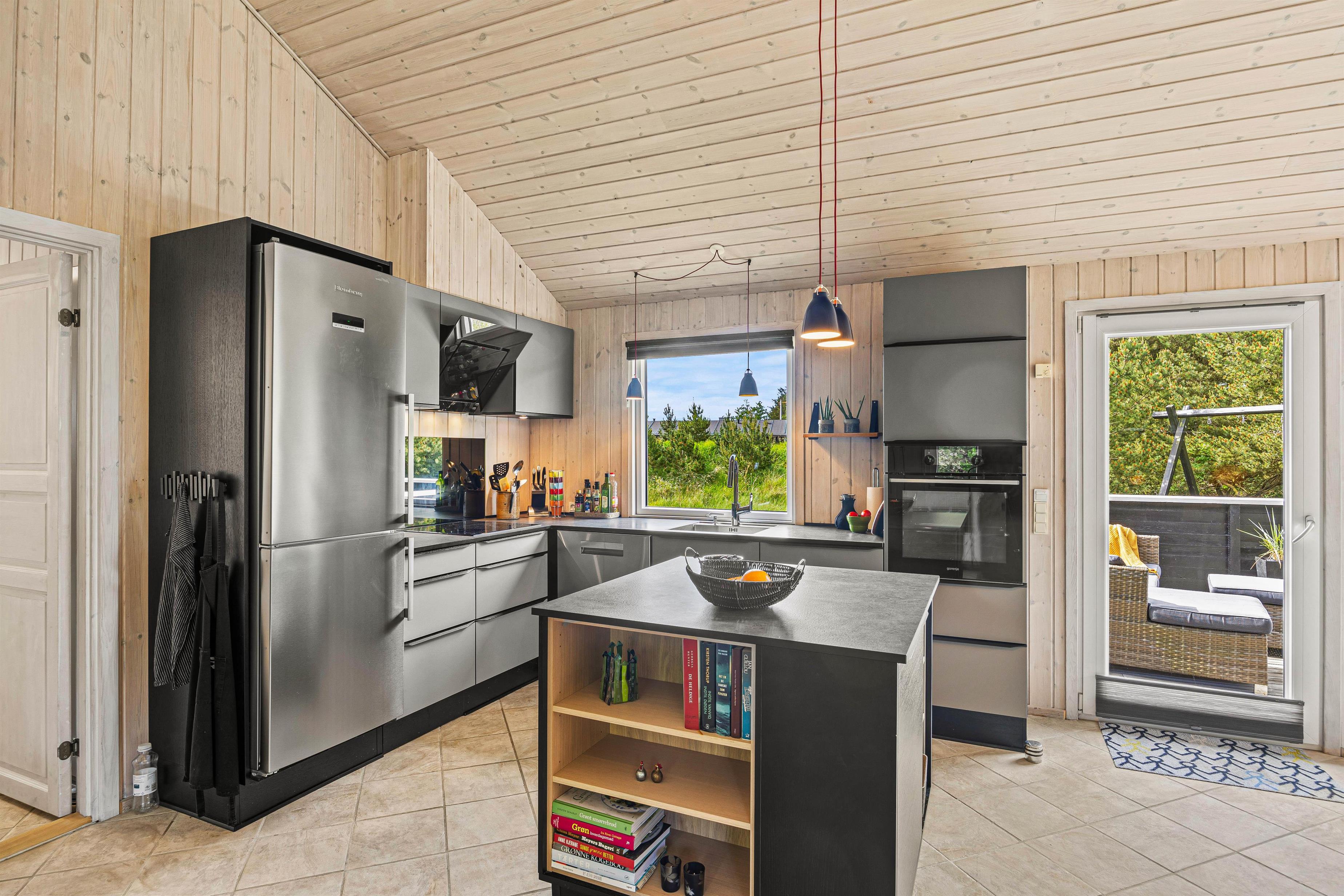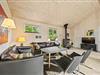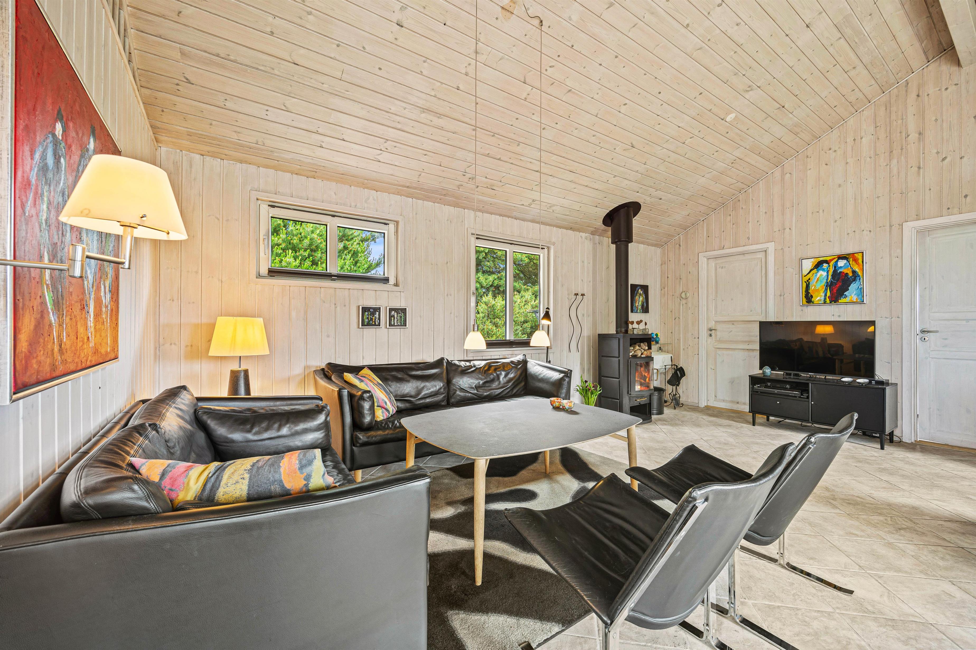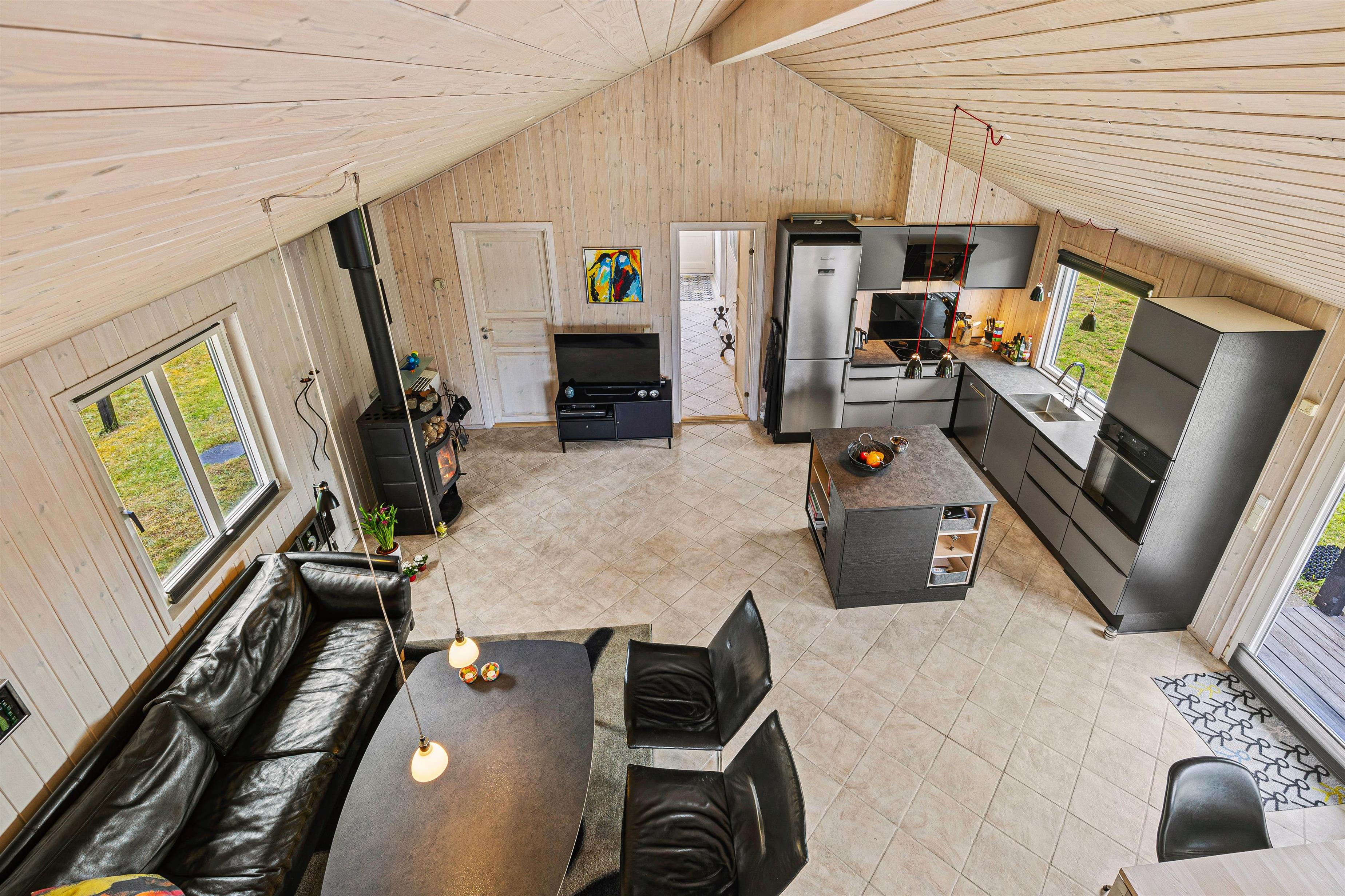 Den rummelige stue er hjertet af sommerhuset og indbyder til hyggelige stunder ved brændeovnen, hvor du kan samles med dine kære og skabe dejlige ferieminder. Fra stuen er der opgang til hemsen, hvor børnene helt sikkert vil elske at opholde sig. Den energibesparende varmepumpe sørger for et behageligt indeklima hele året rundt, og det moderne køkken er veludstyret; blandt andet med opvaskemaskine der sikrer, at I kan fokusere på mere afslapning og tid med familien.