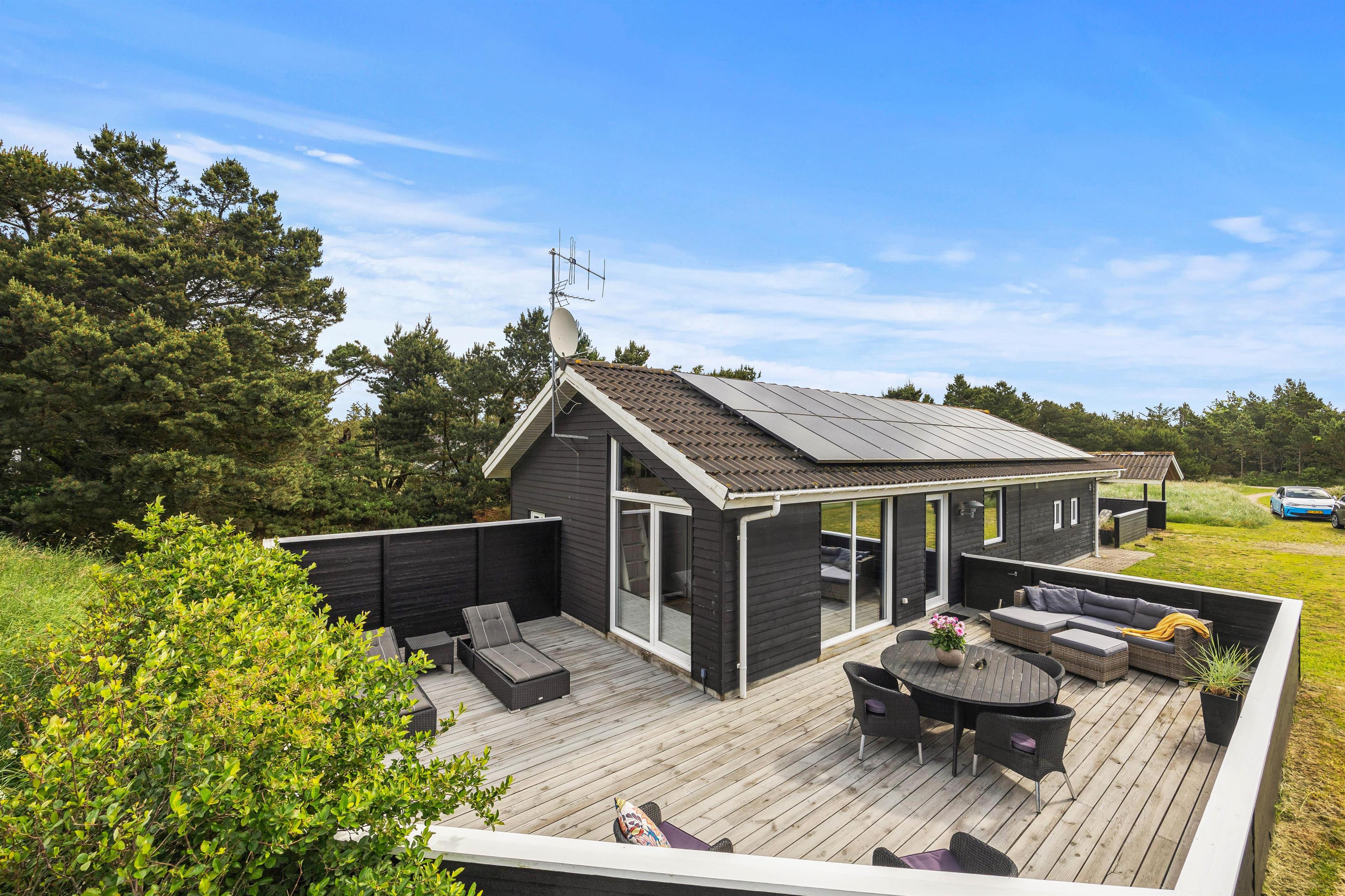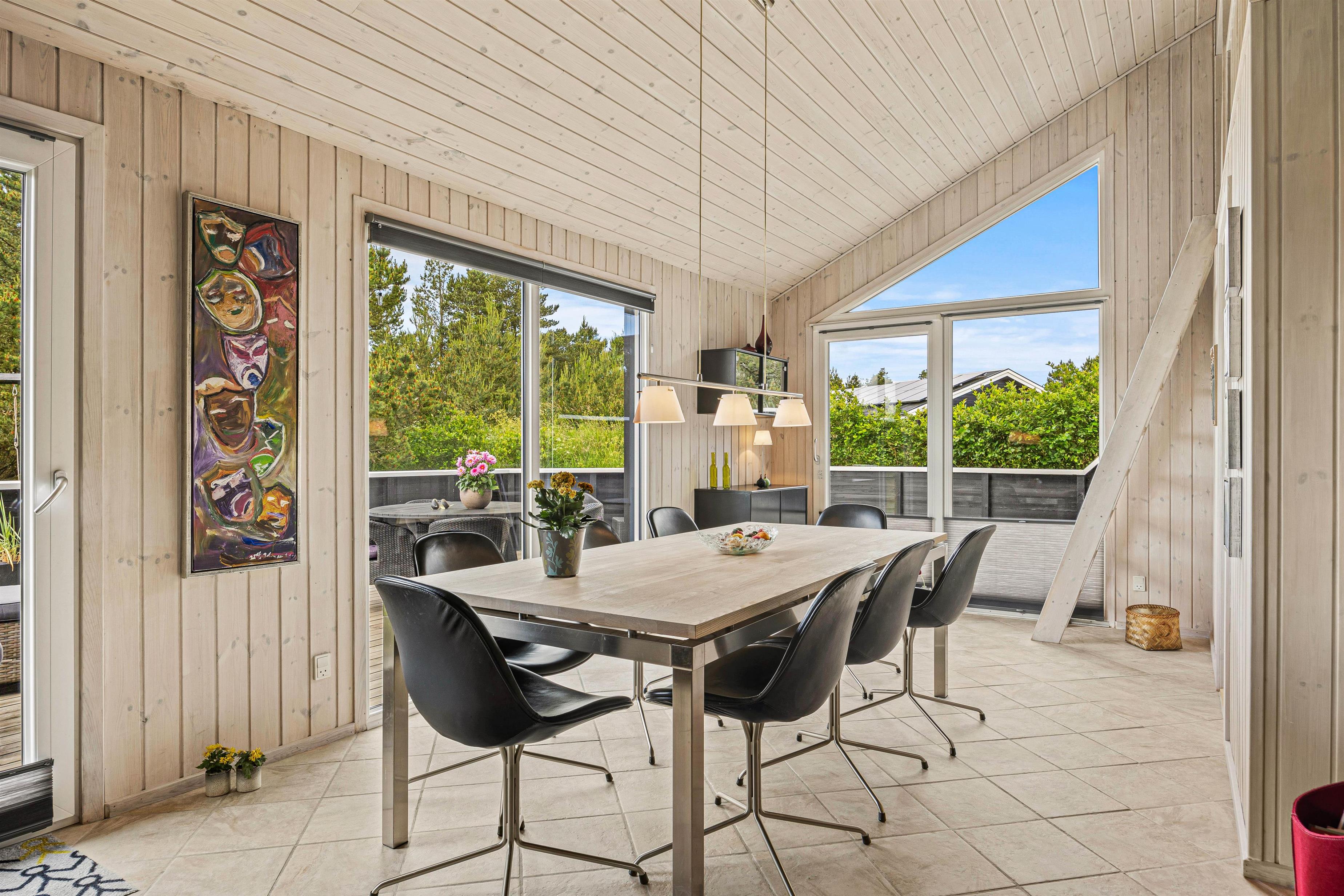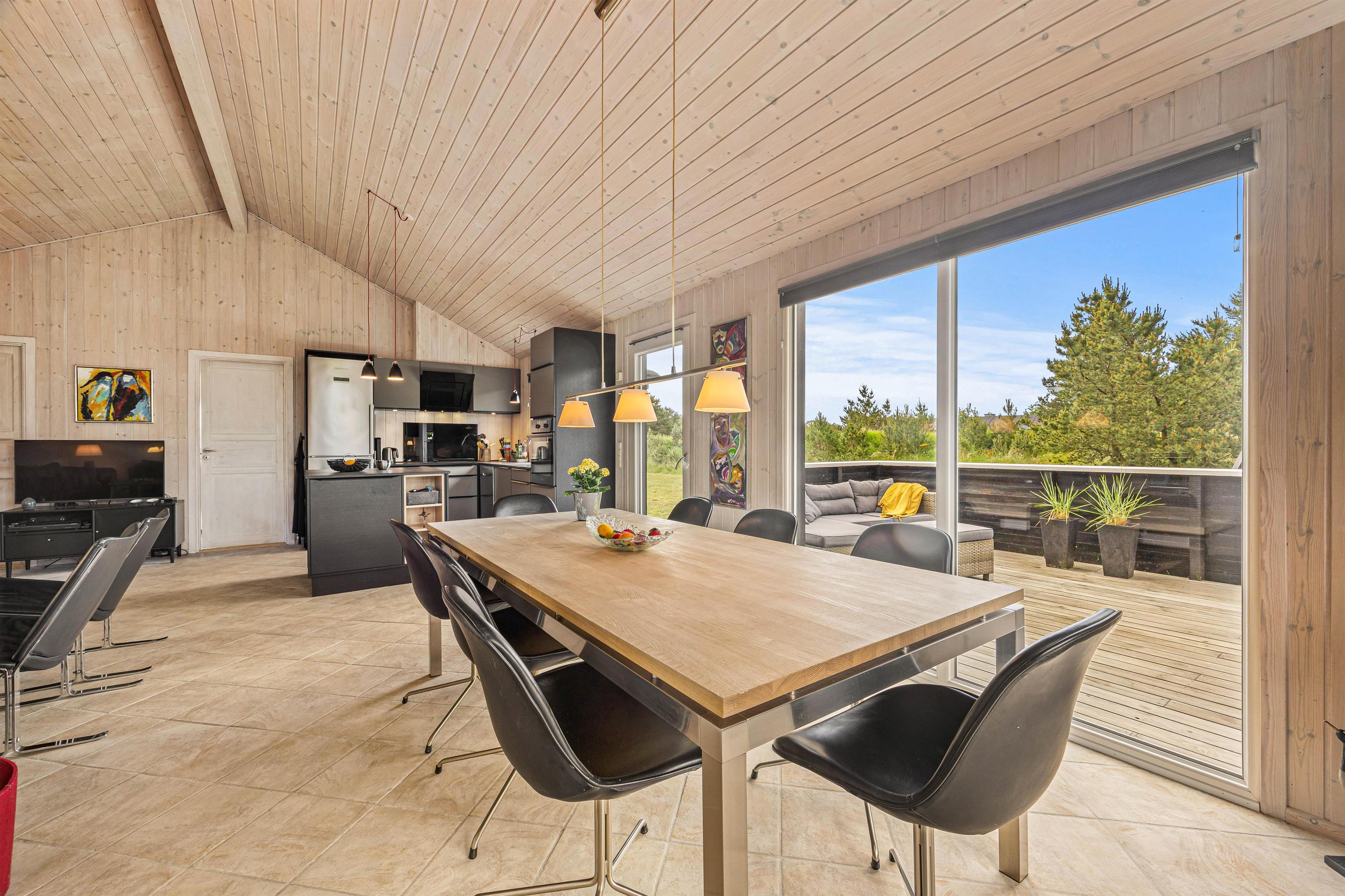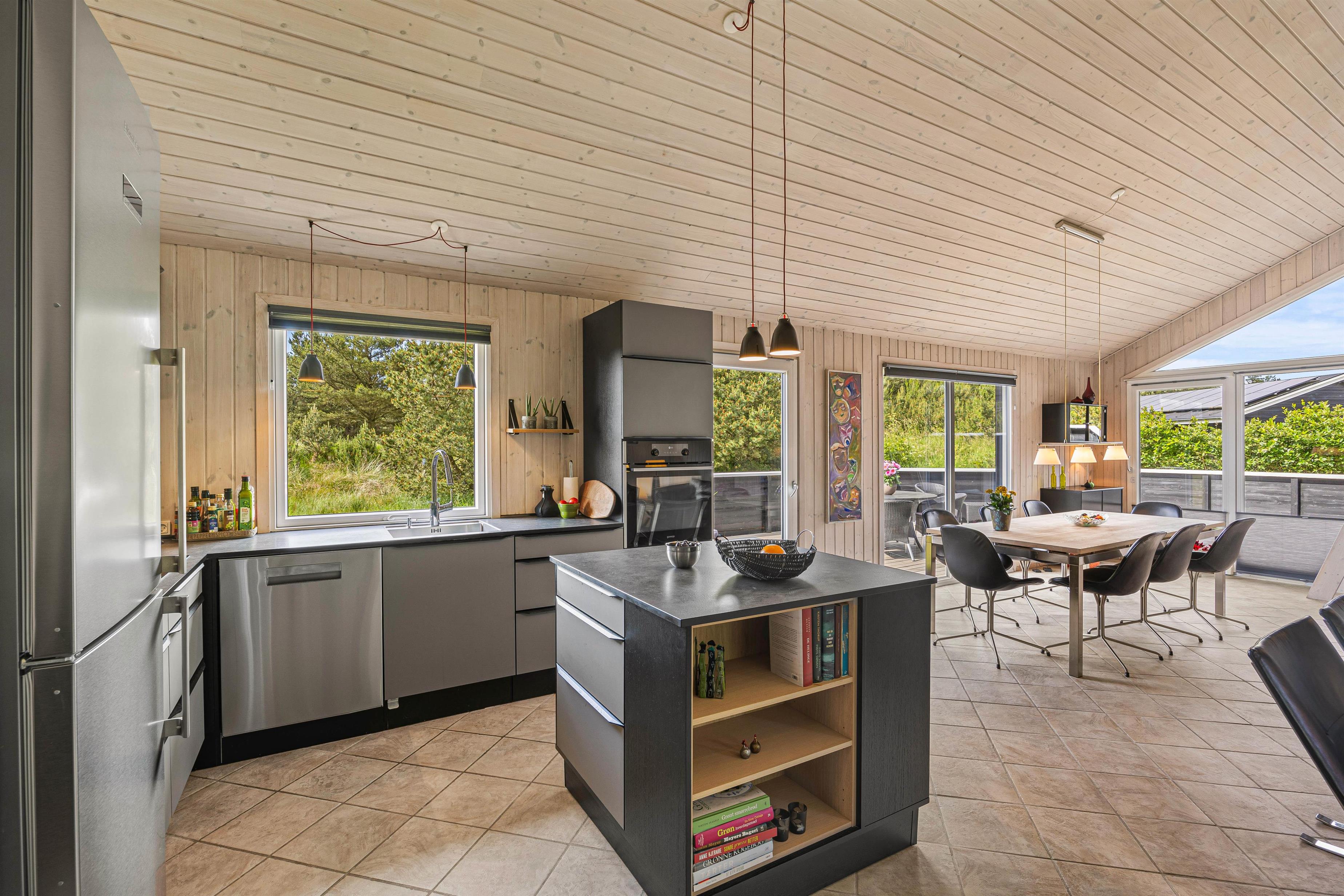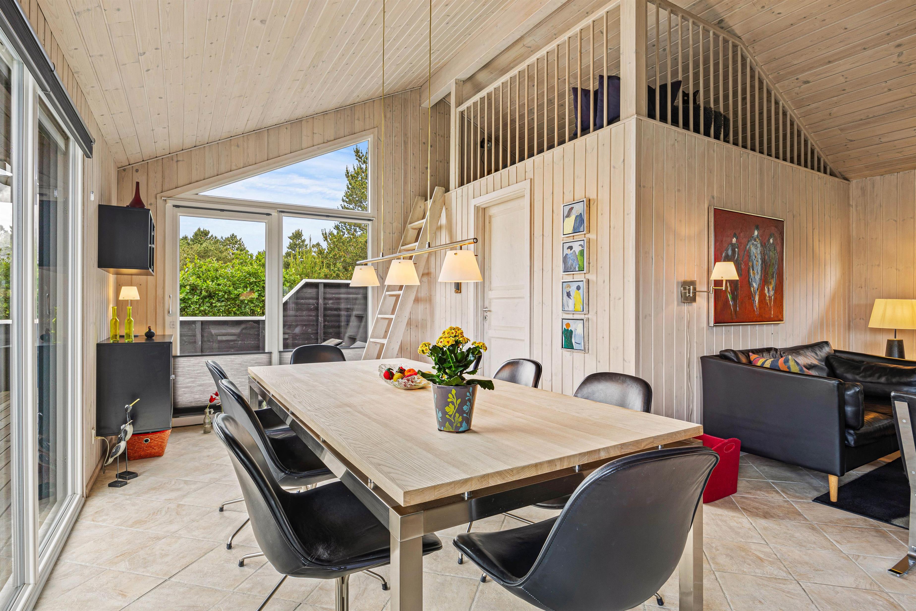 Den rummelige stue er hjertet af sommerhuset og indbyder til hyggelige stunder ved brændeovnen, hvor du kan samles med dine kære og skabe dejlige ferieminder. Fra stuen er der opgang til hemsen, hvor børnene helt sikkert vil elske at opholde sig. Den energibesparende varmepumpe sørger for et behageligt indeklima hele året rundt, og det moderne køkken er veludstyret; blandt andet med opvaskemaskine der sikrer, at I kan fokusere på mere afslapning og tid med familien.