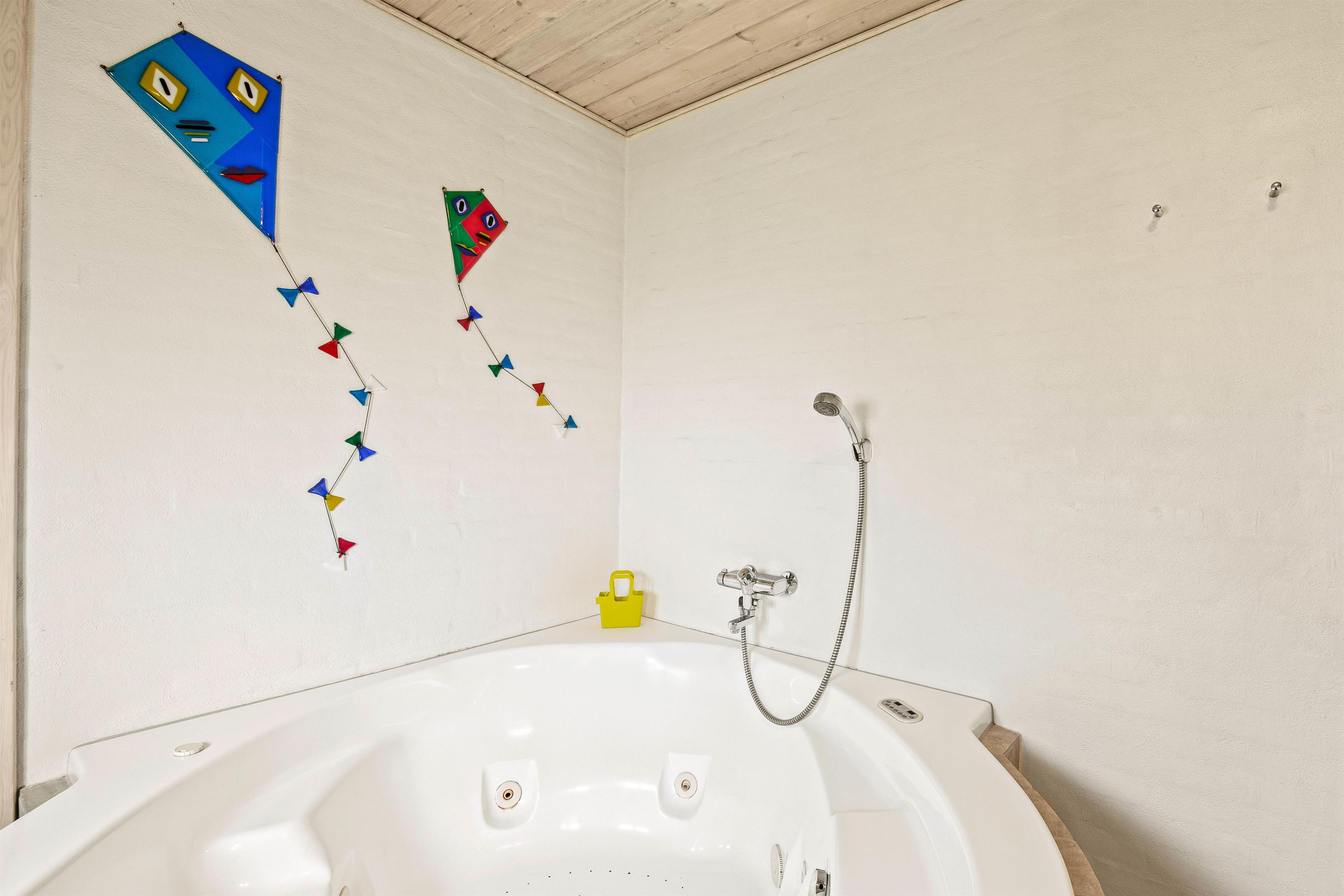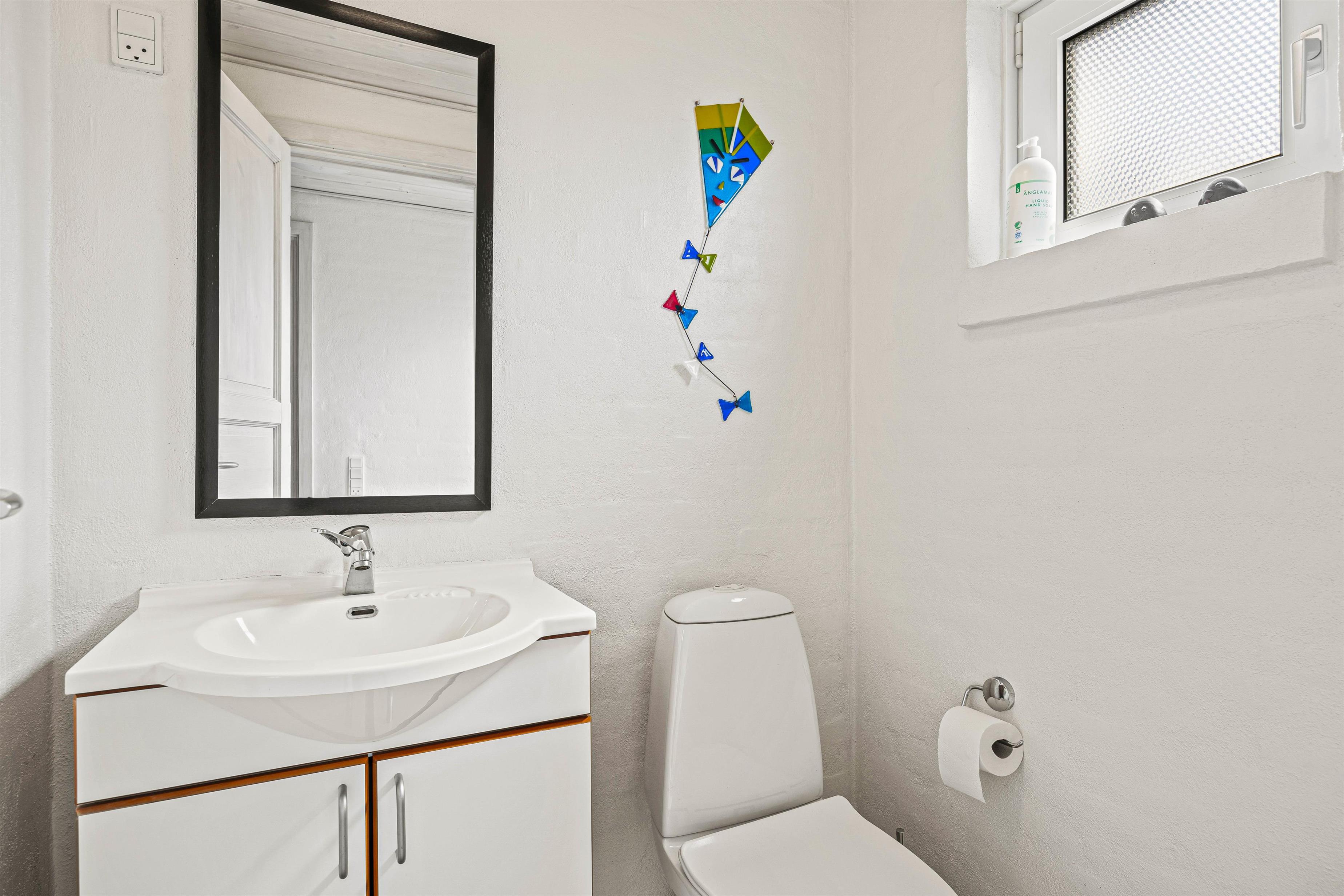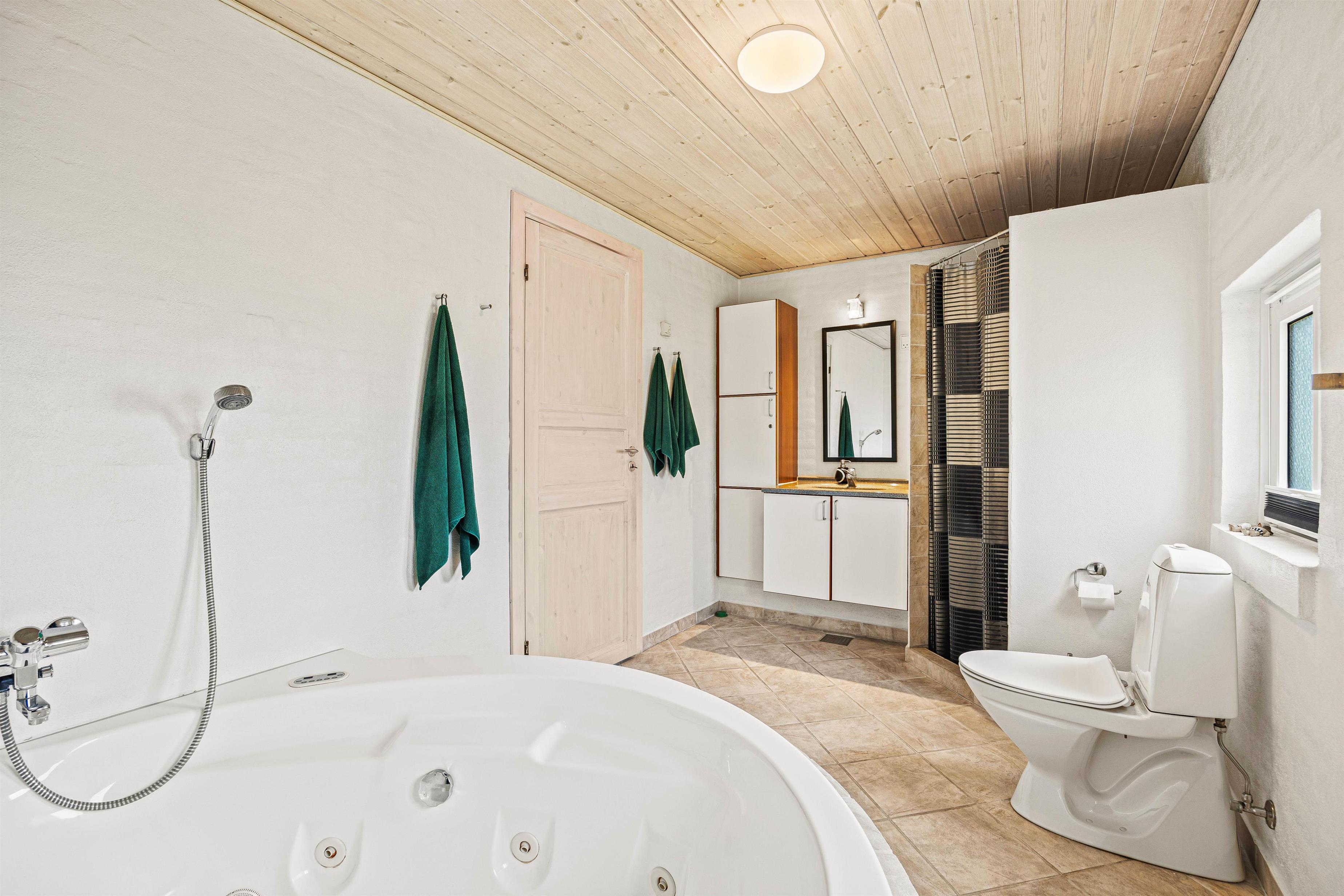 På sommerhusets badeværelse med gulvvarme finder I et spabad, så hvis I trænger til lidt ekstra afslapning, er det her I skal søge mod. Som et ekstra plus har sommerhuset også et fint gæstetoilet, så køen om morgenen ikke bliver for lang. Også her er der gulvvarme. Der er både vaskemaskine og tørretumbler til jeres rådighed, så I kan pakke let og vaske undervejs.