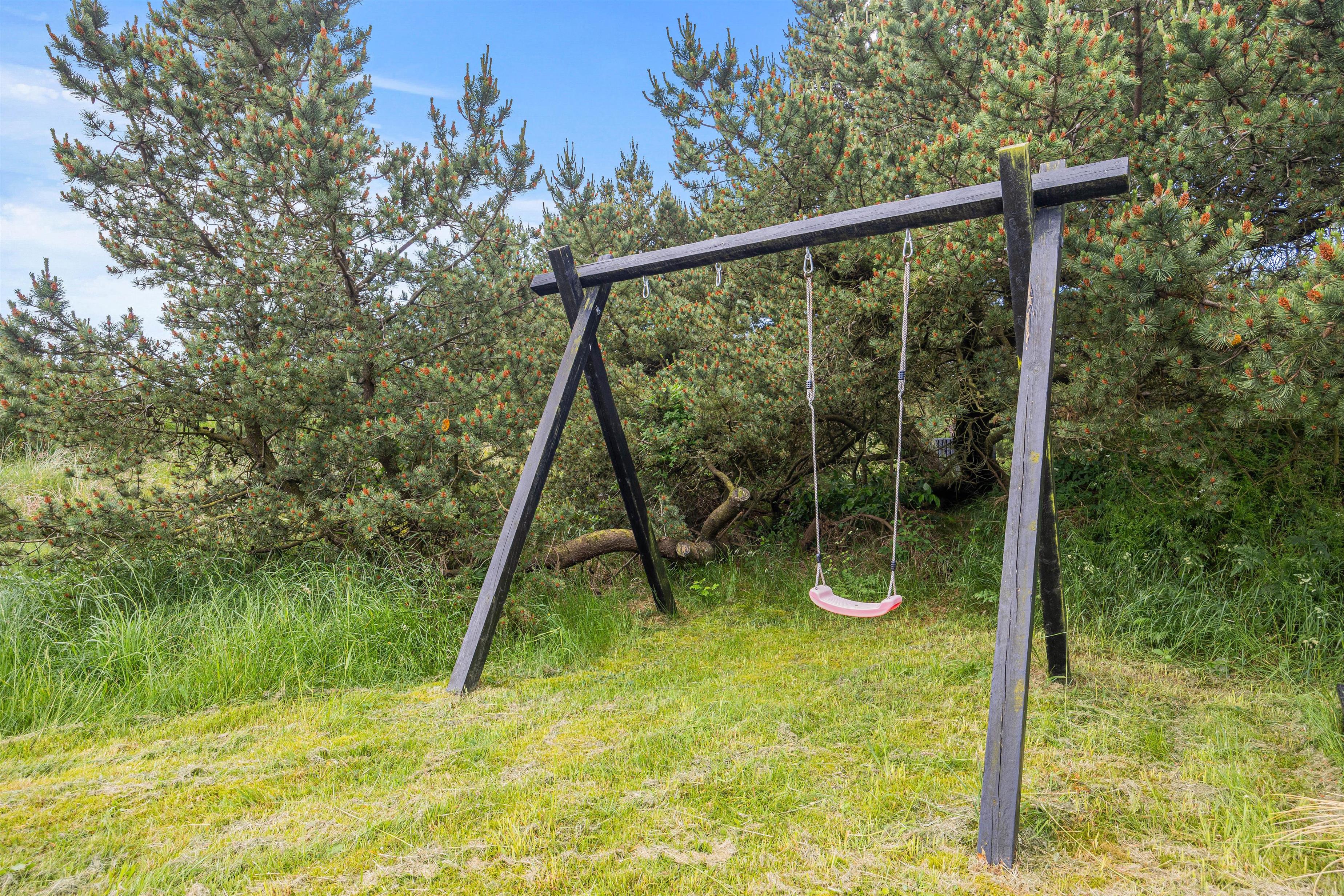 Børnene vil elske at udforske plænegrunden med gyngen - her har de frihed til at lege og udfolde deres fantasi, mens forældrene kan holde øje fra terrassen. Bilen kan holde i læ i den fritstående carport.