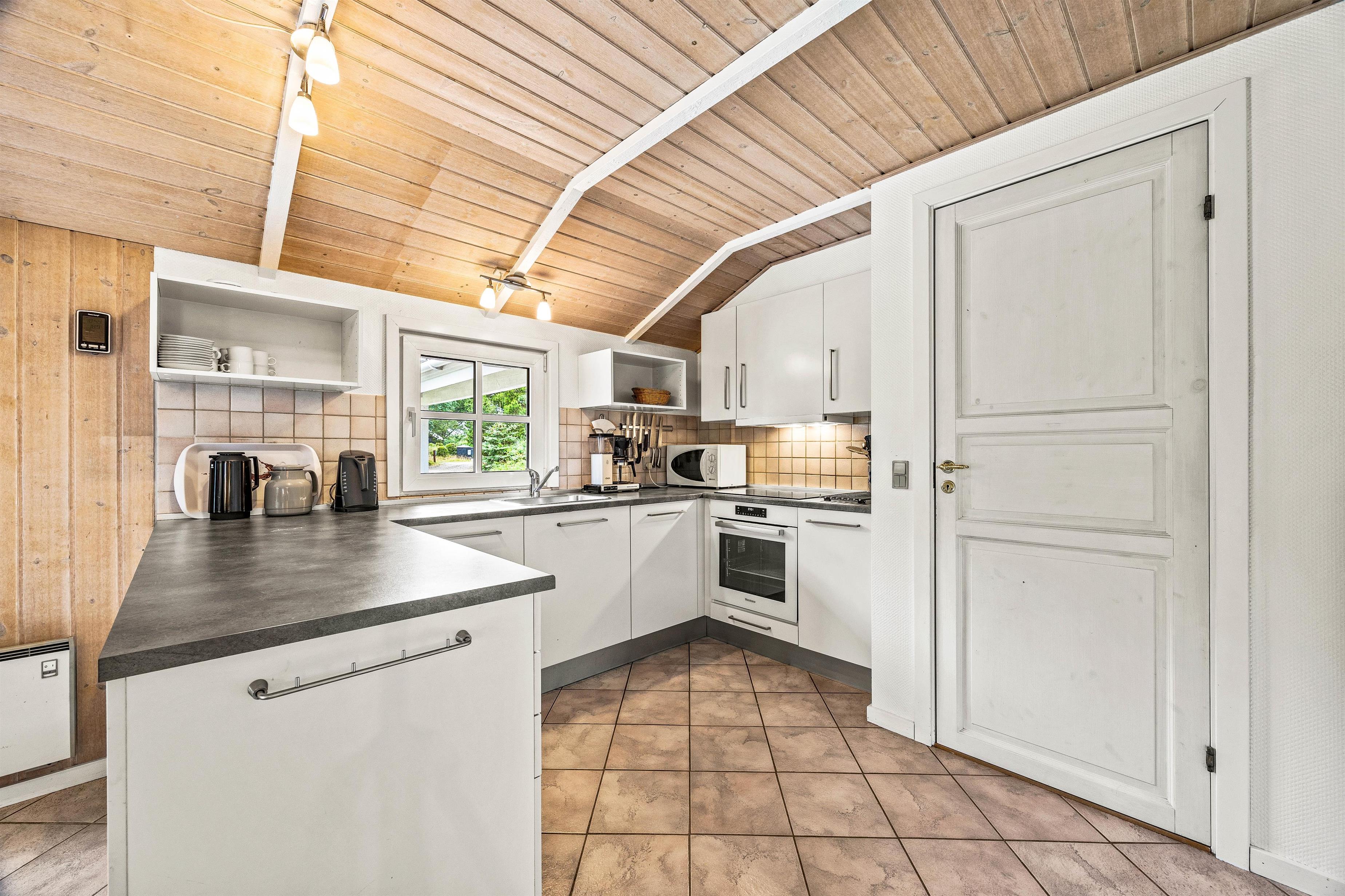 Fra den store indkørsel er der adgang til huset gennem den rummelige entré, hvor der god plads til sko eller støvler og overtøj. Ved siden af ligger feriehusets lyse og veludstyrede køkken, der rummer både opvaskemaskine, mikroovn og induktionskogeplade med ovn. Det dejlige åbne køkken giver mulighed for, at også kokken og køkkenhjælperen kan følge med i samtalen eller spillets gang på spisebordet.
