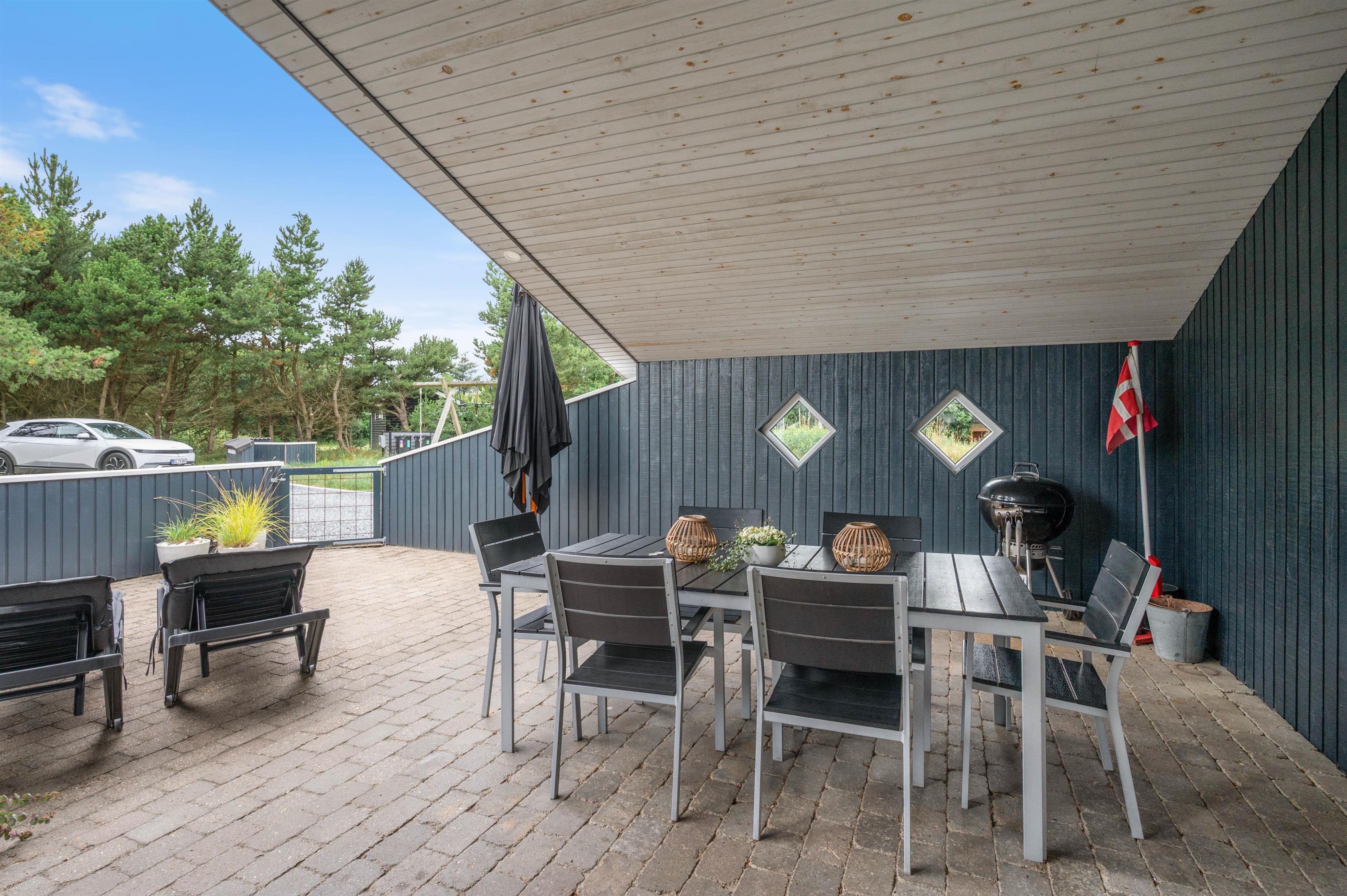 På den store flisebelagte terrasse er der endnu en hyggekrog, ligesom der på modsatte side af feriehuset er en lille terrasse, hvor morgenkaffen kan nydes til fuglesang.