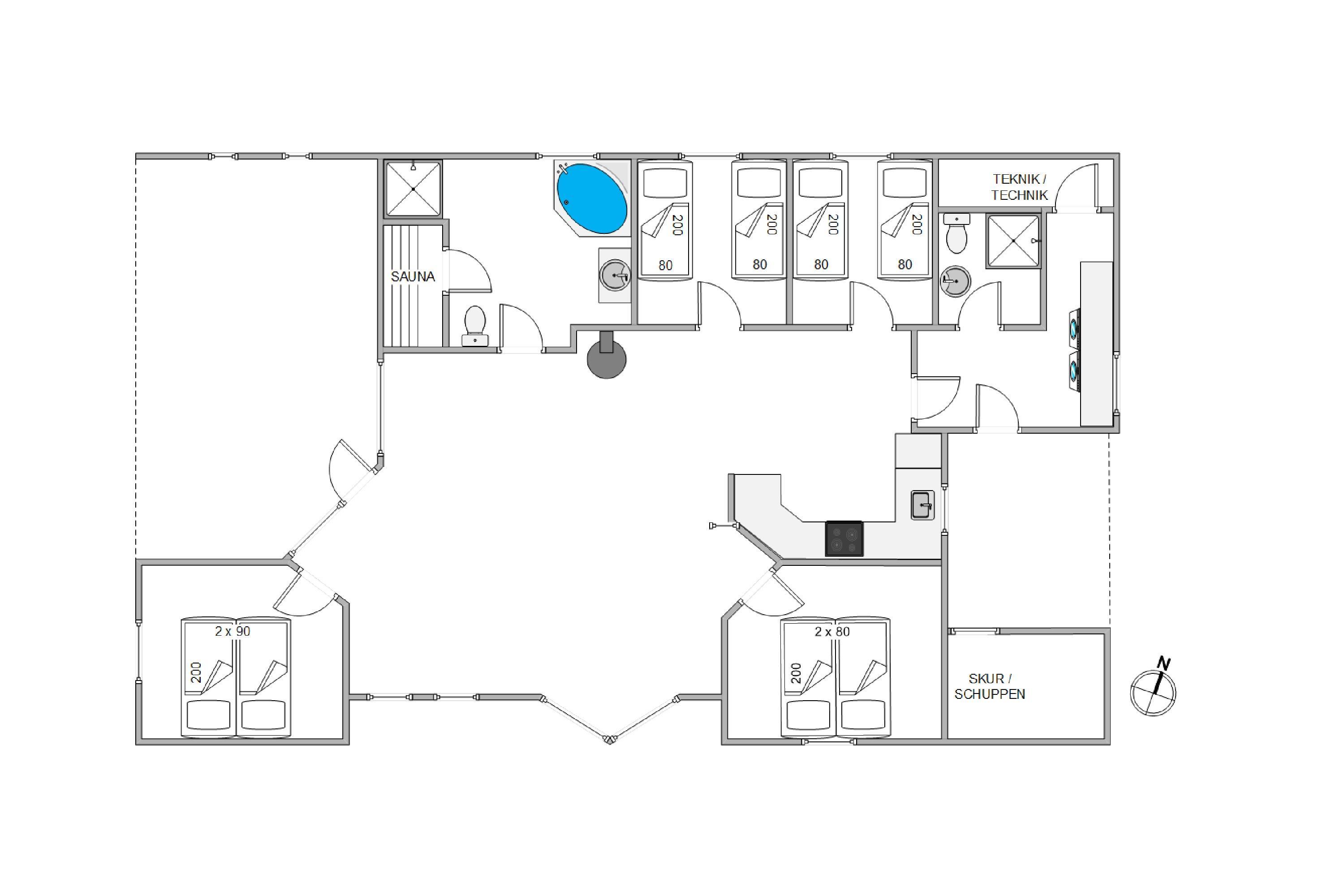 Køkkenet er lyst og indbydende og har god plads til, at I kan hjælpes af med lækre anretninger – måske har I købt ind hos Blåvands gode slagter eller specialforretninger. Fra køkkenalrummet er der adgang til de 4 soveværelser med enten dobbeltsenge eller enkeltsenge. Her kan I linde vinduerne lidt og falde i søvn til trækronernes susen og den friske vesterhavsluft og vågne friske til næste dags oplevelser.
