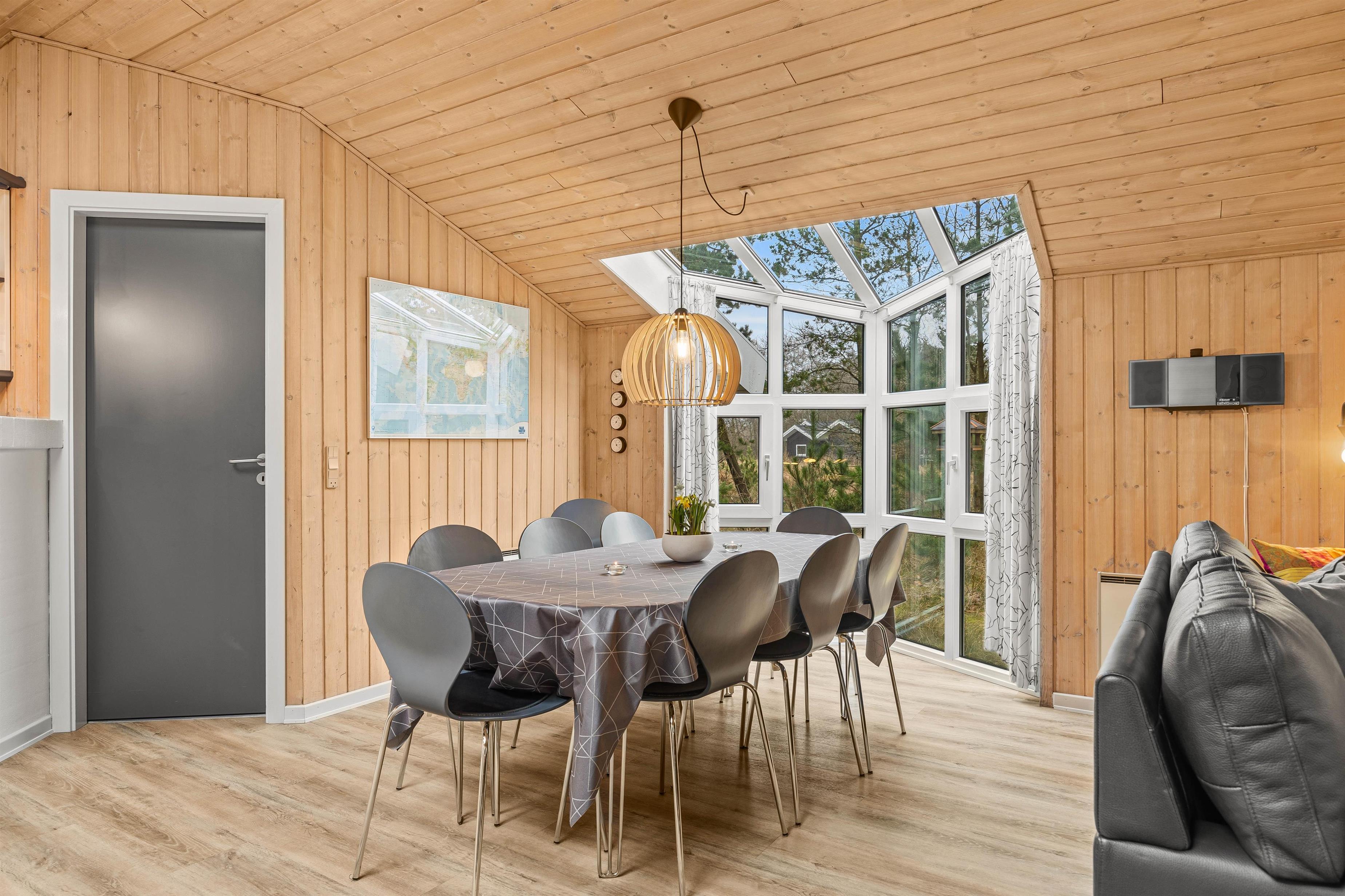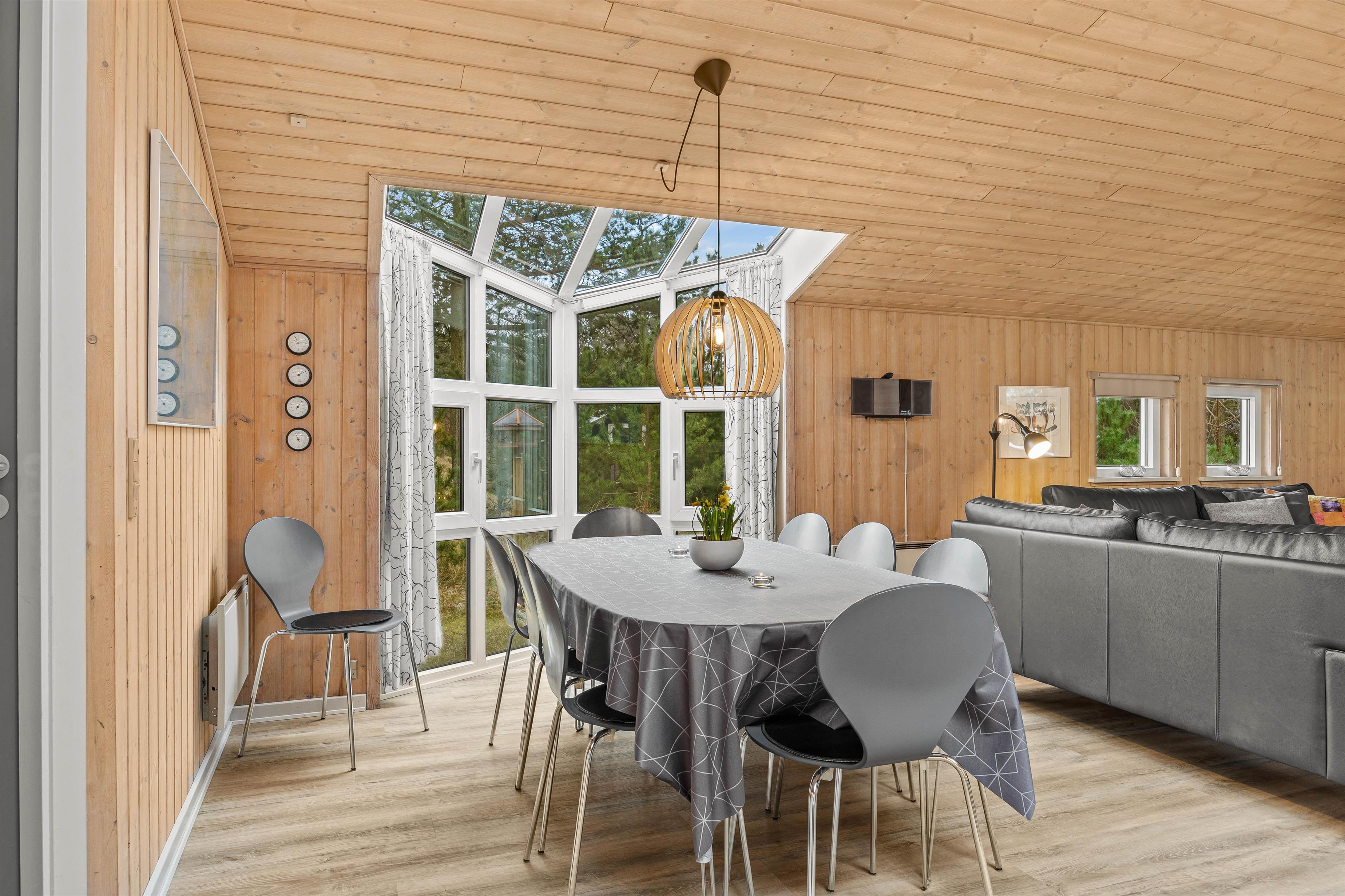 Det store hjerterum i dette dejlige feriehus med det åbne køkken indbyder til fælles feriehygge ved spisebordet eller de gode sofaer. Slap af med en god bog, et spil eller en god kop kaffe foran brændeovnens knitrende flammer efter en god dag. De flotte ovenlysvinduet og vinduespartier giver smukt lysindfald og varmepumpen sørger for et dejligt indeklima.