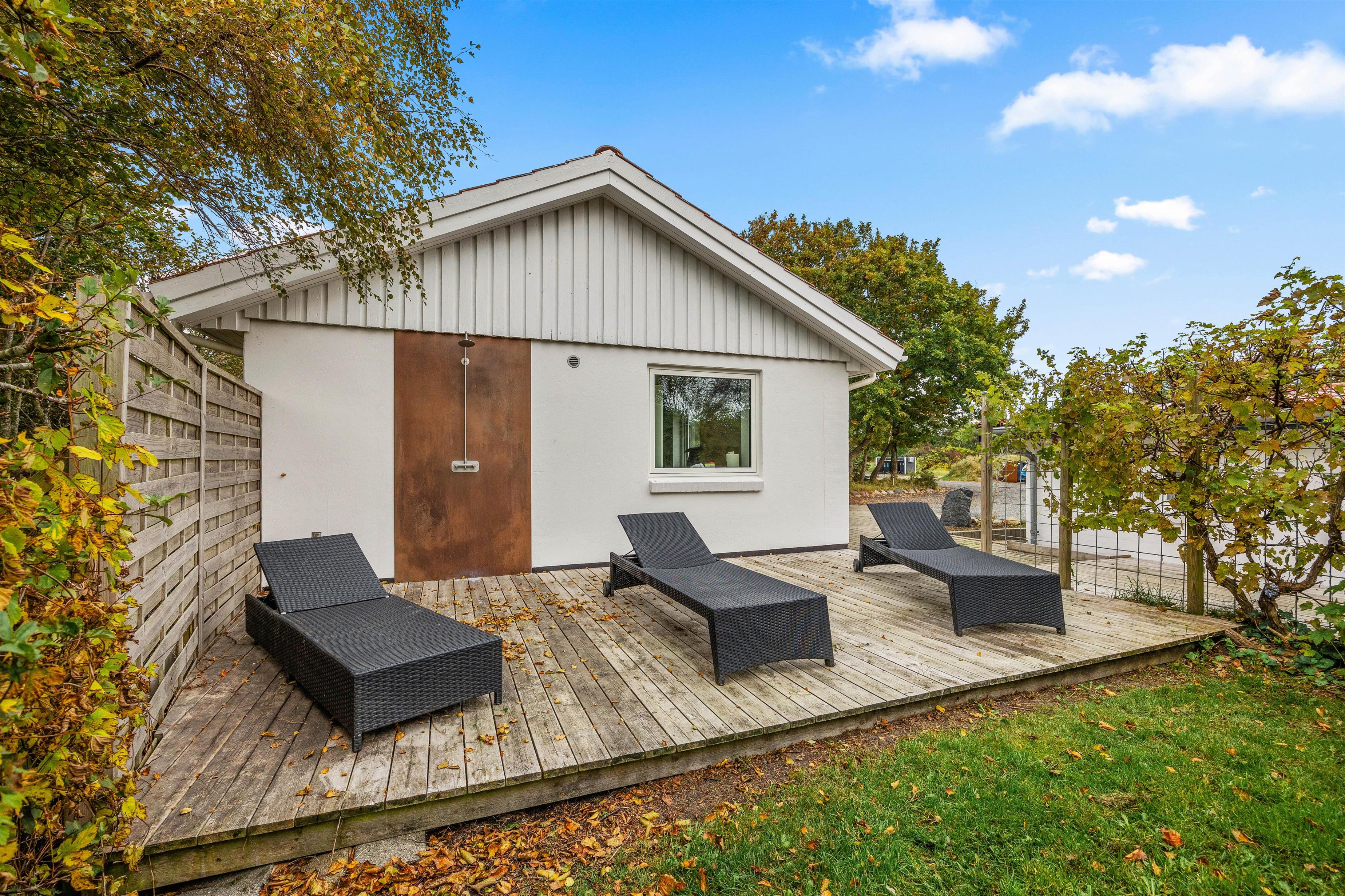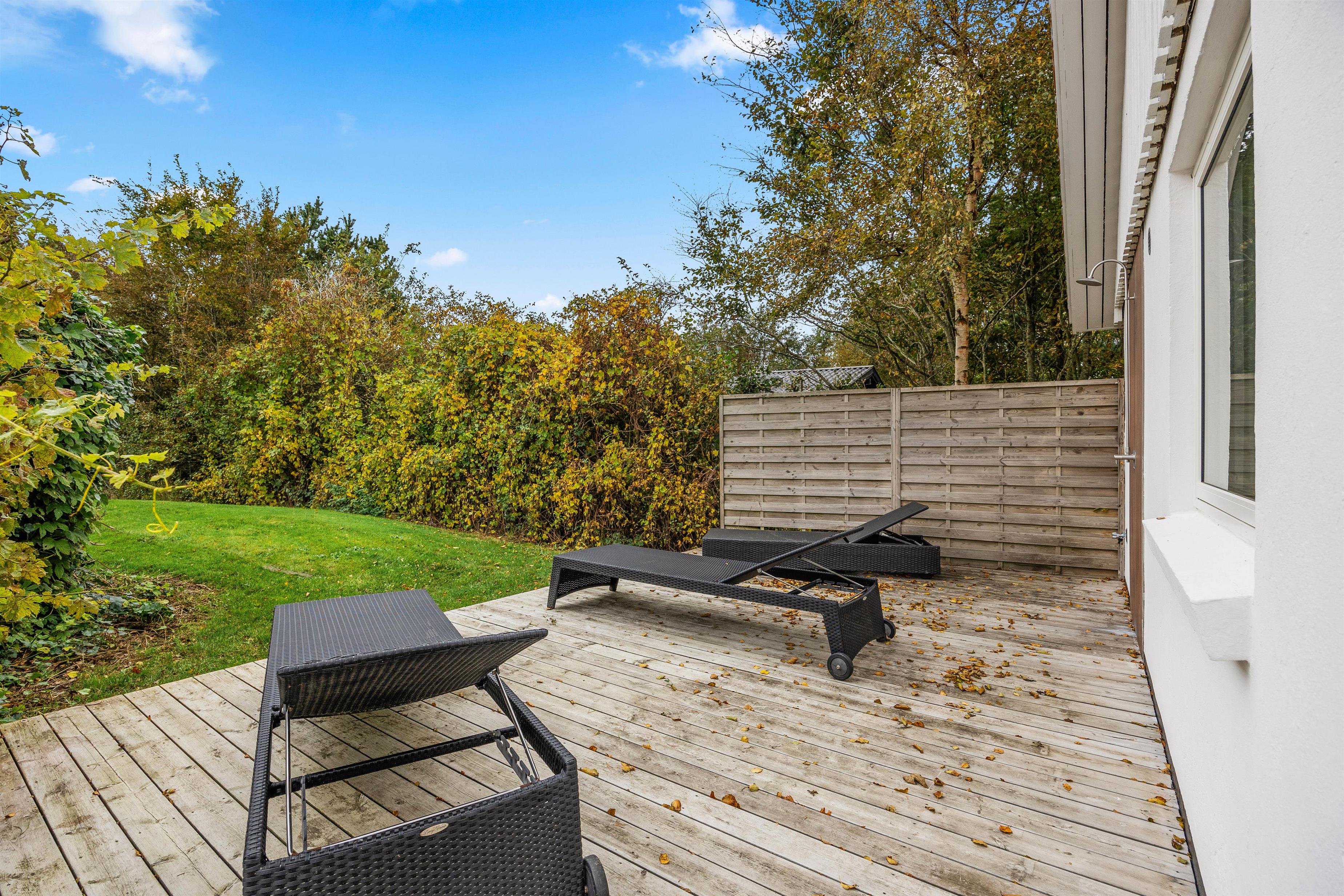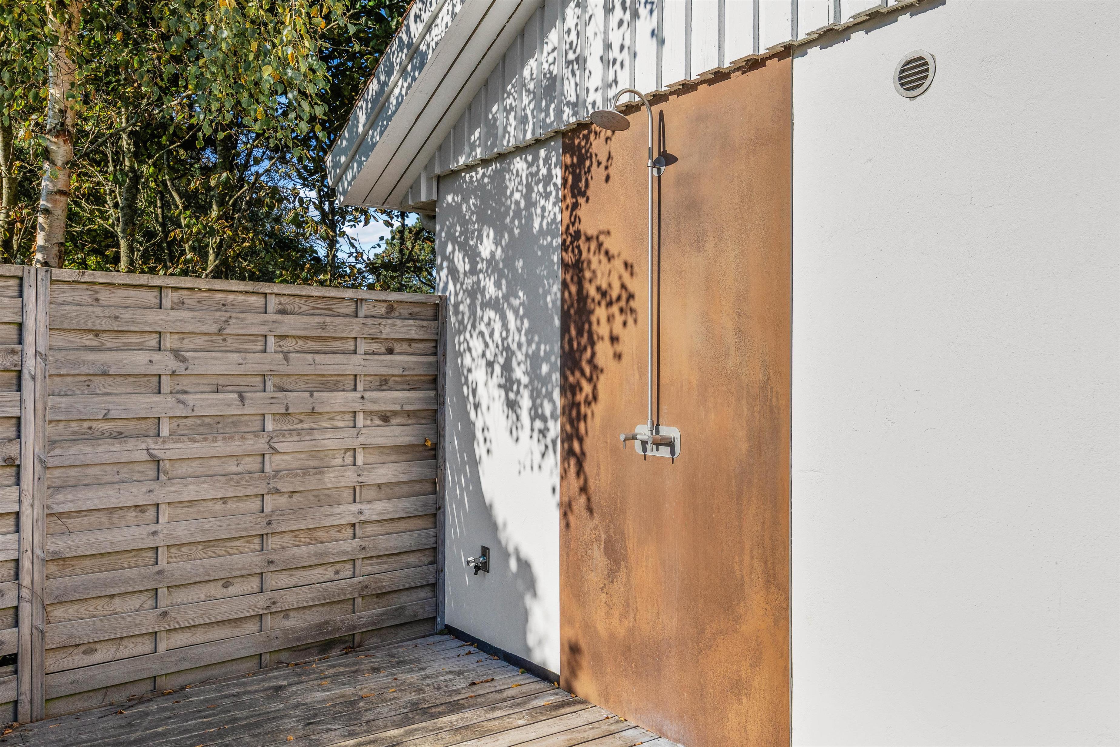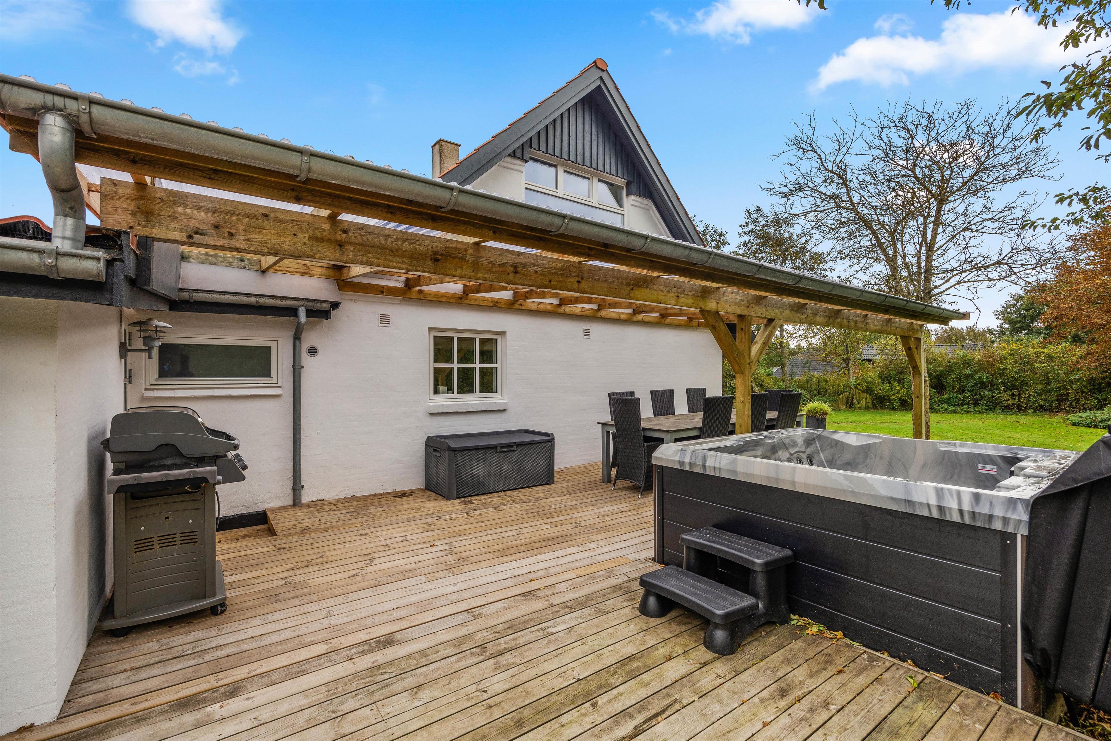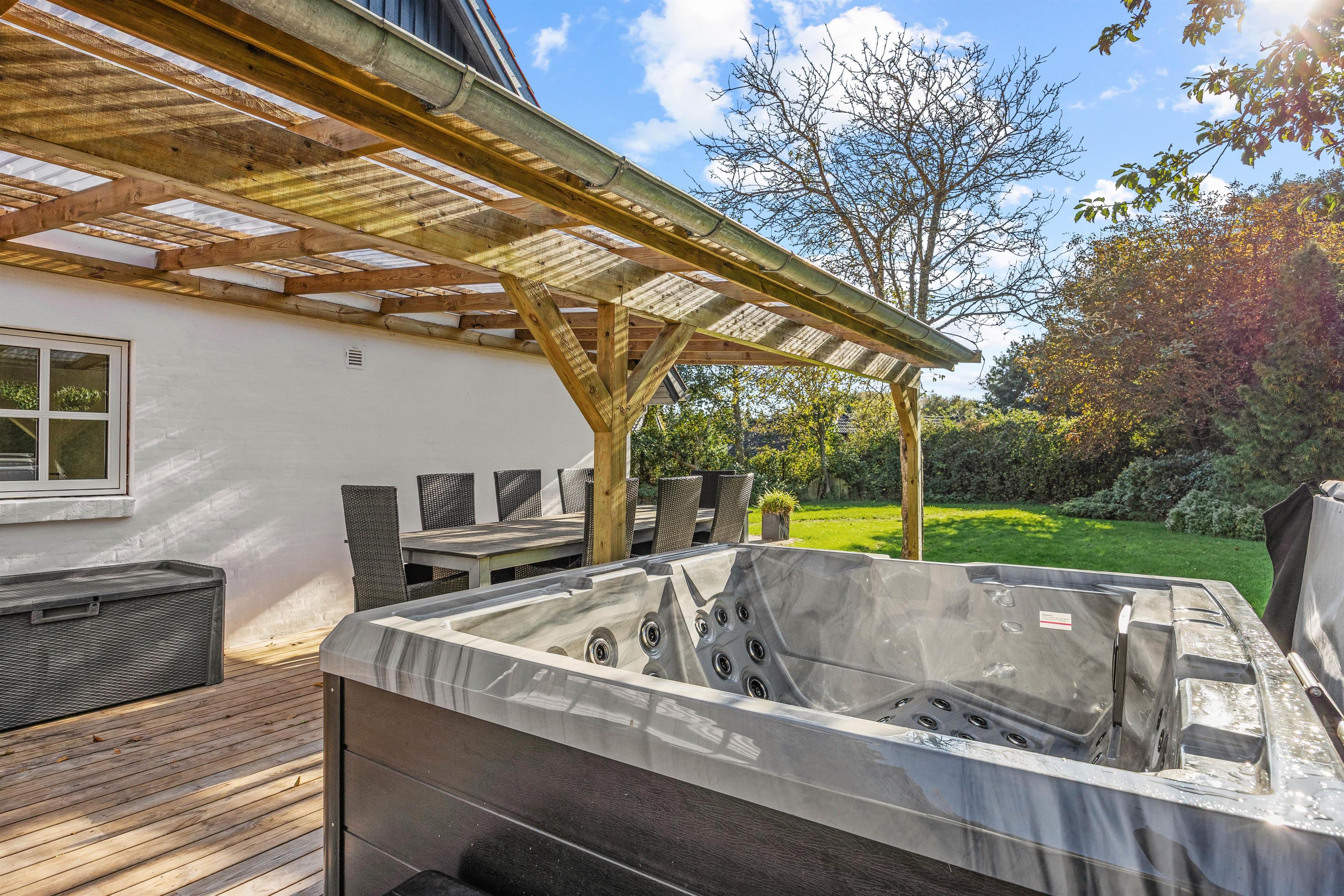 Under den overdækkede del af terrassen kan du sidde i havemøblerne og fordybe dig i den gode bog, du så længe har villet læse, også selvom der skulle komme en byge, og når du får lyst til lidt wellness, kan du hoppe i den udendørs jacuzzi eller få en forfriskende skylle under udendørsbruseren. Udebruseren kan benyttes fra 1. april til 31. oktober.