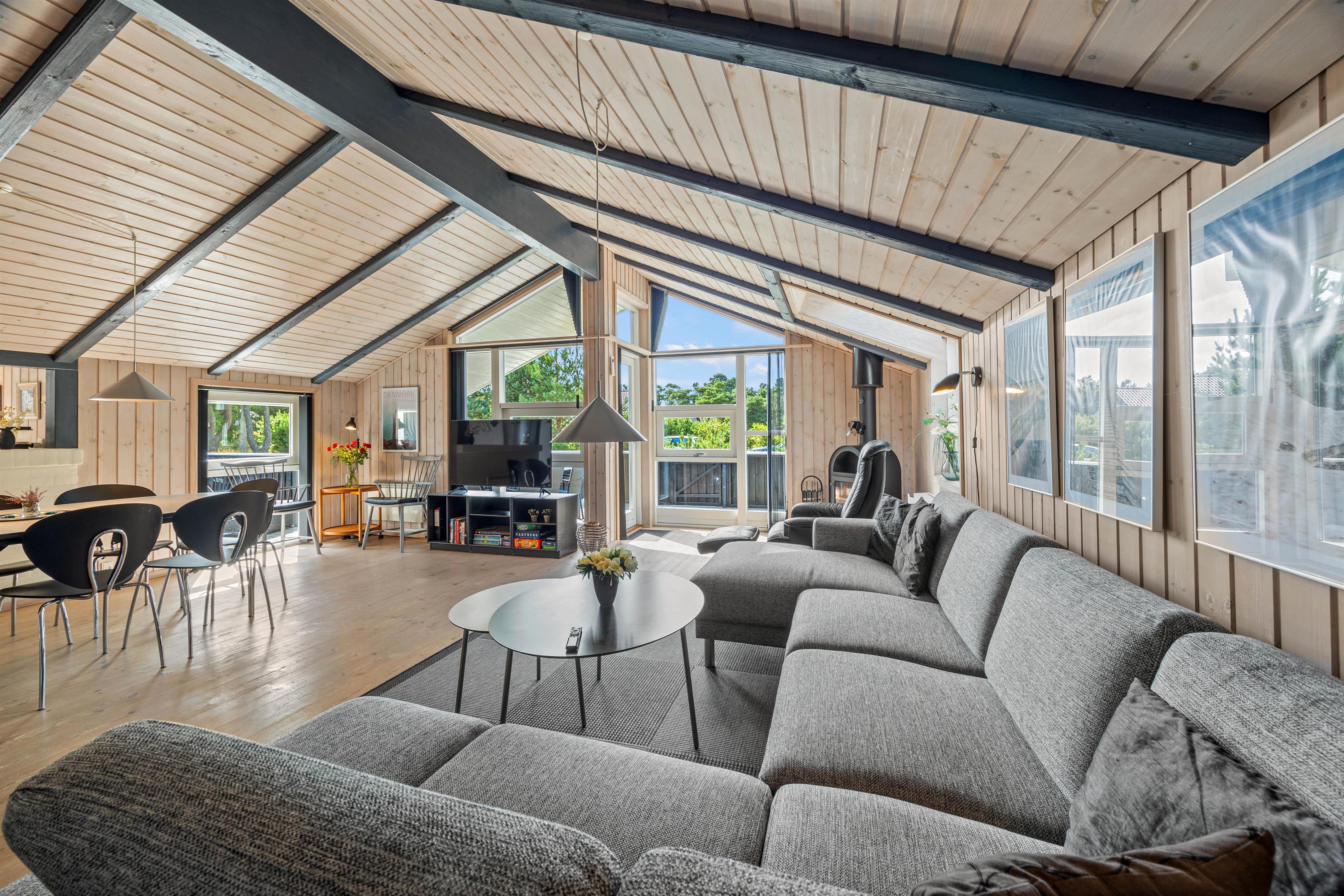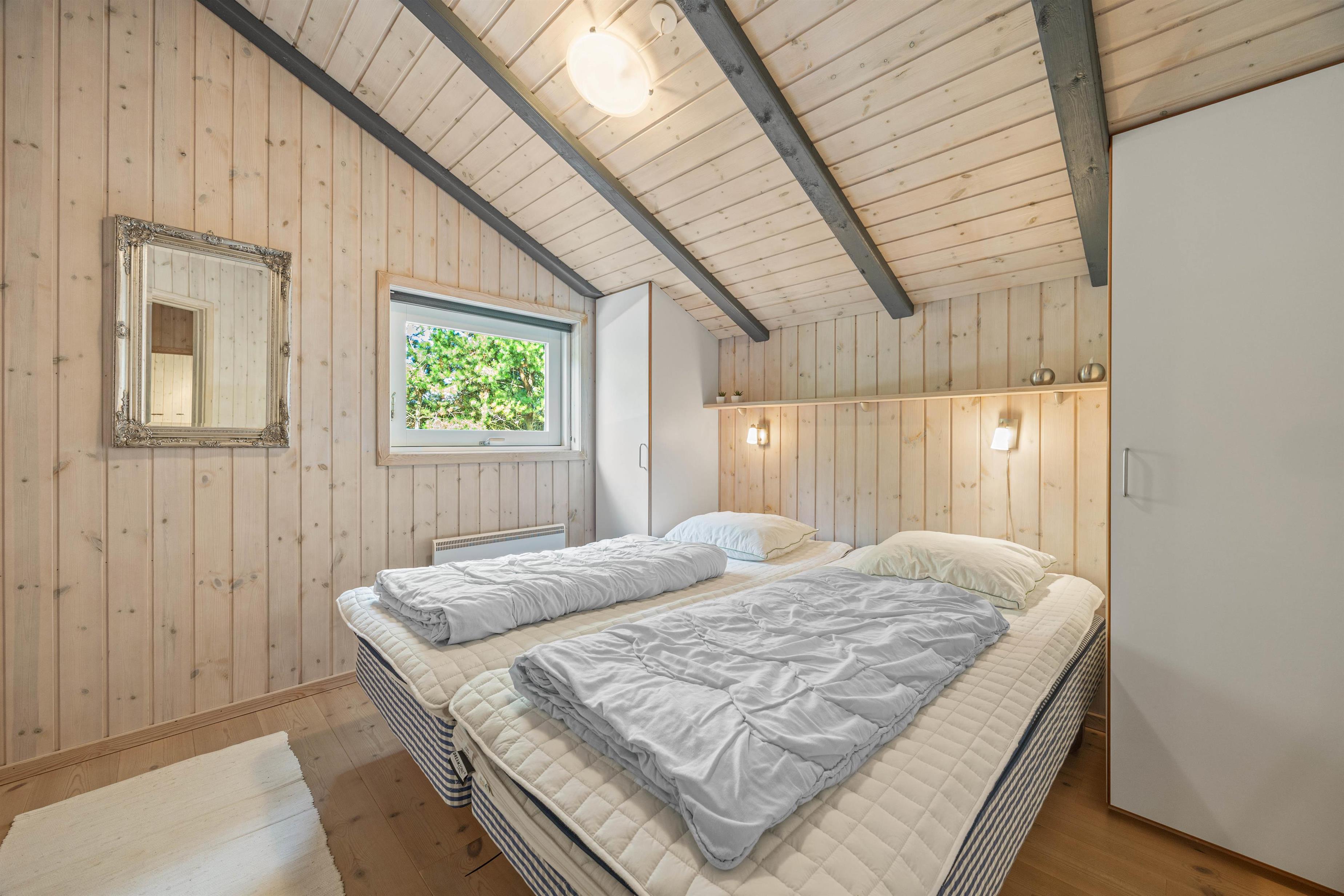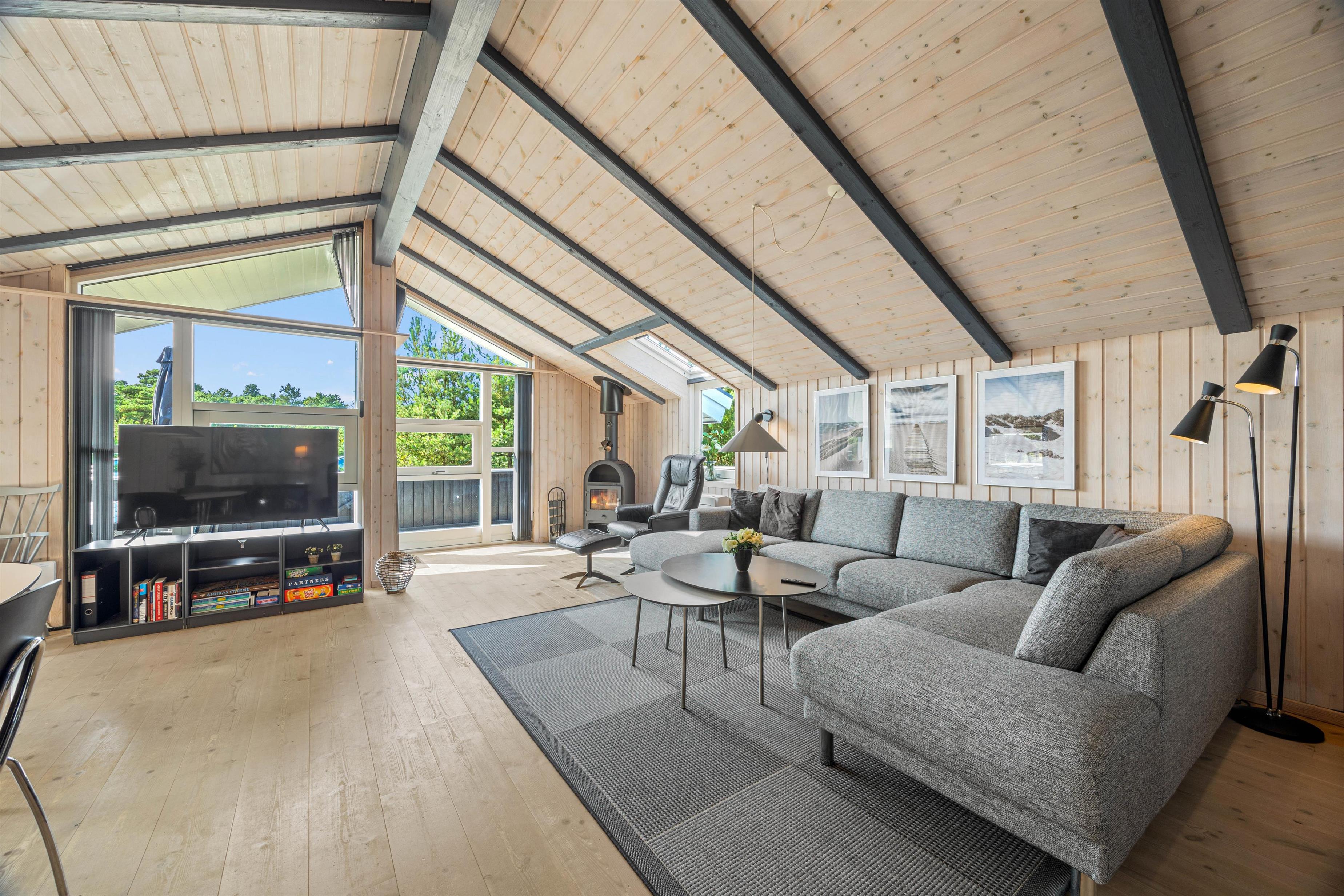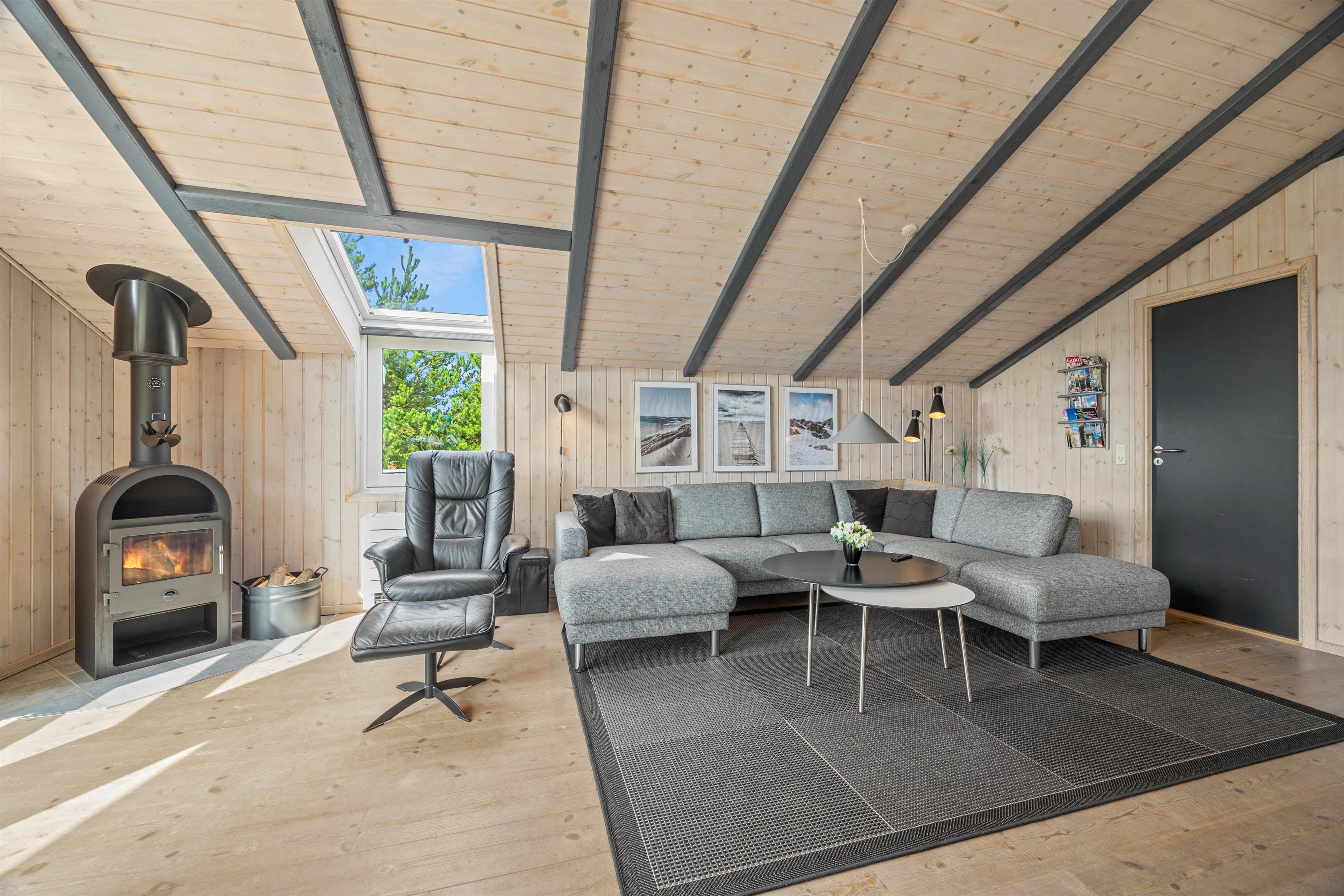 Ferieboligen er udstyret med en brændeovn, der sørger for hyggelig varme i de kølige aftenstimer. Det rummelige hus på 121 m2 rummer fire soveværelser, hver med en dobbeltseng, som sikrer optimal komfort for op til 8 personer. To moderne badeværelser med gulvvarme betyder, at der aldrig vil være kø om morgenen. En tørretumbler og vaskemaskine er også til jeres rådighed, så håndklæder kan holdes friske i ferien.