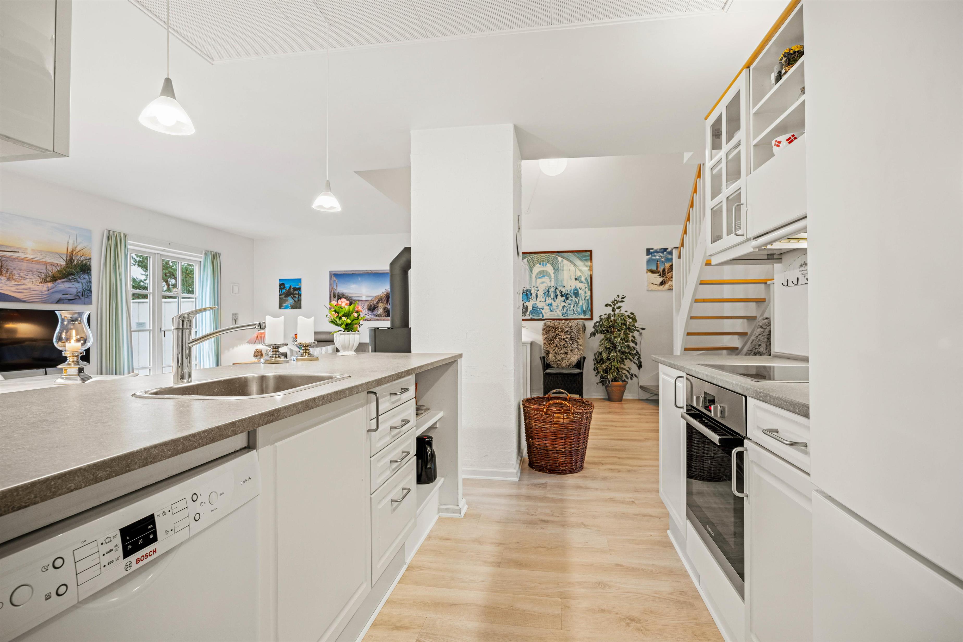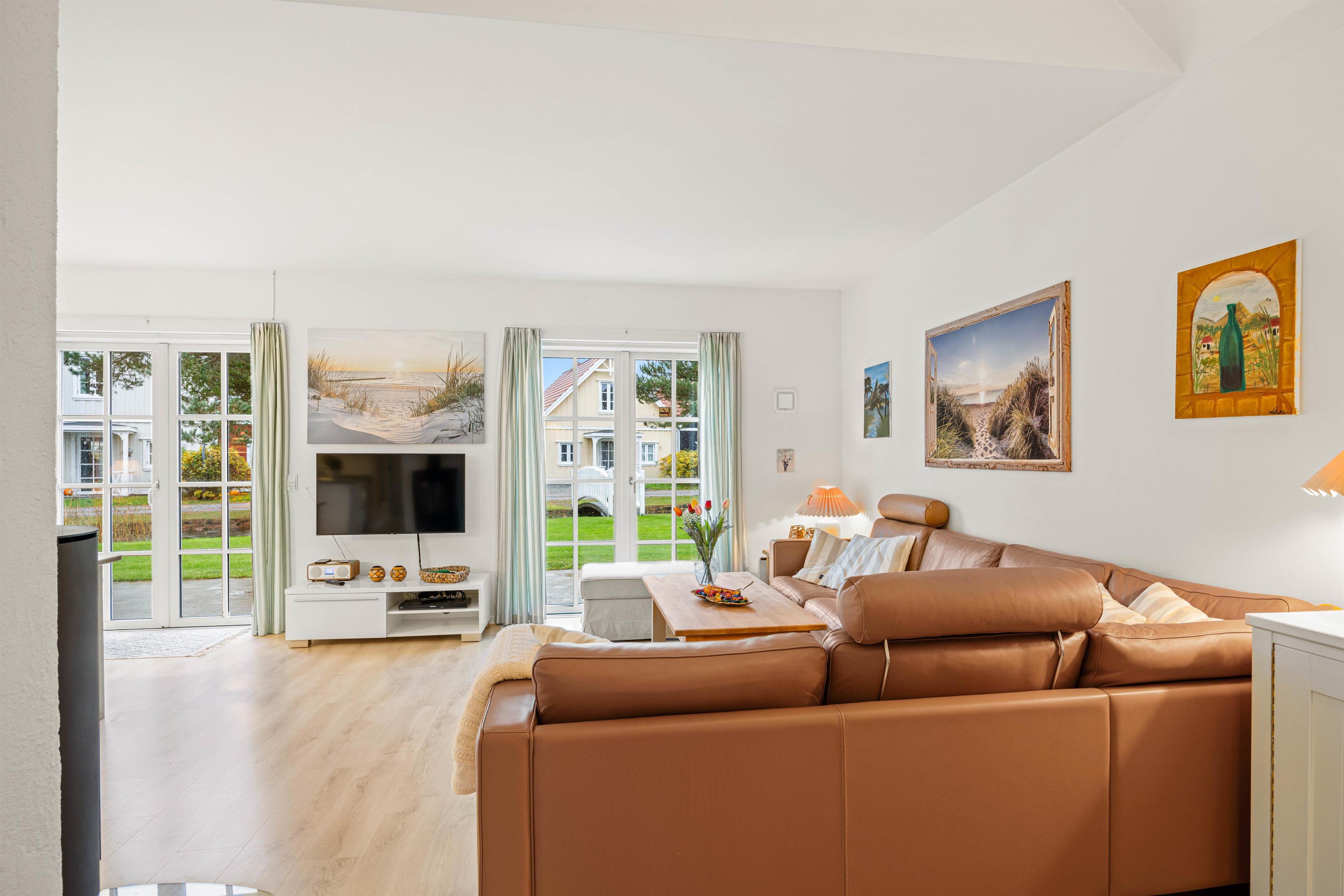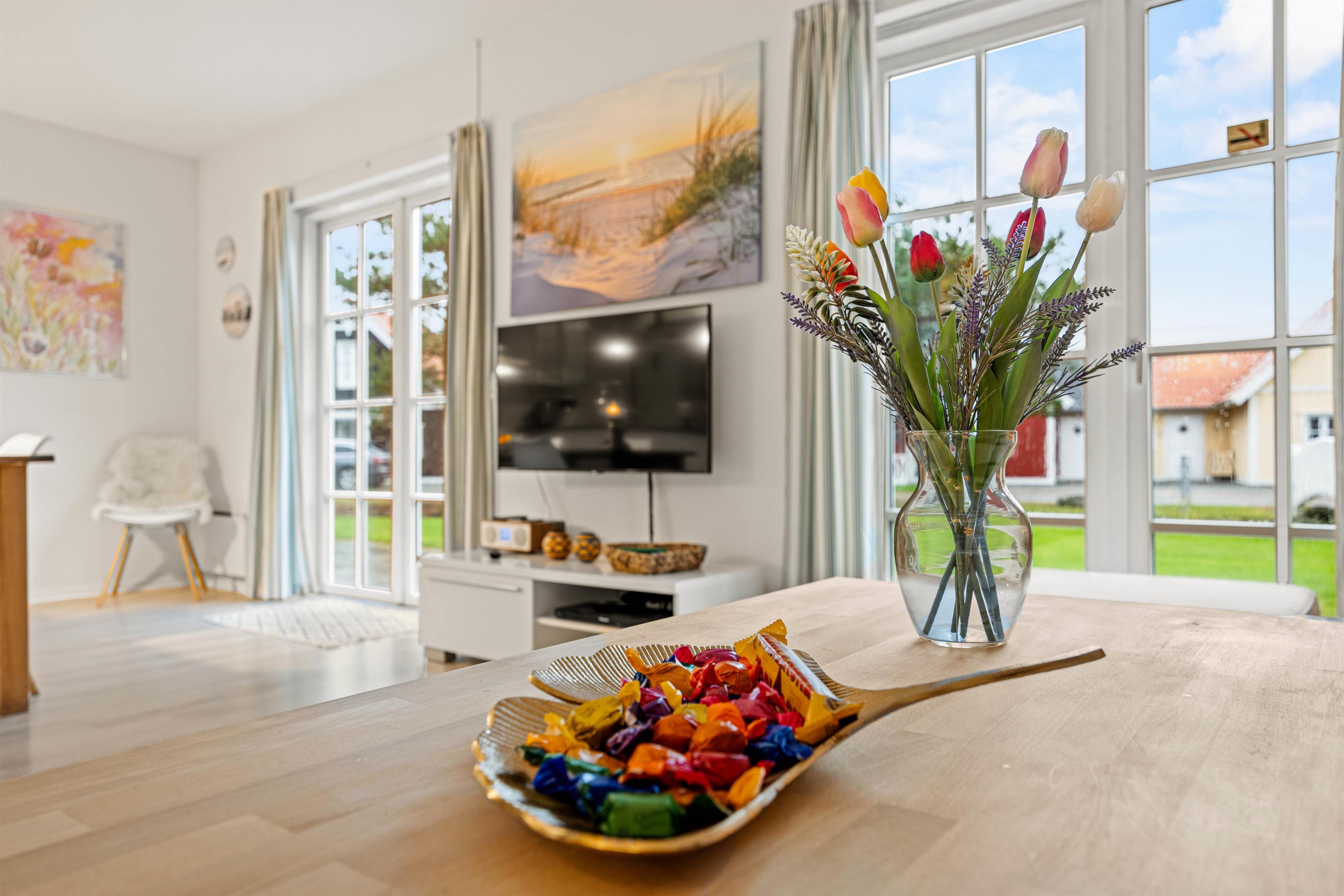 I det kombinerede køkken og opholdsrum er der god plads til at slappe af. For eksempel i sofahjørnet med en god bog eller de mange tyske og danske kanaler på fjernsynet og med brændeovnens varme i baggrunden, kan ferien kun blive ekstra god.
