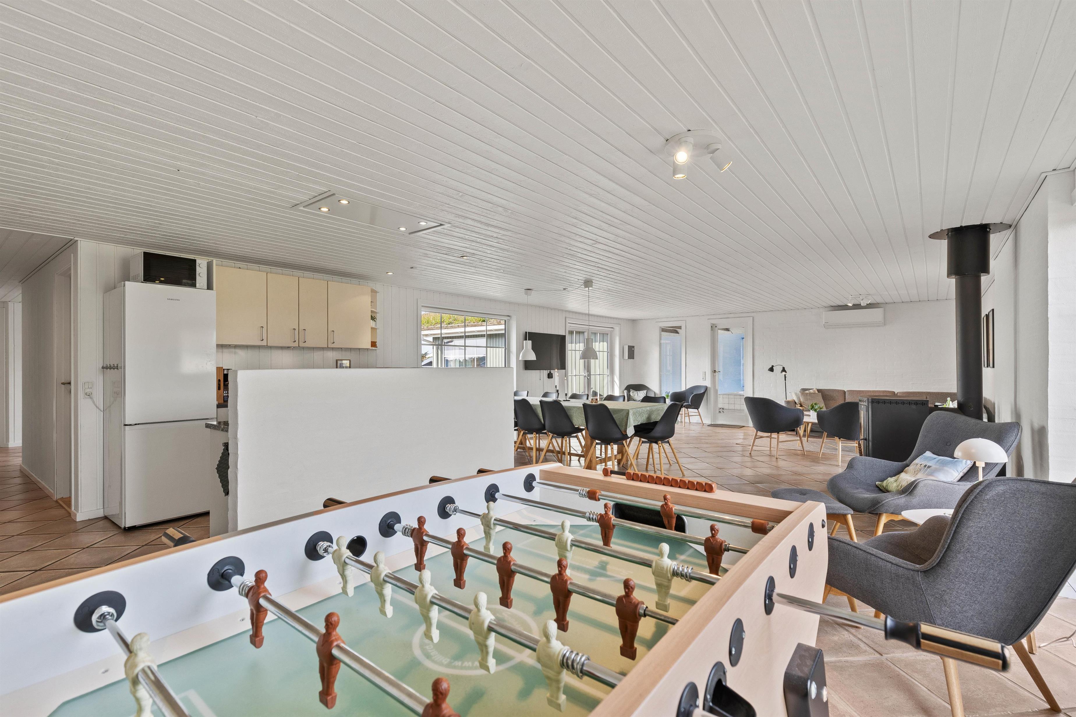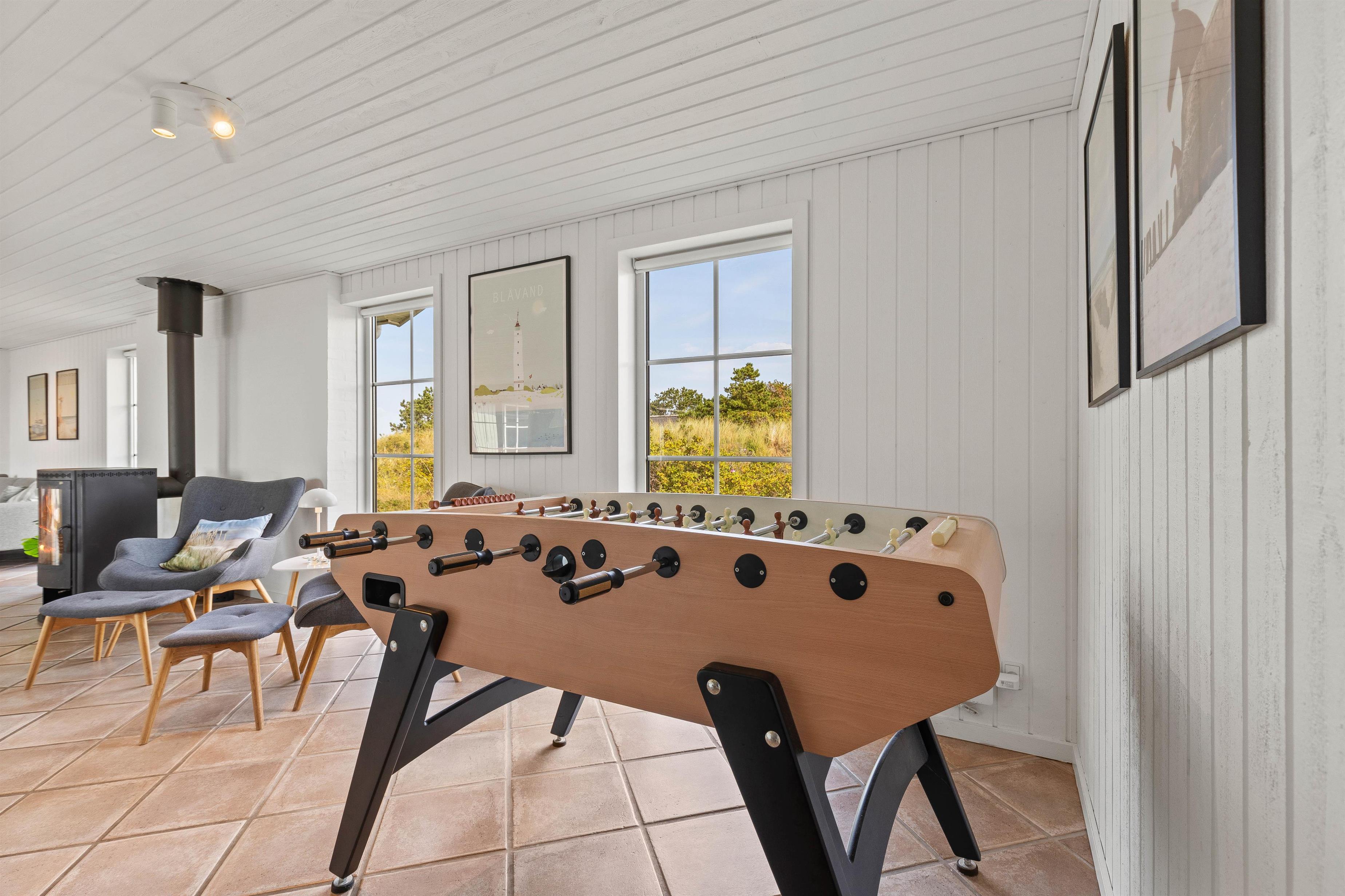 Nordslugen 17 har 6 hyggeligt indrettede soverum med dobbeltsenge og skabe til alle 12 personer, og i det veludstyrede køkken er der god bordplads og både mikroovn og opvaskemaskine. Her kan feriekokken slå sig løs og samtidigt følge med i aktiviteterne i den store, lyse stue, hvor I kan få et slag bordfodbold, slappe af i den bløde hjørnesofa nær brændeovnen, eller spille spil og hygge ved det lange spisebord. I stuen med de mange hyggekroge er der monteret en varmepumpe, som til enhver tid sørger for en behagelig temperatur i huset.