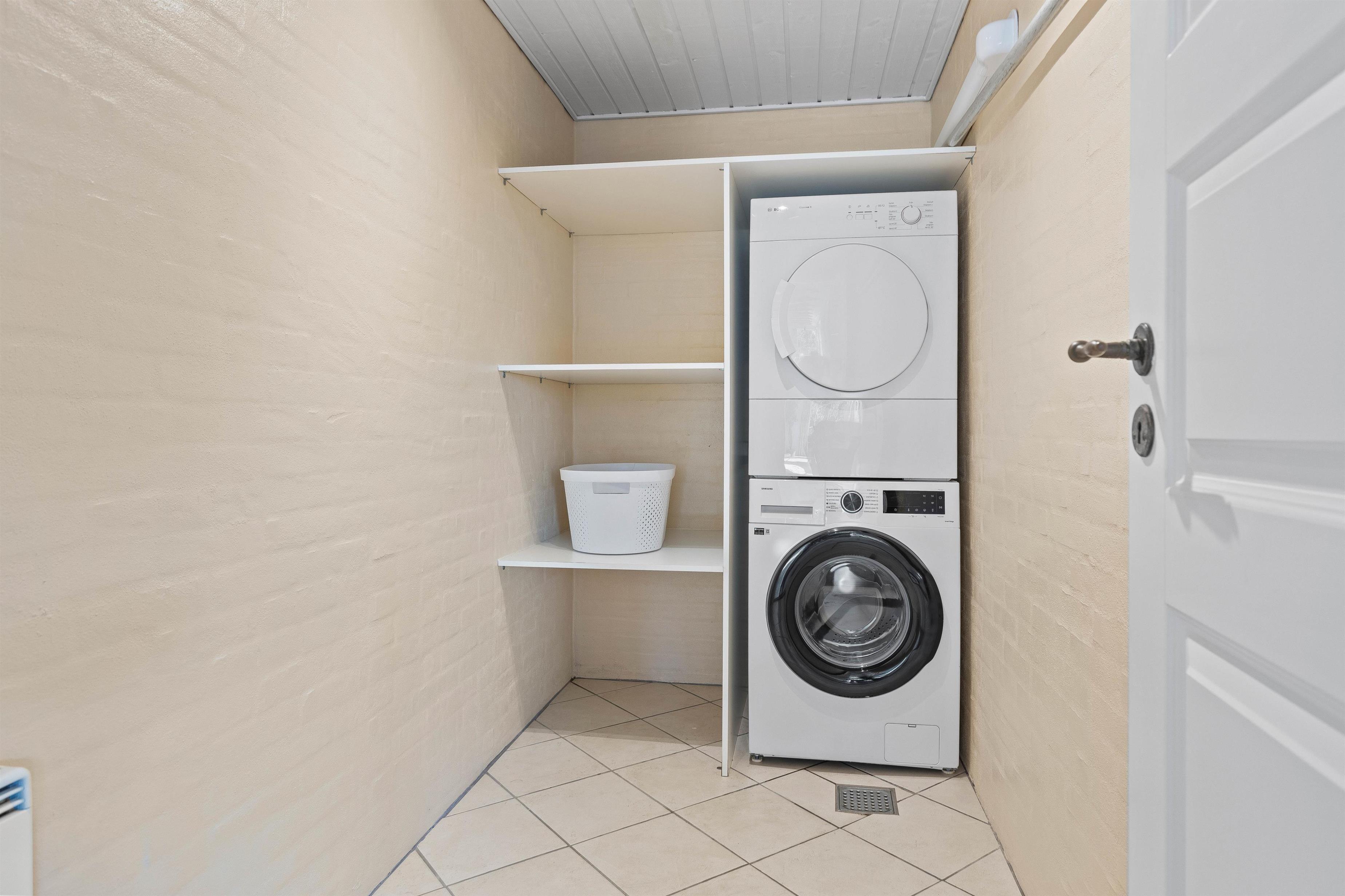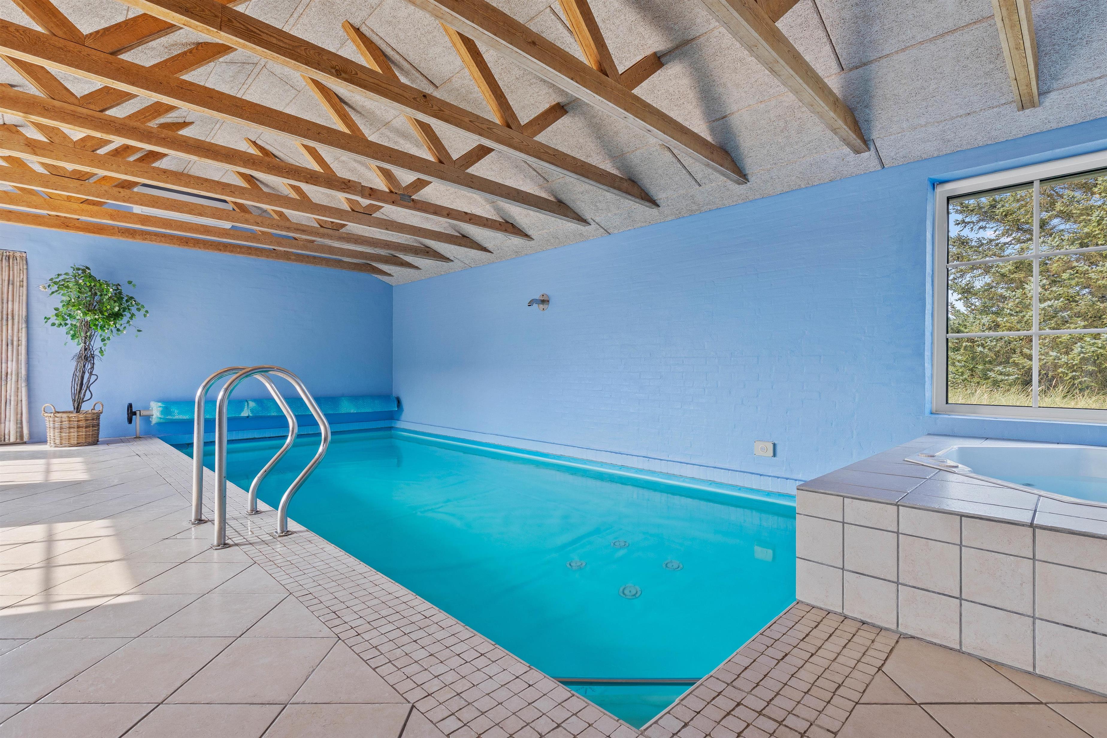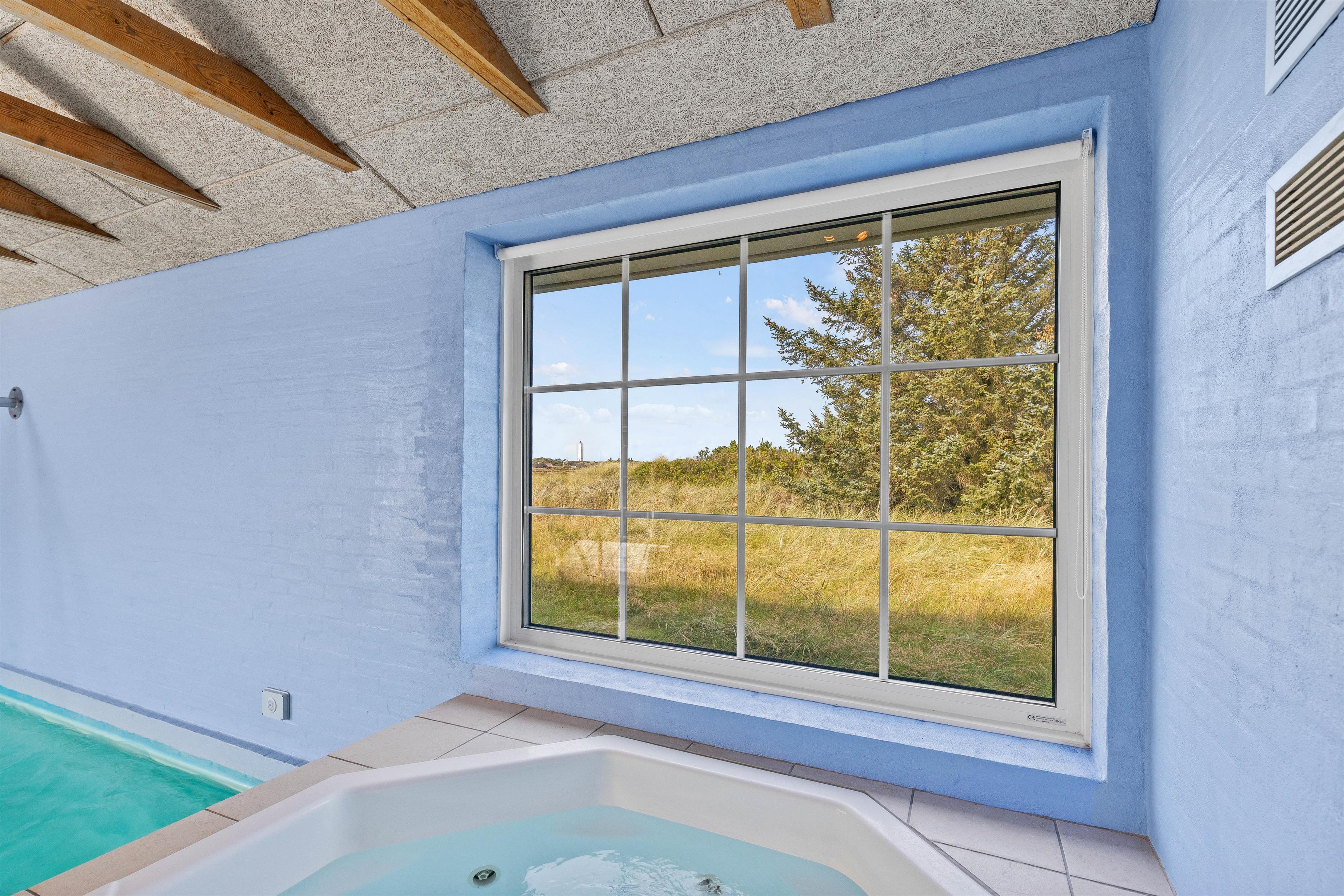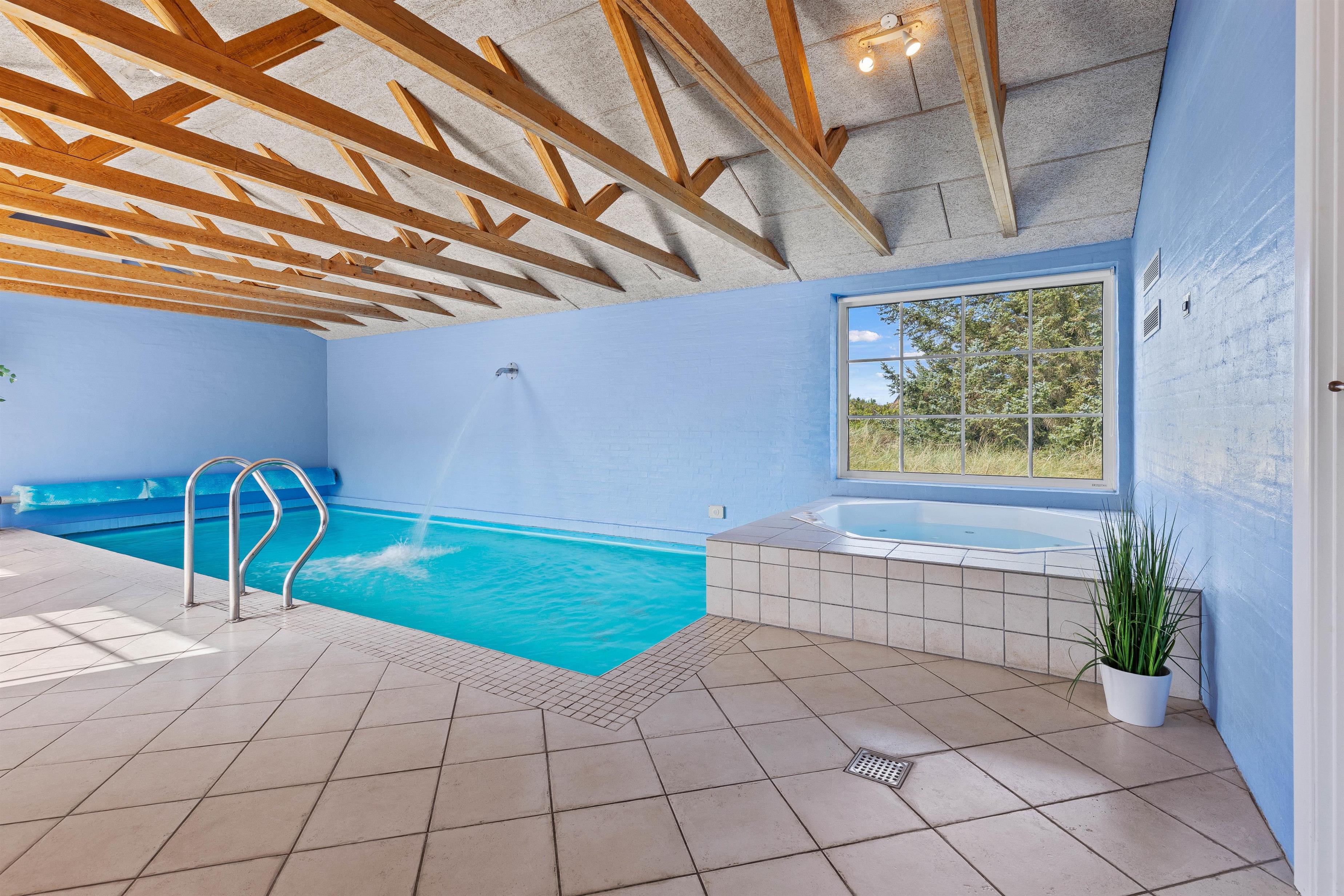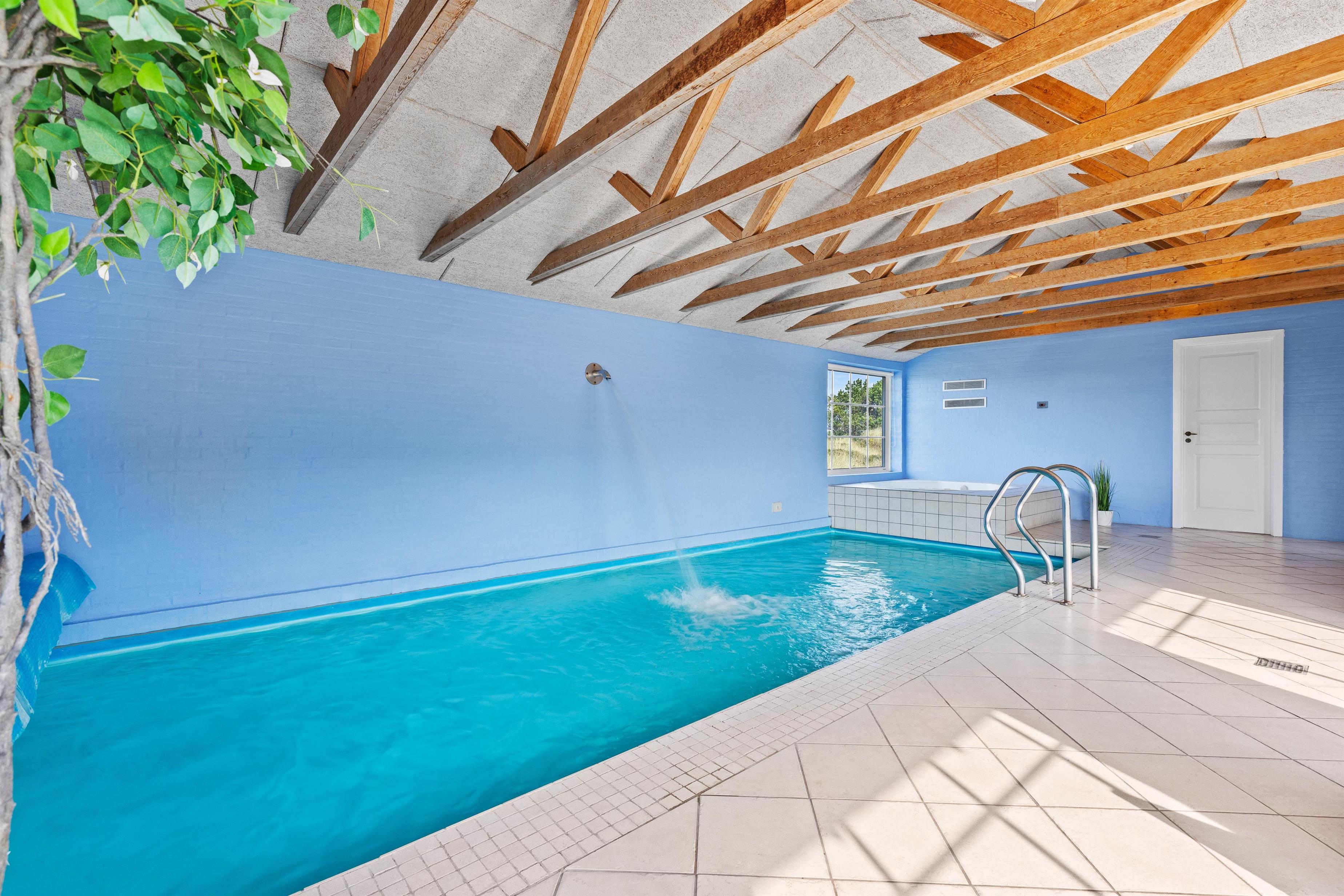 I poolrummet med de imponerende, fritlagte hanebjælker kan I boltre jer i den 24 m2 store pool eller nyde udsigten fra spaen til fyret, hvorefter I kan runde af med en tur i saunaen i det ene af de 2 badeværelser, som begge har gulvvarme. I tilknytning til poolrummet er der desuden et lille, separat vaskerum med både vaskemaskine og tørretumbler i et praktisk hyldearrangement.