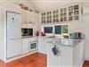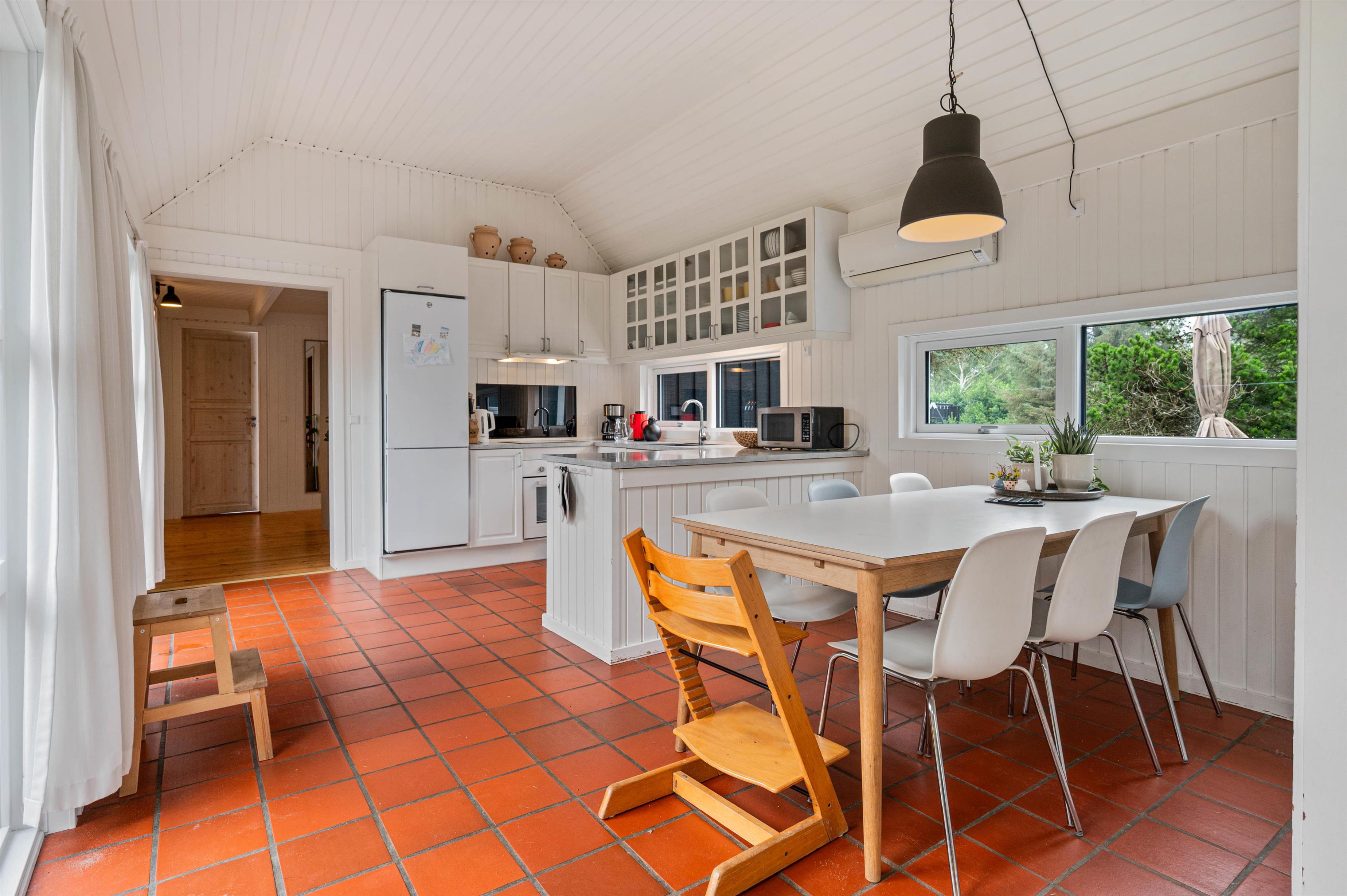 Køkkenet ligger i åben forbindelse med spisepladsen, så børnene sagtens kan lege ved bordet, mens I tilbereder maden. Køkkenet er blandt andet udstyret med induktionskomfur, opvaskemaskine og mikroovn. Derudover har I 60 liters frysemulighed i sommerhuset.