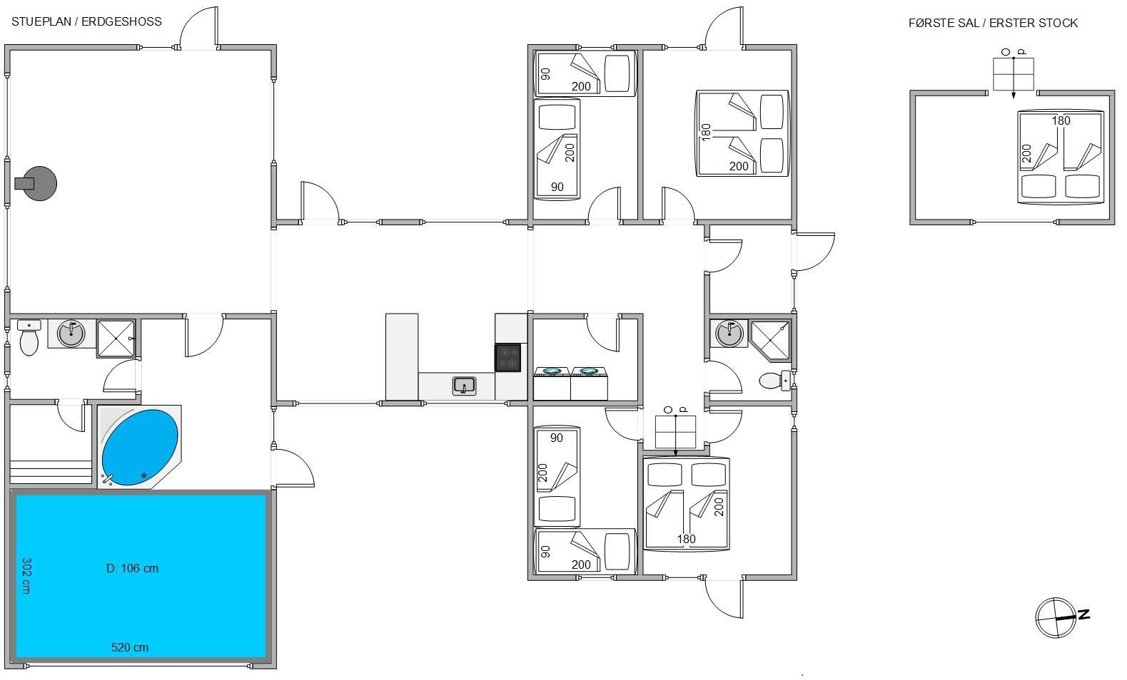 Højdepunktet i sommerhuset er den 15 m² pool. Efter en lang dag på stranden eller en frisk gåtur, kan I varme jer op i saunaen eller spabadet, mens børnene plasker rundt i poolen.