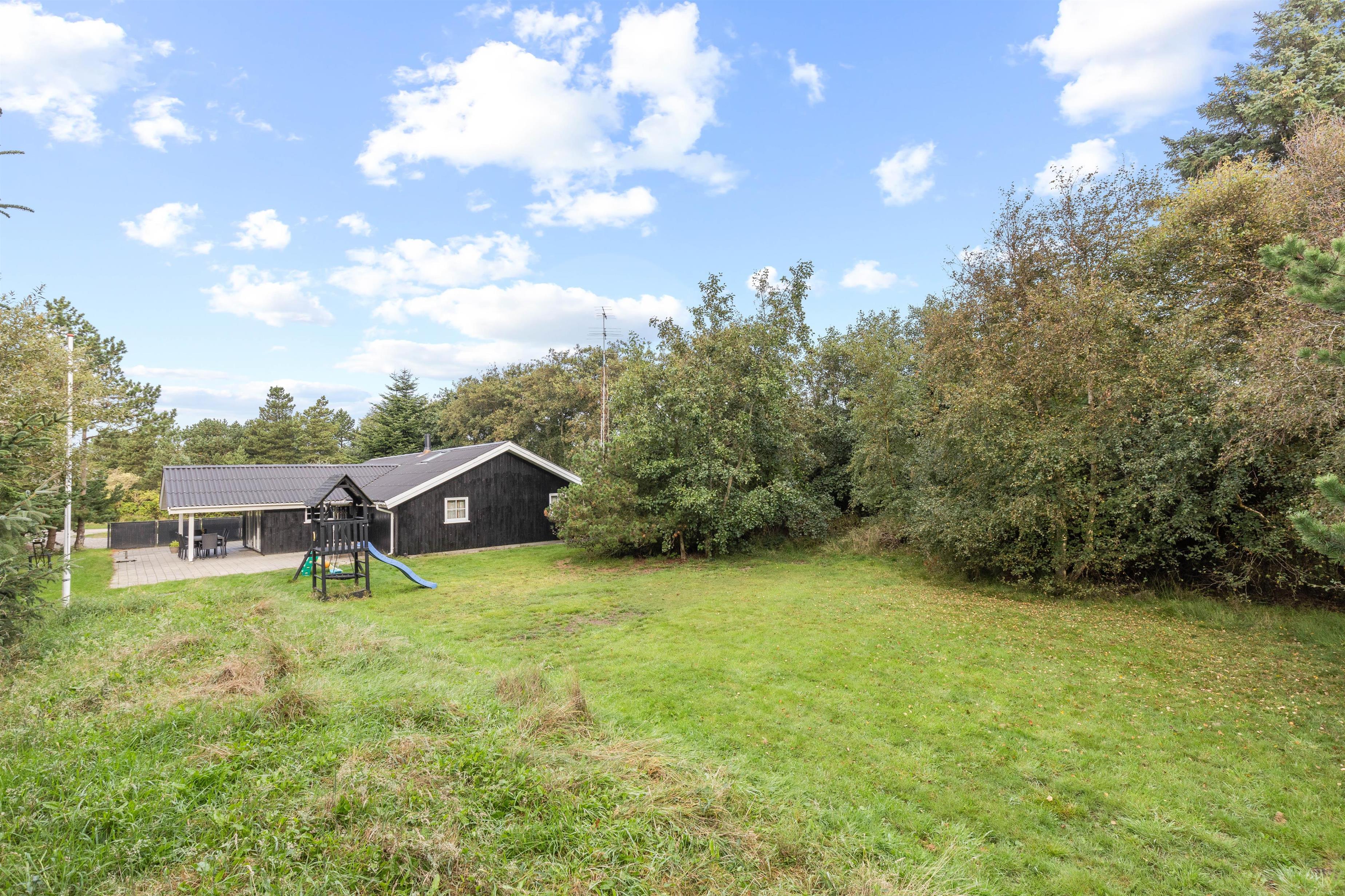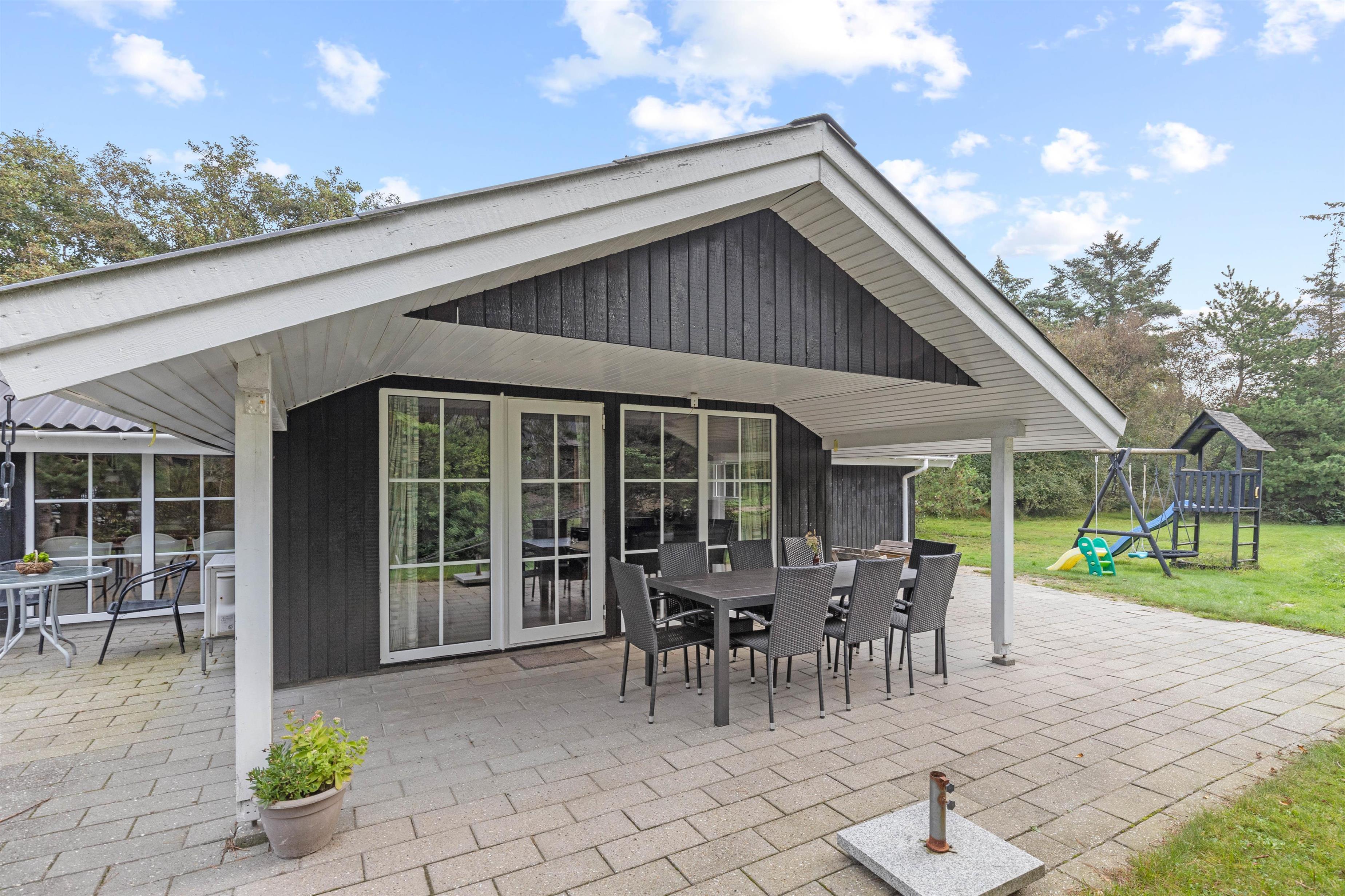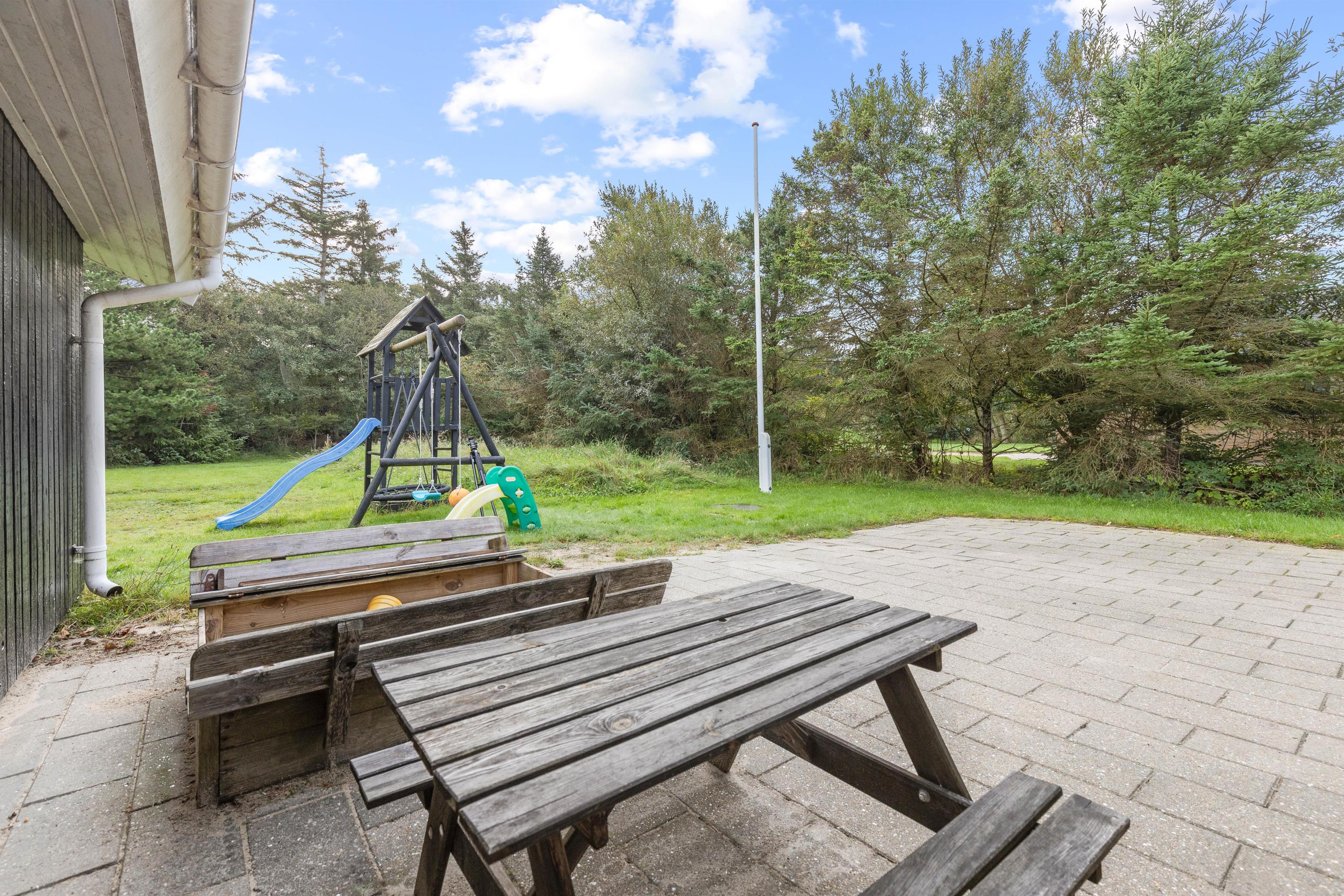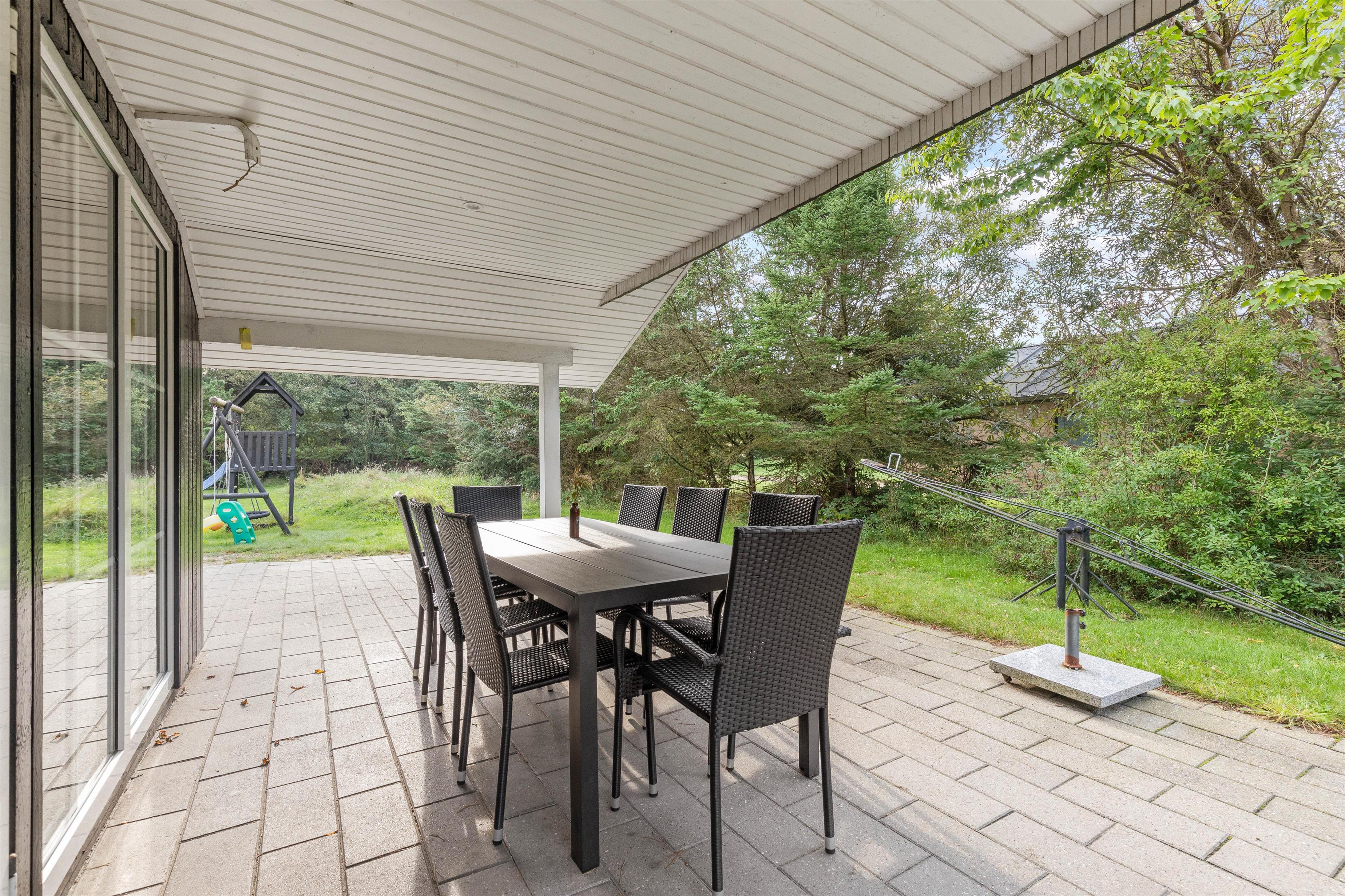 Fra stuen er der direkte adgang til terrassen, der inviterer til mange hyggelige timer i solen. Den store terrasse er delvist overdækket og dermed helt perfekt til en frokost i skyggen eller de lune sommeraftner. Tænd op i grillen og tilbered en ægte sommermiddag – imens der grilles kan I trygt lade børnene boltre sig på græsplænen, i og med grunden er indhegnet. Her er god plads til boldspil, mens der til de mindste feriegæster er opstillet sandkasse og et gyngestativ.