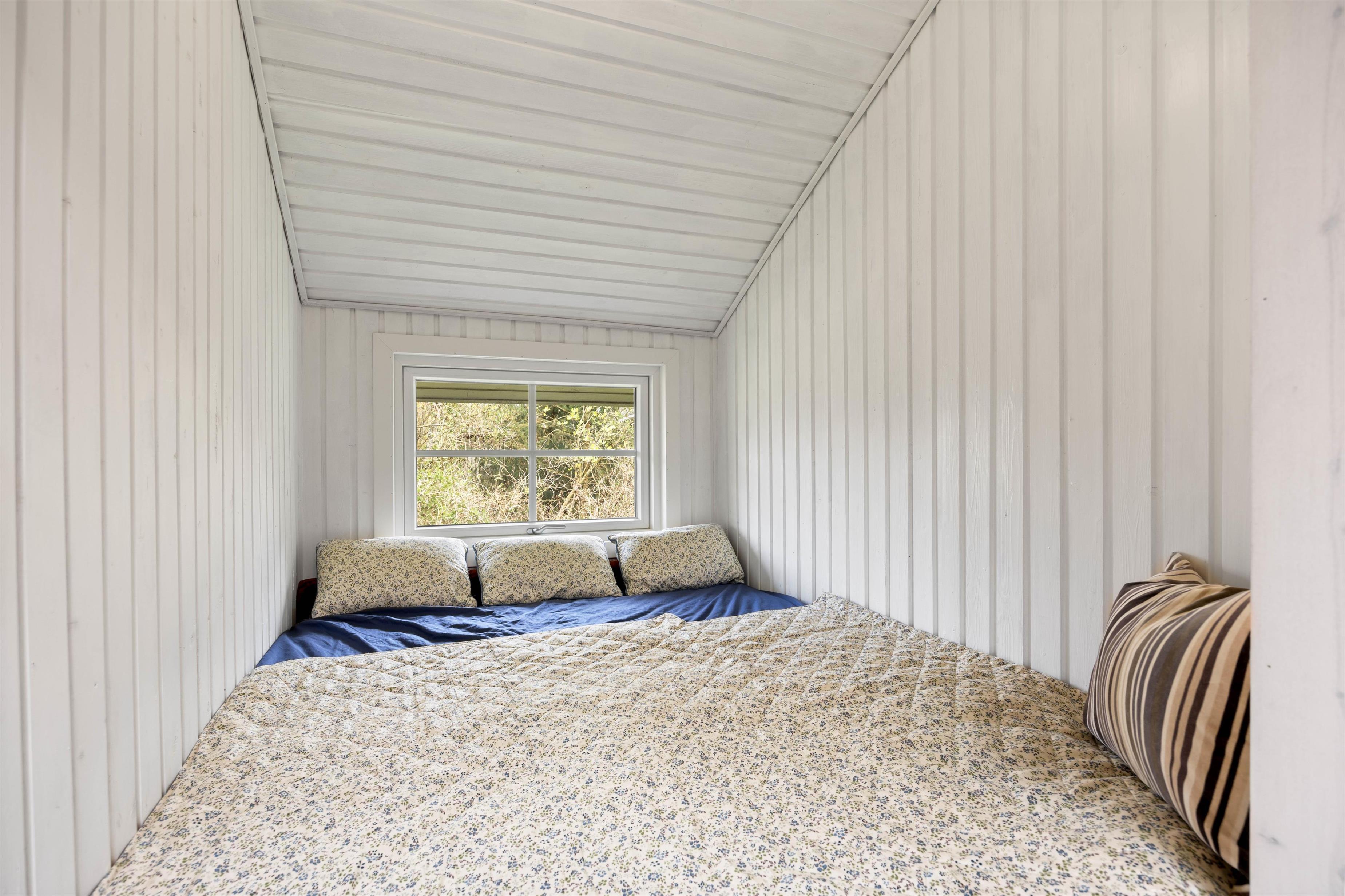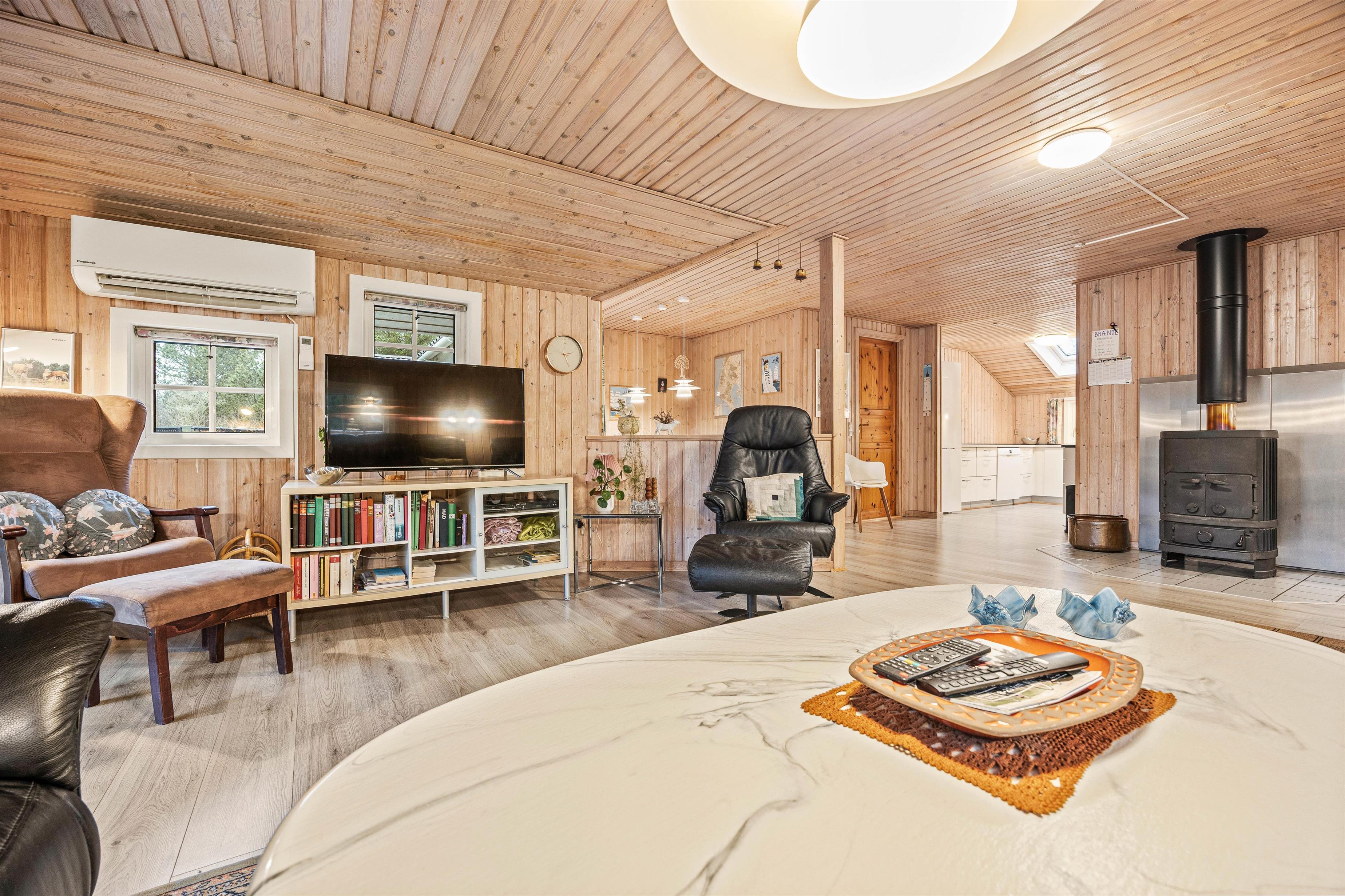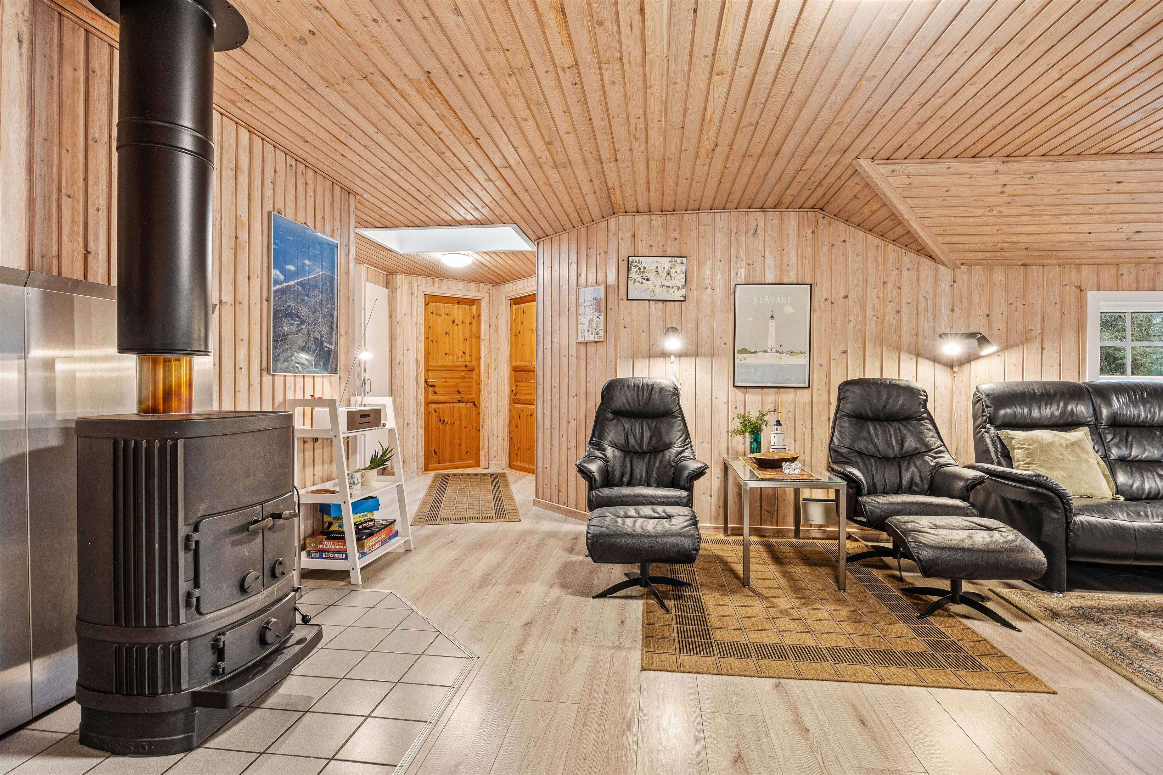 Hjerterummet er det kombinerede køkken, spiseområde og stue der emmer af sommerhusstemning. Et klassisk udtryk med trævægge, komfortable møbler og mange fine siddekroge – perfekt til ferielæsningen eller en god film, der bliver streamet vha. feriehusets Chromecast. I leverummet er der mulighed for at være sammen, selvom I har gang i noget forskelligt. Mens der laves mad, kan familiens mindste tegne omkring spisebordet eller spille brætspil. Centralplaceret mellem spisestuen og stuen står brændeovnen. På de køligere efterårsdage kan I med fordel gøre brug af denne og mærke varmen brede sig. Herinde finder I desuden også den energibesparende varmepumpe, der sørger for et behageligt indeklima.