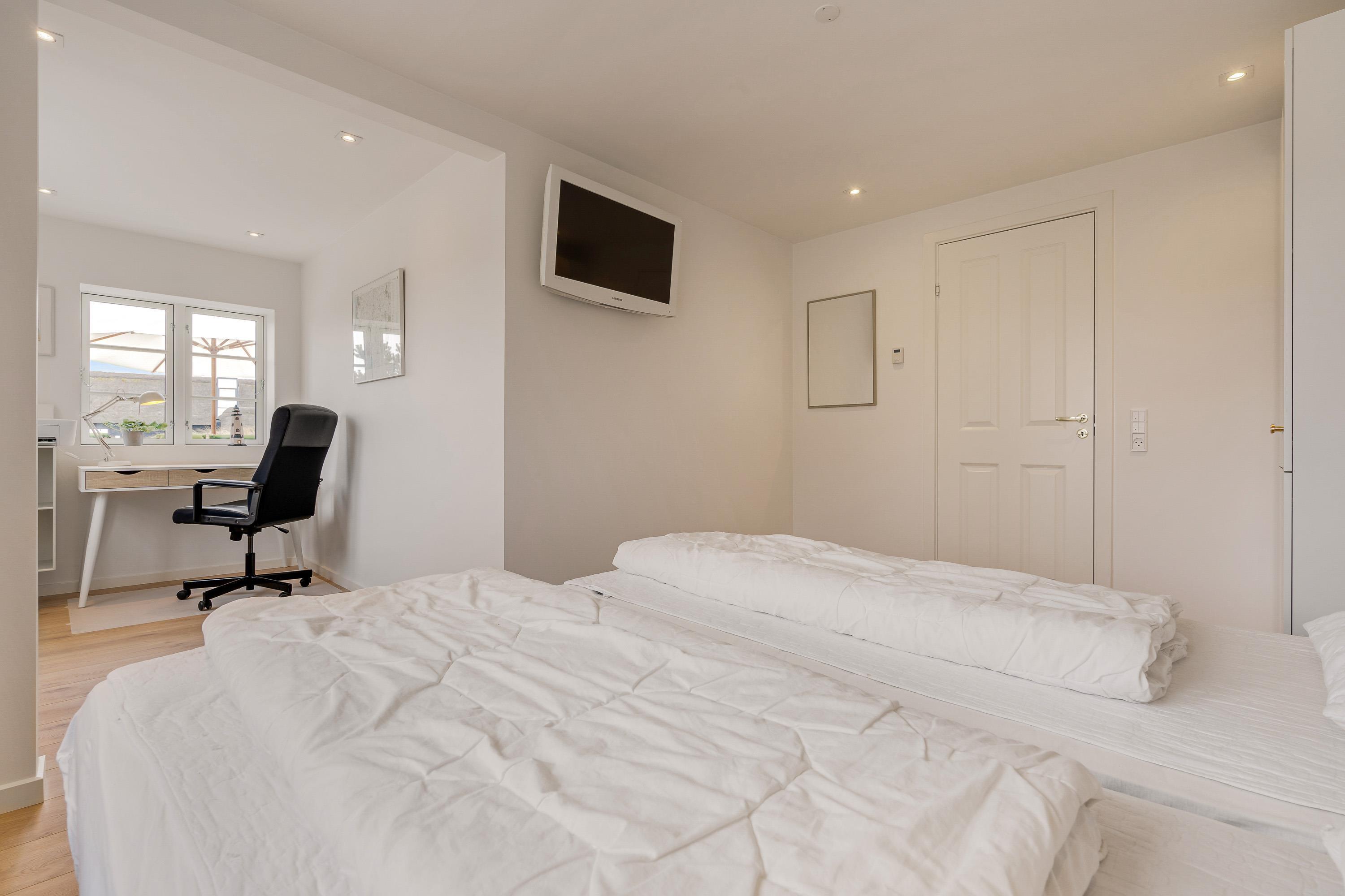 Sommerhuset i Blåvand har plads til op til otte personer med tre hyggelige soveværelser, der hver er udstyret med en komfortabel dobbeltseng og dertil en sovesofa på 1. sal - bemærk, at trappen til overetagen er lidt stejl.