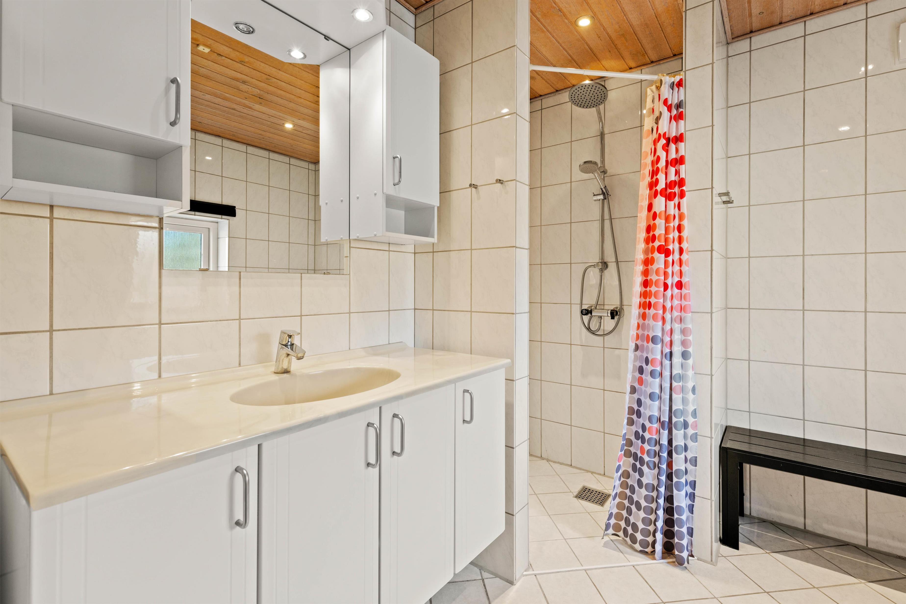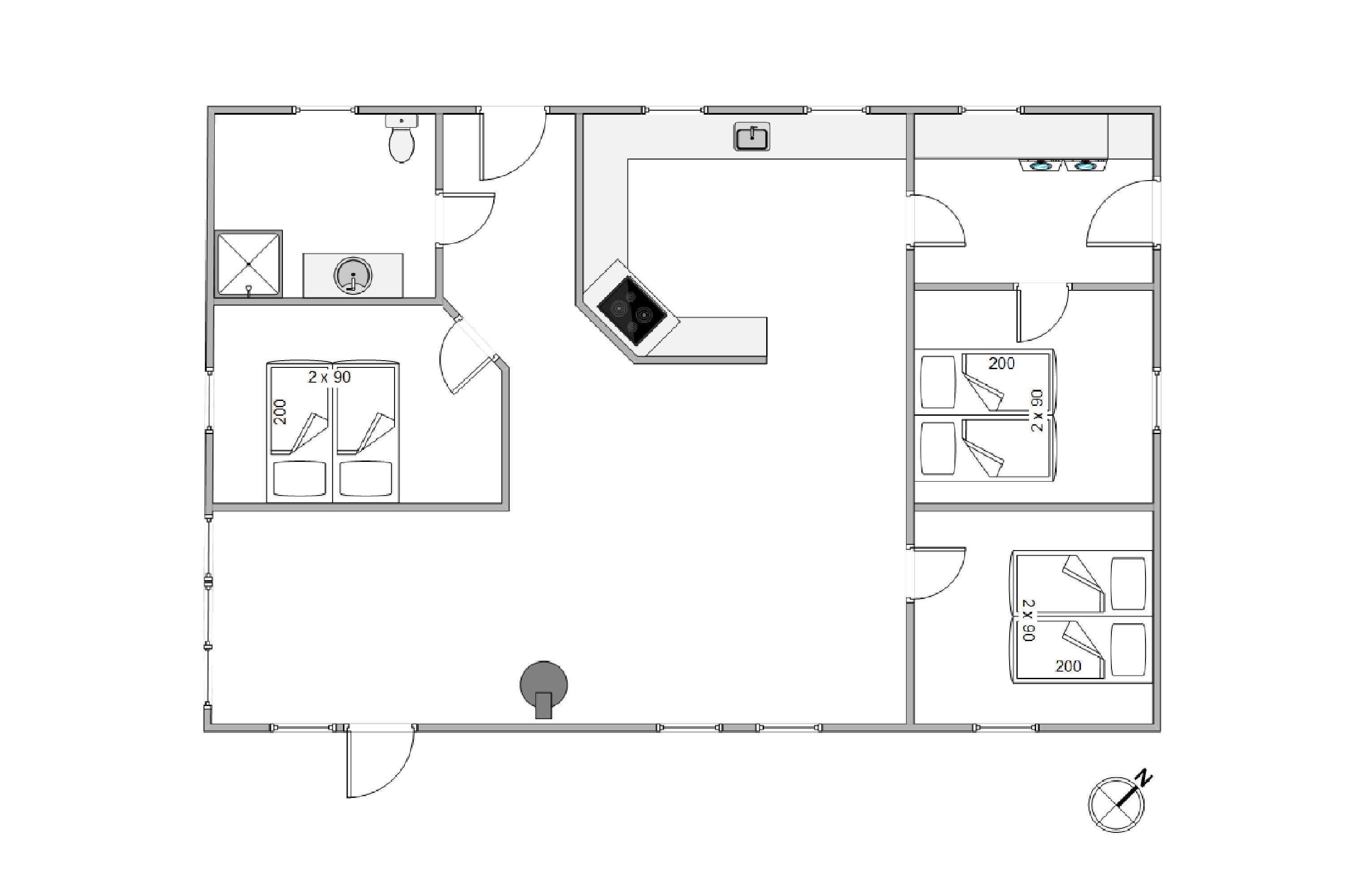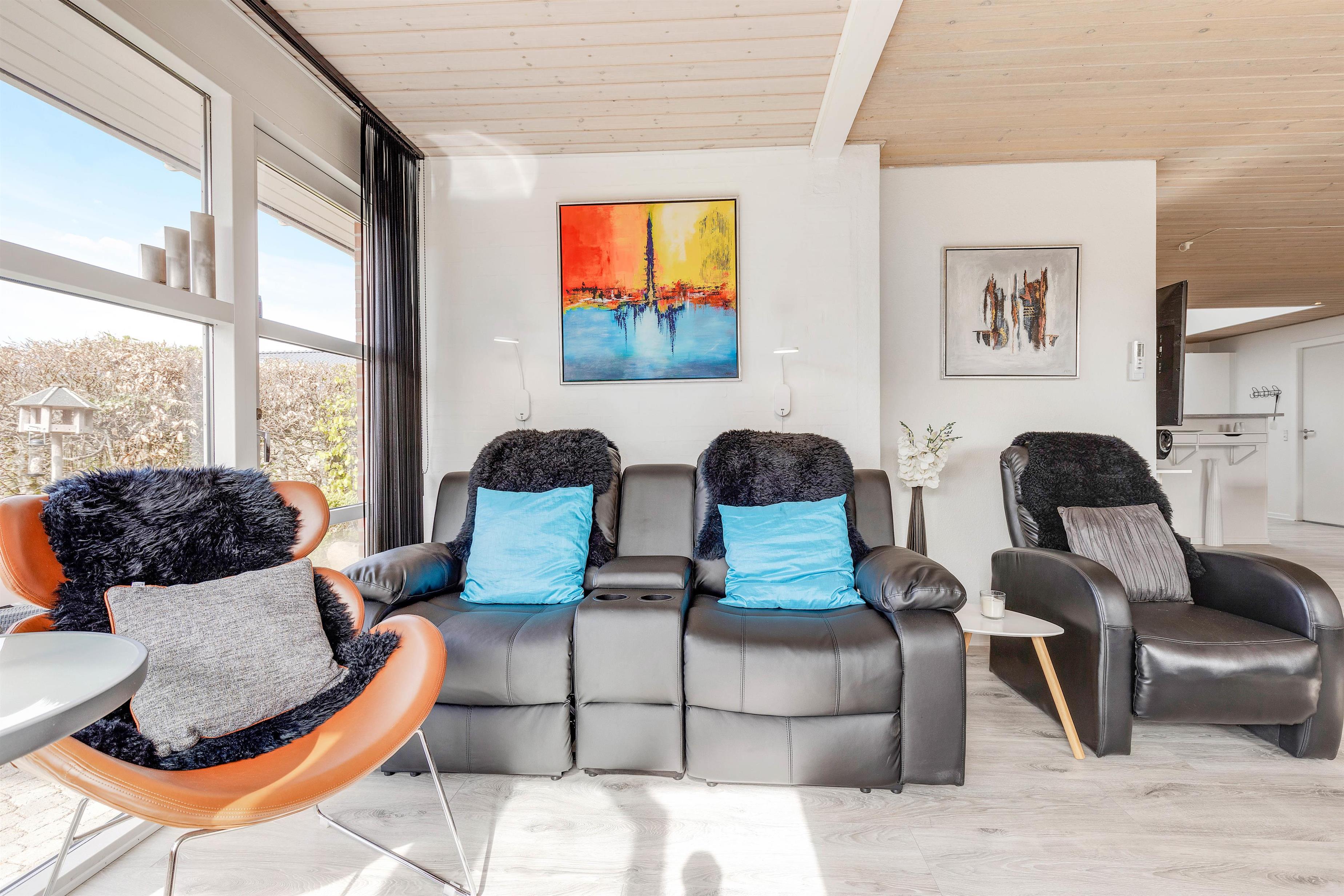 Det åbne opholdsrum samler køkken og stue i ét fællesrum, hvor hele familien kan samles om morgenkaffen, madlavningen og de sene filmaftener på sofaen foran det det store fladskærm-tv, mens brændeovnen knitrer i baggrunden. Her er garanti for masser af nye ferieminder. Feriehusets soveværelser er alle udstyret med dobbeltsenge og det store badeværelse har gulvvarme.