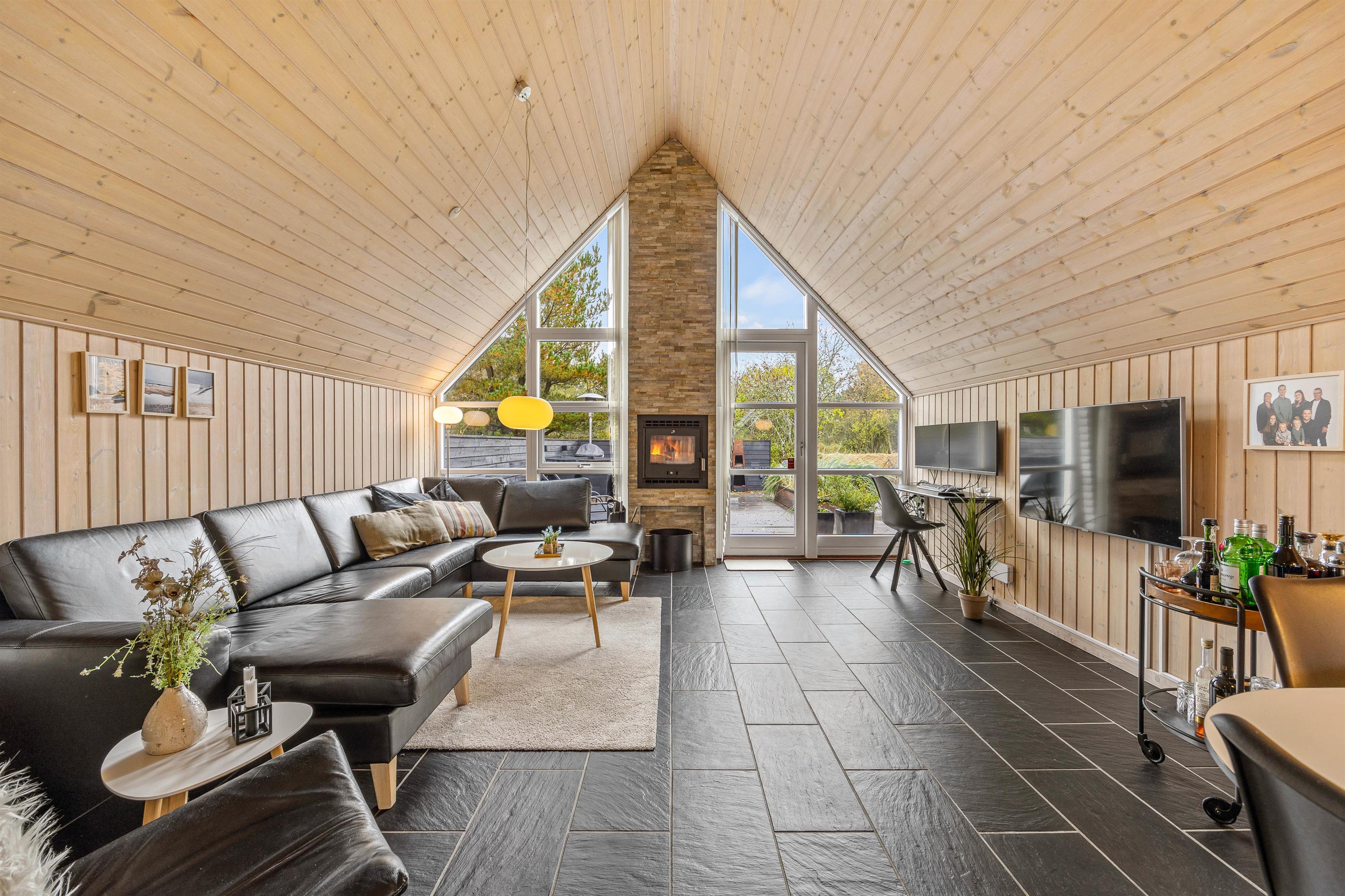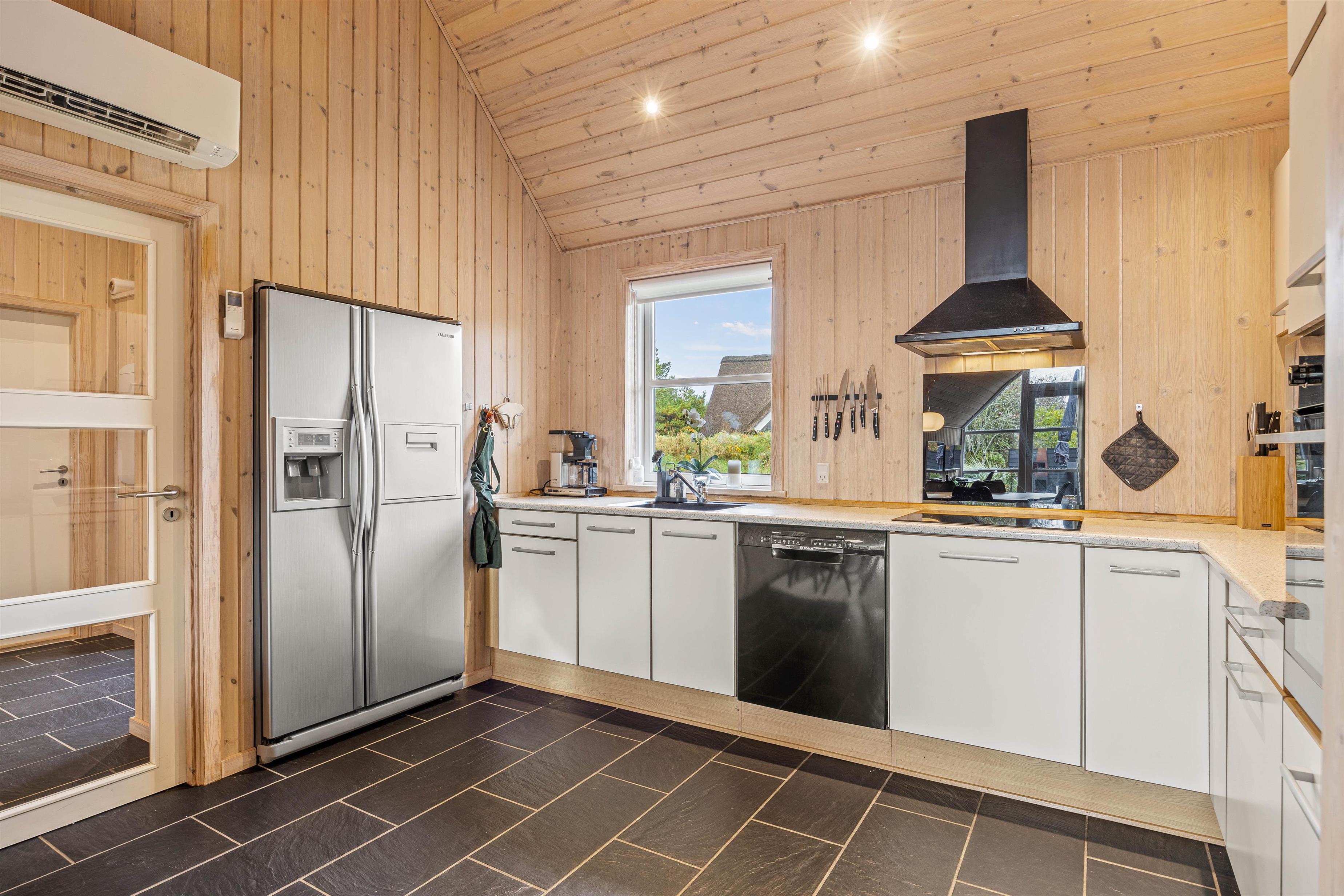 Et moderne stråtækt feriehus kalder på op til 8 feriegæster som står klar med veludstyret køkken i direkte sammenhæng med spisepladser og stilfuld stue. Gulvvarme, brændeovn og varmepumpe sørger for behagelig temperatur i det højloftede rum, og der er gjort plads til hygge og samvær for flere vennepar eller en større familie.
