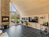 Det sorte klinkegulv med gulvvarme går igen i hele opholdsrummet, der ender i den hyggelige stue med det store vinduesparti, der lukker lyset og naturen ind og den flotte murstenssøjle med brændeovnen. Den store lædersofa indbyder til at slænge sig til en film eller en god bog. Et lille tip: brug den energivenlige varmepumpe for en jævn behagelig temperatur.