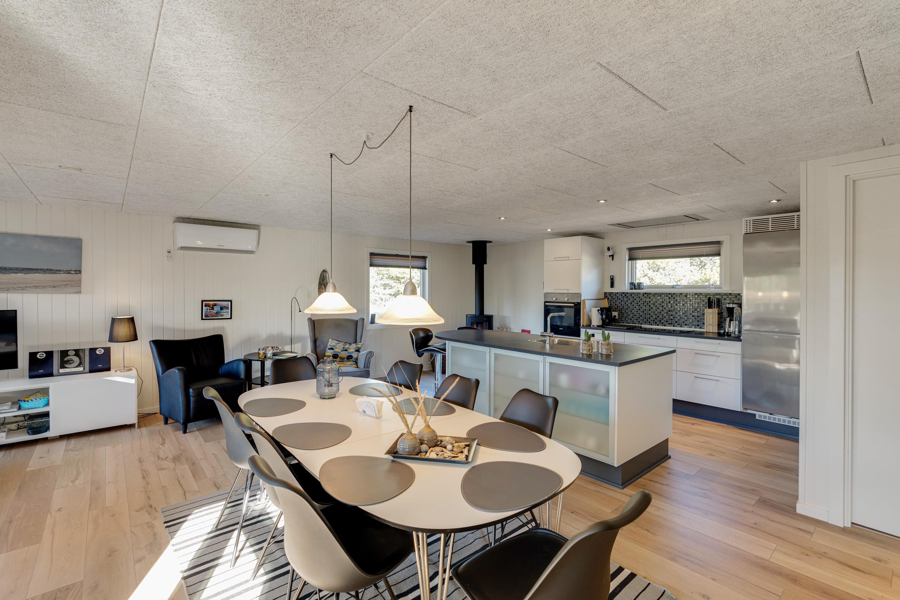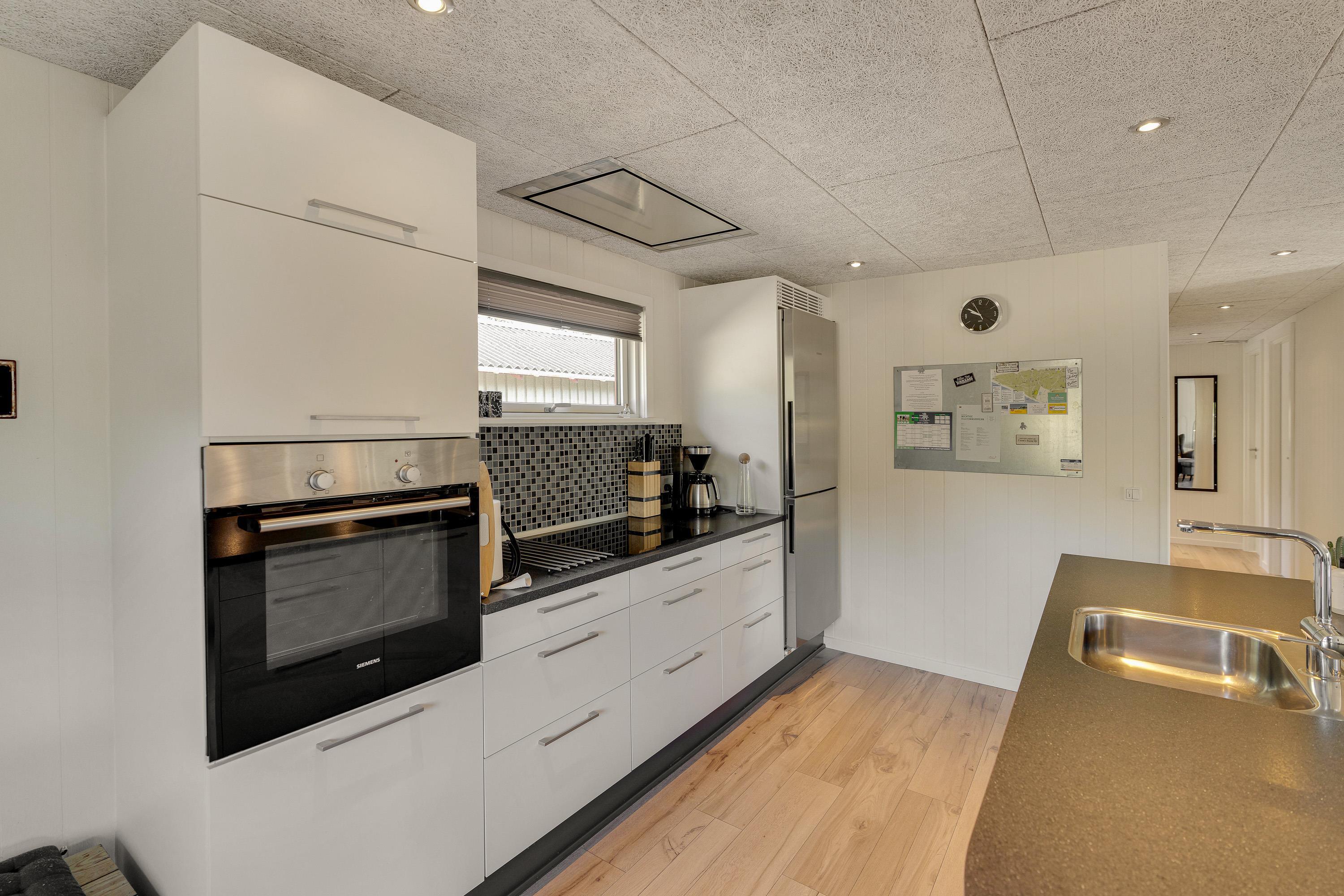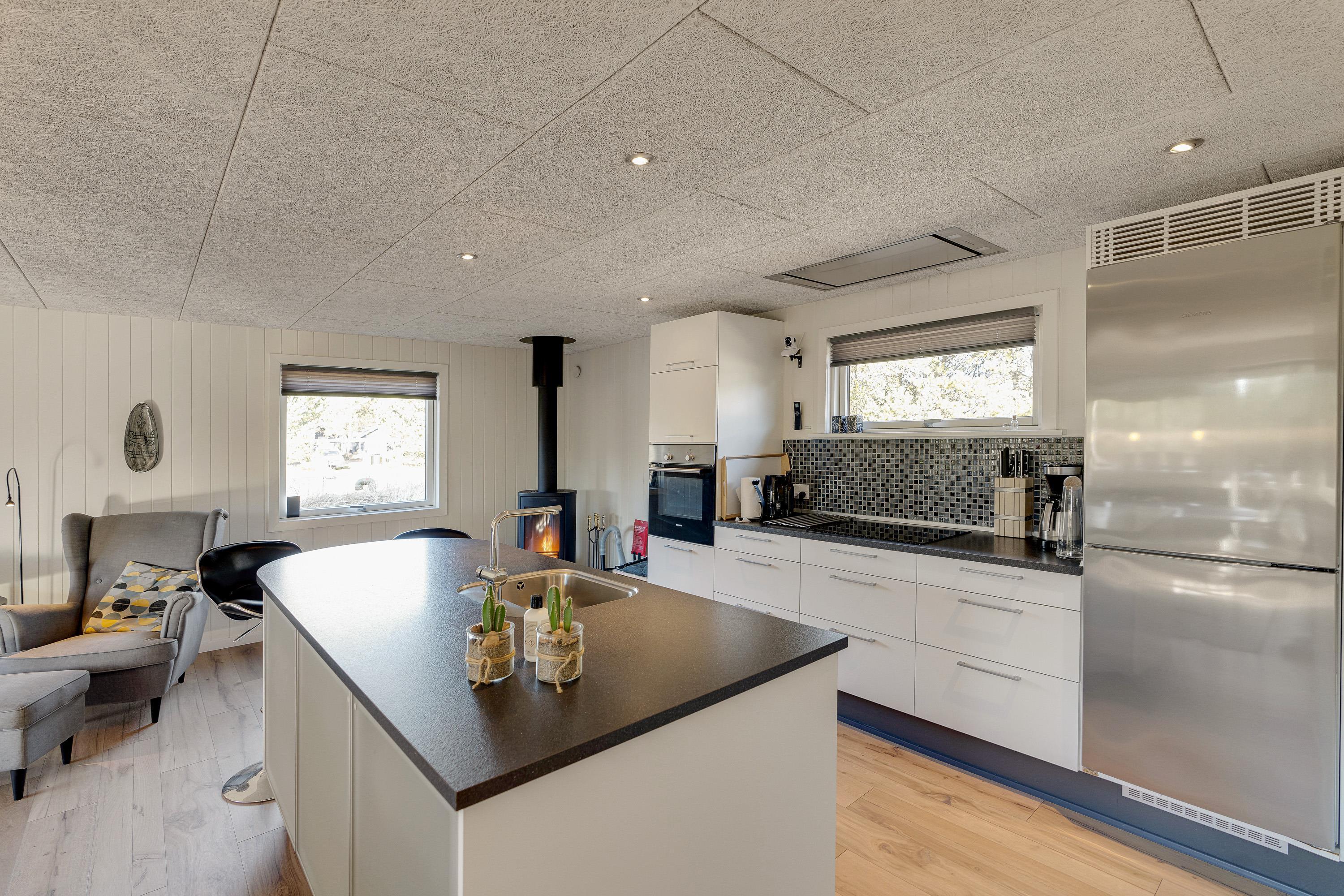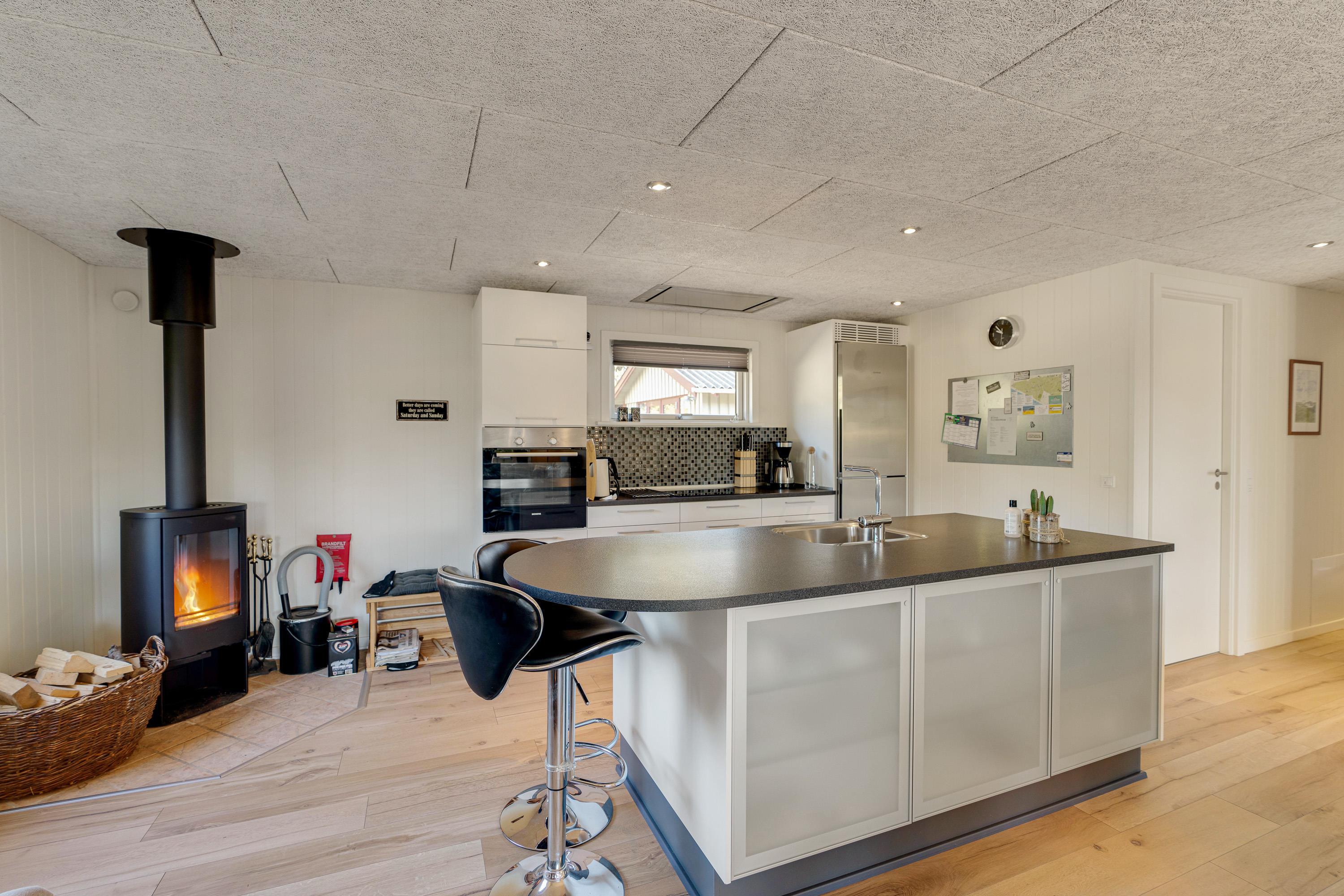 Indvendigt er der et stort og flot køkken, hvor alle faciliteter er i top. Ved køkkenøen kan I samles og sammen tilberede jeres yndlingsret. Fra køkkenet har man udsyn over stuen og det store vinduesparti ud til naturen, og det skaber også et flot lysindfald. Desuden øger brændeovnen kun hyggen til næste niveau, når den sender varme og en behagelig lyd af knitren ud i rummet. Her er der tale om feriestemning på kolde aftener.