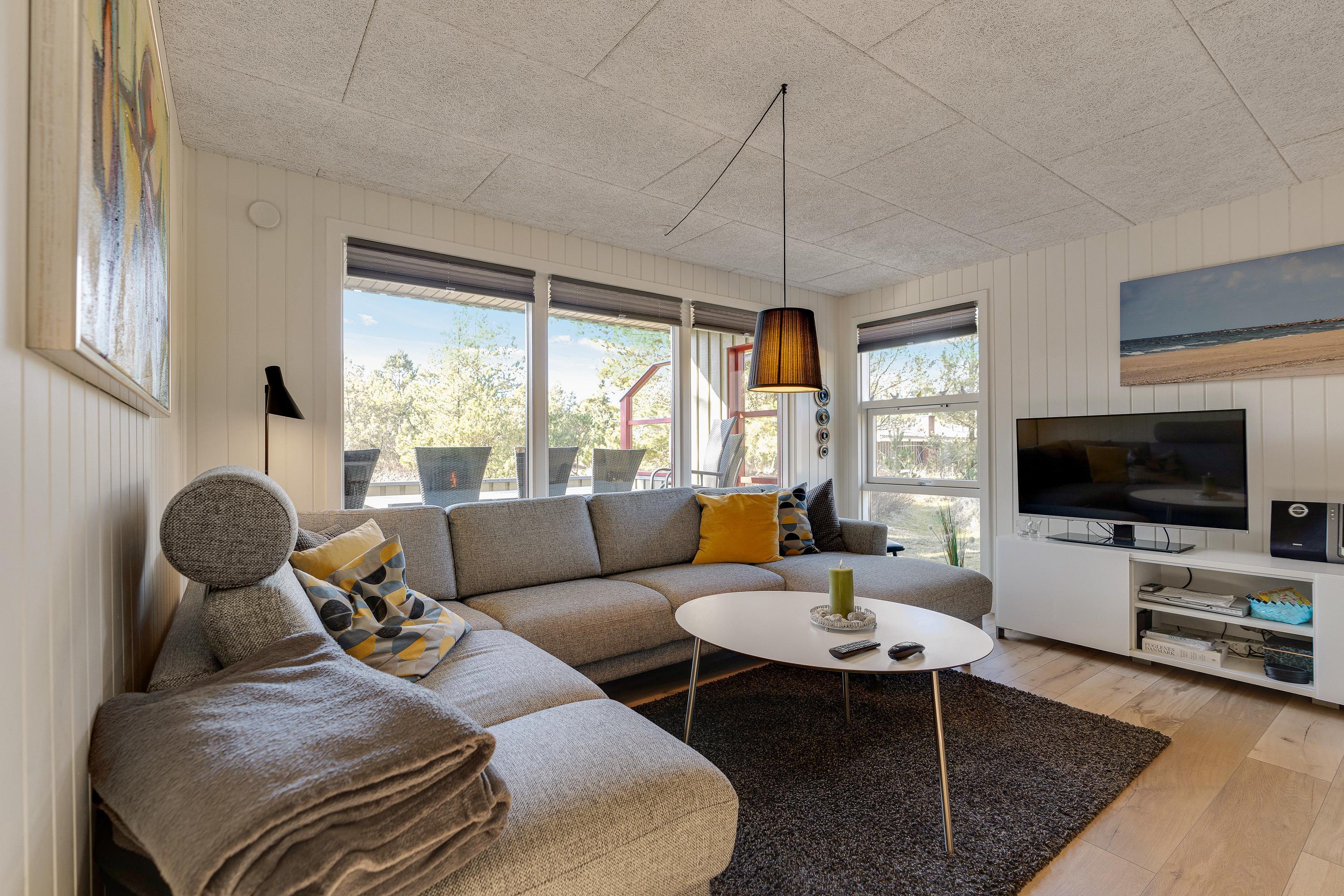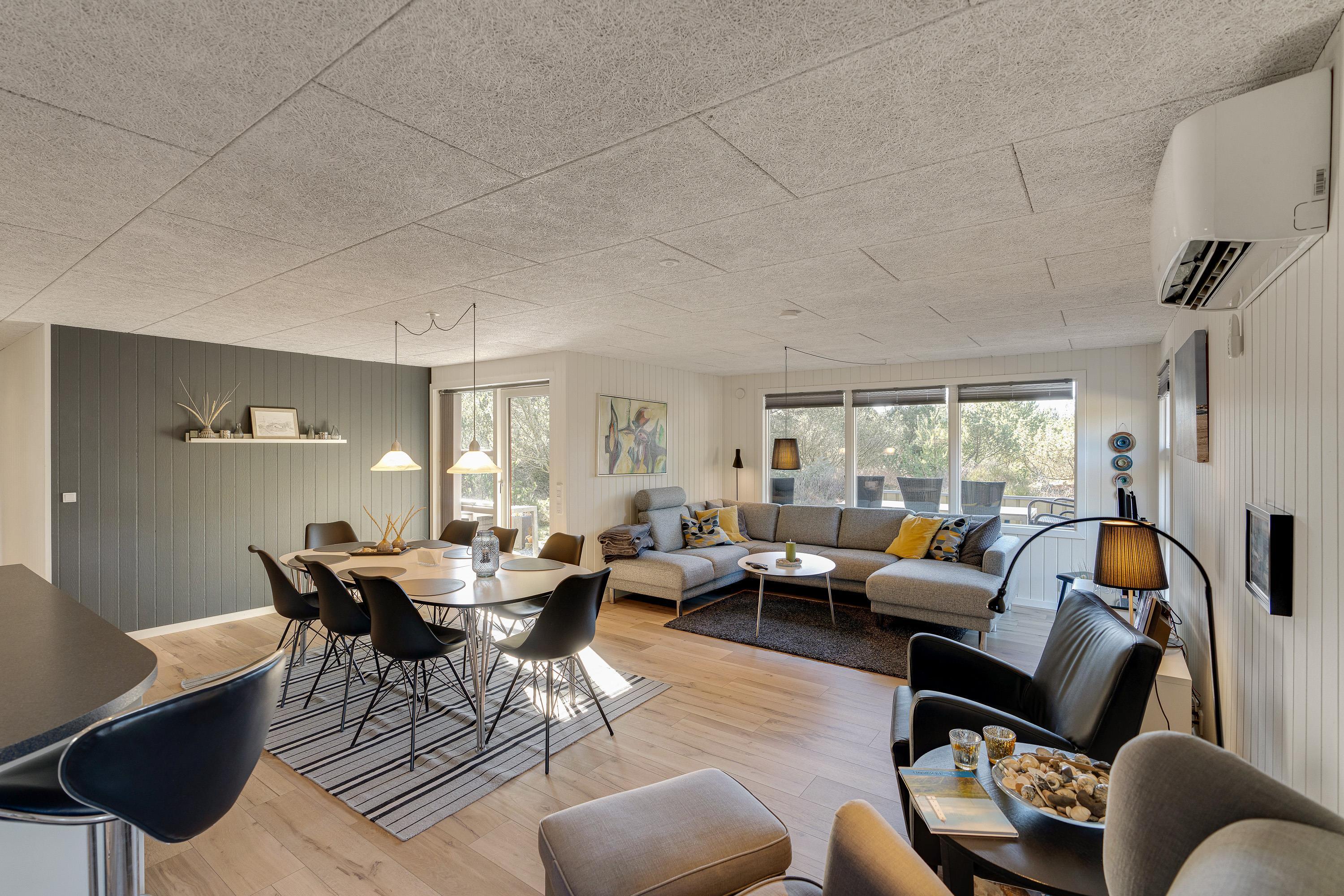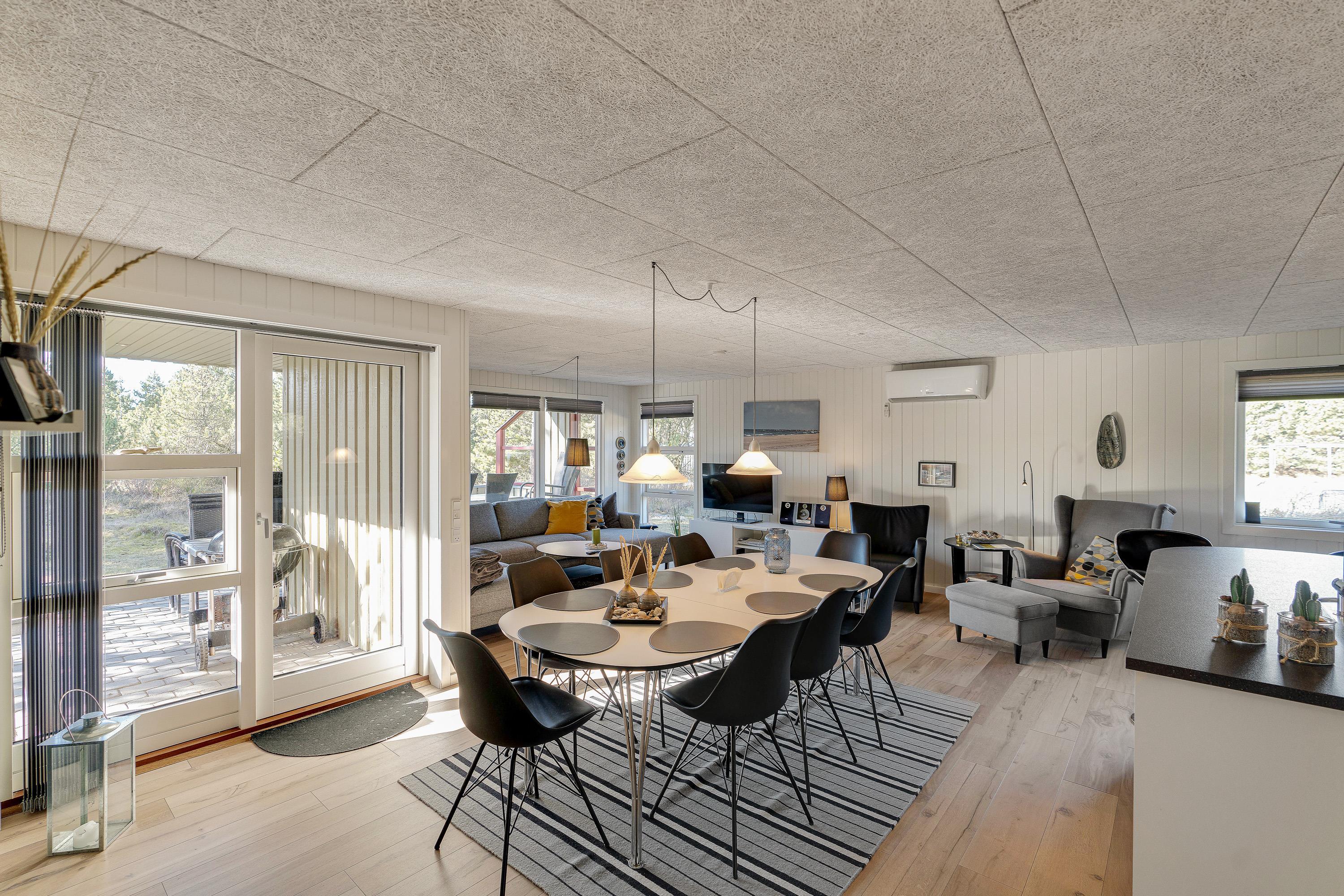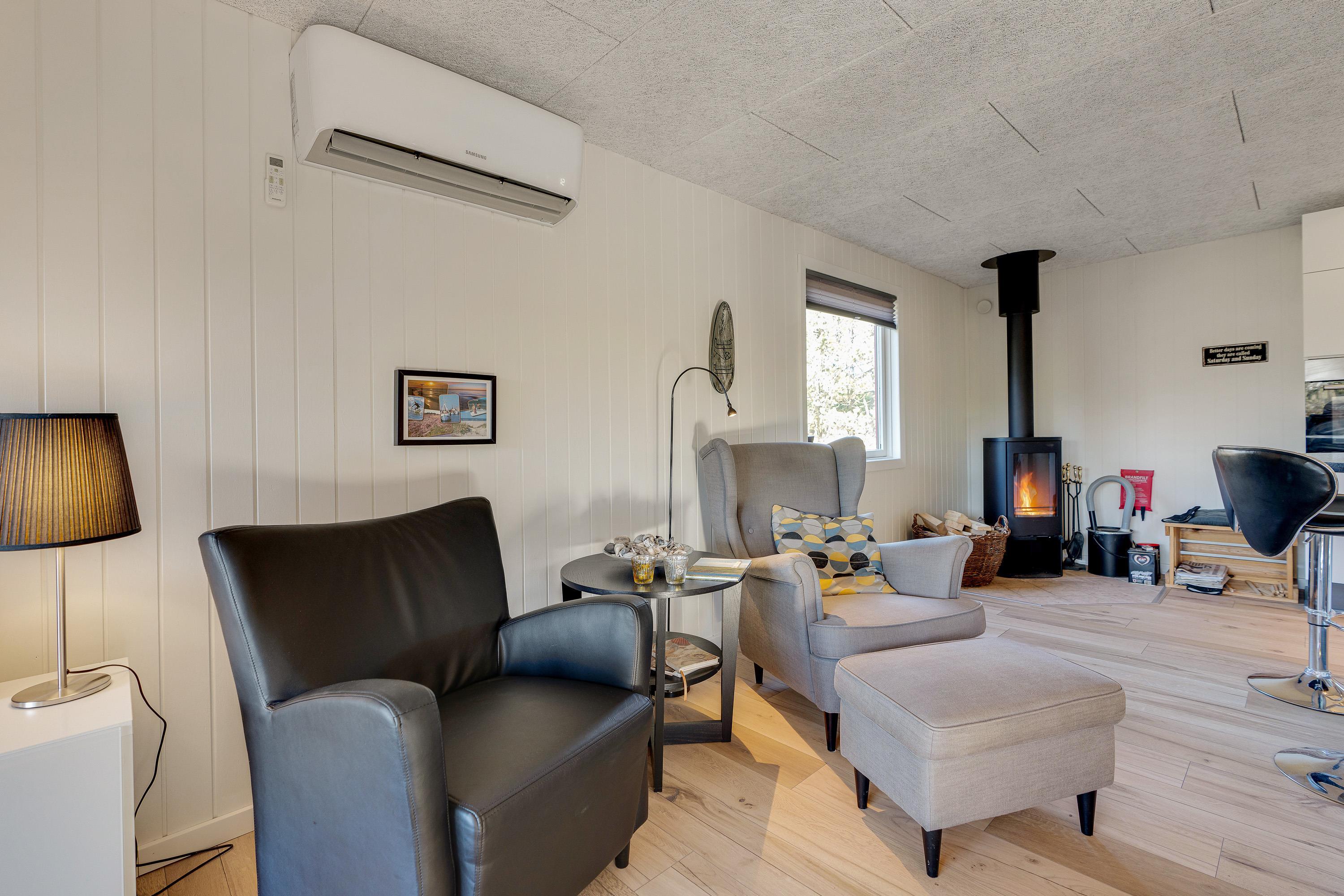 Indvendigt er der et stort og flot køkken, hvor alle faciliteter er i top. Ved køkkenøen kan I samles og sammen tilberede jeres yndlingsret. Fra køkkenet har man udsyn over stuen og det store vinduesparti ud til naturen, og det skaber også et flot lysindfald. Desuden øger brændeovnen kun hyggen til næste niveau, når den sender varme og en behagelig lyd af knitren ud i rummet. Her er der tale om feriestemning på kolde aftener.