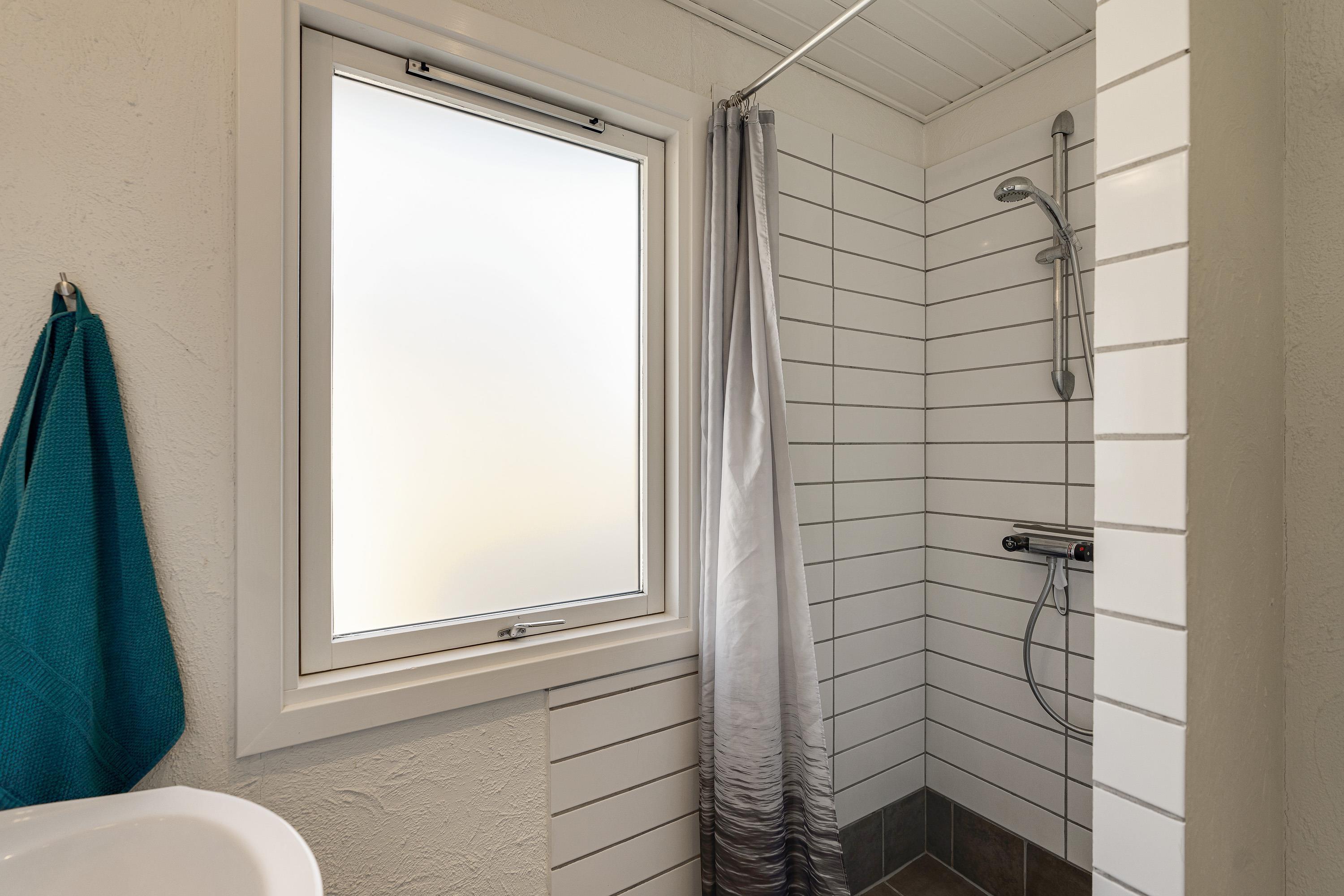 Dette sommerhus har endvidere to badeværelser. Det ene er komplet med bruser og det andet er et gæstetoilet med vaskemaskine og tørretumbler. Begge er med gulvvarme. Samtidig kan I gøre brug af varmepumpen, hvor I både sparer energi og sikrer behagelige temperaturer i rummene.