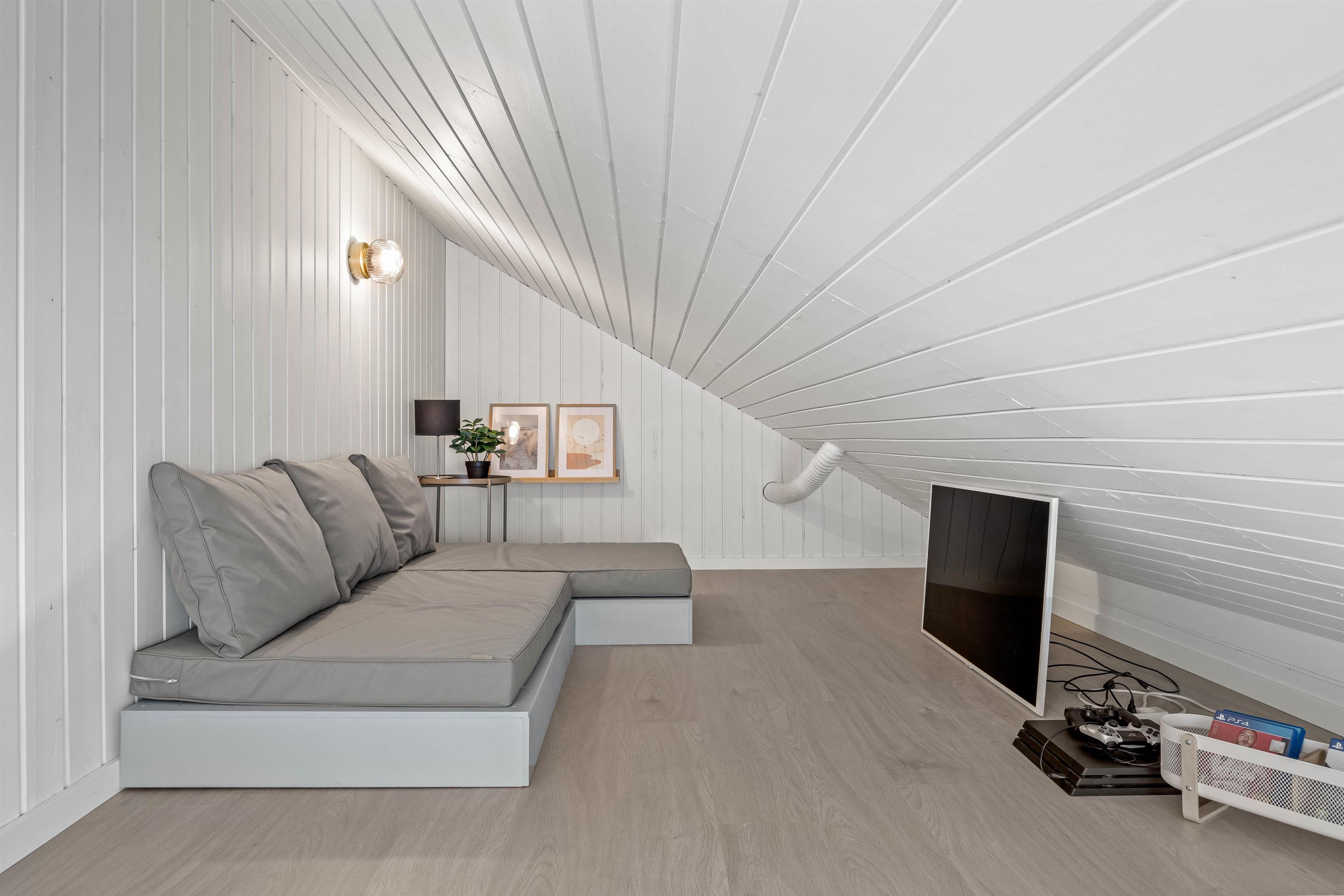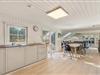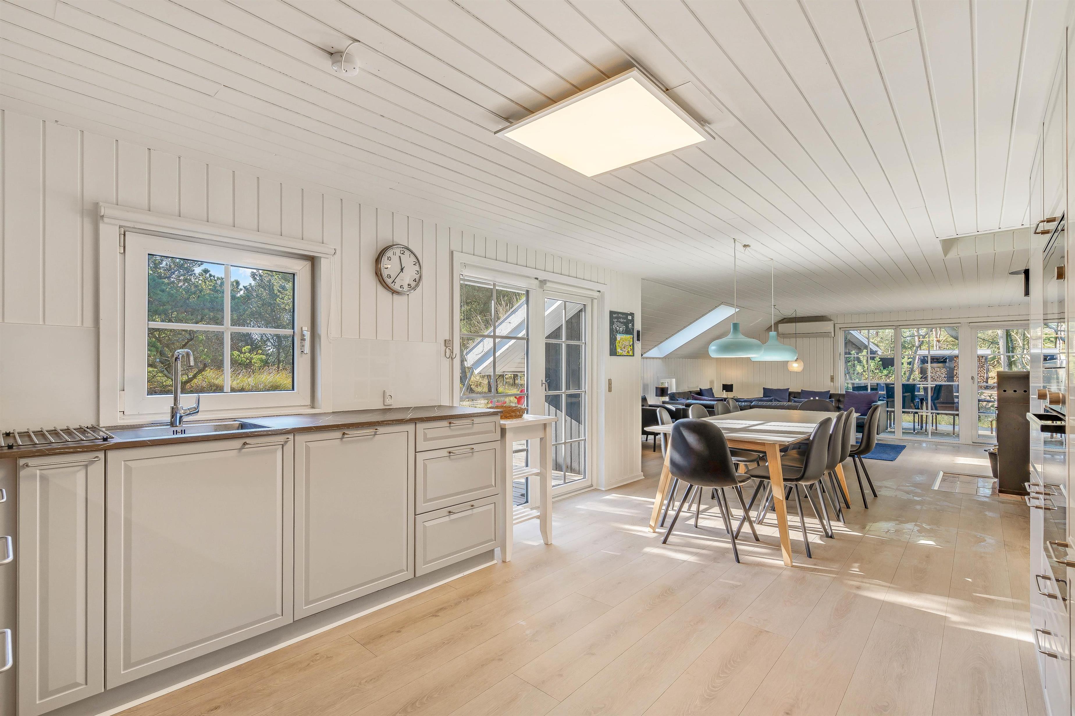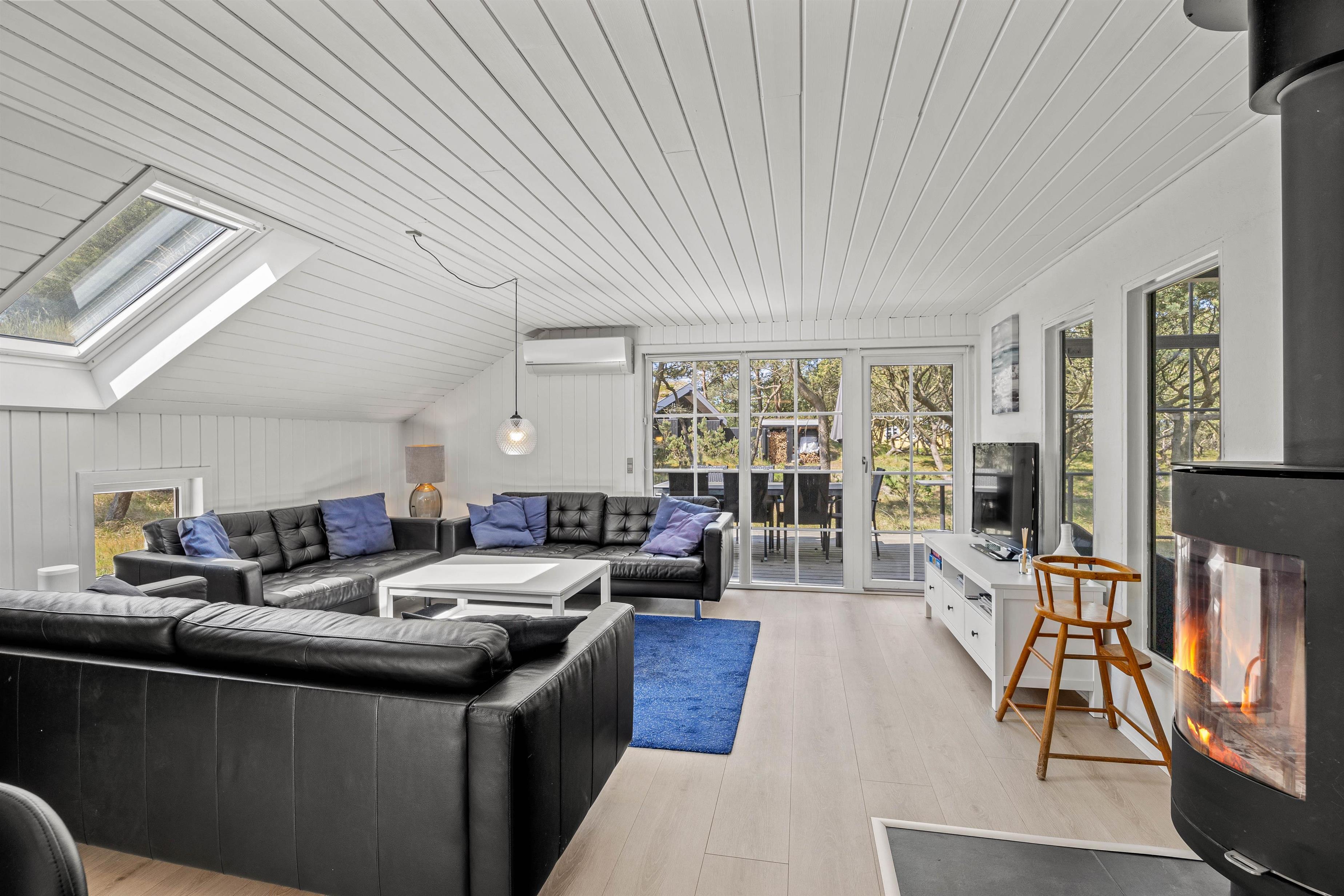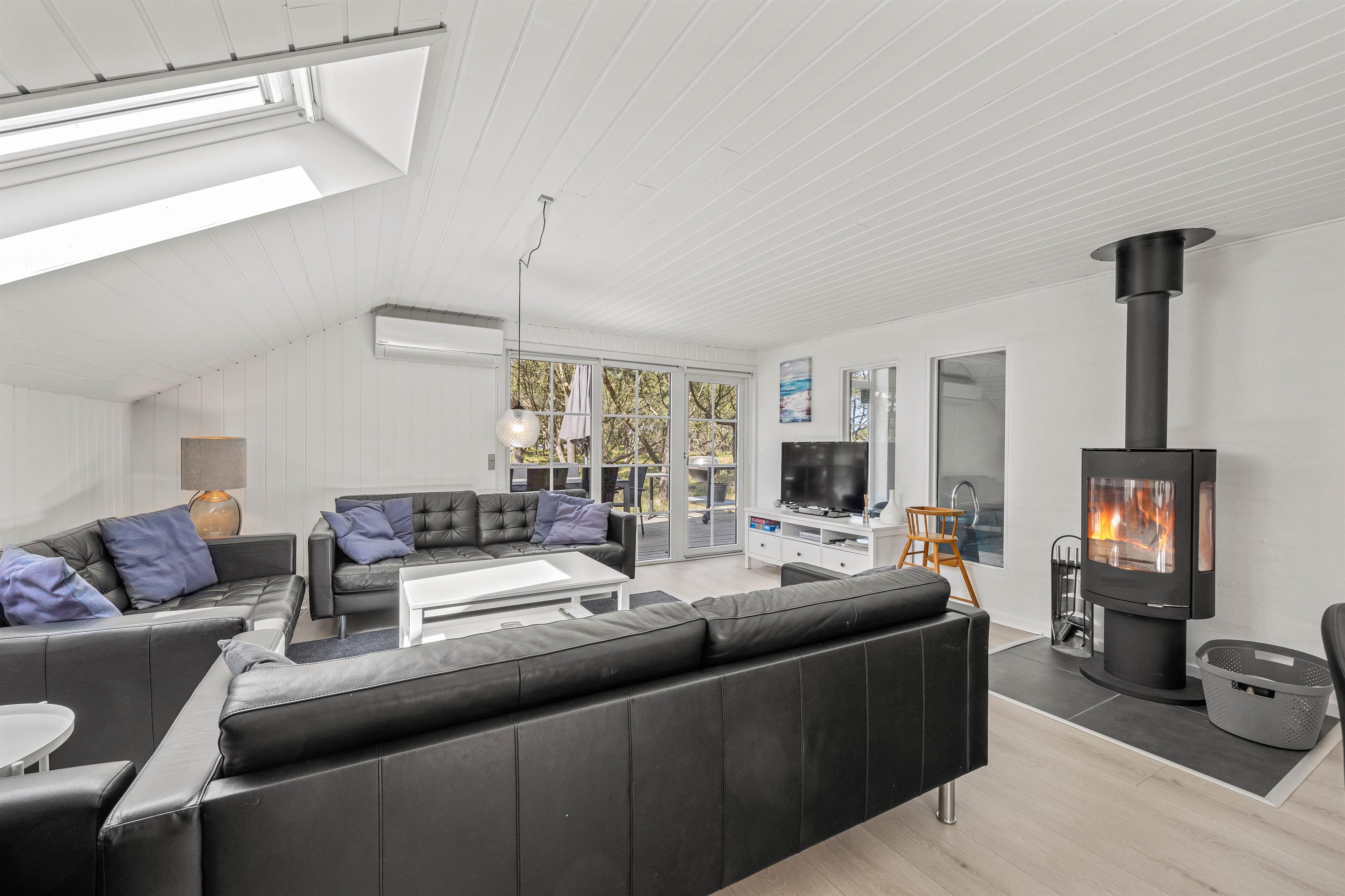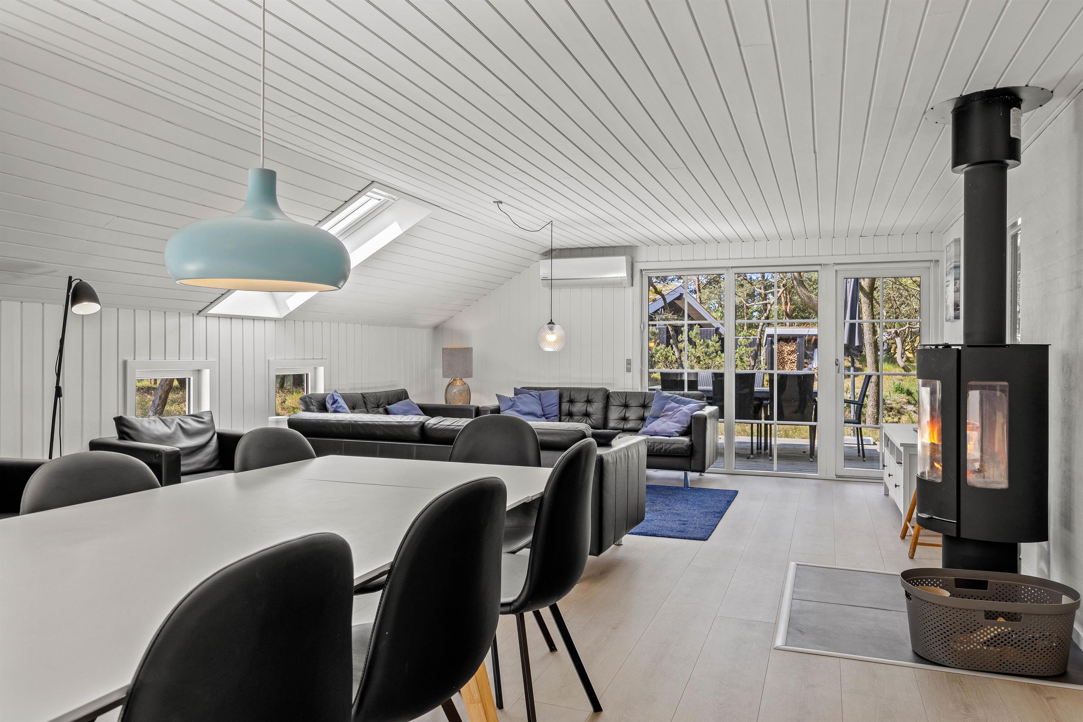 Sommerhusets alrum forener køkken, stue og spiseplads og indbyder til mange skønne stunder i løbet af jeres ferie. Her kan I være sammen om blandt andet at lave mad og se gode film, mens brændeovnen knitrer i baggrunden og fuldender den hyggelige feriestemning. Her er der desuden også gulvvarme, der holder jeres fødder varme.