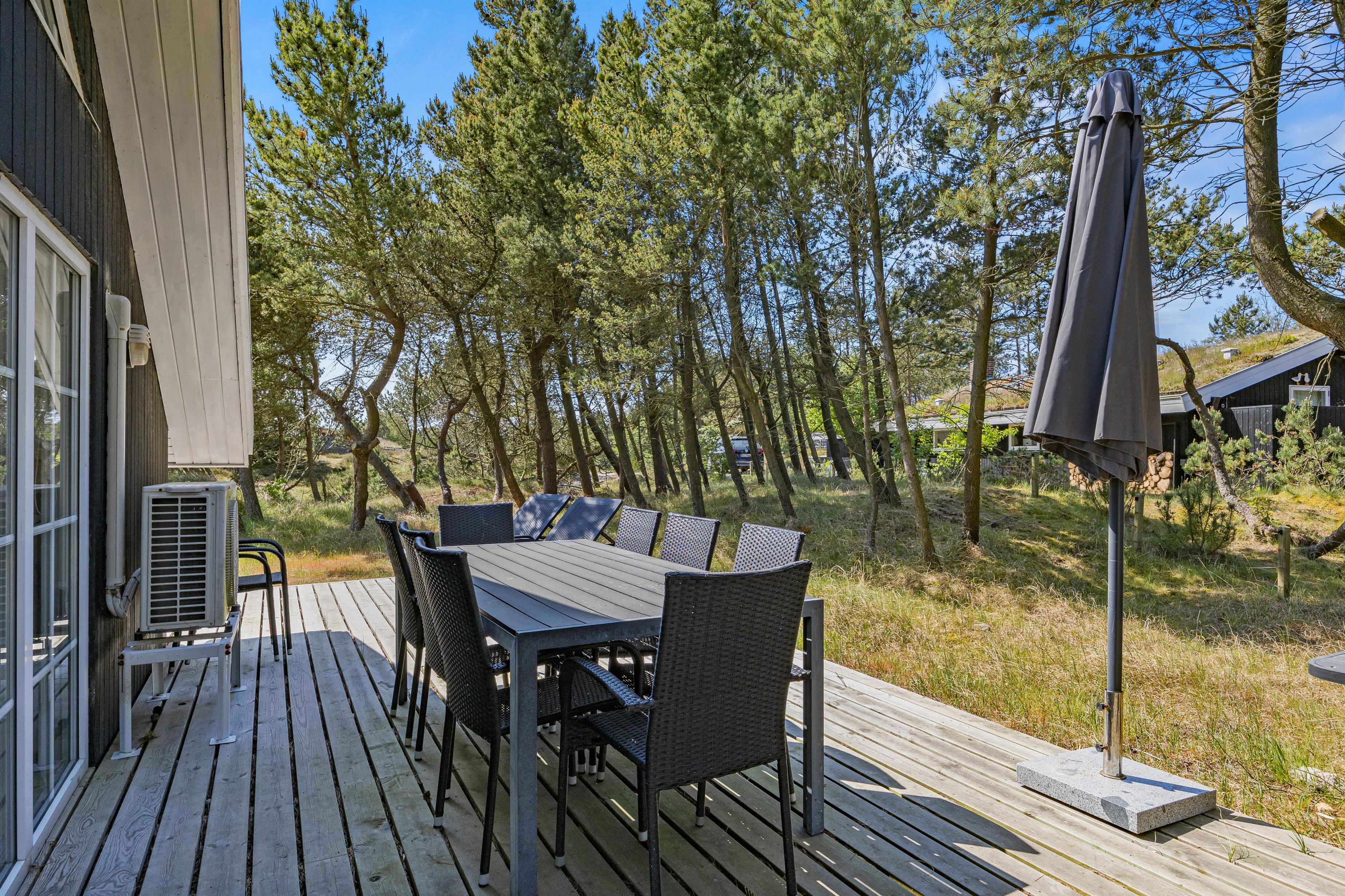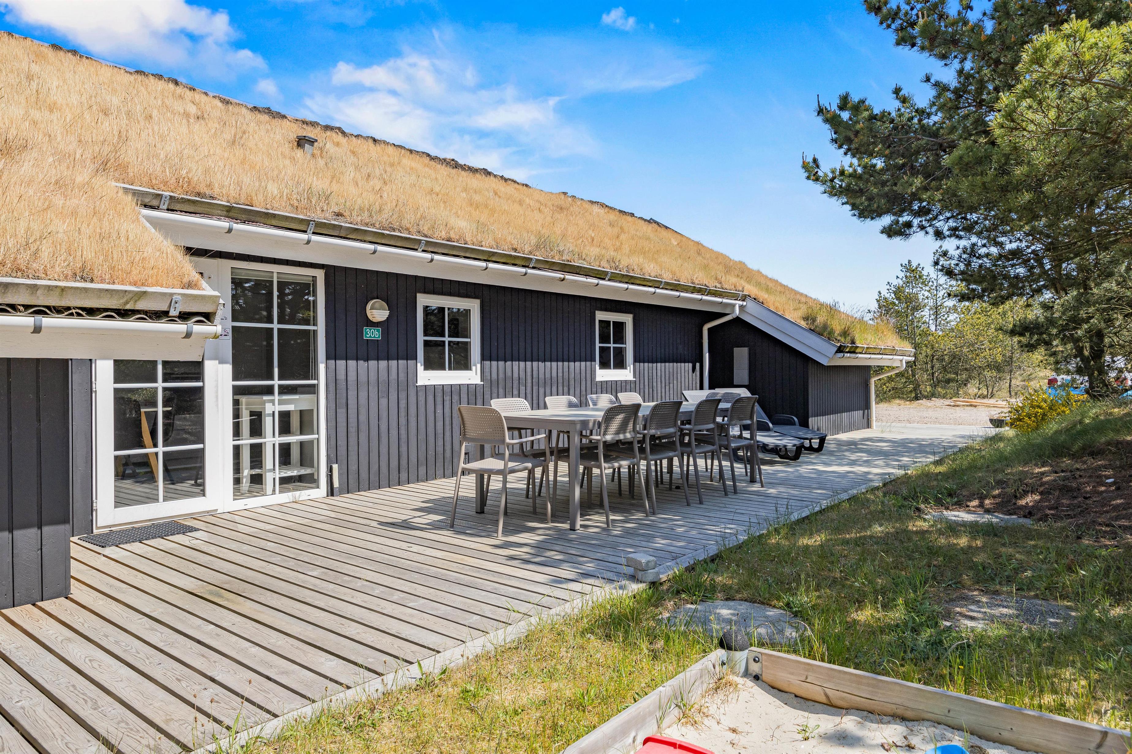 Fra sommerhuset kan I træde ud på den store terrasse, hvor der står havemøbler og liggestole klar til jer, så I kan finde jer godt til rette på en plads i solens varme stråler. Imens kan børnene bygge sandslotte i sandkassen eller gynge på gyngestativet.