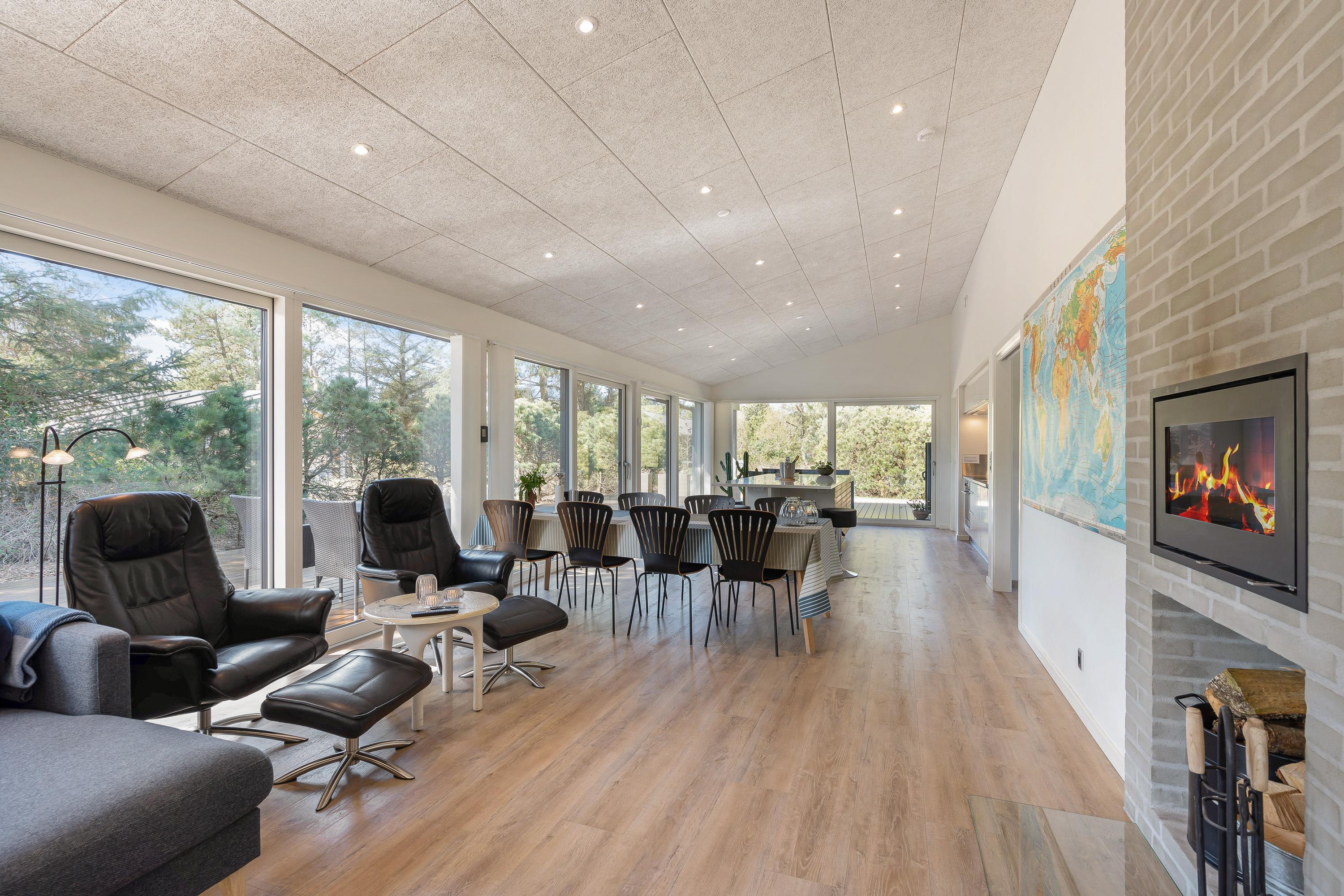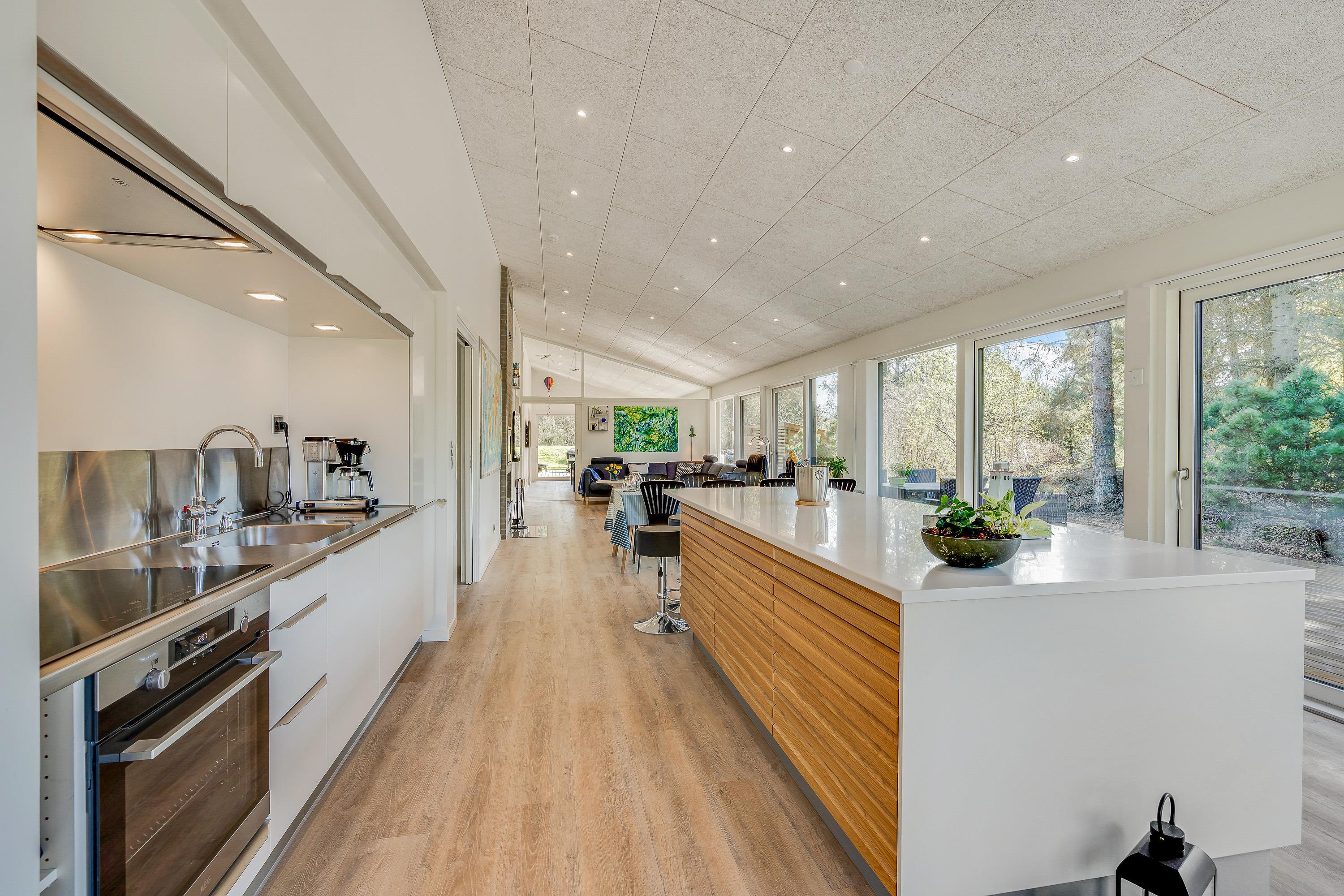 Feriehusets stue, køkken og spiseplads er forenet i ét stort rum, hvor I kan samles til mange hyggelige feriestunder. Gå sammen om madlavningen i køkkenet, spil et sjovt spil omkring bordet eller se en god film i tv’et. Brændeovnen fuldender den hyggelige stemning med sin knitren og varme. Her har I desuden også gulvvarme.