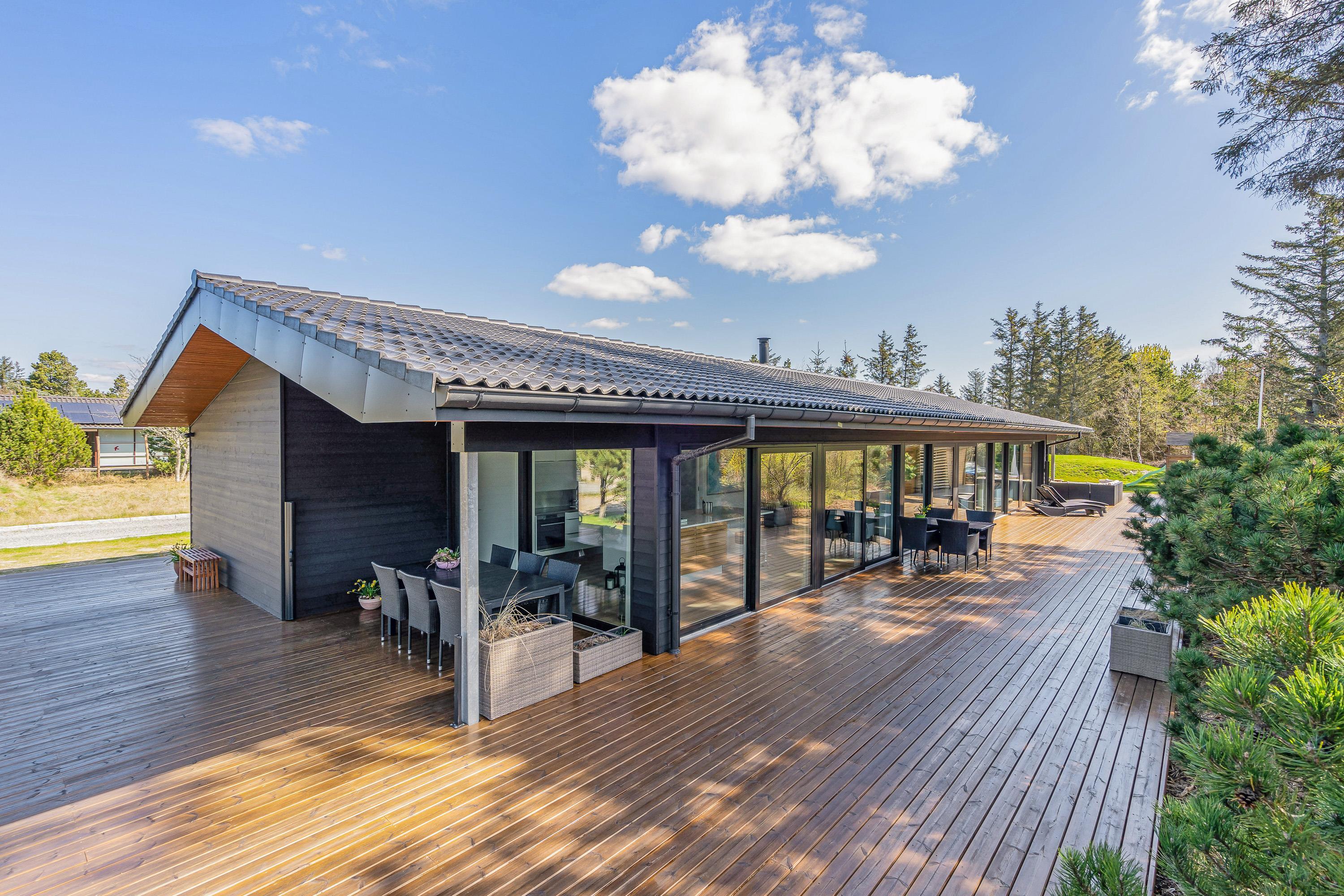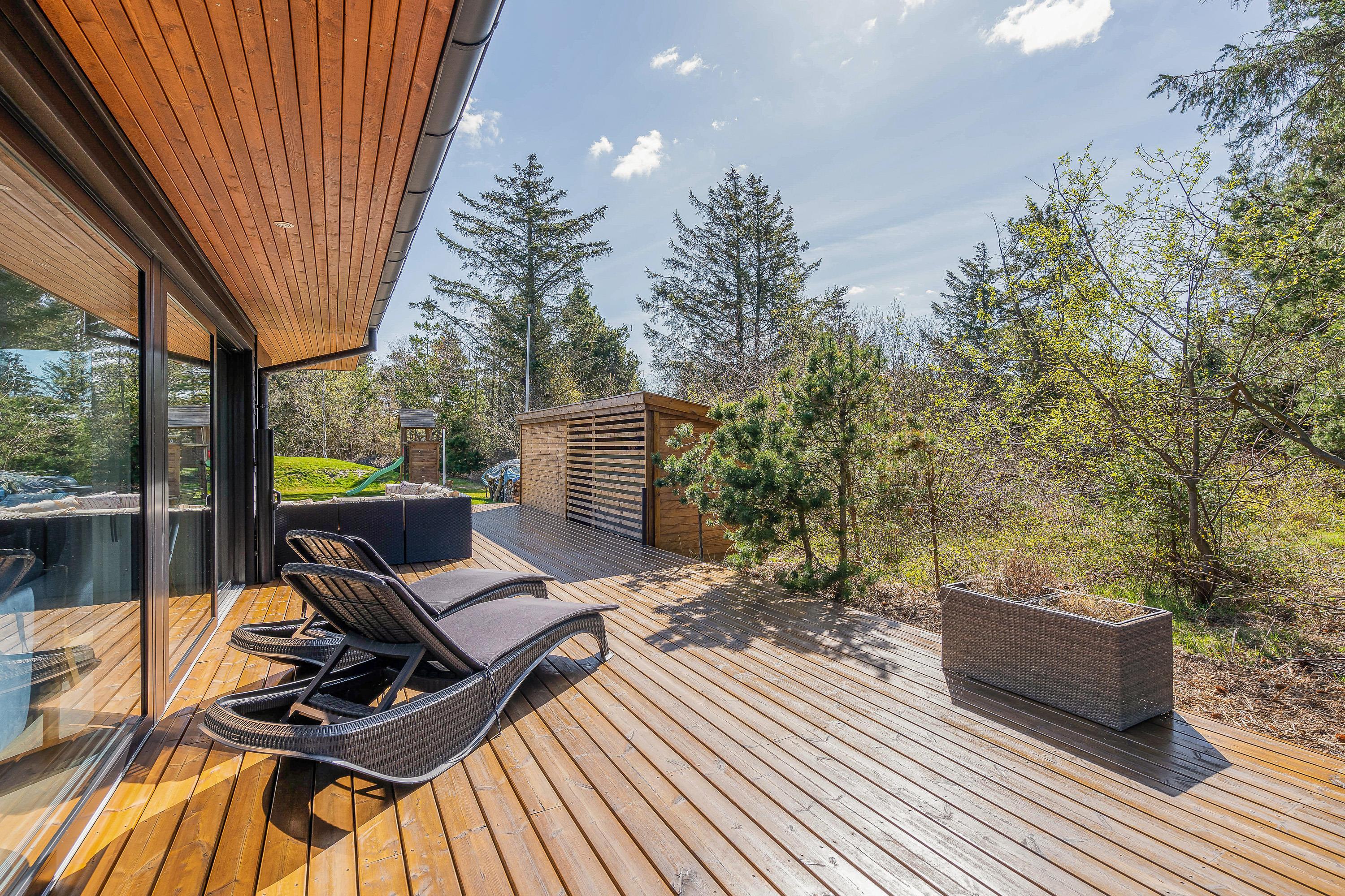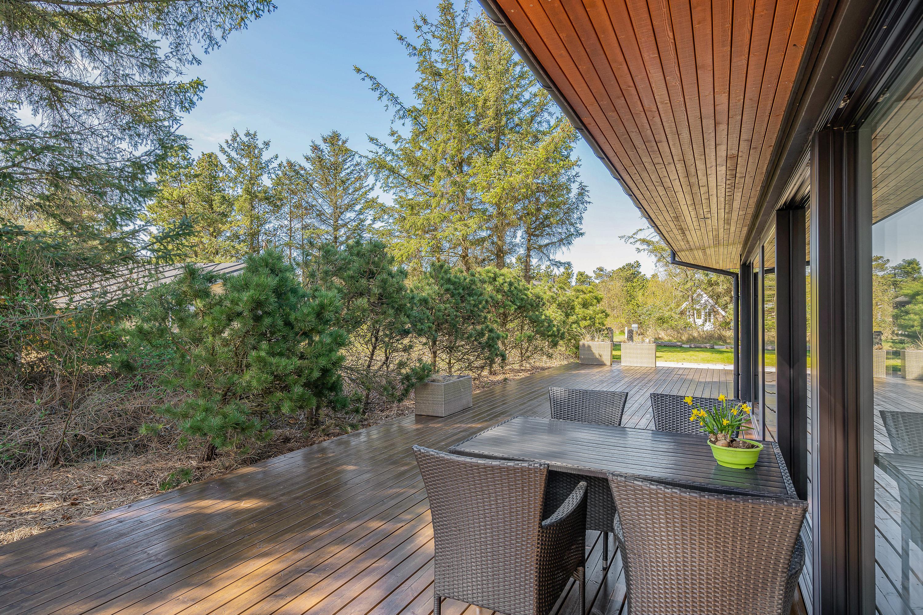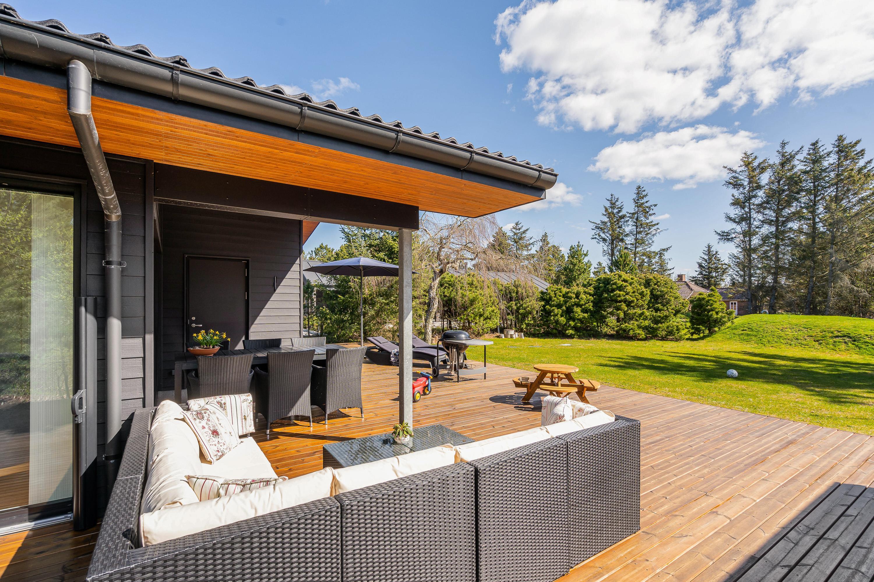 Omkring sommerhuset løber en stor, åben terrasse, der er delvist overdækket. Her vil I altid kunne finde jer en god plads i solen, hvor I kan sætte jer godt til rette i havemøbler og liggestole og slappe fuldstændig af. Hvis I skulle få brug for en pause fra solen, kan I sætte jer ind under den overdækkede del af terrassen.
