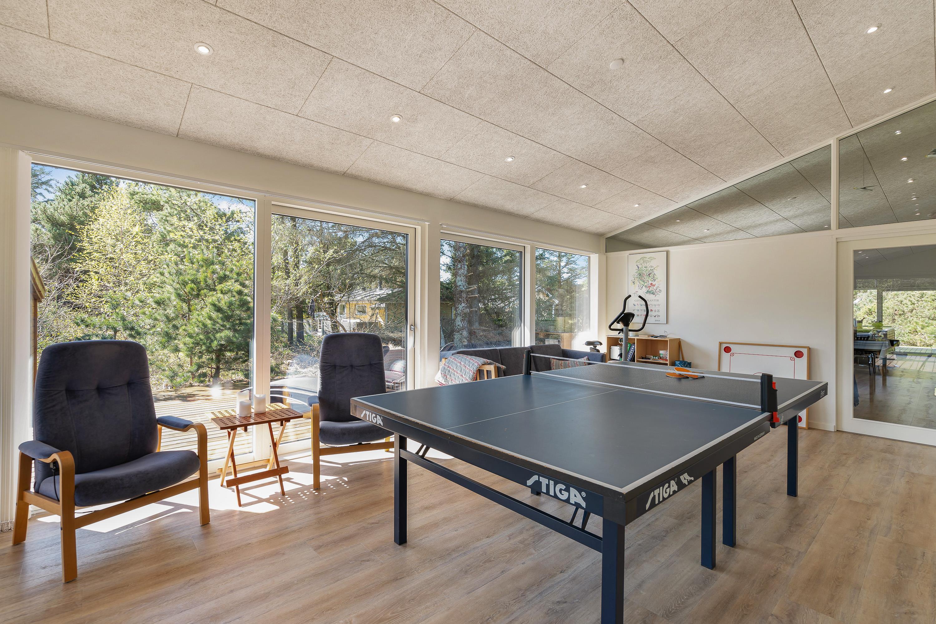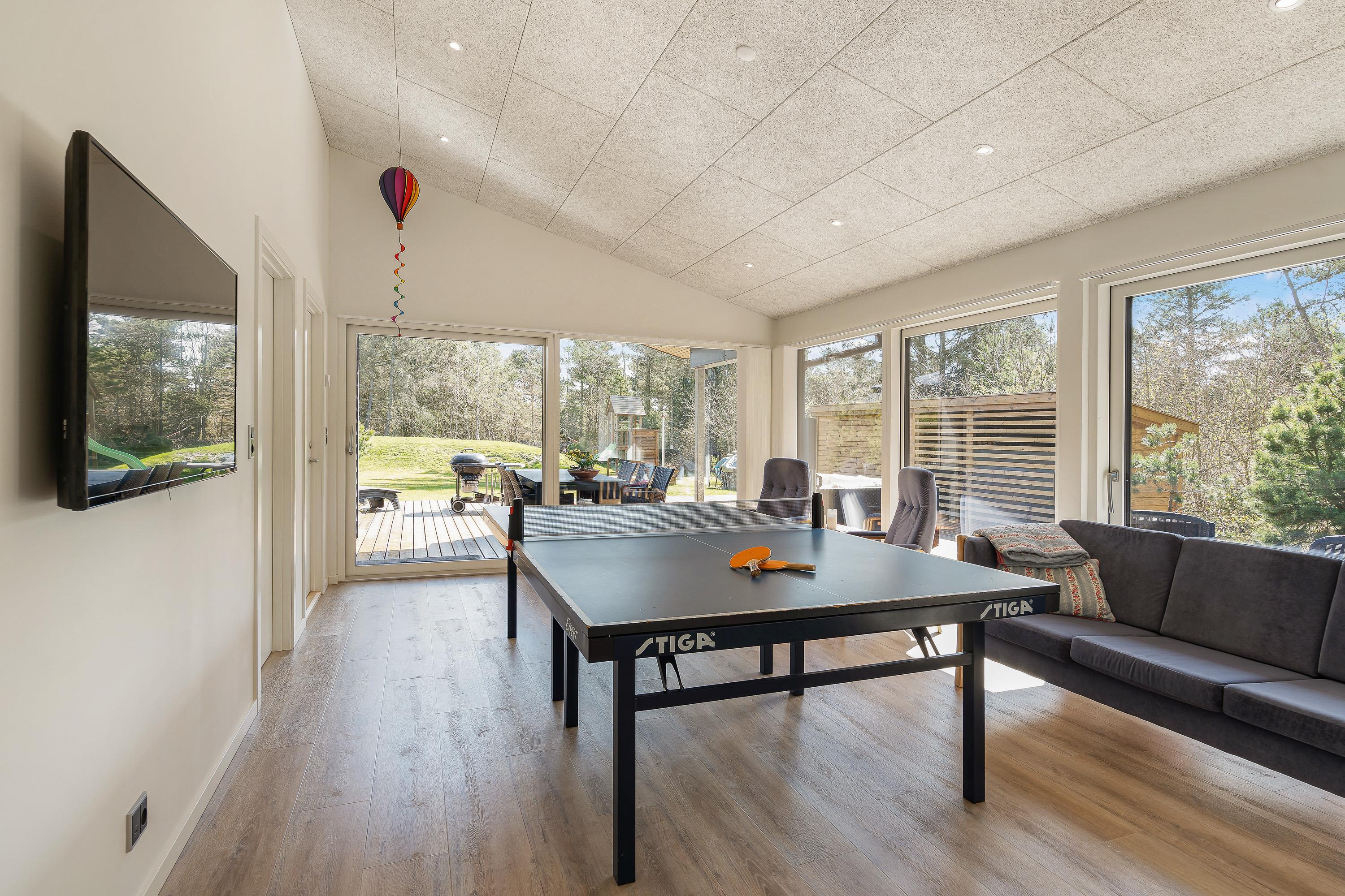 Udover at I har mulighed for at slappe en masse af i sommerhuset på Peter Malersvej 18, så er der også rig mulighed for sjove og underholdende stunder i feriehuset. Her har I nemlig et aktivitetsrum, hvor I kan spille bordtennis. Måske I skal have gang i en turnering for at finde feriens store bordtennismester?