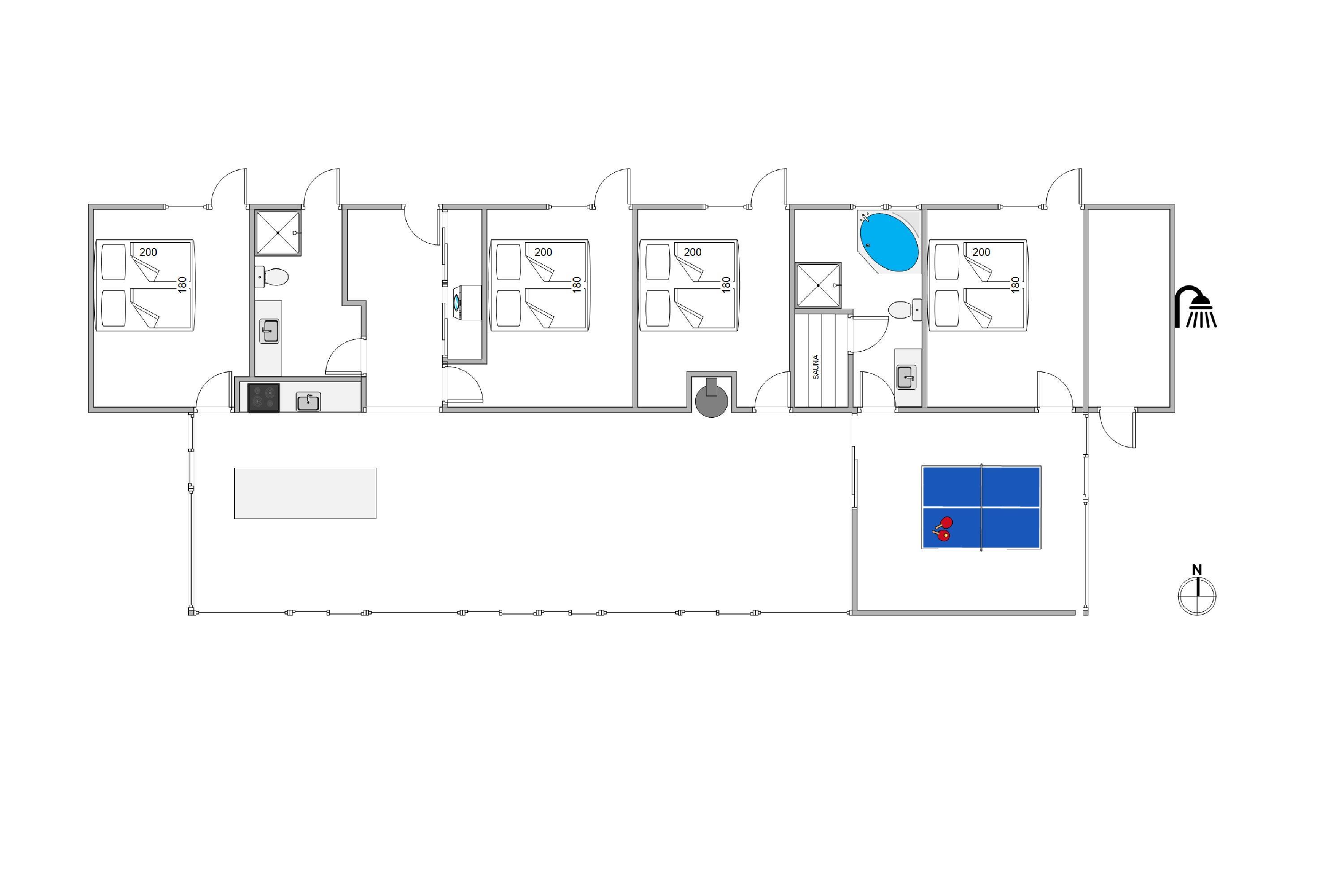 På sommerhusets 180 kvadratmeter finder I 4 soveværelser, der alle er indrettet med en dobbeltseng hver, hvor I kan samle ny energi til jeres kommende feriedage. Om morgenen er der ingen grund til bekymring om kø til badeværelset – her er der nemlig 2 badeværelser med gulvvarme, så der hverken opstår kø eller kolde tæer fra morgenstunden.