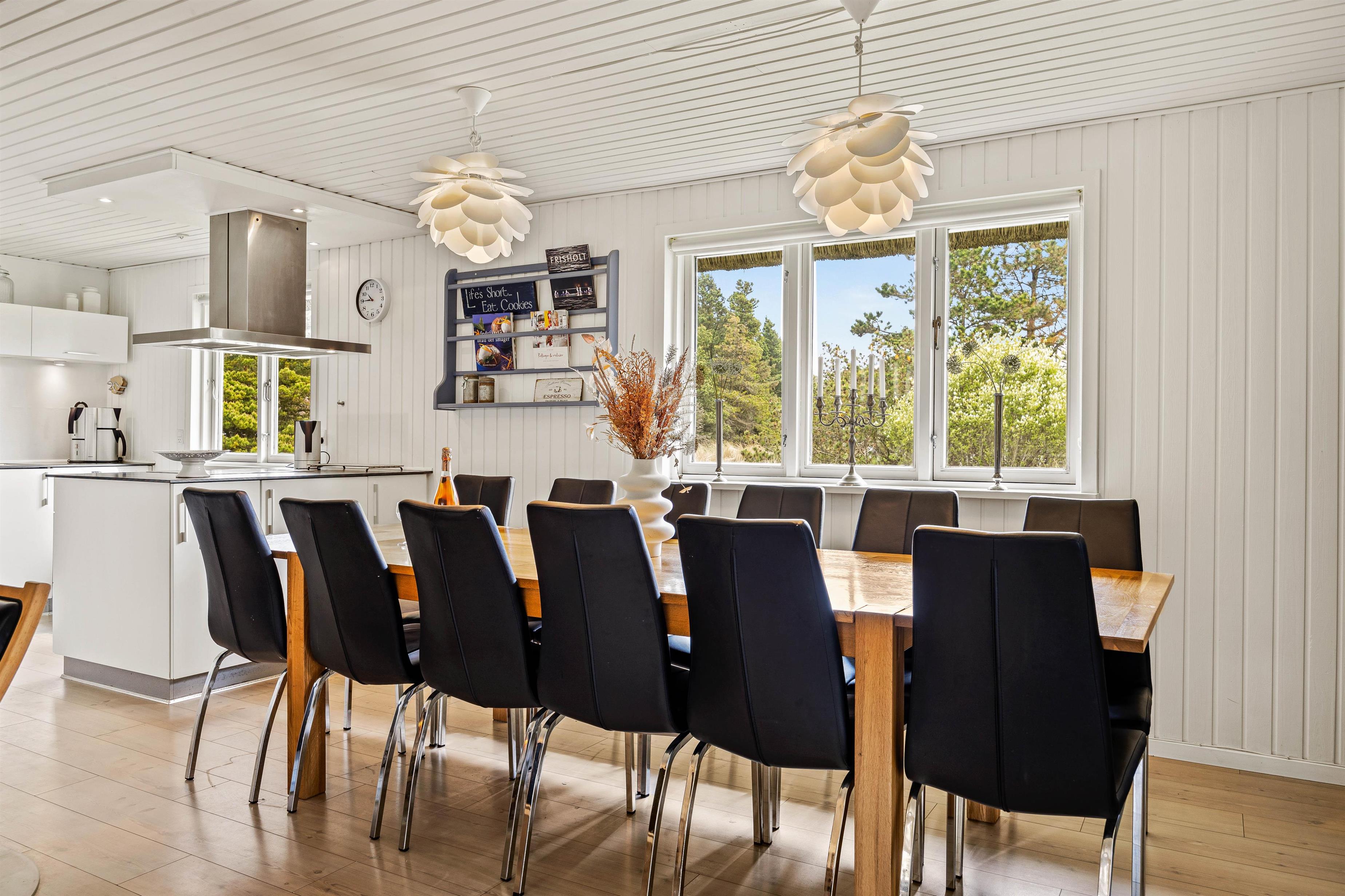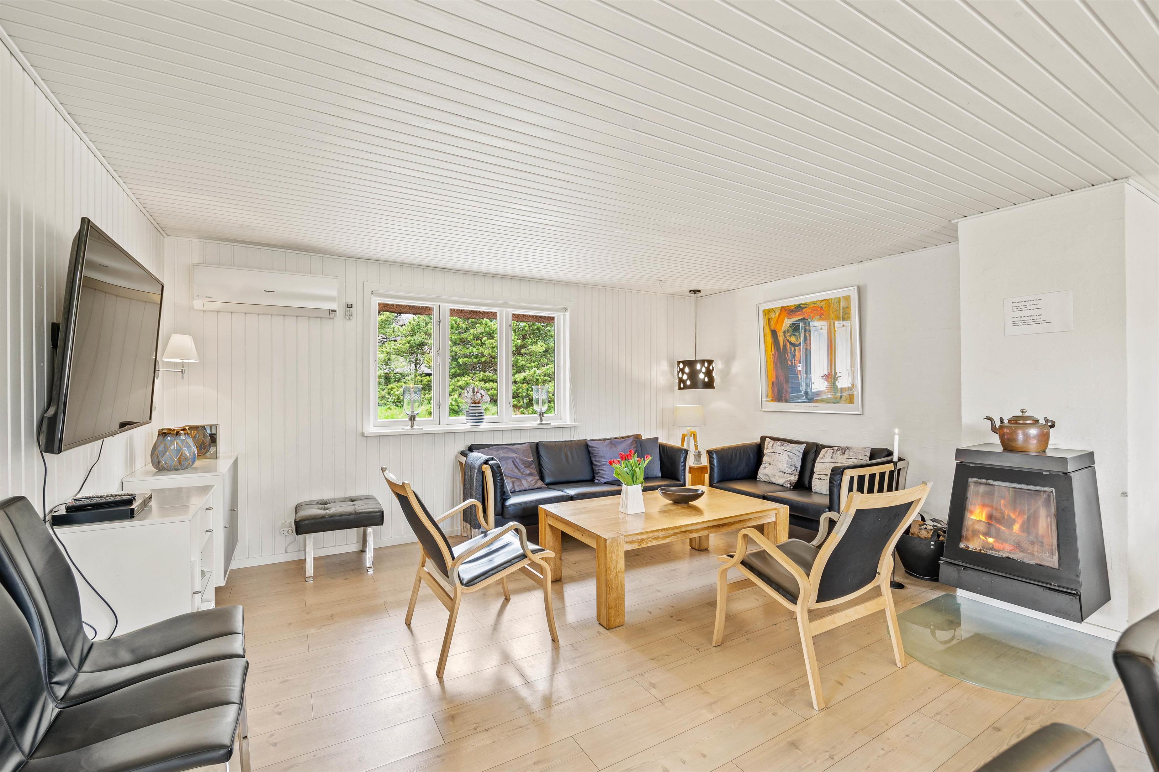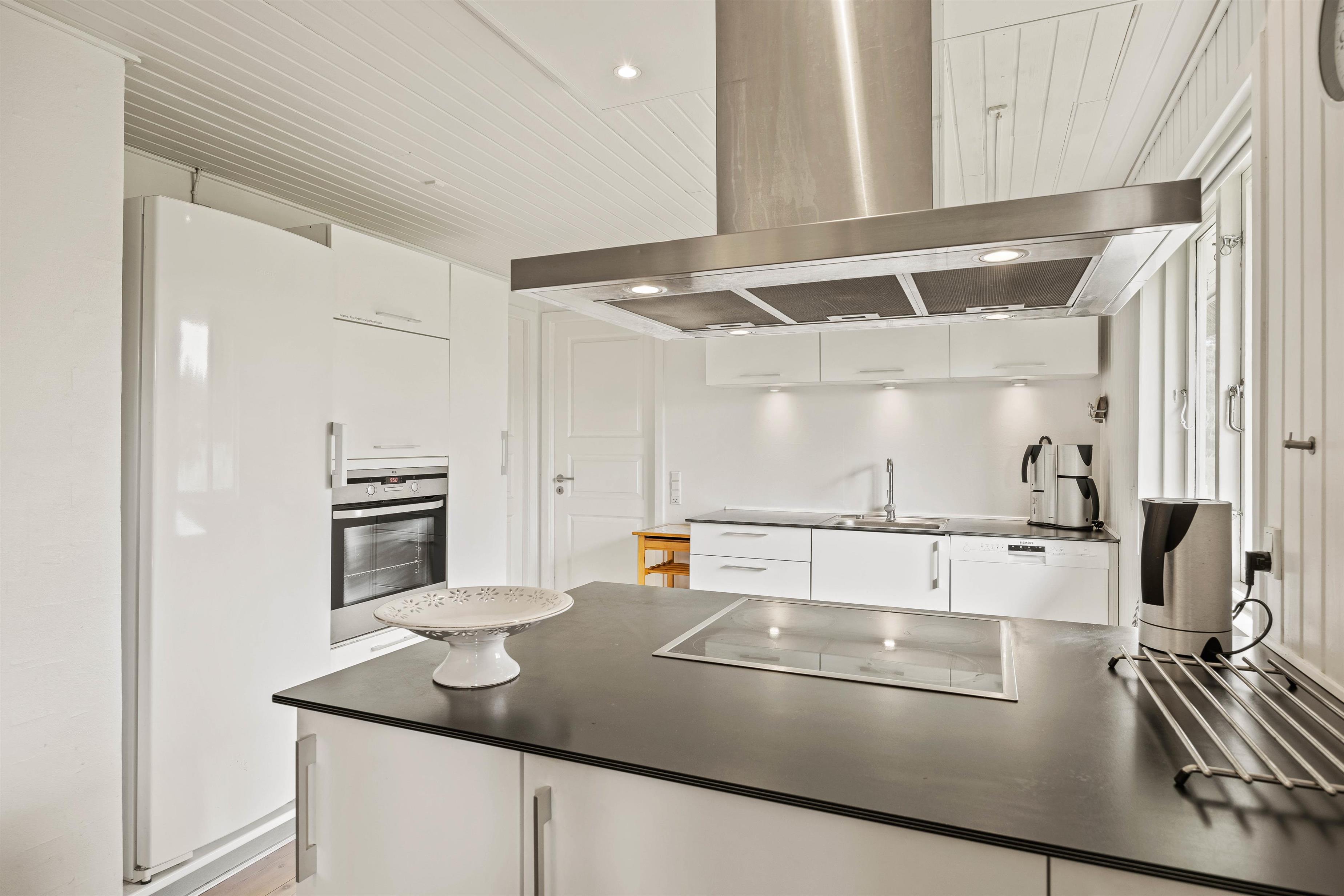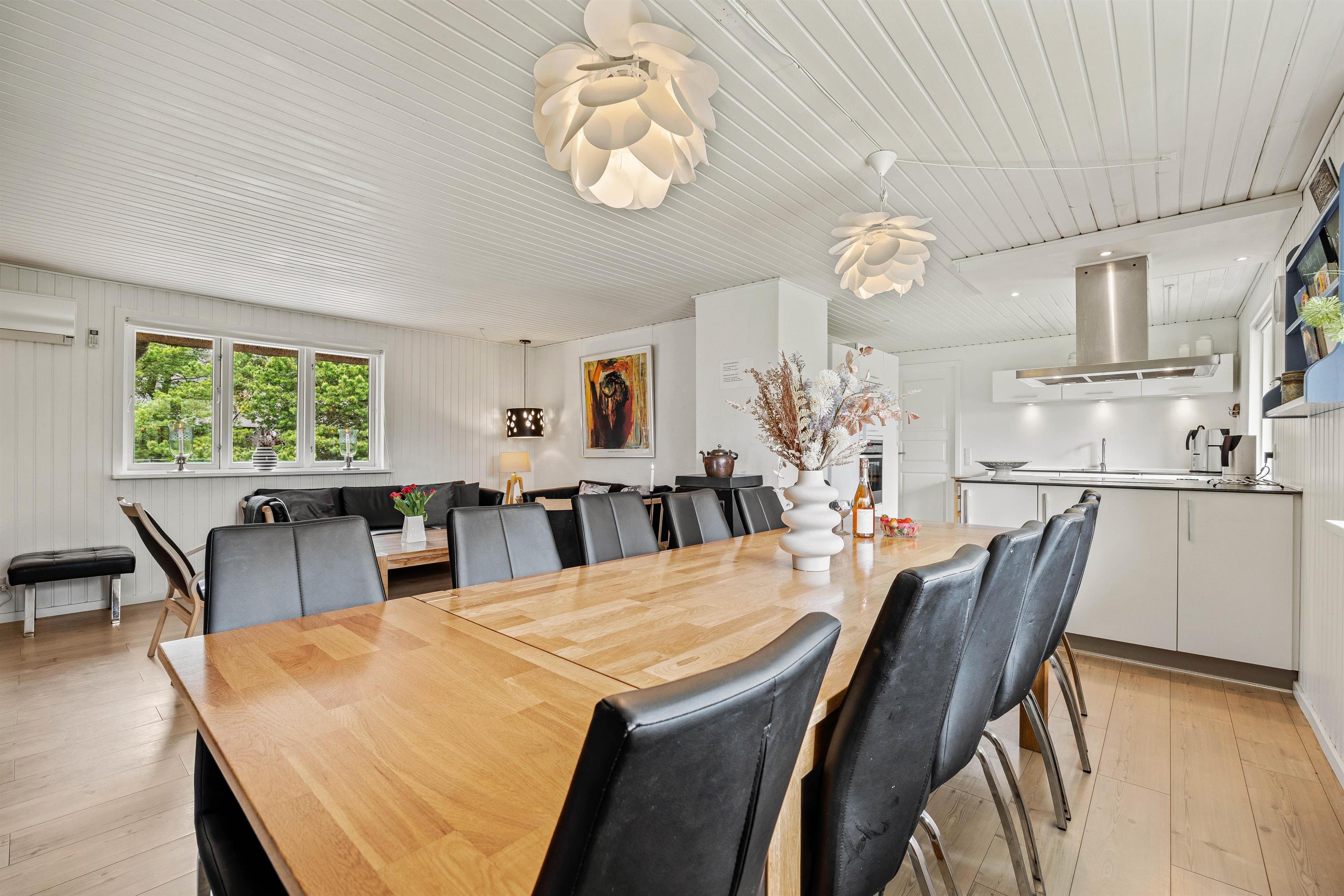 Sommerhuset til 14 personer er lyst og indbydende indrettet. Køkkenet ligger i åben forbindelse til spiseplads og den hyggelige, lille tv-stue. Her kan I hygge jer med et spil kort eller en god film, mens brændeovnen knitrer i baggrunden og sætter prikken over i’et til feriestemningen. Sommerhuset har også en energibesparende varmepumpe, som I kan benytte til at holde temperaturen i rummet behagelig