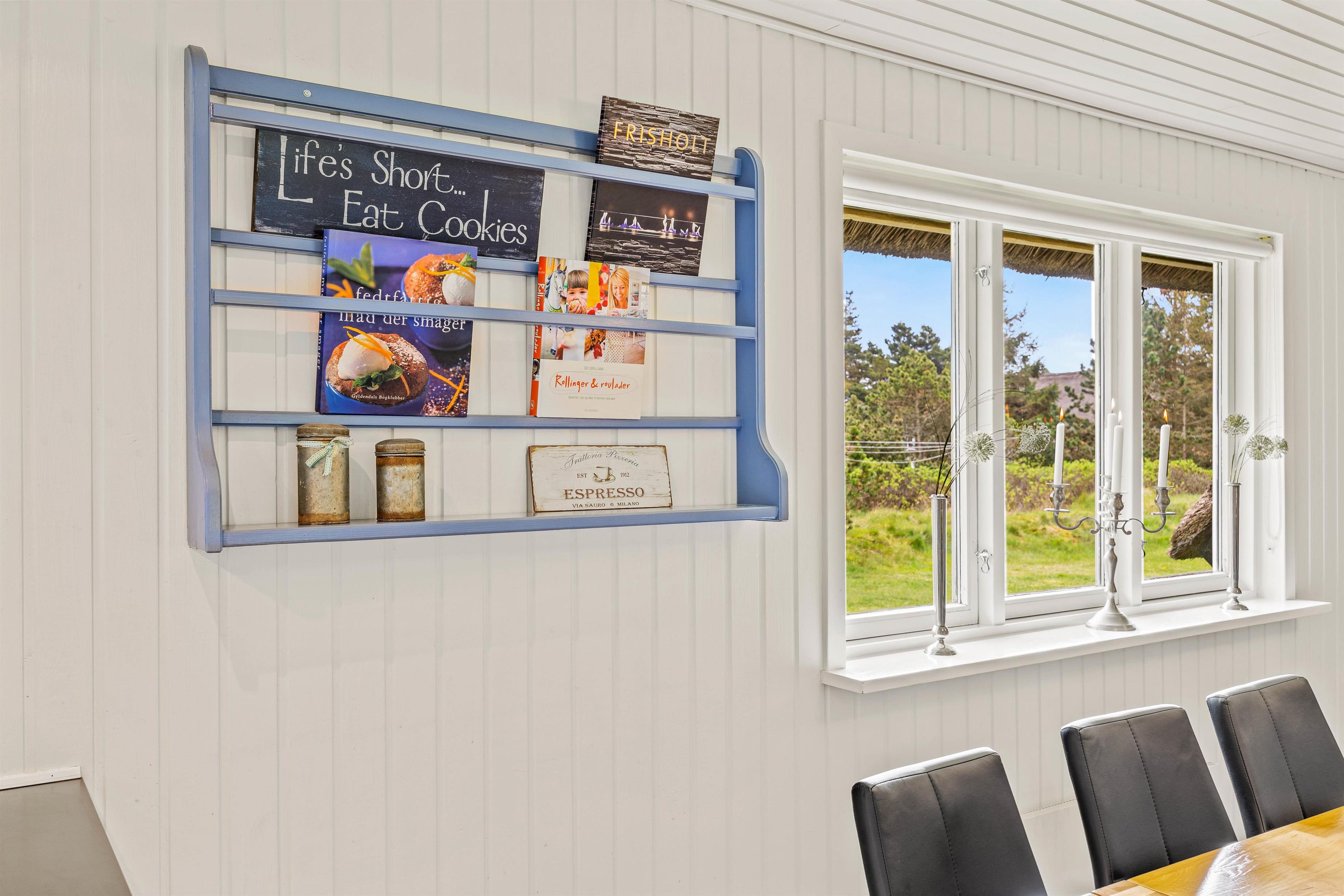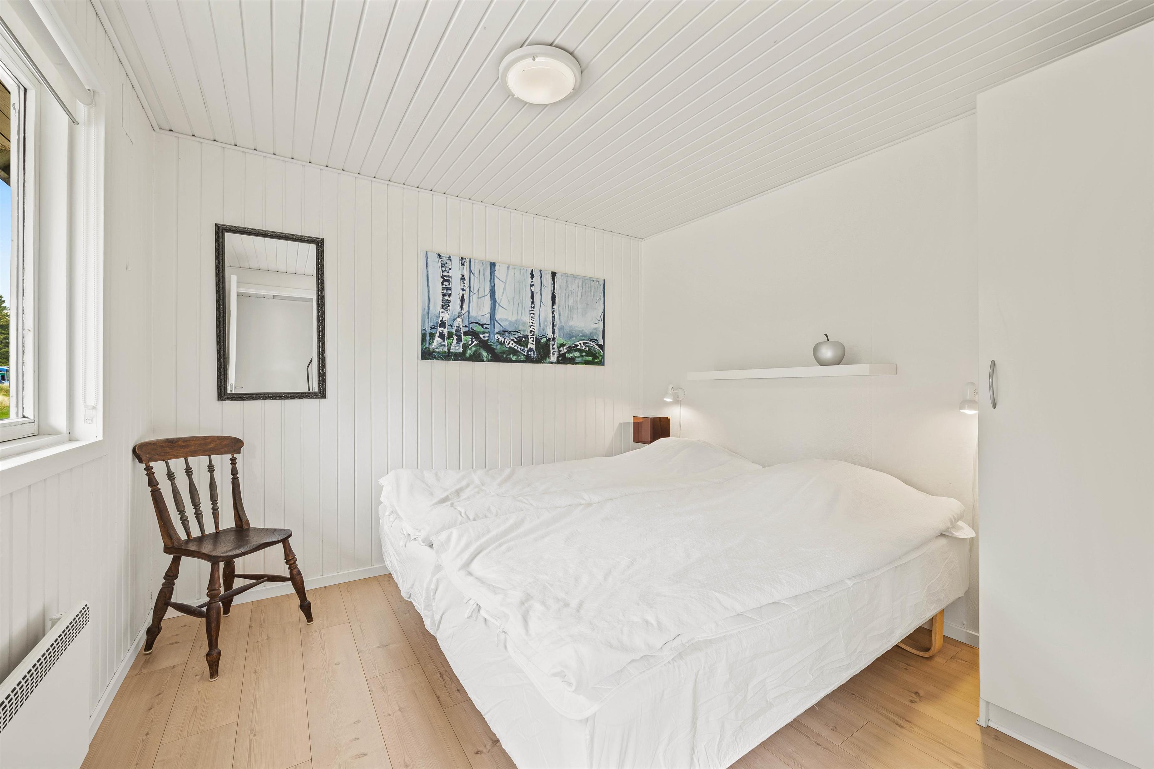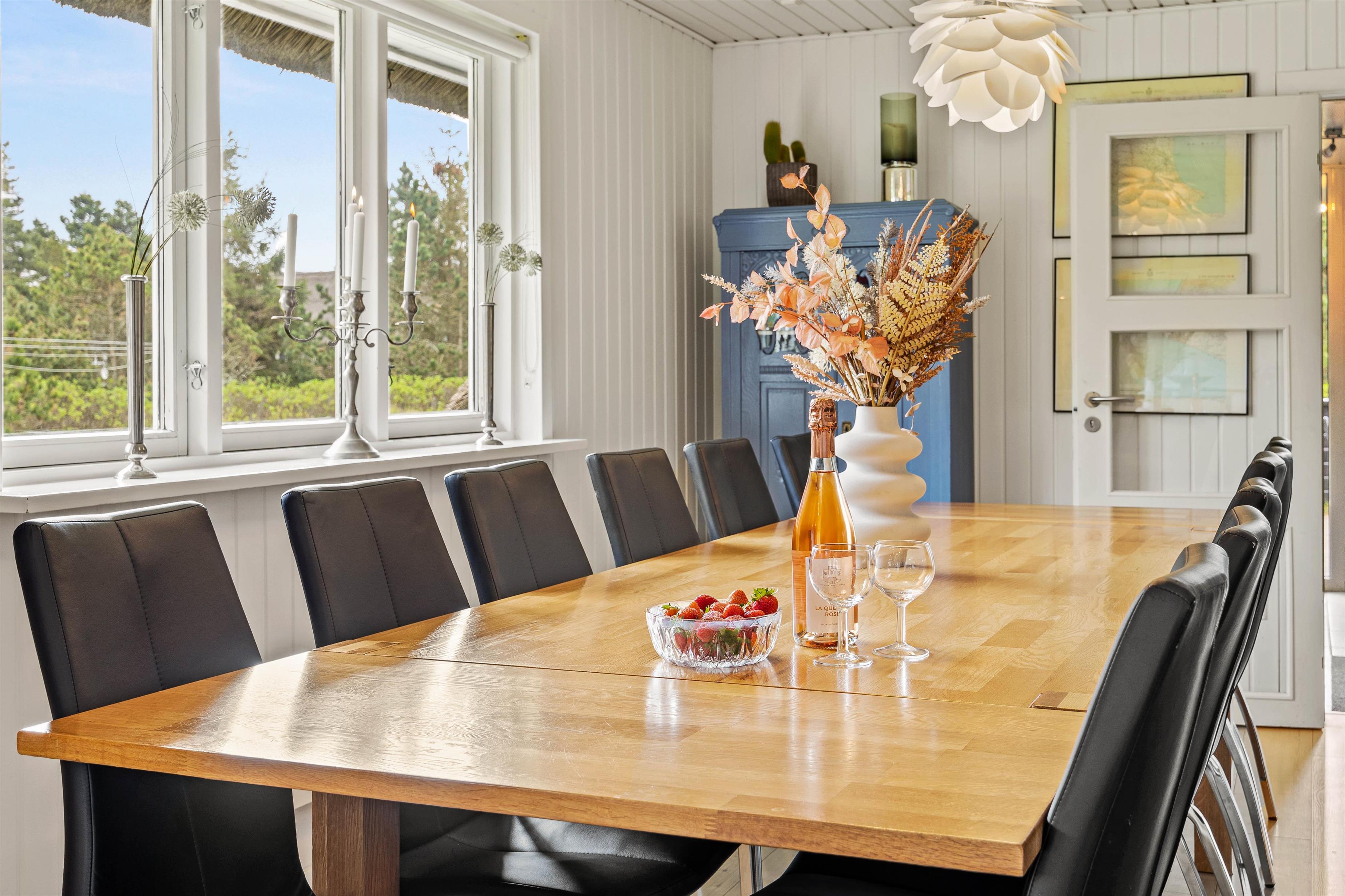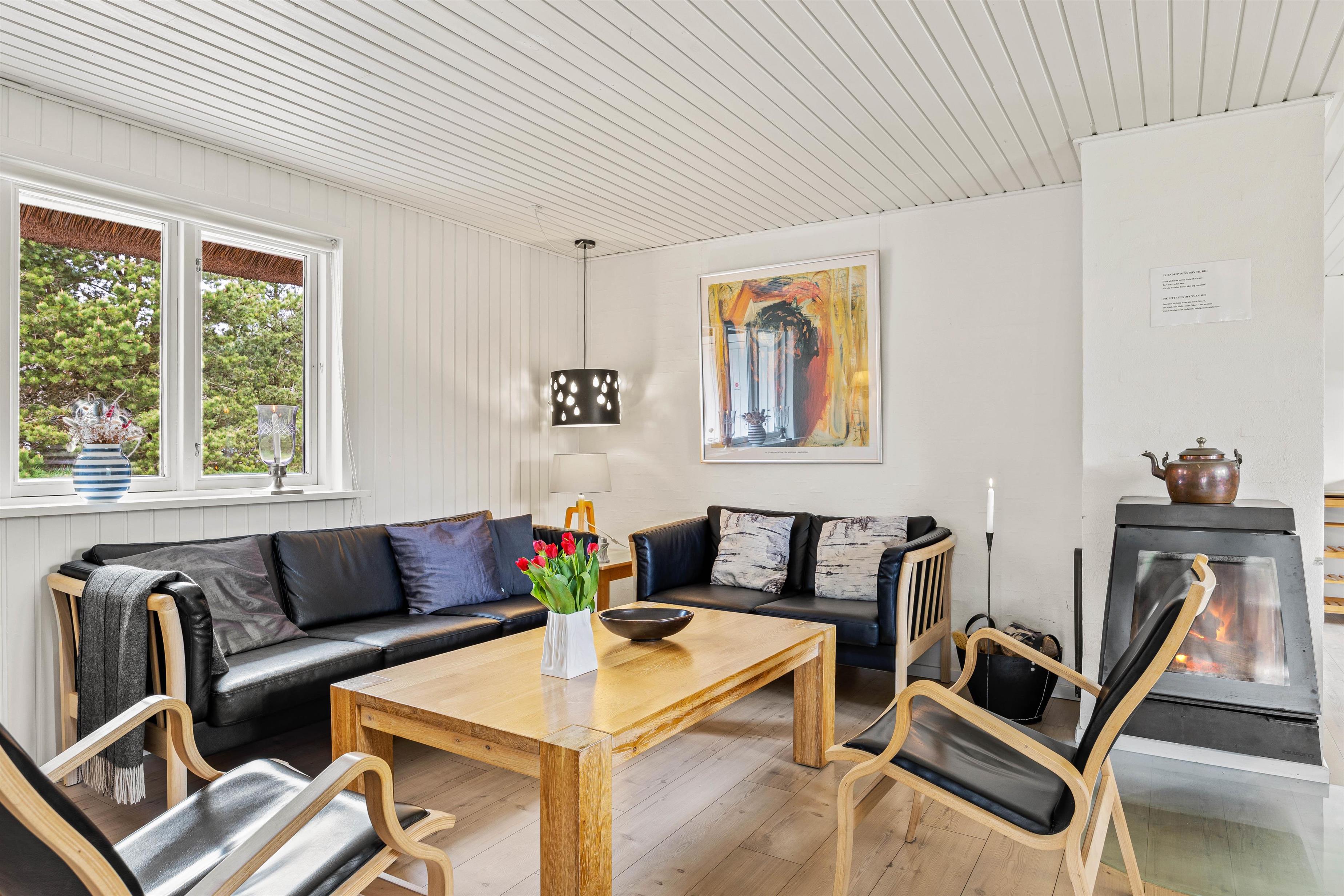 Sommerhuset til 14 personer er lyst og indbydende indrettet. Køkkenet ligger i åben forbindelse til spiseplads og den hyggelige, lille tv-stue. Her kan I hygge jer med et spil kort eller en god film, mens brændeovnen knitrer i baggrunden og sætter prikken over i’et til feriestemningen. Sommerhuset har også en energibesparende varmepumpe, som I kan benytte til at holde temperaturen i rummet behagelig