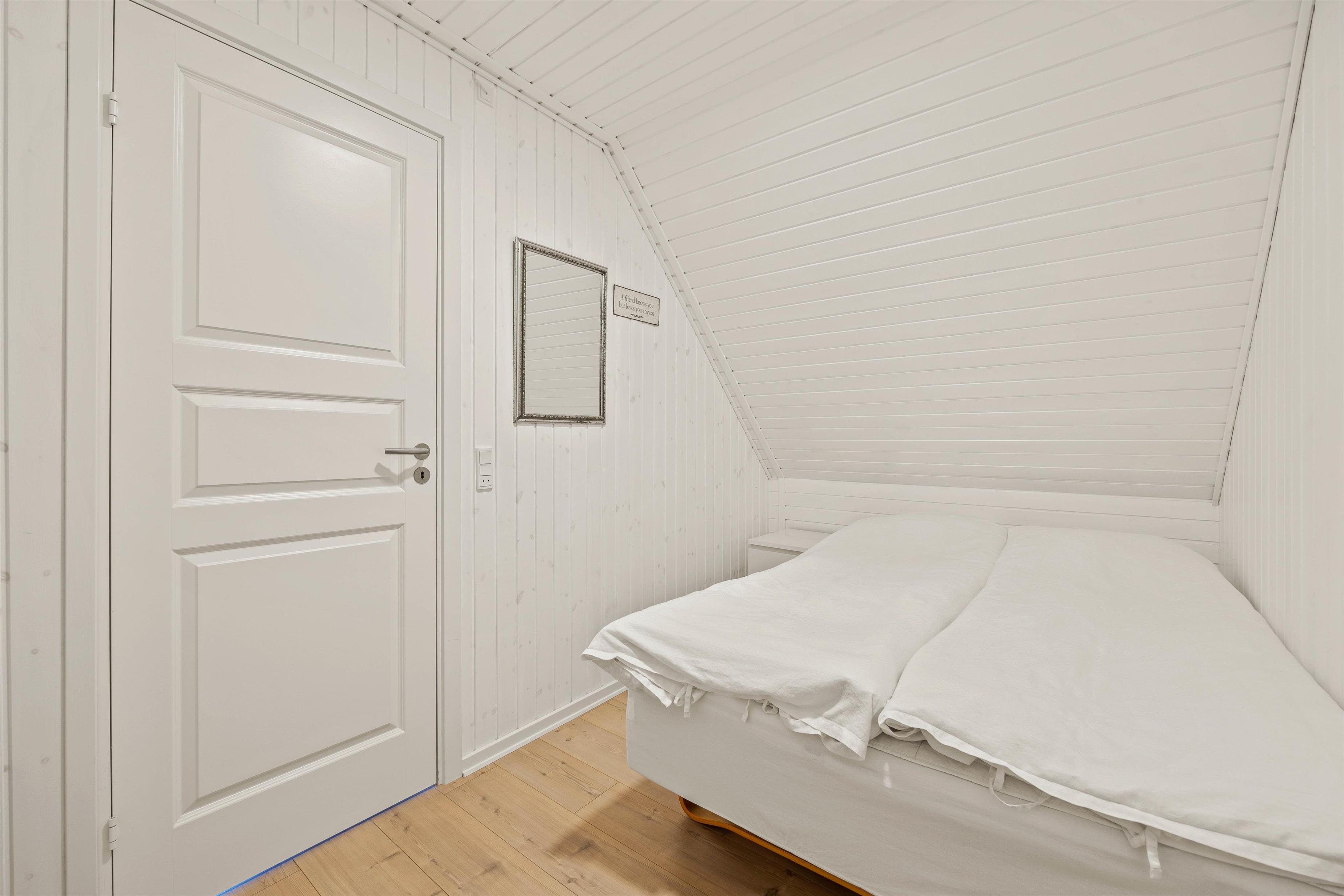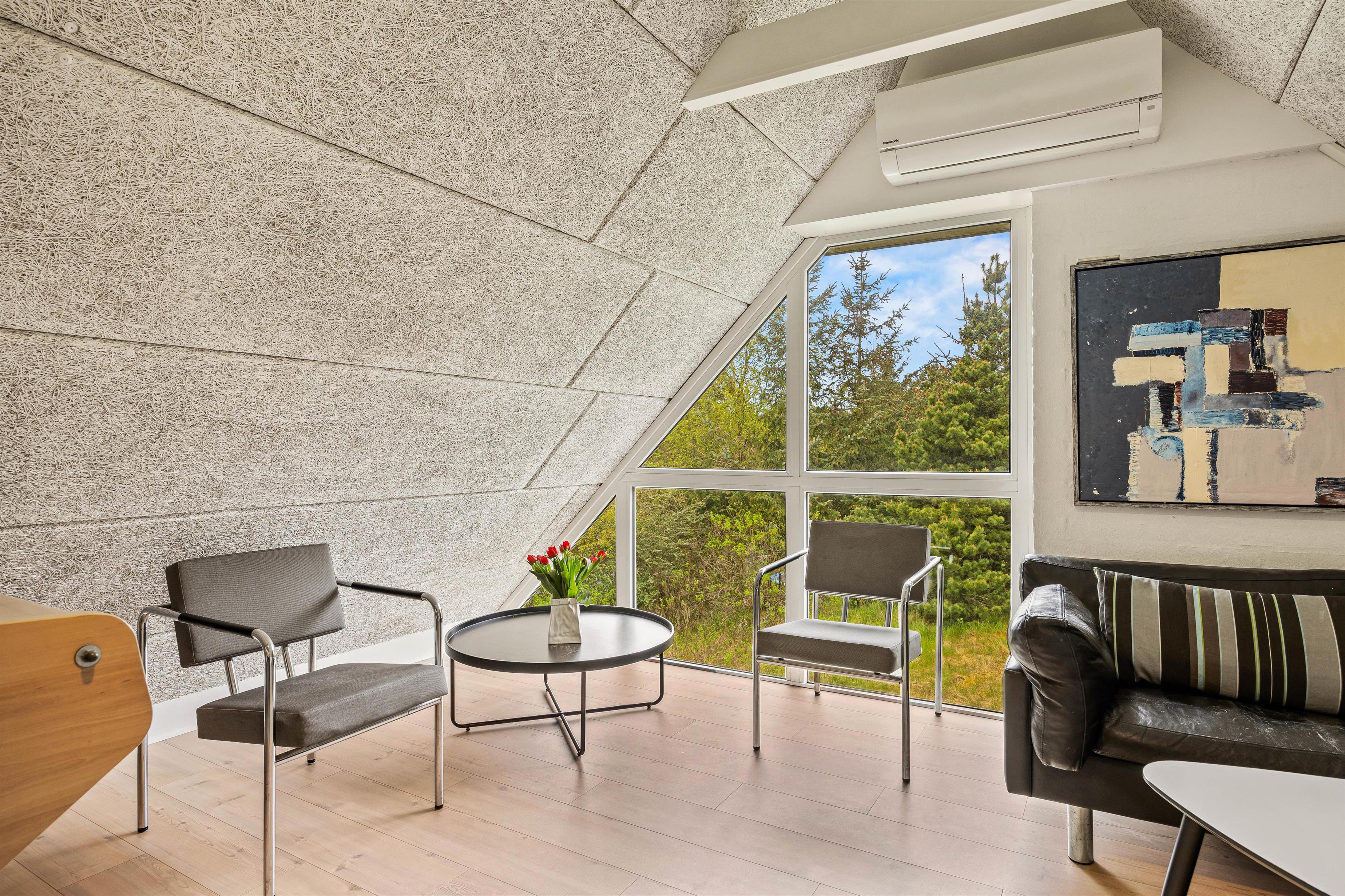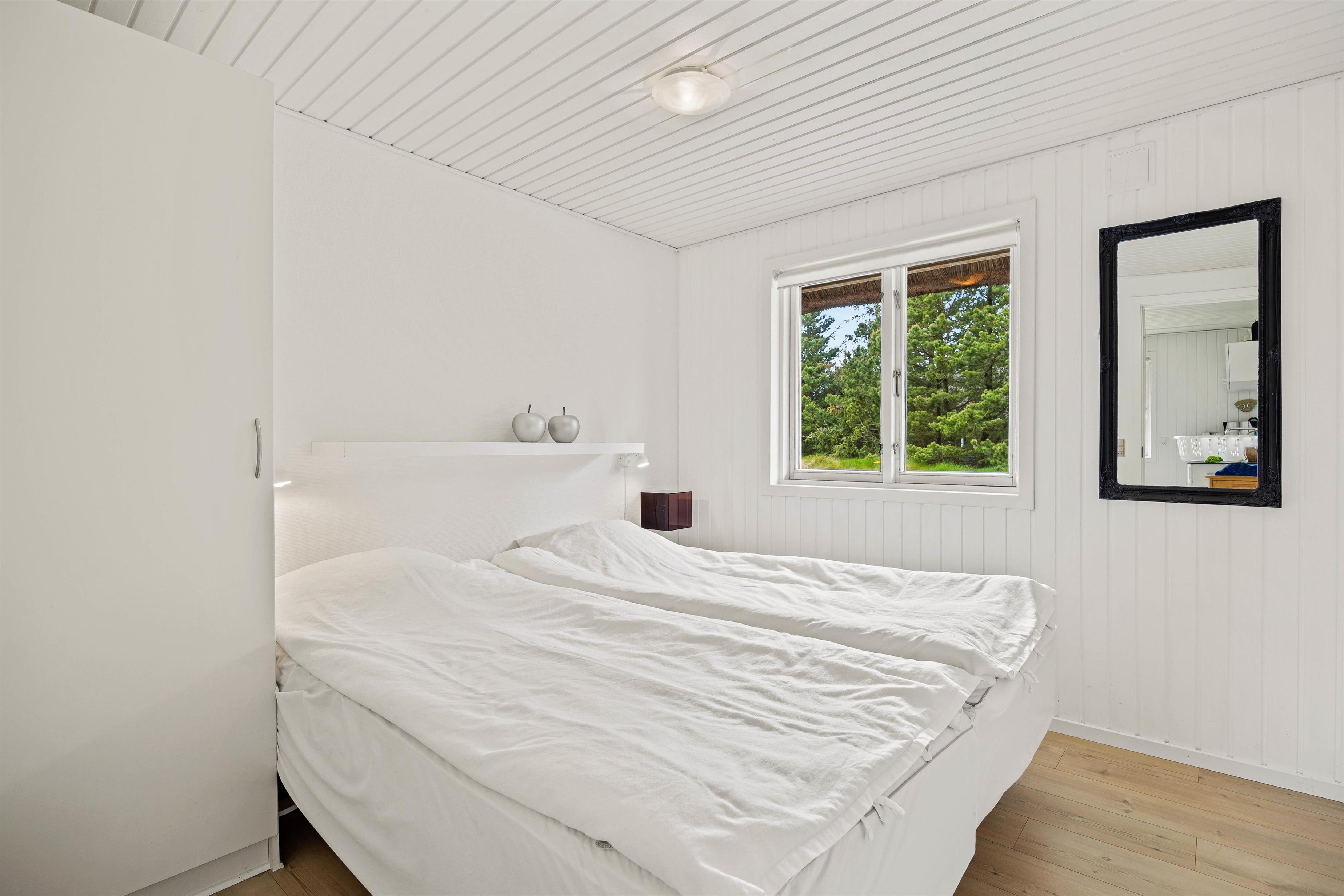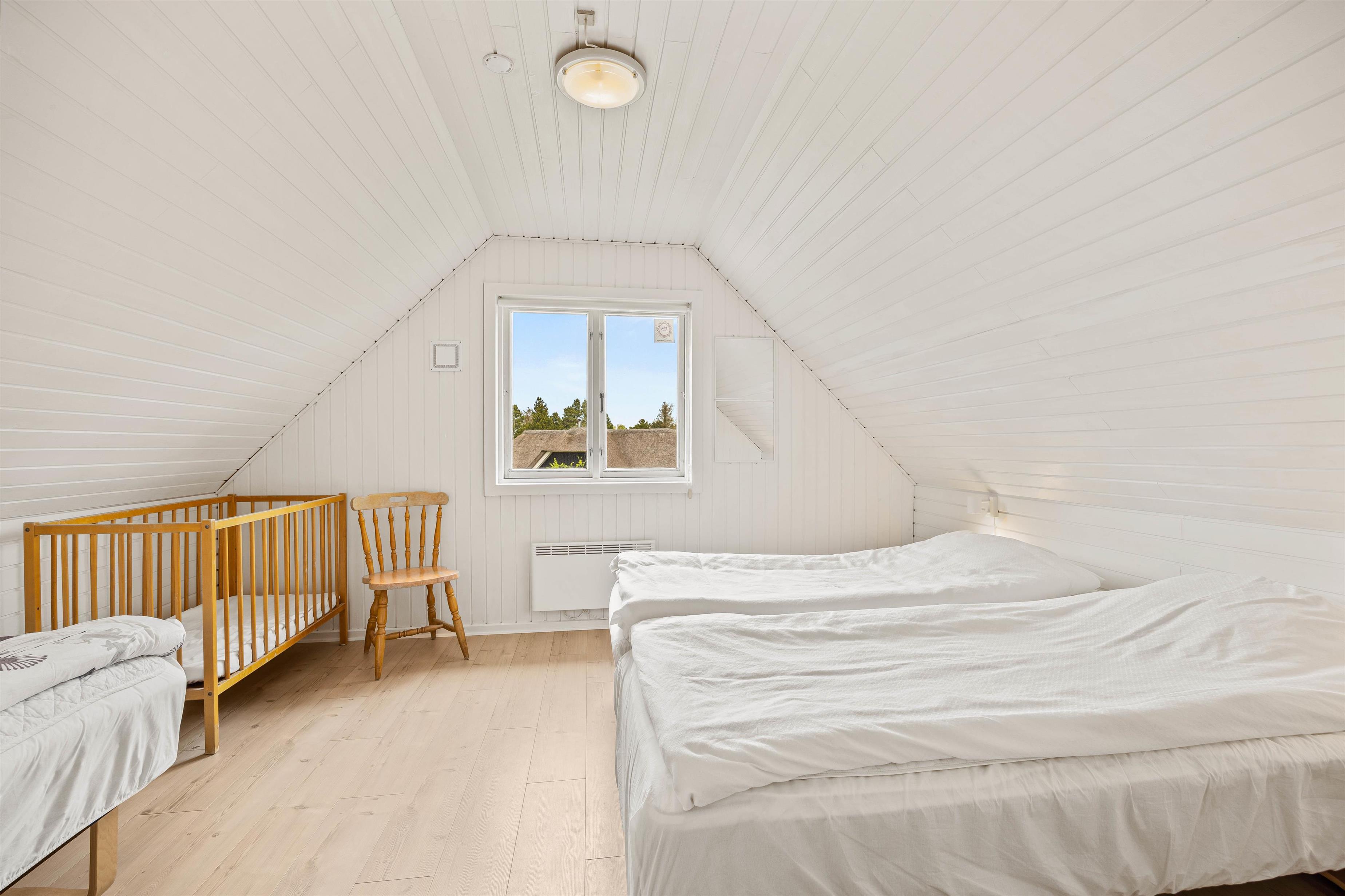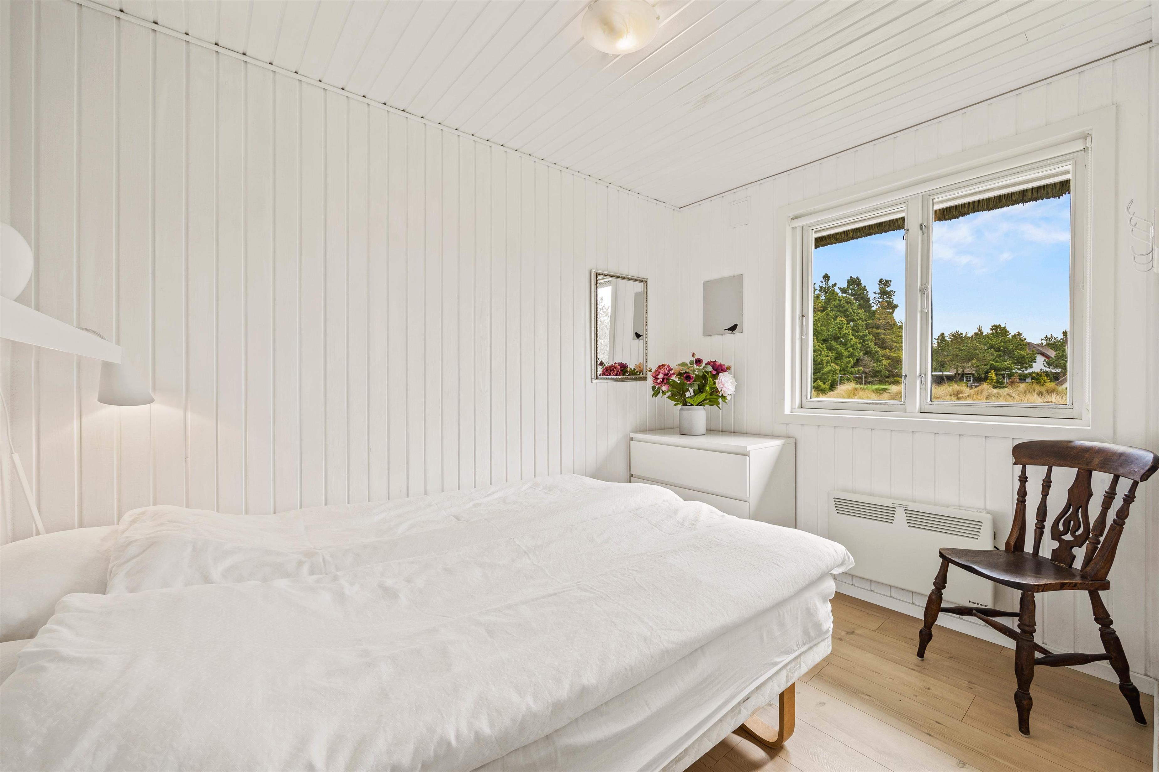 Sommerhuset til 14 personer er lyst og indbydende indrettet. Køkkenet ligger i åben forbindelse til spiseplads og den hyggelige, lille tv-stue. Her kan I hygge jer med et spil kort eller en god film, mens brændeovnen knitrer i baggrunden og sætter prikken over i’et til feriestemningen. Sommerhuset har også en energibesparende varmepumpe, som I kan benytte til at holde temperaturen i rummet behagelig