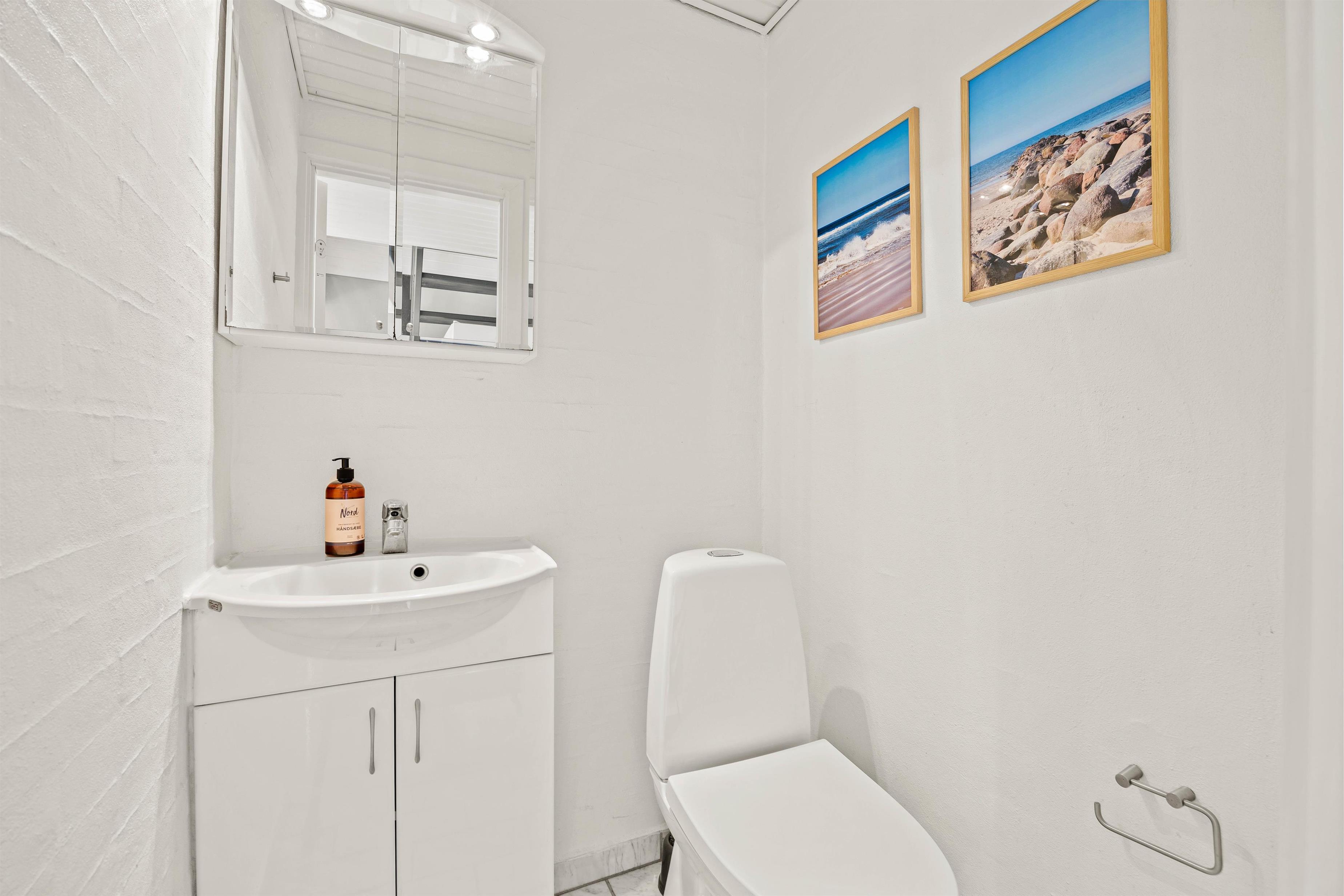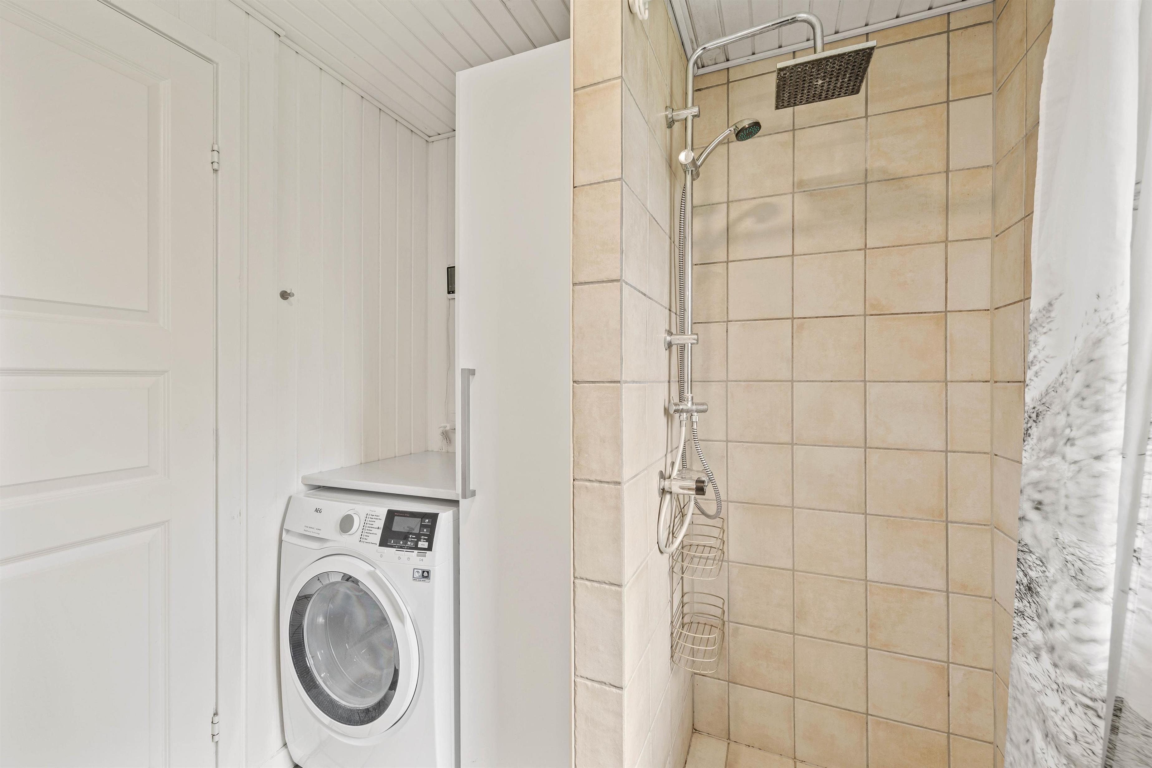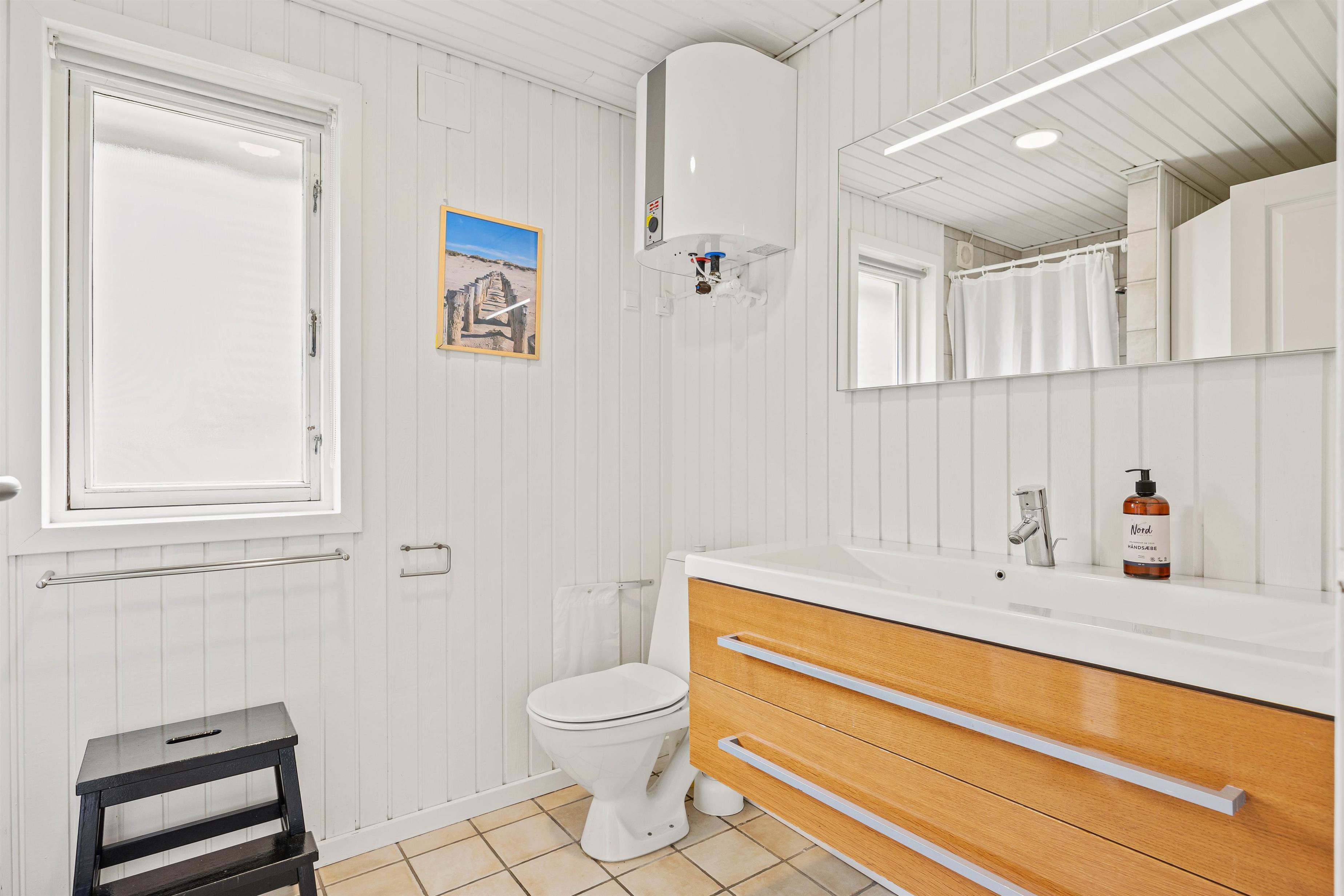 I sommerhuset er der et badeværelse med gulvvarme samt et fint gæstetoilet. Desuden er der både vaskemaskine og tørretumbler, så I har mulighed for at vaske lidt tøj eller håndklæder i løbet af ferien.