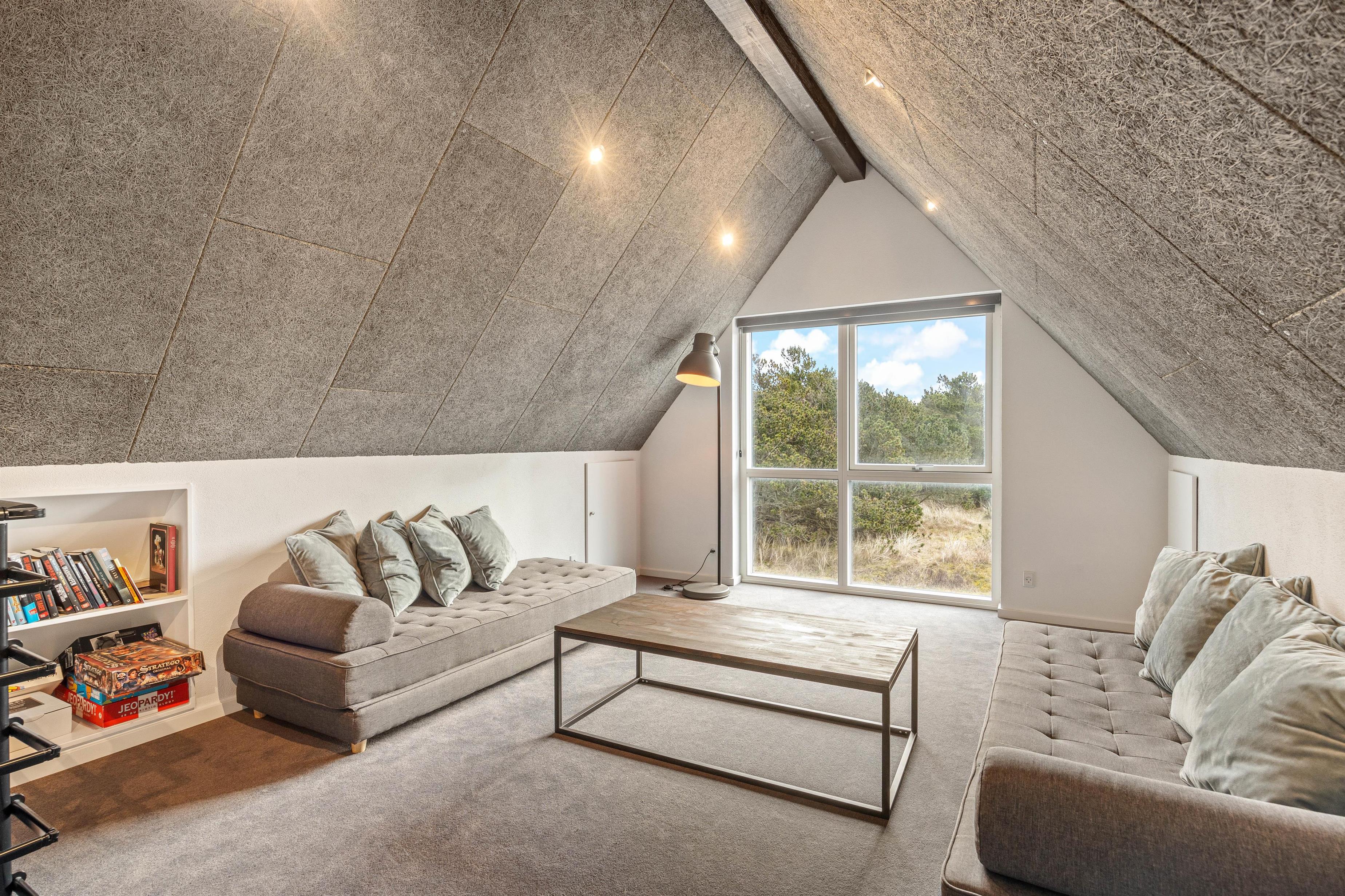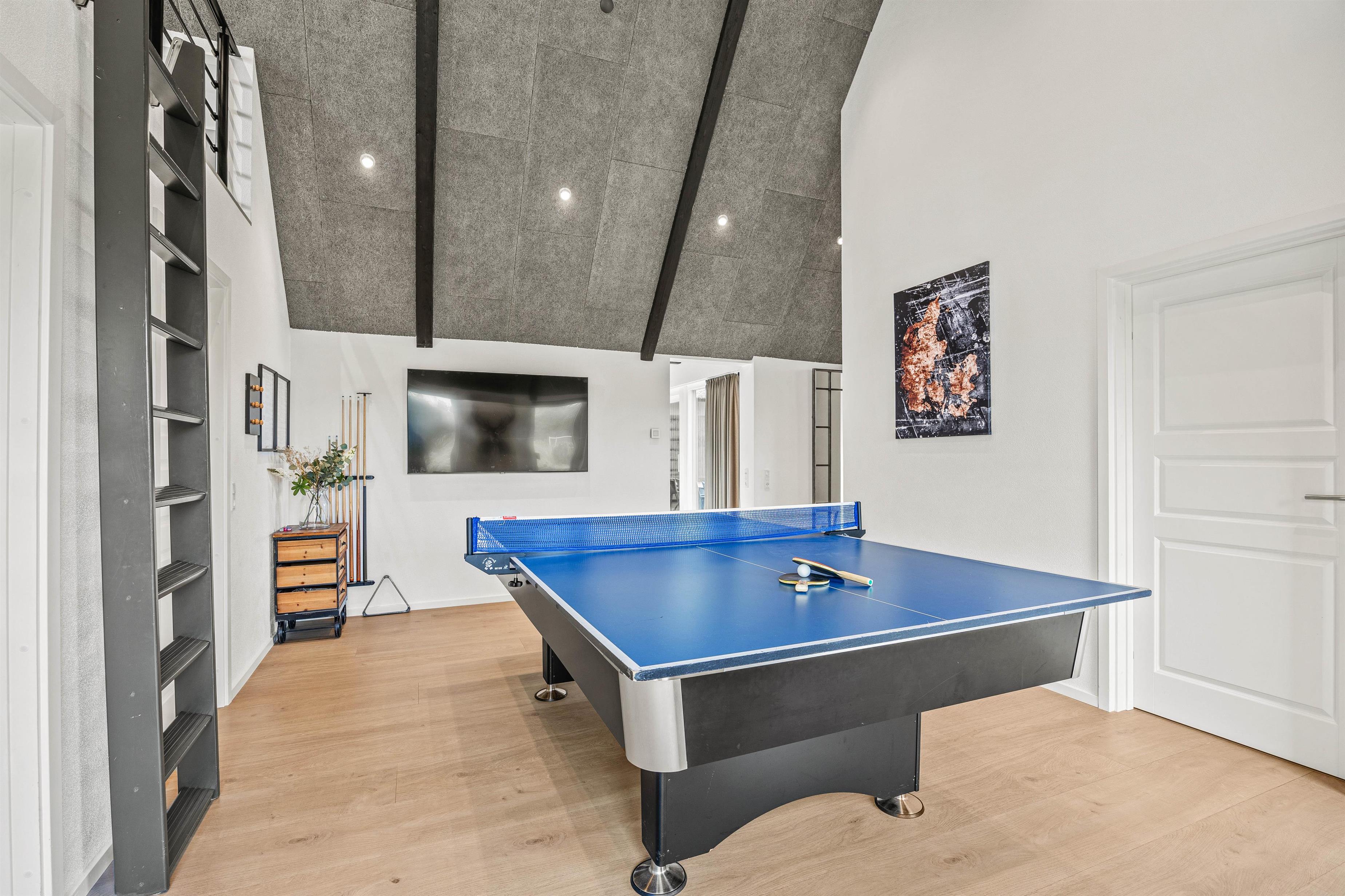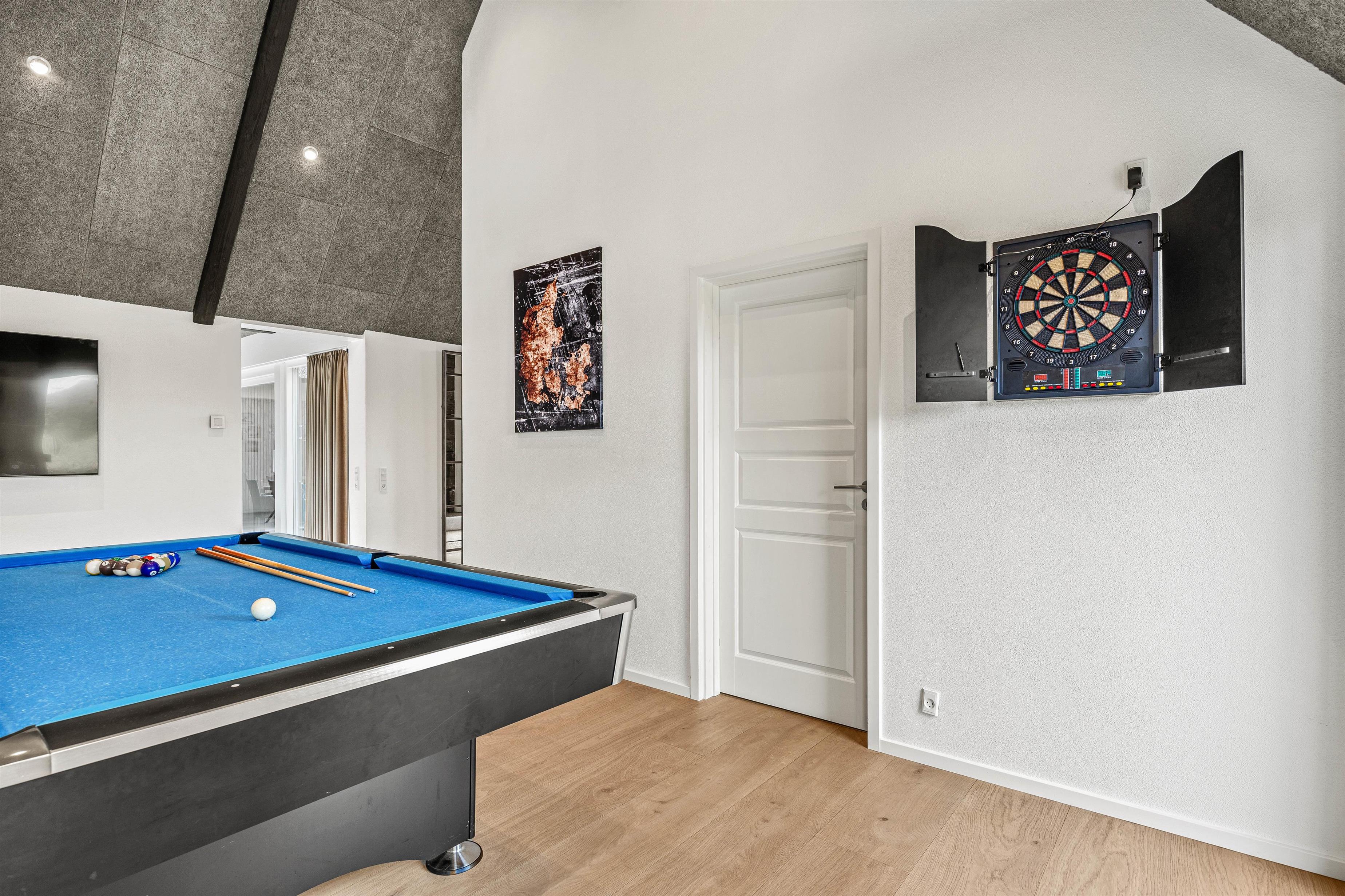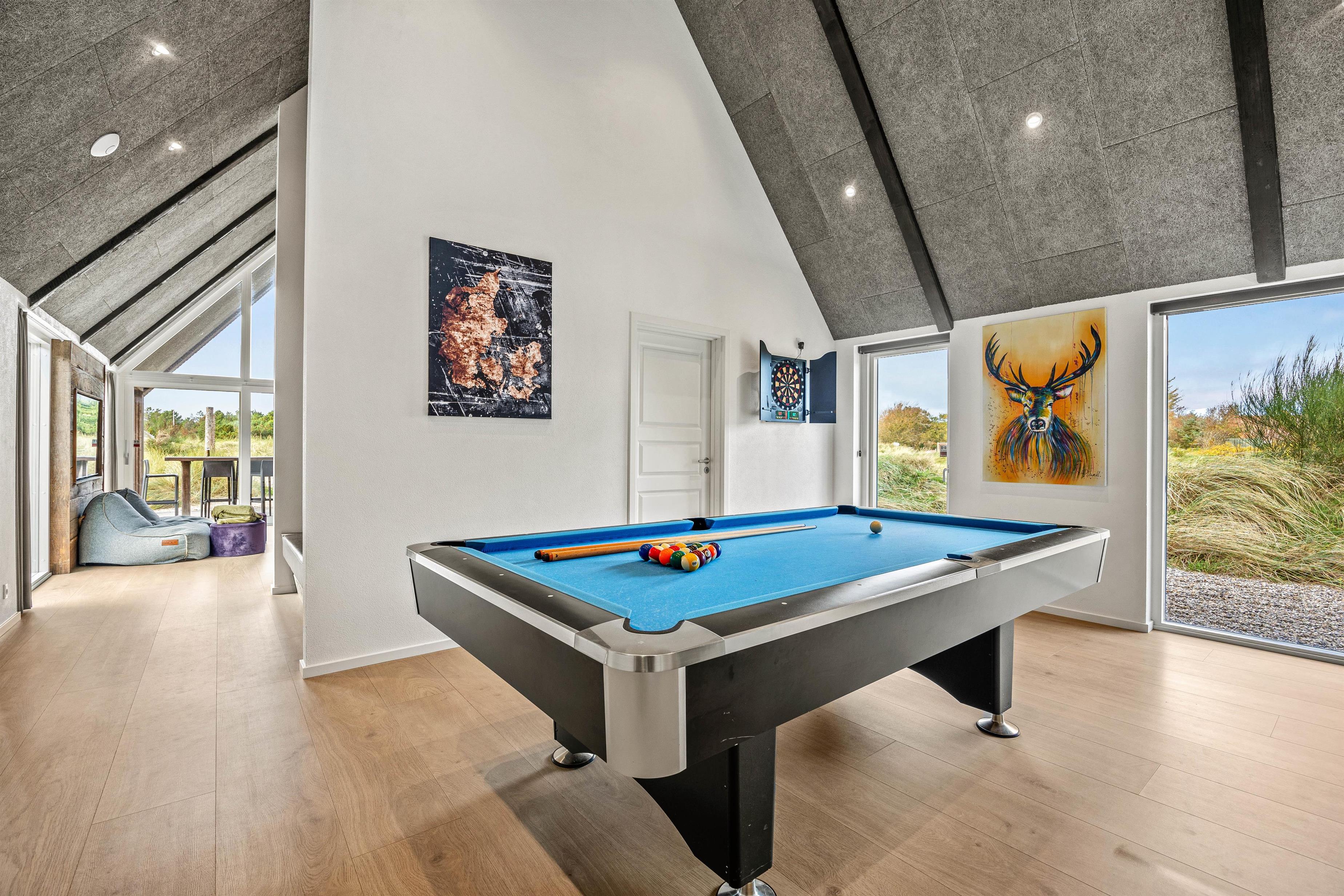 Sommerhuset på Sønder-Vasevej 2B byder på alt det udstyr, som I har brug for på en ferie og mere til. I det store opholdsrum er der højt til loftet, og de flotte kvalitetsmøbler indbyder til afslapning og fælles hygge. Ved siden af opholdsrummet ligger det store aktivitetsrum, hvor I kan afholde små turneringer i både billard og bordtennis.